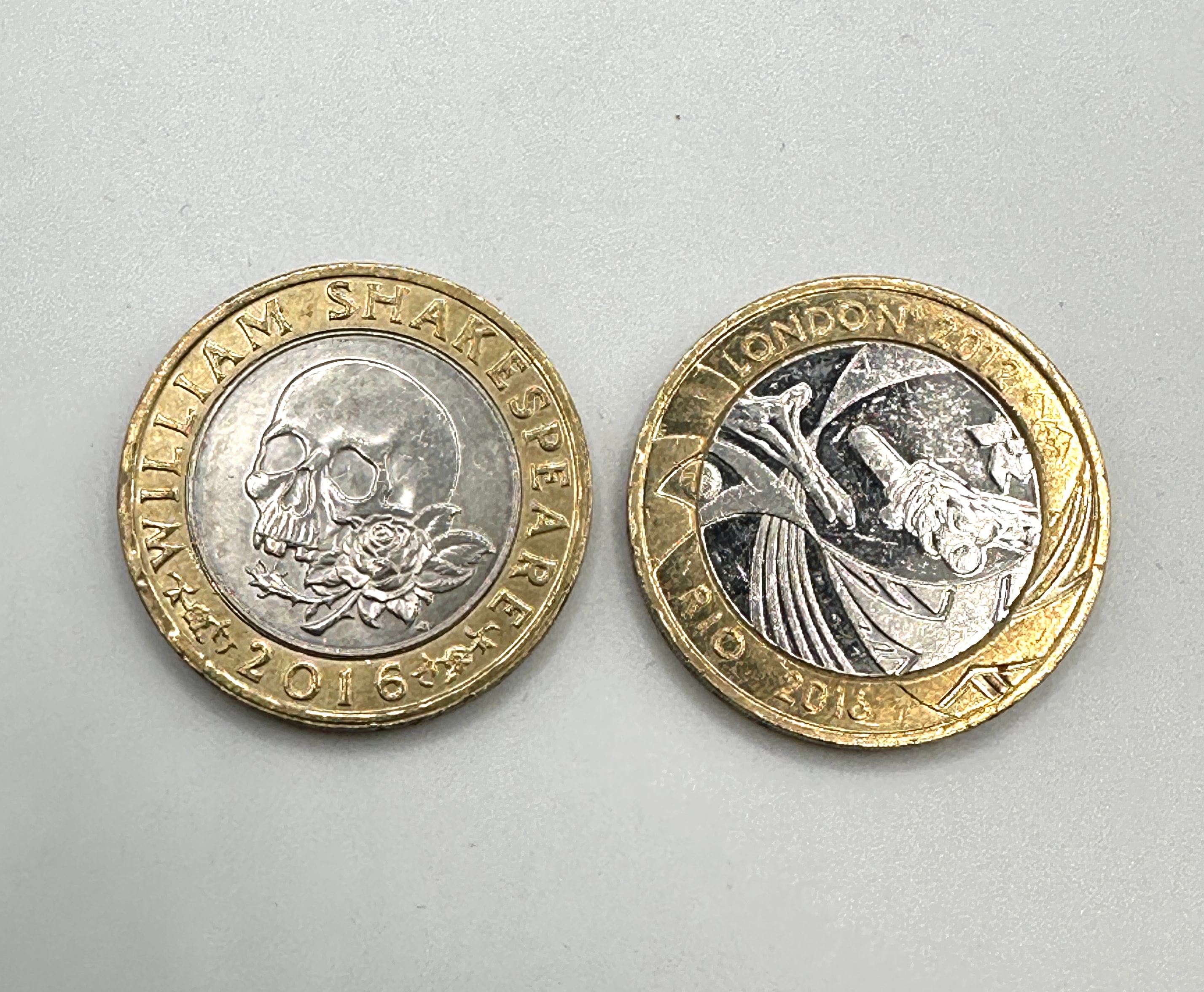 A pair of bi-metallic commemorative two pound coins. The first, dated 2012, is identified as a 2012 Olympic Games London to Rio Handover £2 coin, featuring an athletic figure and inscribed ‘LONDON 2012 RIO 2016’ on the reverse. The second coin, dated 2016, features a skull with a rose and is encircled by ‘WILLIAM SHAKESPEARE’ on the reverse. Both coins display a profile portrait of Queen Elizabeth II on the obverse, accompanied by the Latin inscription ‘D G REG F D ELIZABETH II’ and the denomination ‘TWO POUNDS’. Each coin consists of a silver-toned core and a gold-toned outer ring.