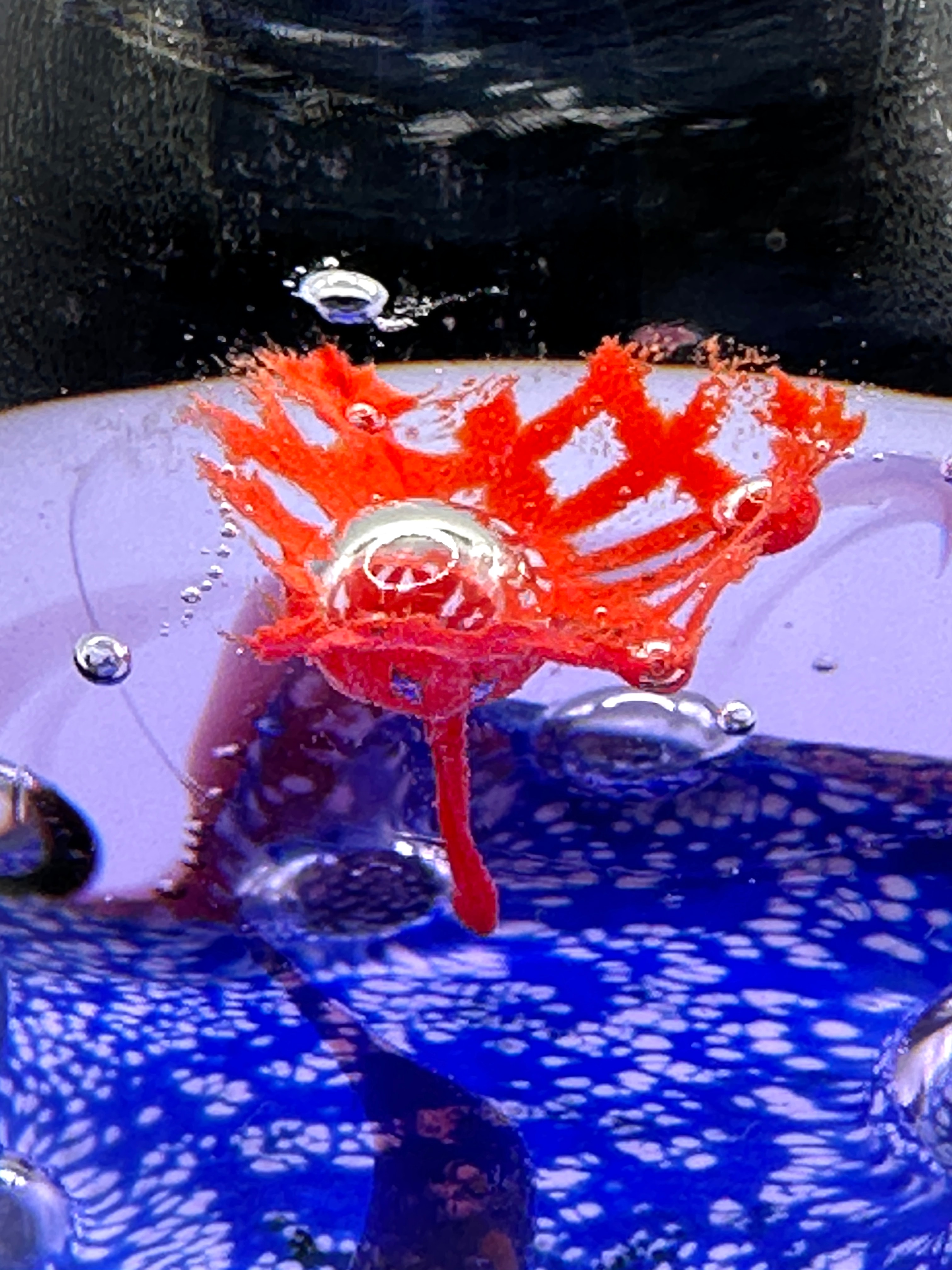 A Caithness Glass ‘Ascension’ paperweight by Alastair Macintosh. This modern art glass paperweight is ovate in form, featuring an elaborate internal design. Encased within the clear glass are vibrant elements including a prominent red, spiky, star-like form centrally placed within a translucent purple layer. Below this, a darker blue base is intricately patterned with white flecks, resembling a galaxy or seabed, while numerous small air bubbles are scattered throughout the purple and blue sections. The top and bottom portions of the paperweight appear a deep dark blue or black. The underside is etched with the identifier “P 7885” and the text “Caithness ASCENSION Scotland,” indicating the maker and design name.