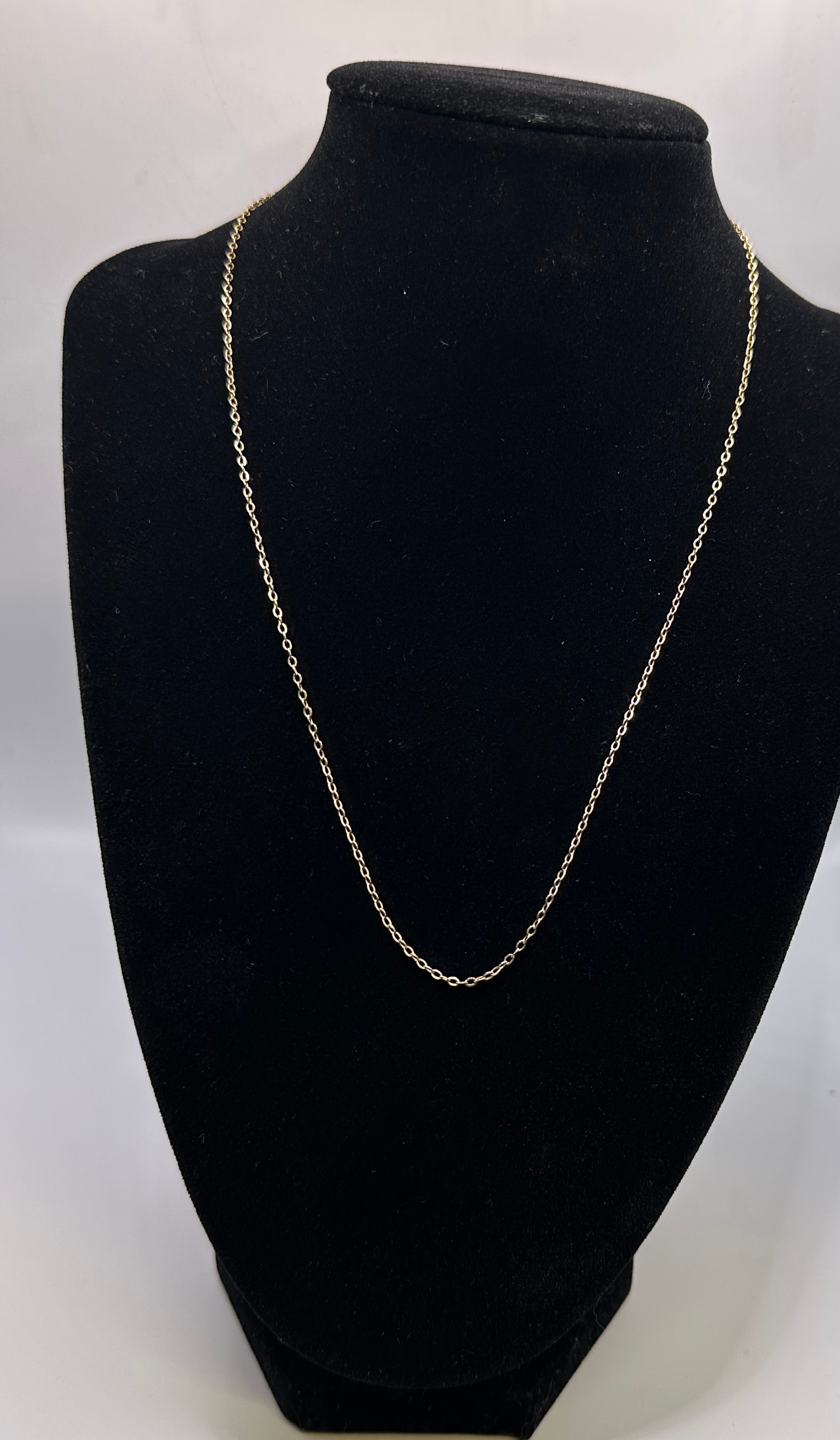 A 9k gold link chain necklace, comprising uniform, unornamented links. The chain appears in good, intact condition with a consistent metallic luster.