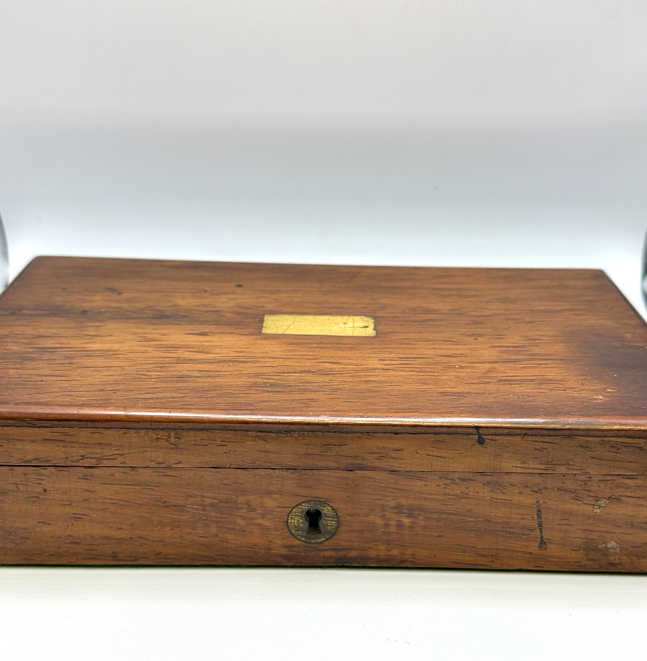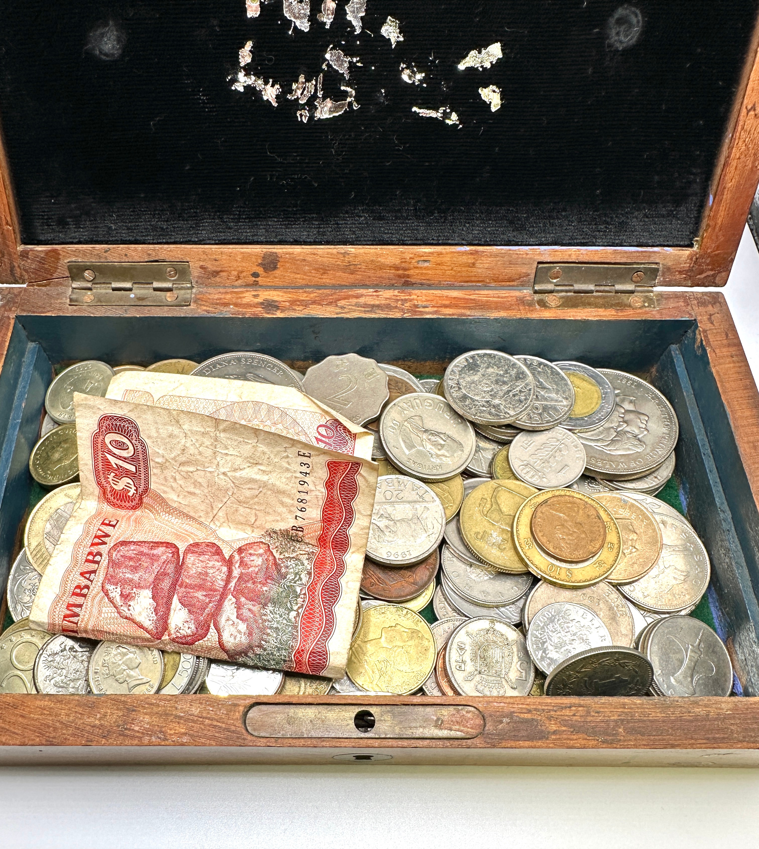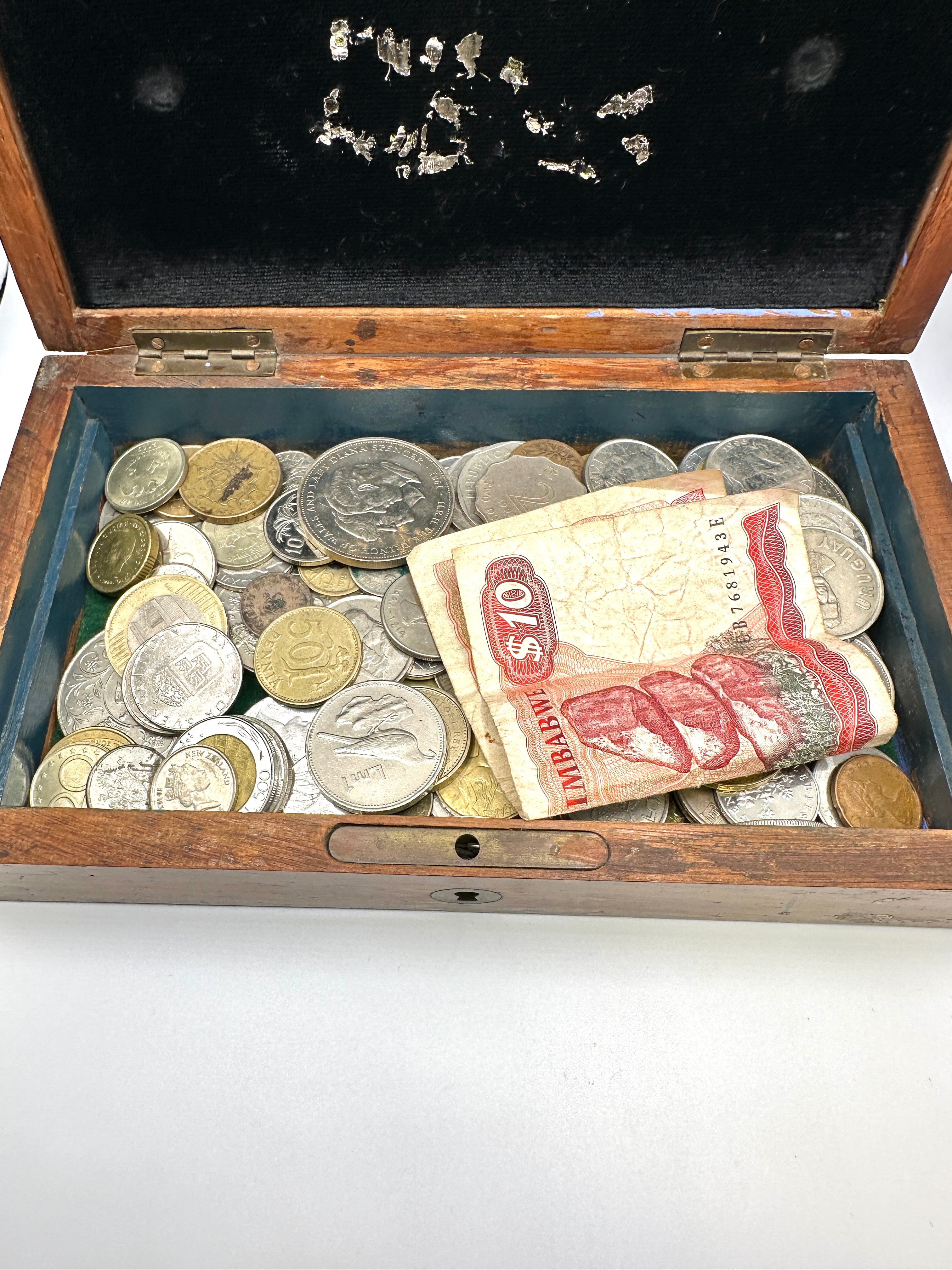 A rectangular wooden box, likely a trinket or coin box, featuring brass hinges and a keyhole escutcheon on the front, with a plain brass plaque affixed to the center of the lid. The interior of the main compartment is lined with blue fabric, while the inside of the lid is lined with black velvet. The box is filled with a collection of diverse metallic coins and a single heavily creased and worn paper banknote. The banknote is identified as a “ZIMBABWE $10” note, serial number EB 7681943 E, depicting three balancing stones and a water buffalo. Visible dates on various coins include “1988,” “1997,” “1999,” and “2001,” indicating a modern world coin collection.