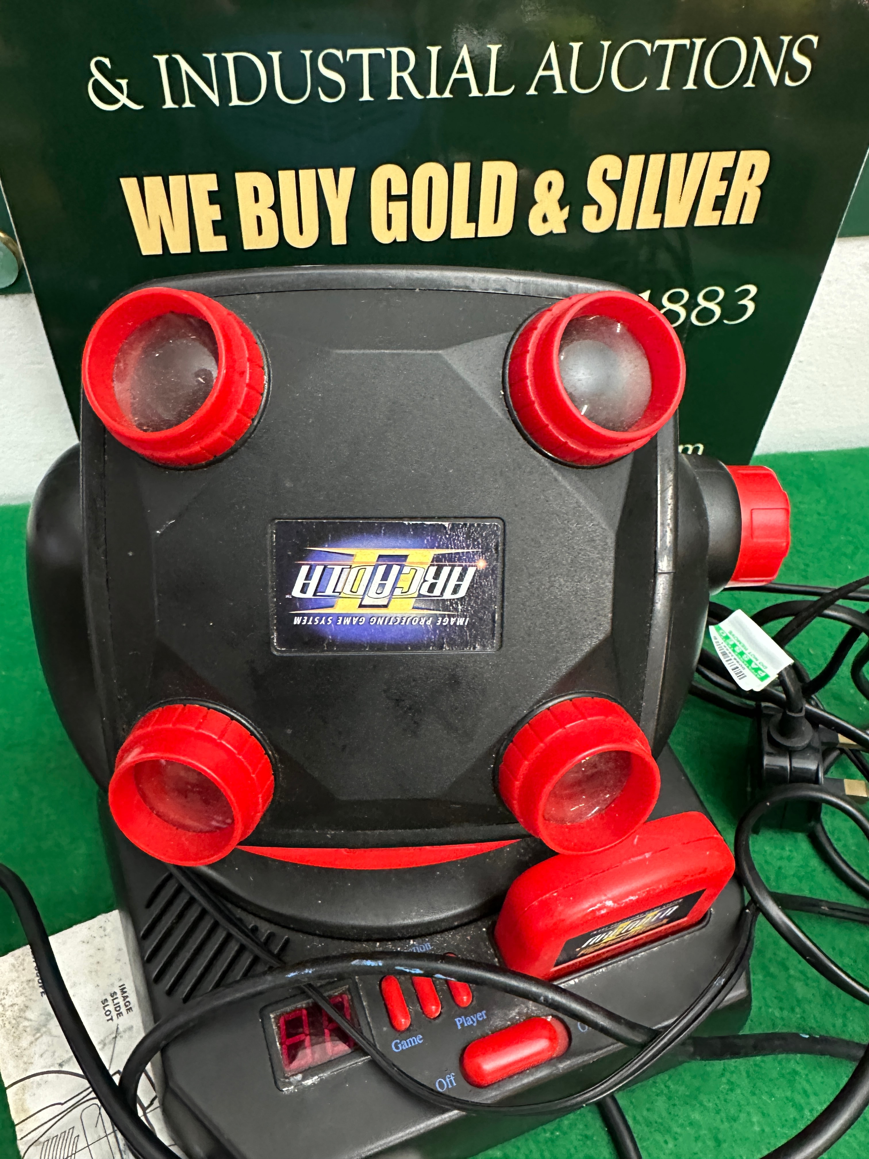 An Arcadia Image Projecting Game System, dating from the late 20th or early 21st century. The system comprises a main projection unit, primarily constructed from black plastic with red, blue, and orange accents, featuring four red-rimmed lenses. The main unit is labeled “Arcadia” and “IMAGE PROJECTING GAME SYSTEM.” It rests on a black plastic base with a red digital display and control buttons marked “Game,” “Player,” and “Off.” The system is accompanied by two black plastic handheld controllers detailed with red and blue stripes and orange trigger elements, a red game cartridge labeled “Arcadia Fighter Attack” and “IMAGE PROJECTING GAME SYSTEM,” a black AC power adapter marked “AC ADAPTER” and regulatory symbols including “CE RCM,” and a creased paper instruction manual.