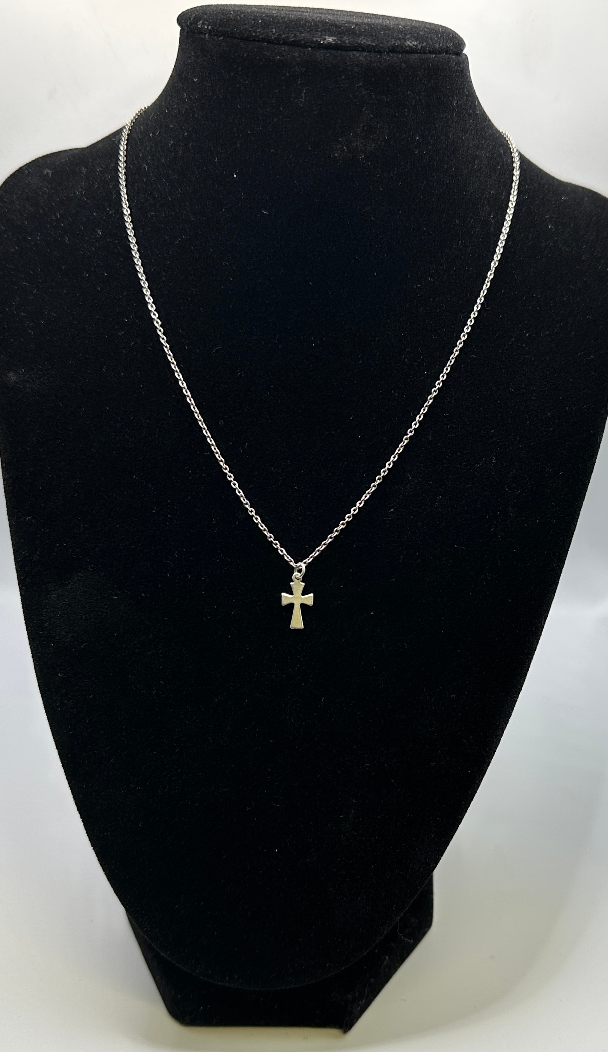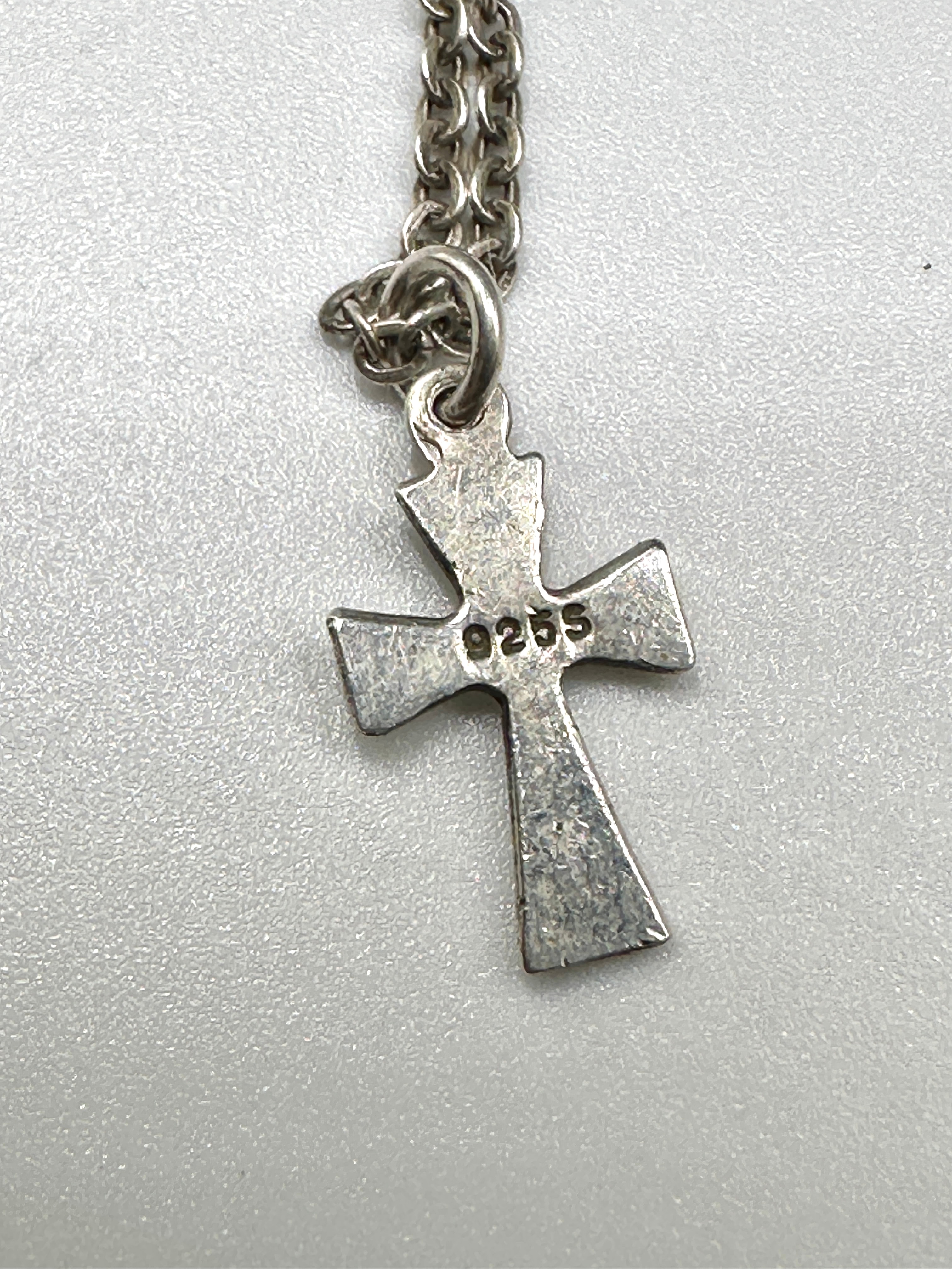 A sterling silver necklace featuring a simple, unadorned cross pendant. The pendant is attached to a delicate link chain. The reverse of the cross pendant bears the hallmark ‘925S’, confirming the material as 925 silver.