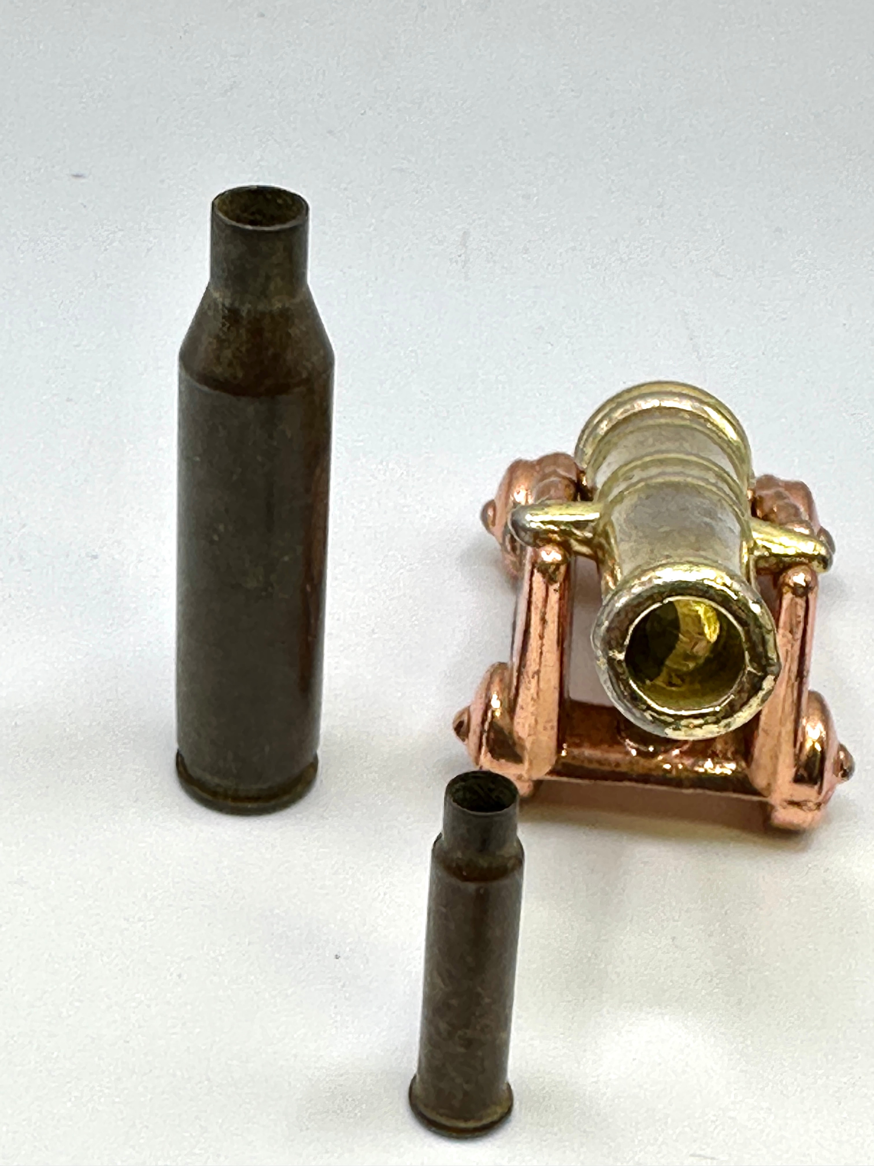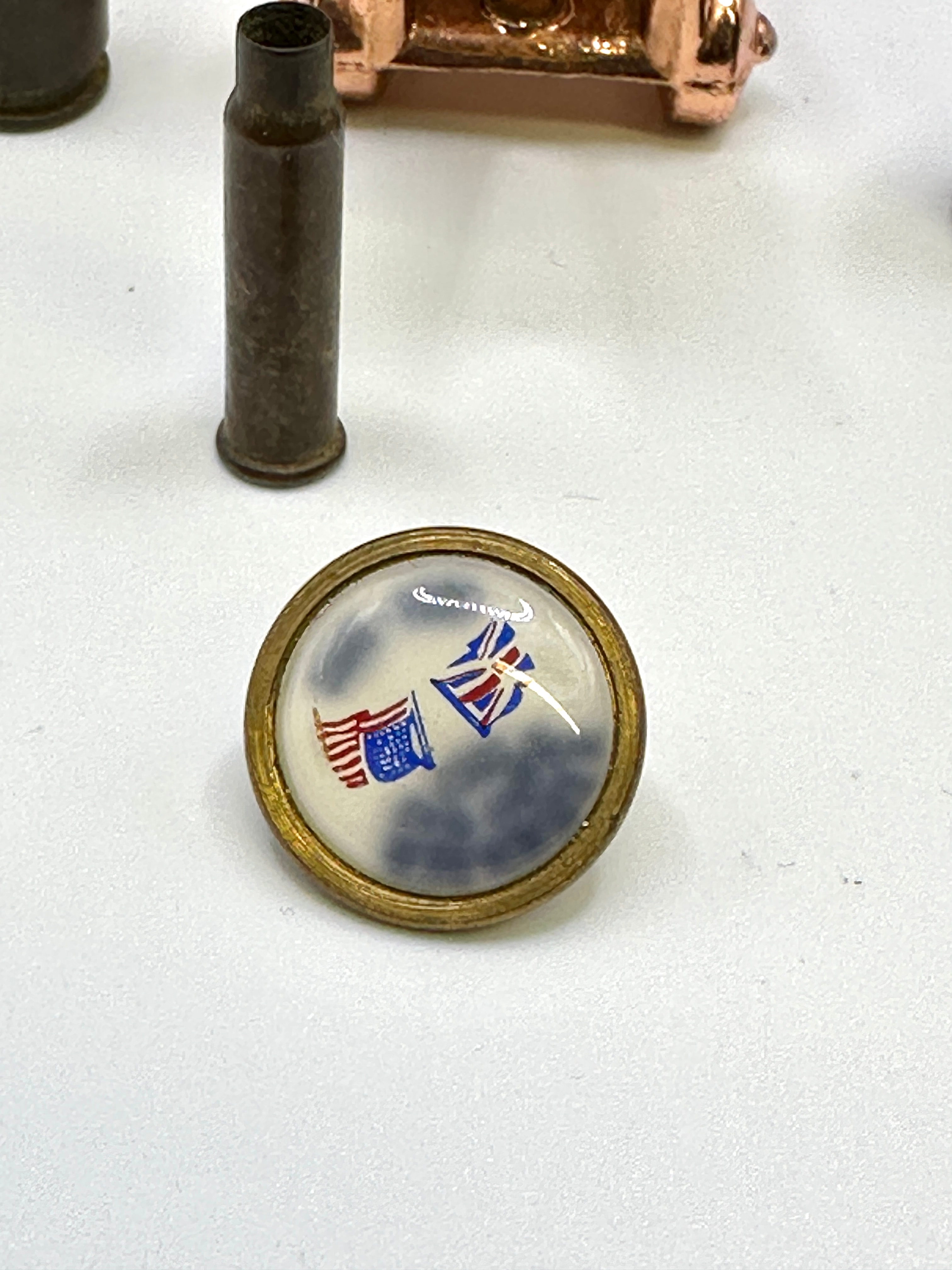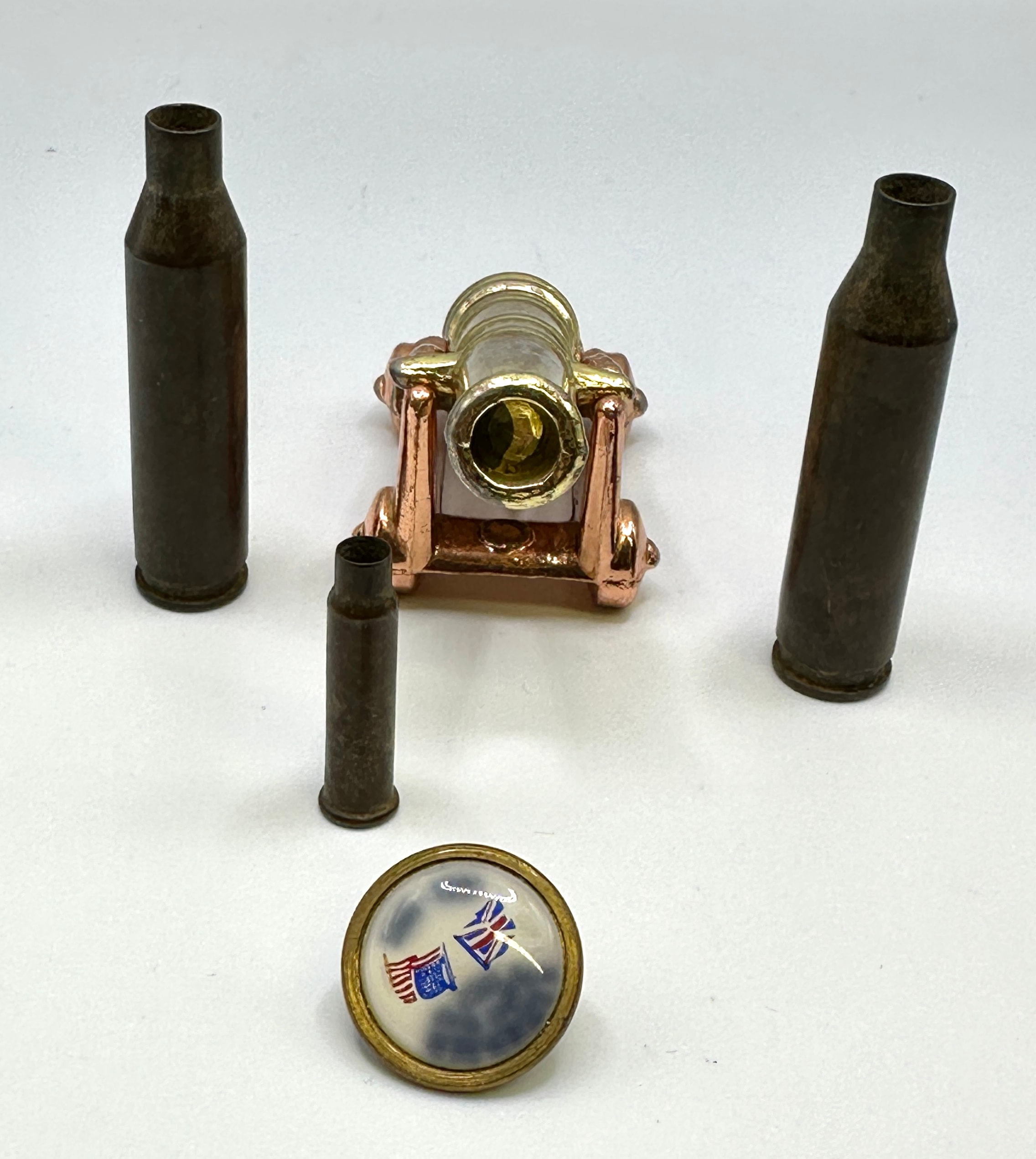 This lot presents a diverse group of five items. It comprises three spent firearm cartridge casings, one miniature decorative cannon, and a single circular patriotic badge. The three casings, two of larger caliber and one of a smaller caliber, are of brass or bronze construction. The miniature cannon features a gold-toned metal barrel mounted on a copper-toned wheeled carriage, presenting a decorative or novelty style. The circular badge has a brass-toned metal rim enclosing a domed insert, which depicts the United States flag and the Union Jack against a cloudy blue sky. Partially visible, reversed text along the upper edge of the insert appears to translate as “Souvenir.”