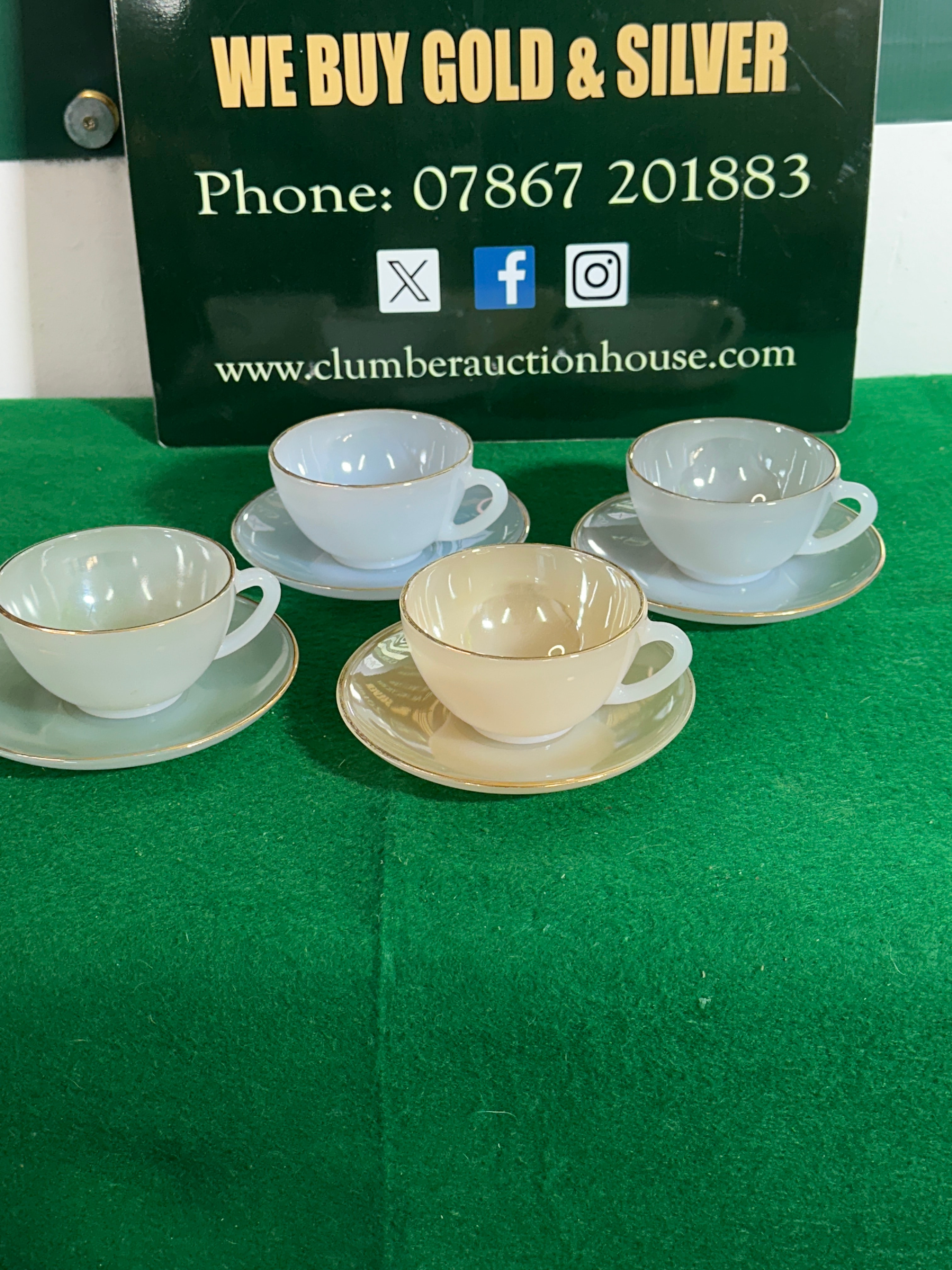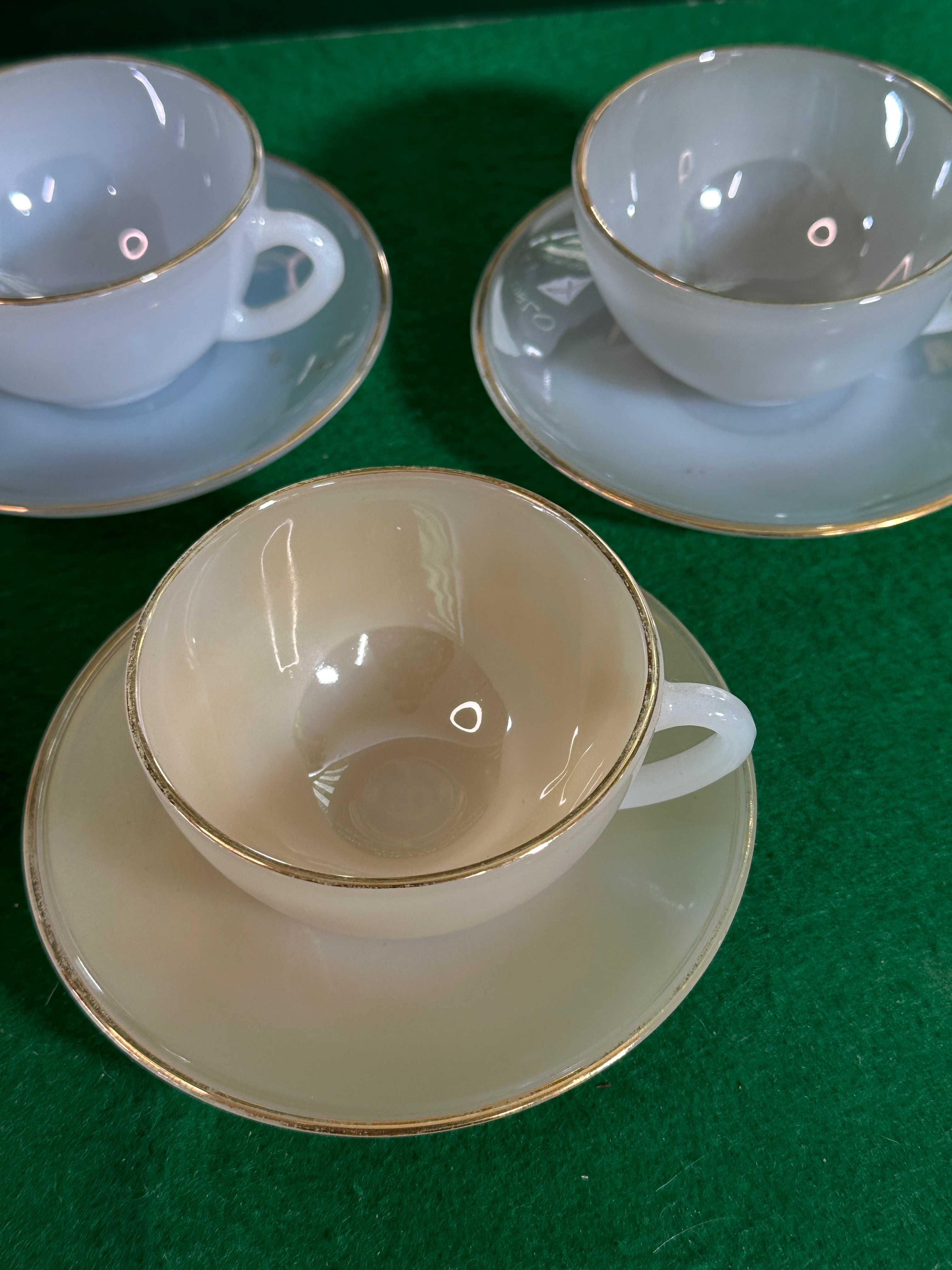 A set of four Arcopal France Harlequin opalescent glass cups and saucers, likely dating from the mid-20th century. Each piece exhibits a subtle iridescent sheen. The lot comprises two light blue sets, one pale cream/yellow set, and one light-toned set. All cups and saucers feature simple forms accented with a consistent gold band along their rims. An illegible embossed marking is visible on the underside of one cup.