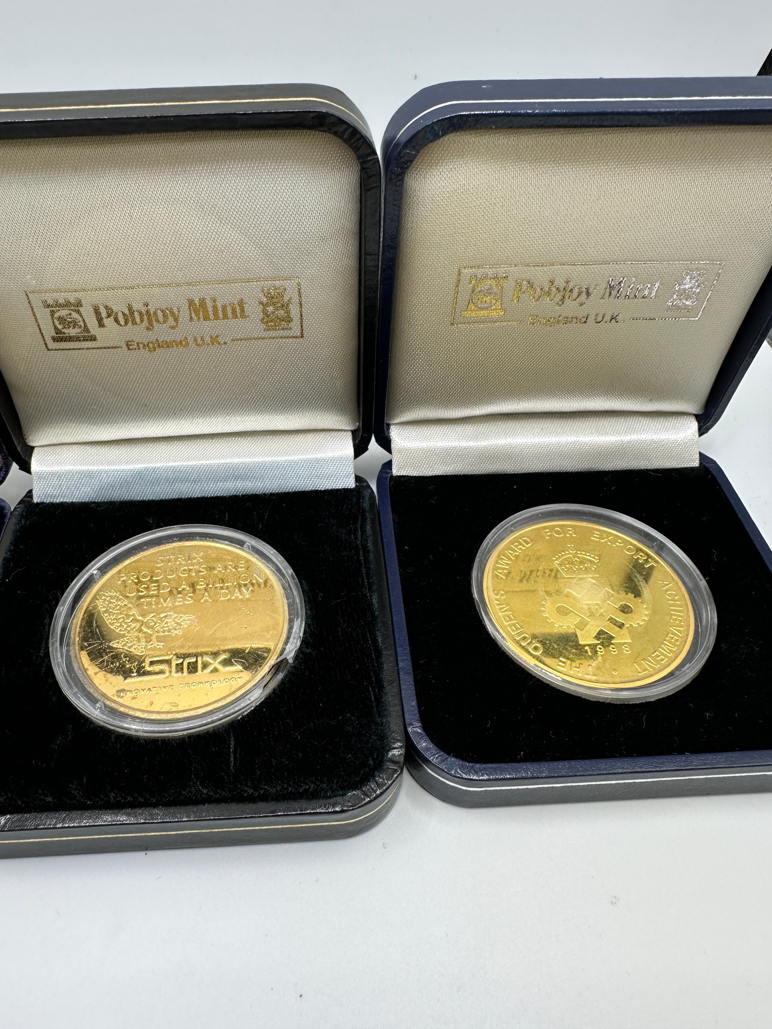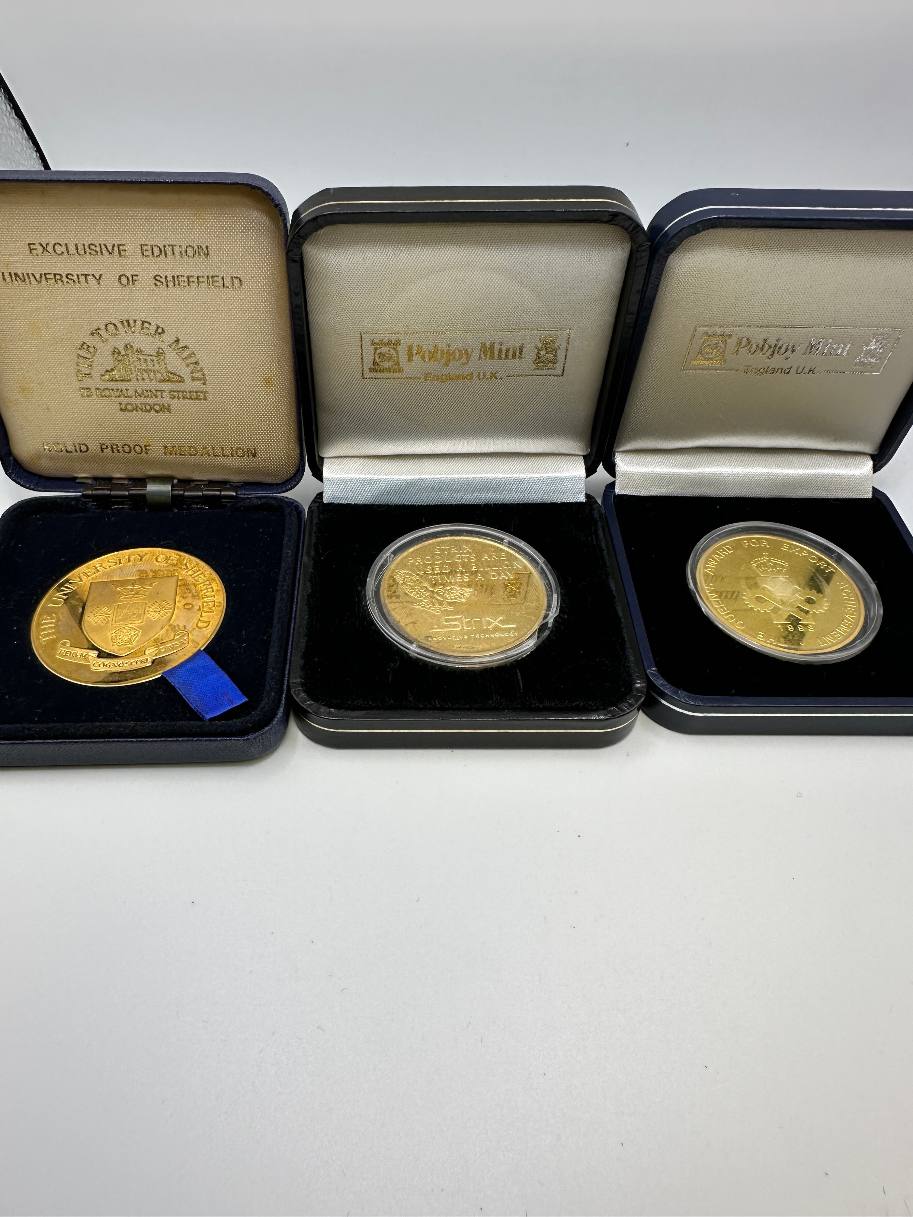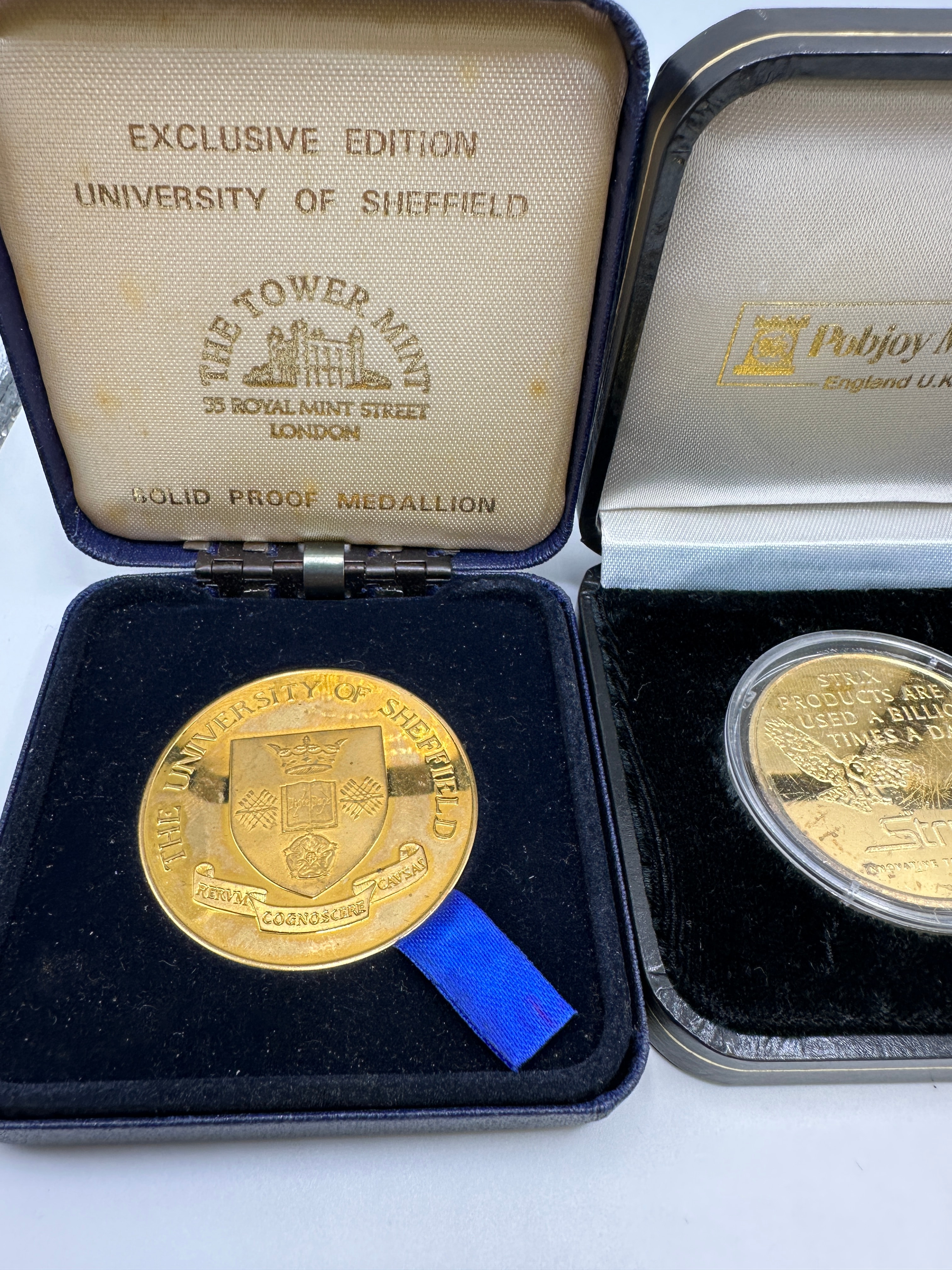 A group of three gold-toned commemorative medallions, each housed in its original hinged presentation box. The first medallion, from The Tower Mint, London, is an “EXCLUSIVE EDITION UNIVERSITY OF SHEFFIELD SOLID PROOF MEDALLION” featuring the university’s crest and the Latin motto “RERUM COGNOSCERE CAUSAS, ” accompanied by a blue ribbon. The second and third medallions are both from Pobjoy Mint, England U.K., and are presented in clear protective capsules. One Pobjoy Mint medallion is inscribed “STRAX PRODUCTS ARE USED BY 2 BILLION PEOPLE 2 TIMES A DAY” and “SMX, ” dated 1988. The third Pobjoy Mint medallion commemorates “THE QUEEN’S AWARD FOR EXPORT ACHIEVEMENT 1988,” featuring a design depicting a ship or offshore rig.