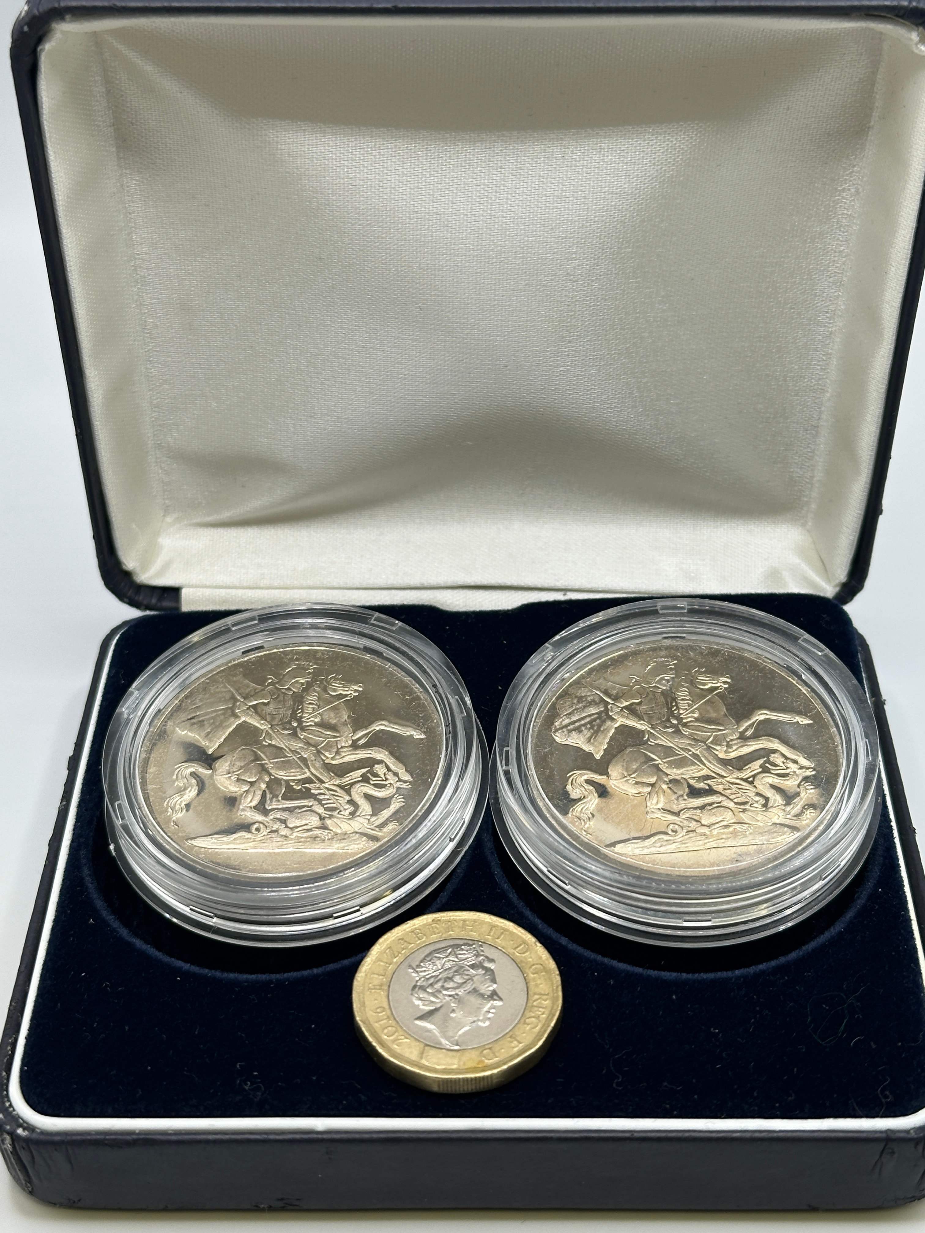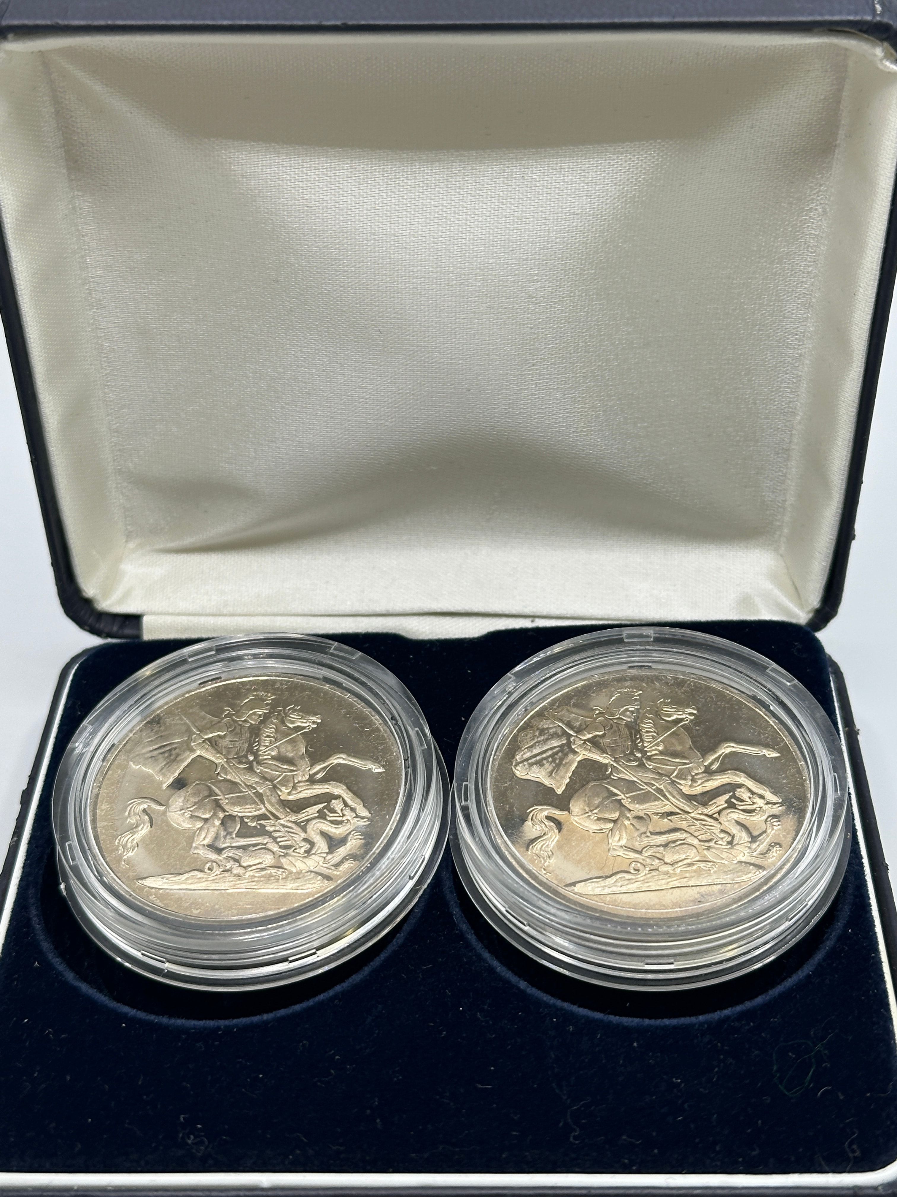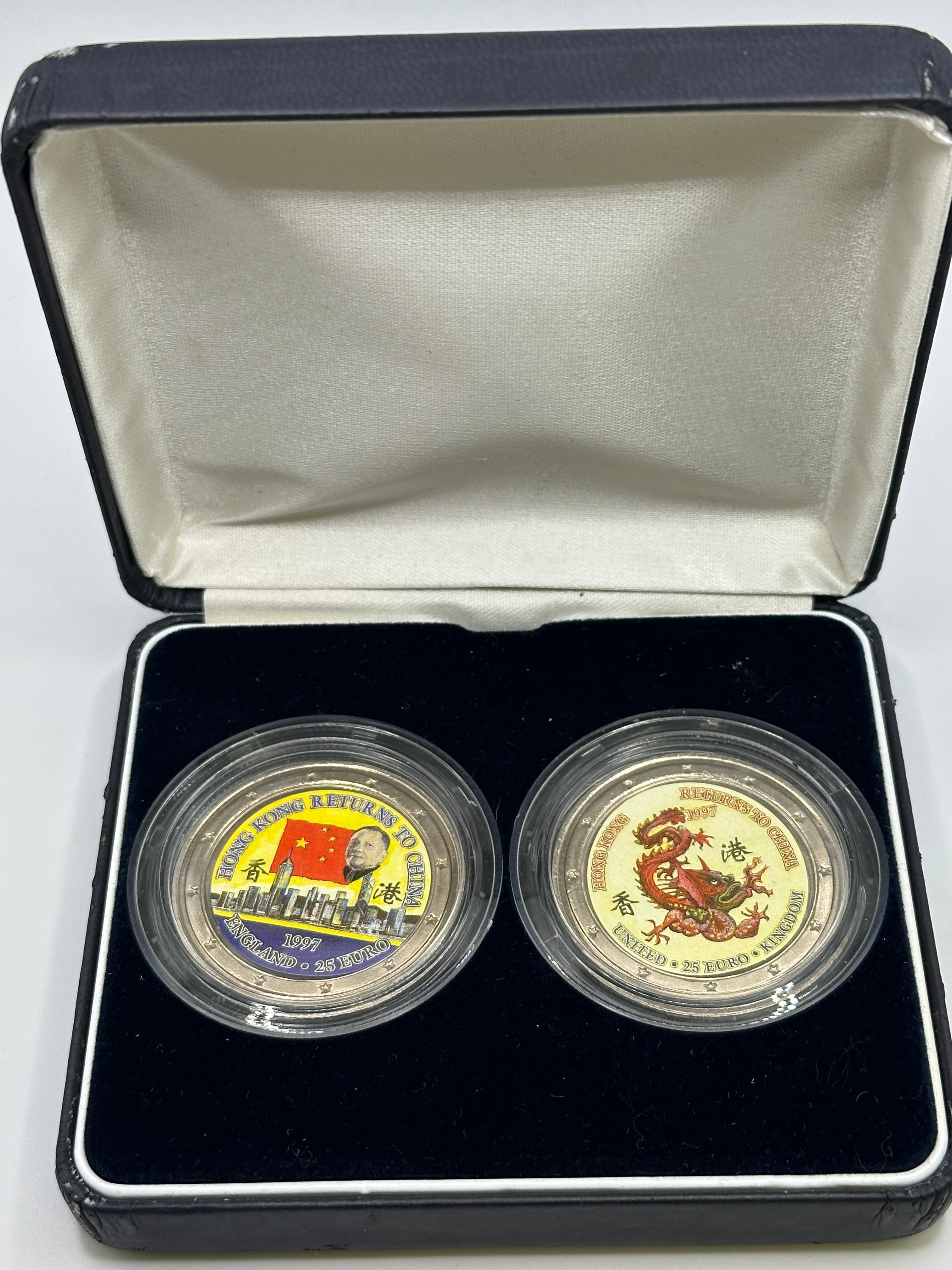A pair of large, round, metallic commemorative medallions, each inscribed with a ’25 EURO’ denomination, presented in a dark, velvet-lined display box. The first medallion, dated 1997, features an obverse depicting a cityscape beneath the Chinese and British flags, with the inscription “HONG KONG RETURNS TO CHINA”, “ENGLAND”, and the Chinese characters “香港” (Hong Kong). The second medallion, dated 2007, features an obverse with a prominent red dragon design, inscribed “HONG KONG AND CHINA”, “UNITED”, “KINGDOM”, and “香港” (Hong Kong). Both medallions share a reverse design depicting a relief of St. George on horseback slaying a dragon, with the inscription “ST. GEORGE AND THE DRAGON”. A smaller, bi-metallic coin, dated 2006 and bearing the effigy of Queen Elizabeth II, consistent with a British pound coin, is included for scale.