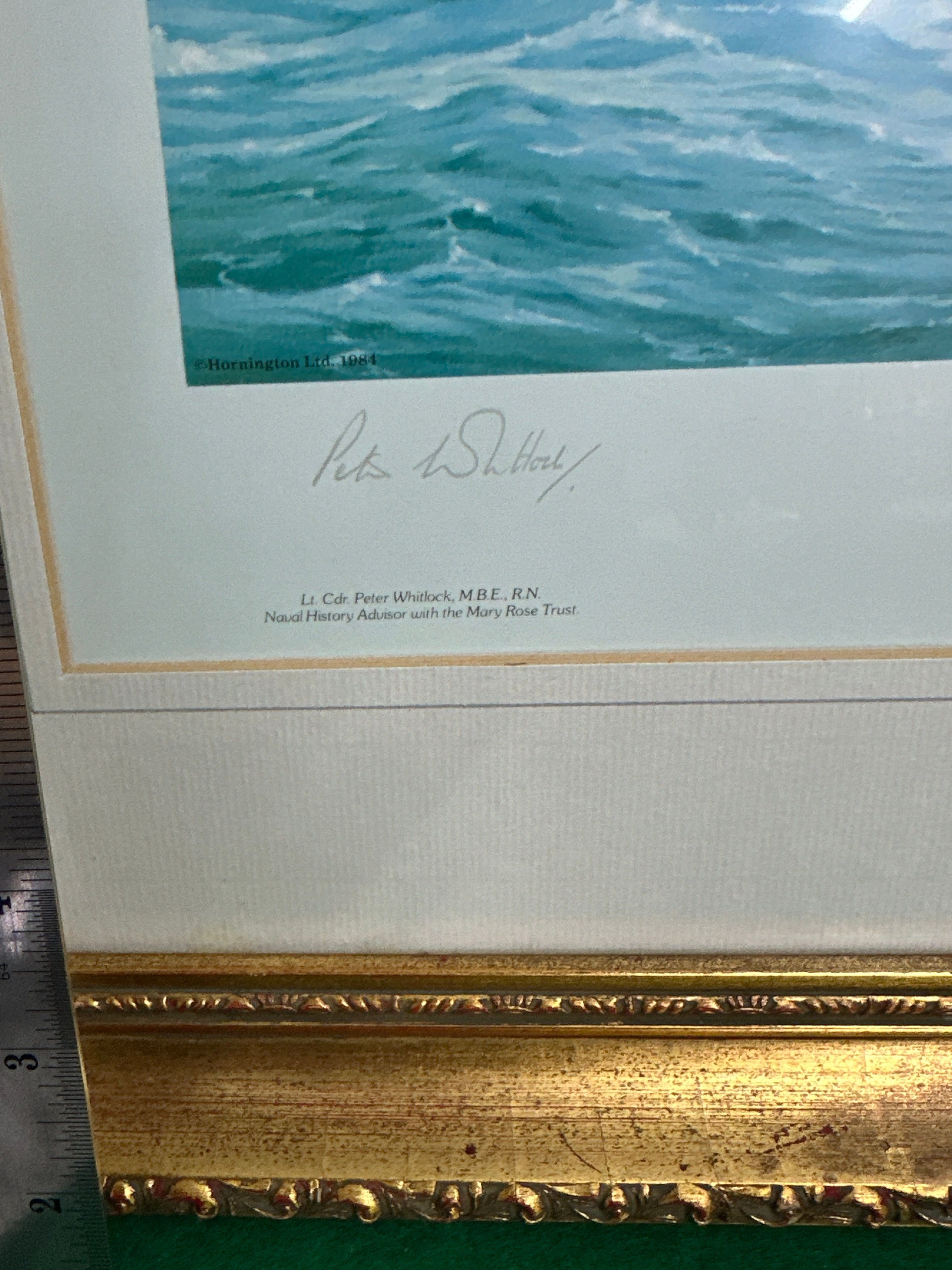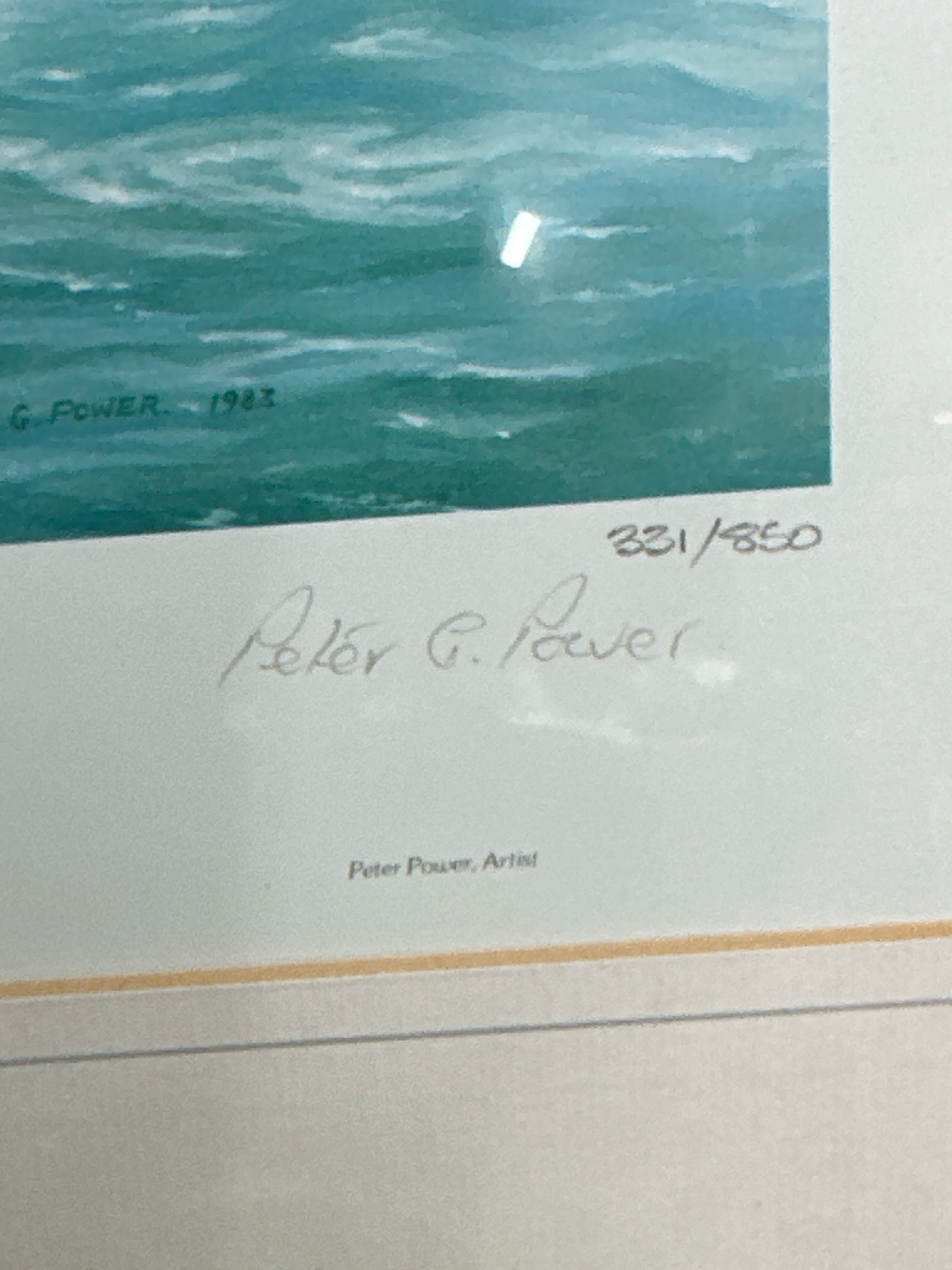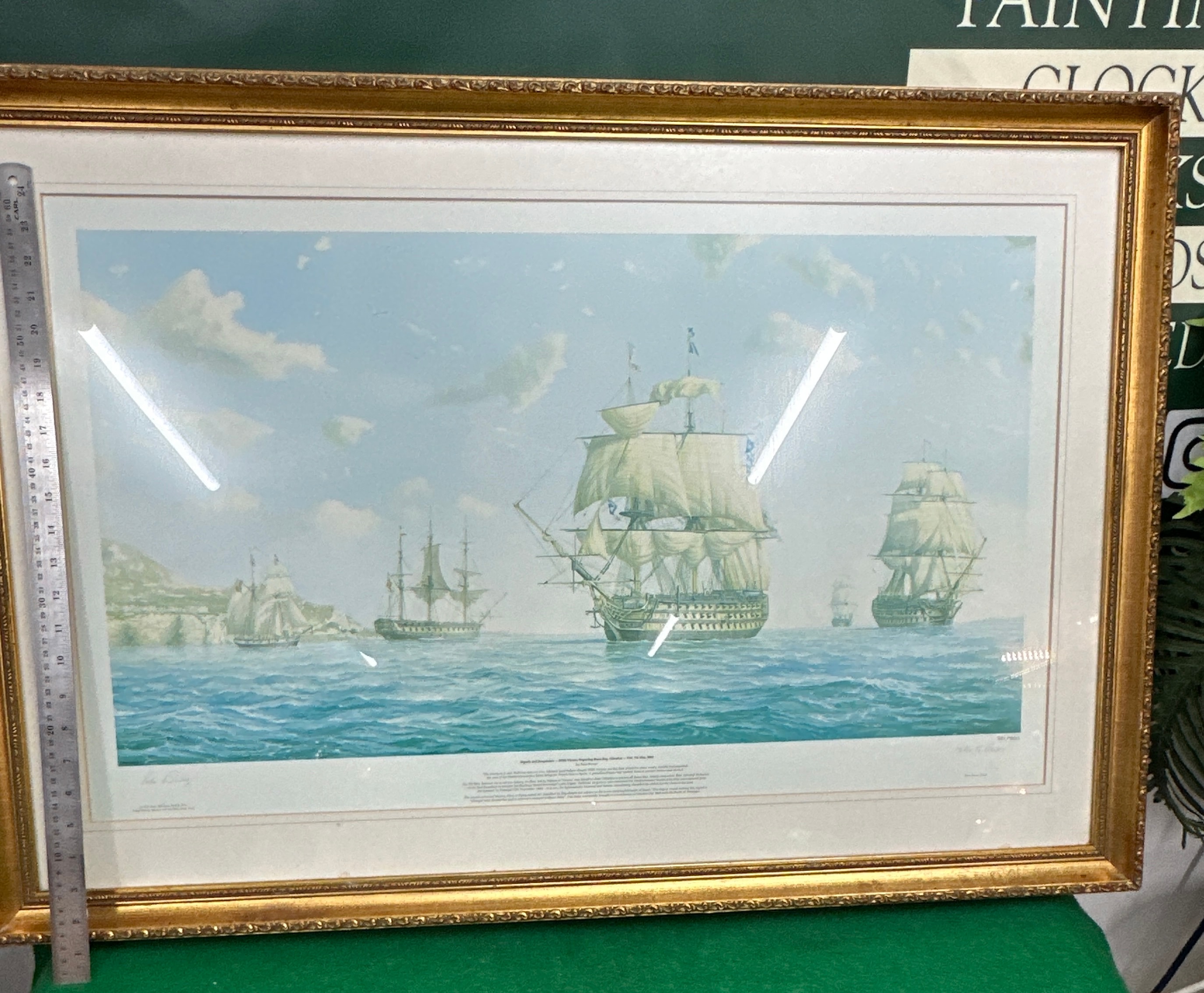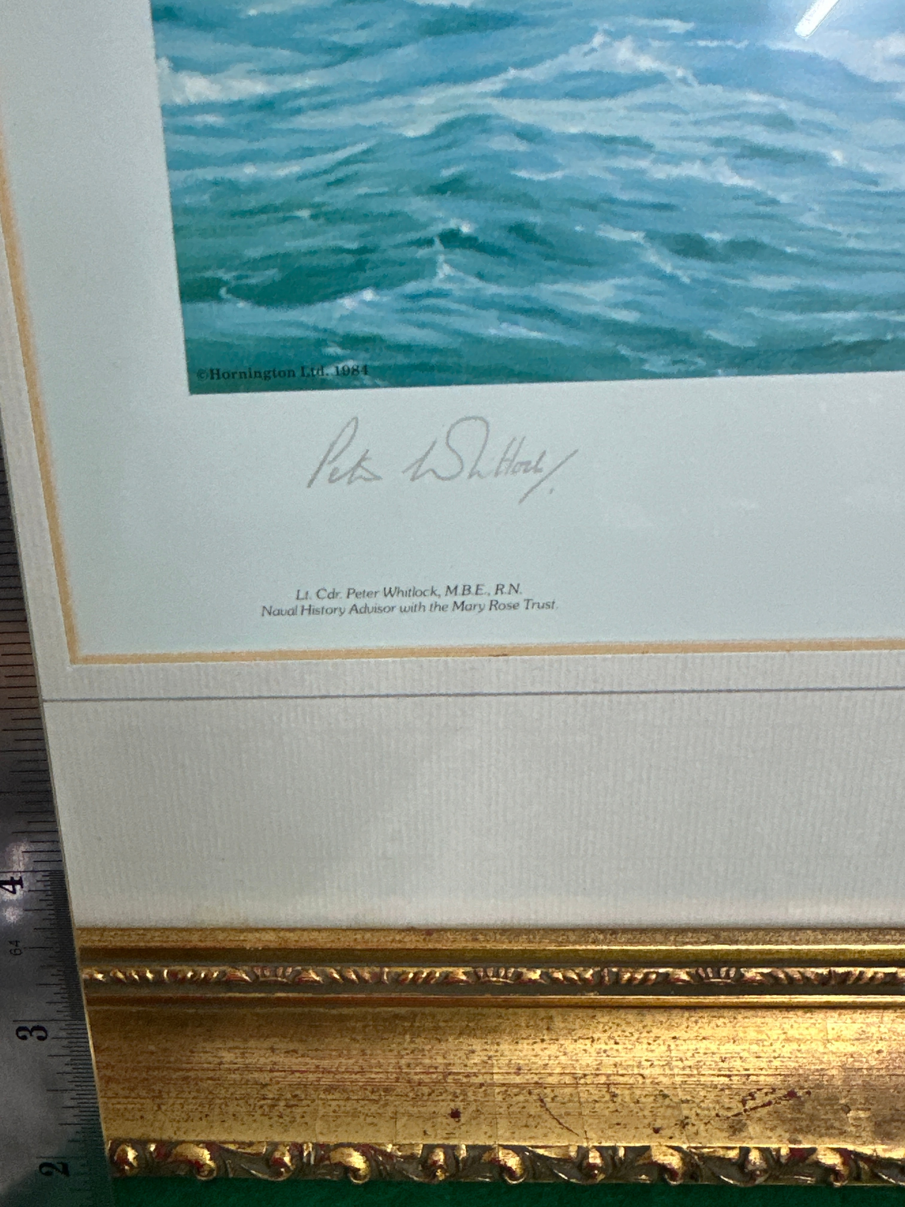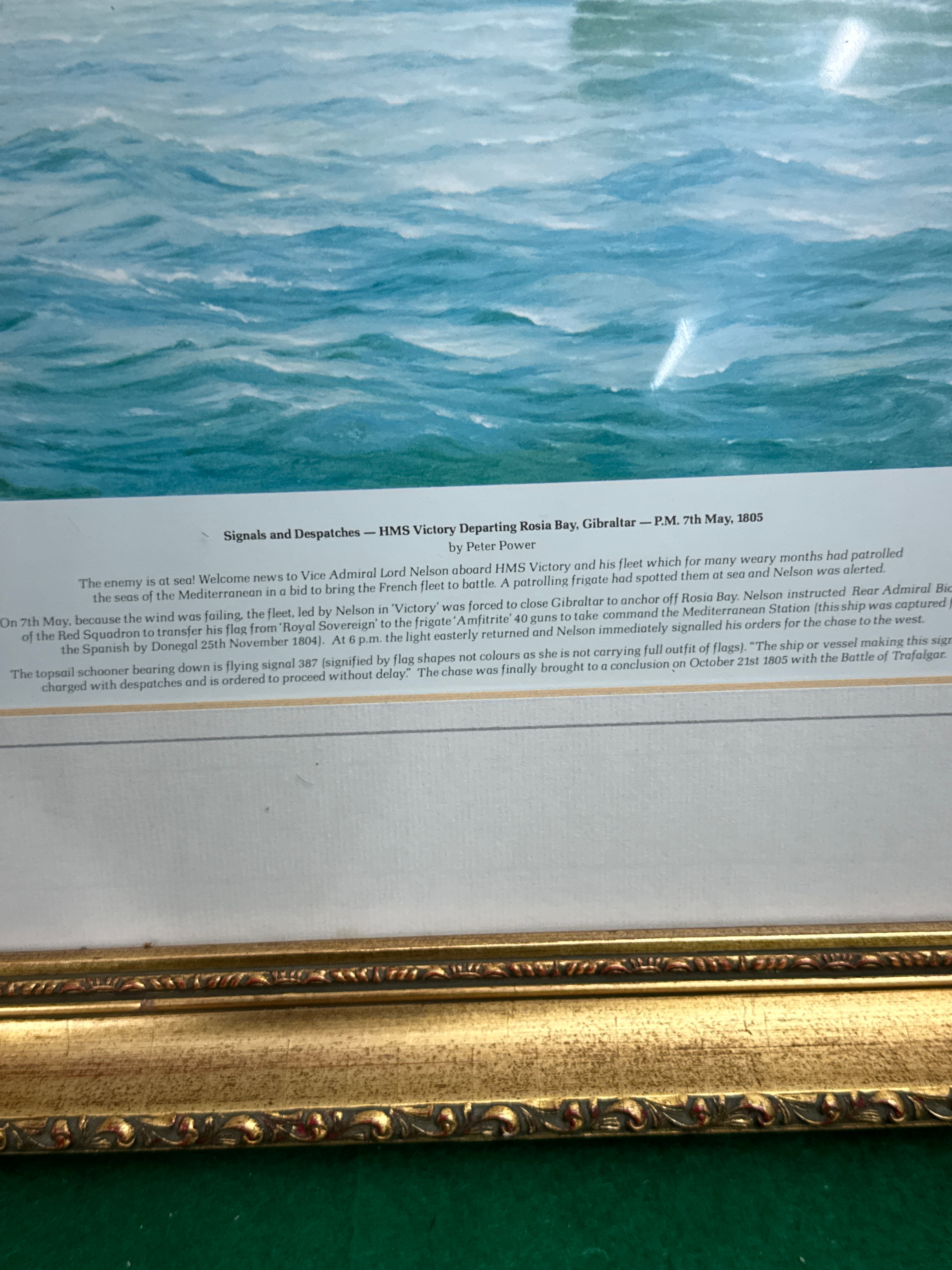 A limited-edition print by Peter G. Power, titled ‘Signals and Despatches – HMS Victory Departing Rosia Bay, Gibraltar – 7th May, 1805’. The print depicts a historical maritime scene featuring several sailing warships on a calm sea. It is numbered 331/850 and signed by Peter G. Power, with a copyright date of 1983-1984. An additional signature is present from Lt. Cdr. Peter Whitlock, M.B.E., R.N., Naval History Advisor with the Mary Rose Trust. The print includes a detailed historical narrative concerning Admiral Lord Nelson and the events leading to the Battle of Trafalgar. It is housed under glass within a white matte and a decorative giltwood-style frame.