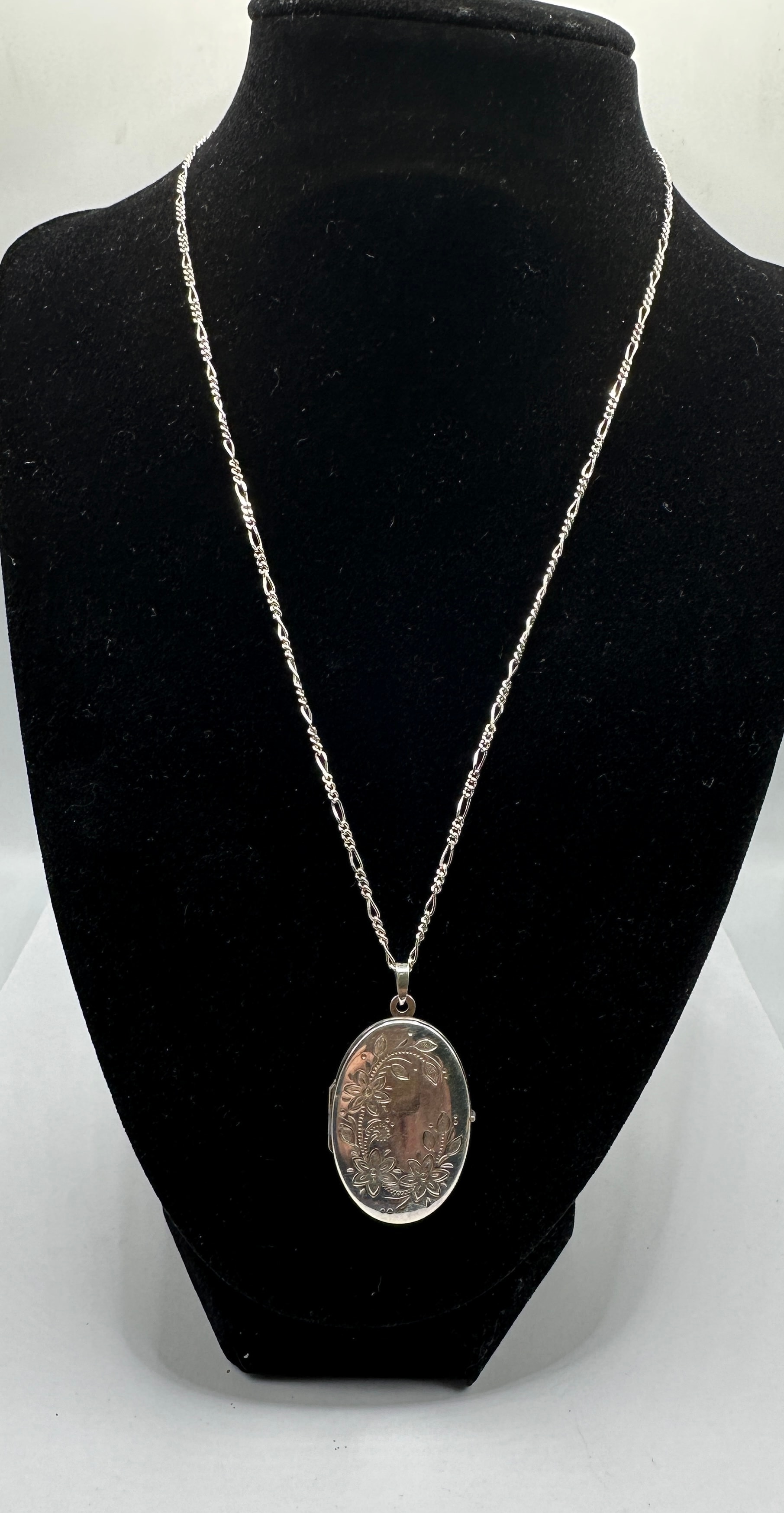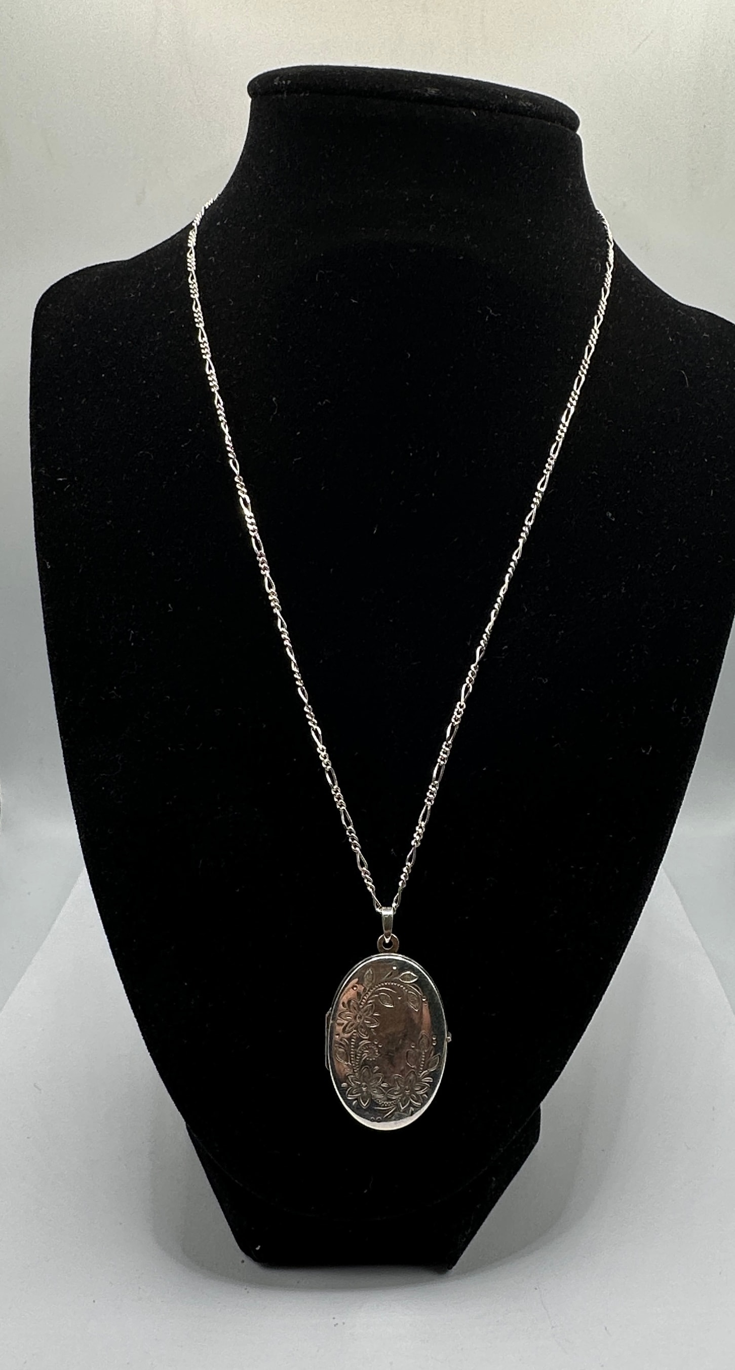A silver-tone metal necklace featuring a circular locket pendant suspended from a figaro-style chain. The locket’s visible face is adorned with intricate engraved or chased floral and foliate scrollwork. No discernible text or hallmarkings are visible.