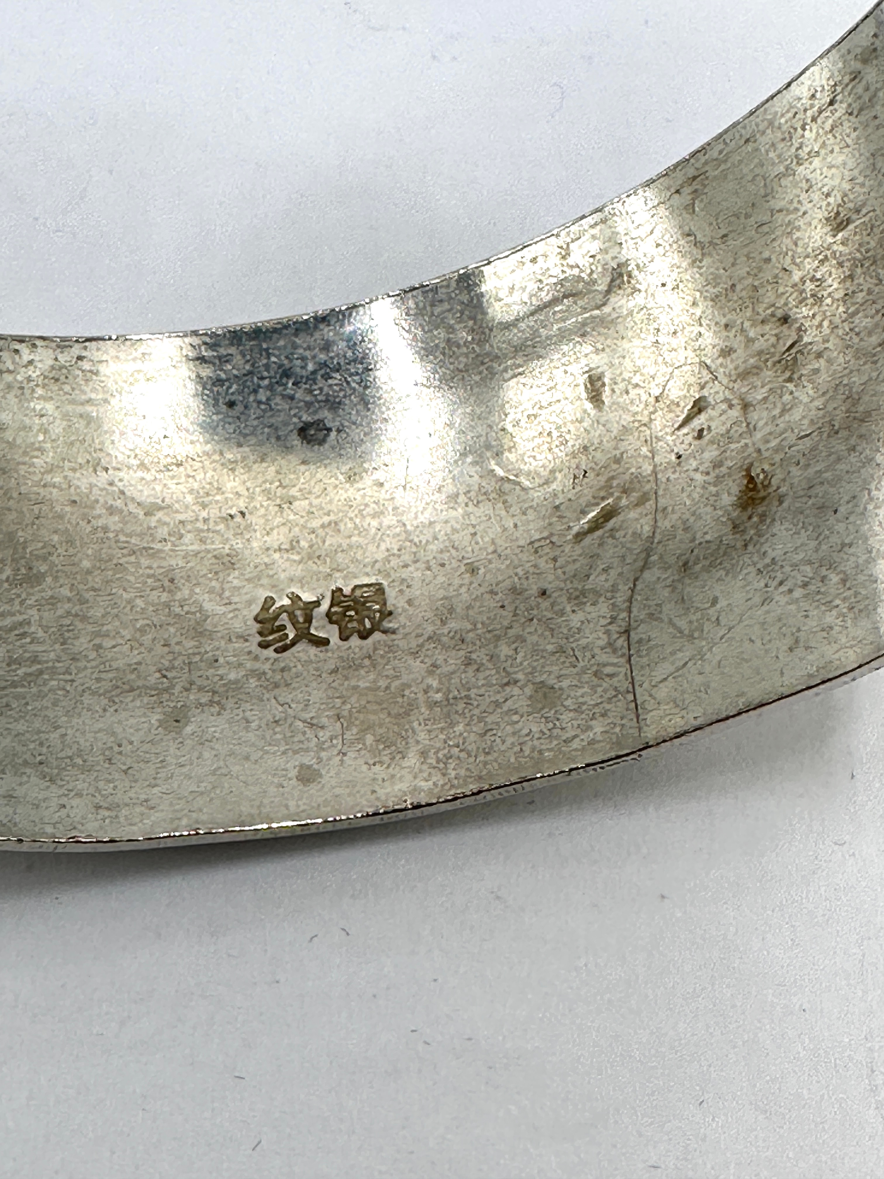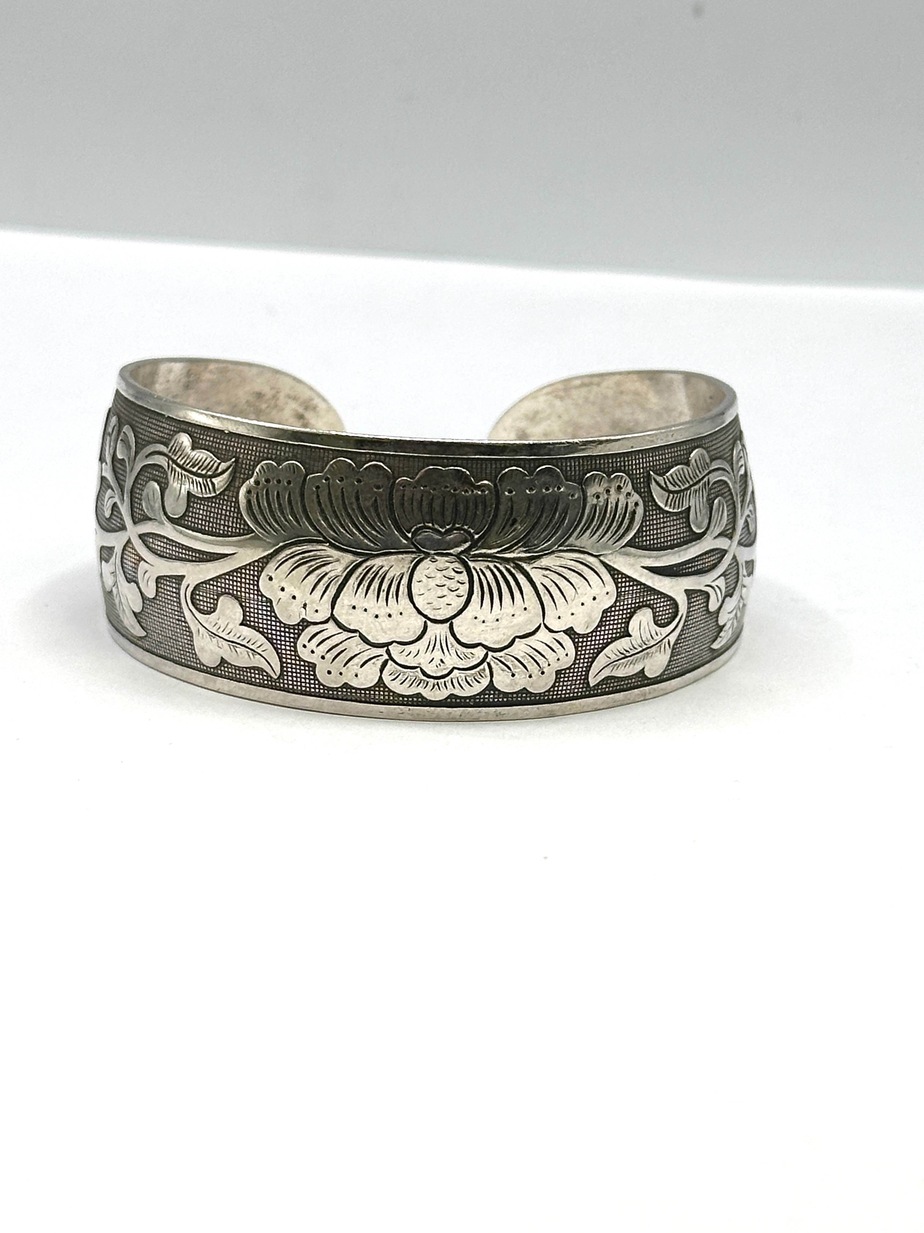 A Tibetan Tibet silver cuff bracelet, extensively decorated with deeply engraved or chased floral and foliate motifs, featuring a prominent central peony blossom flanked by scrolling leaves. The interior surface bears a visible stamp of two Chinese characters, “纹银” (wén yín), indicating “patterned silver” or “standard silver.”