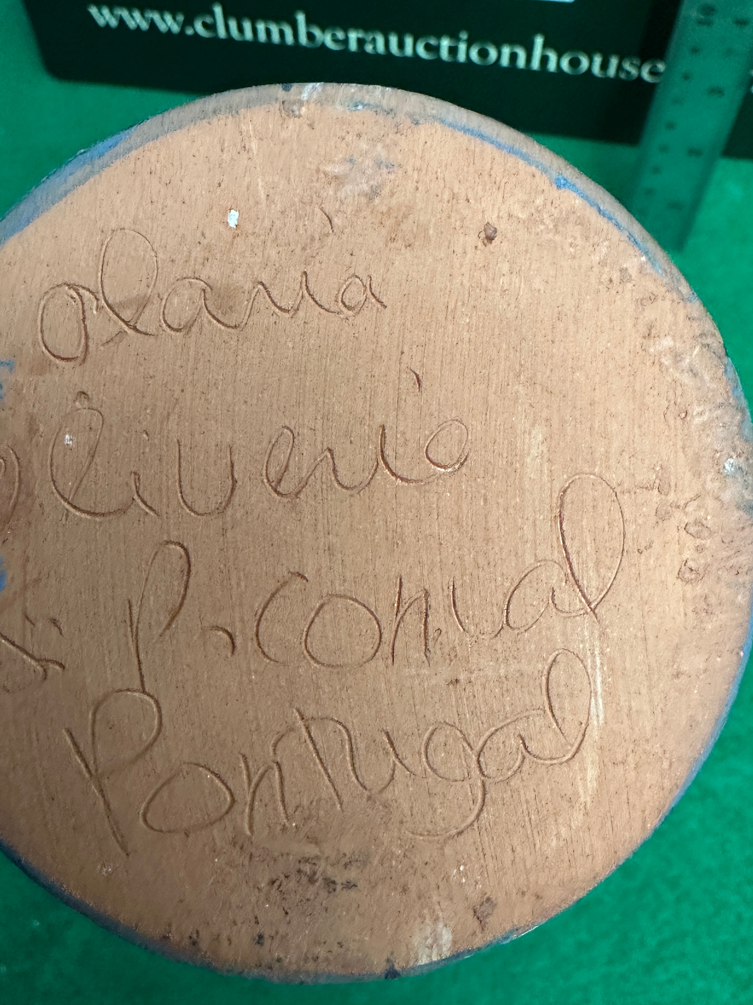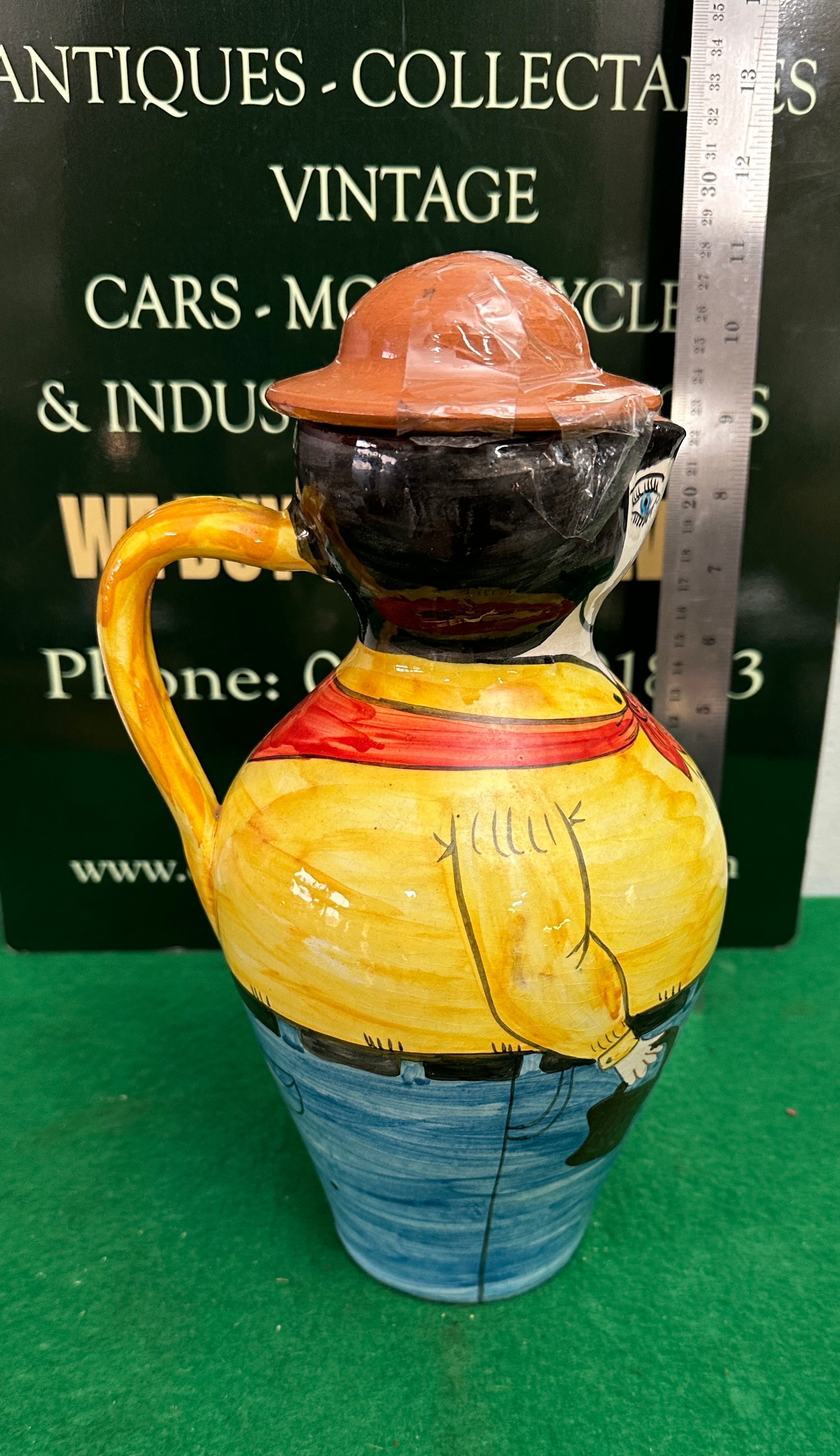 A hand-painted ceramic novelty jug by Olaria Ribeiro, Portugal. Crafted from earthenware or terracotta, as indicated by the unglazed base, the piece is shaped and decorated in a whimsical, folk art style. It depicts a figure, possibly a cowboy, wearing a brown hat, a yellow shirt with a red bandana, blue jeans, and painted details including a belt and a holster-like pouch. The figure features dark hair, blue eyes, and red lips. The base is incised with the text “Olaria Ribeiro P. Comercial Portugal,” which translates to “Ribeiro Pottery, Commercial Production, Portugal.”