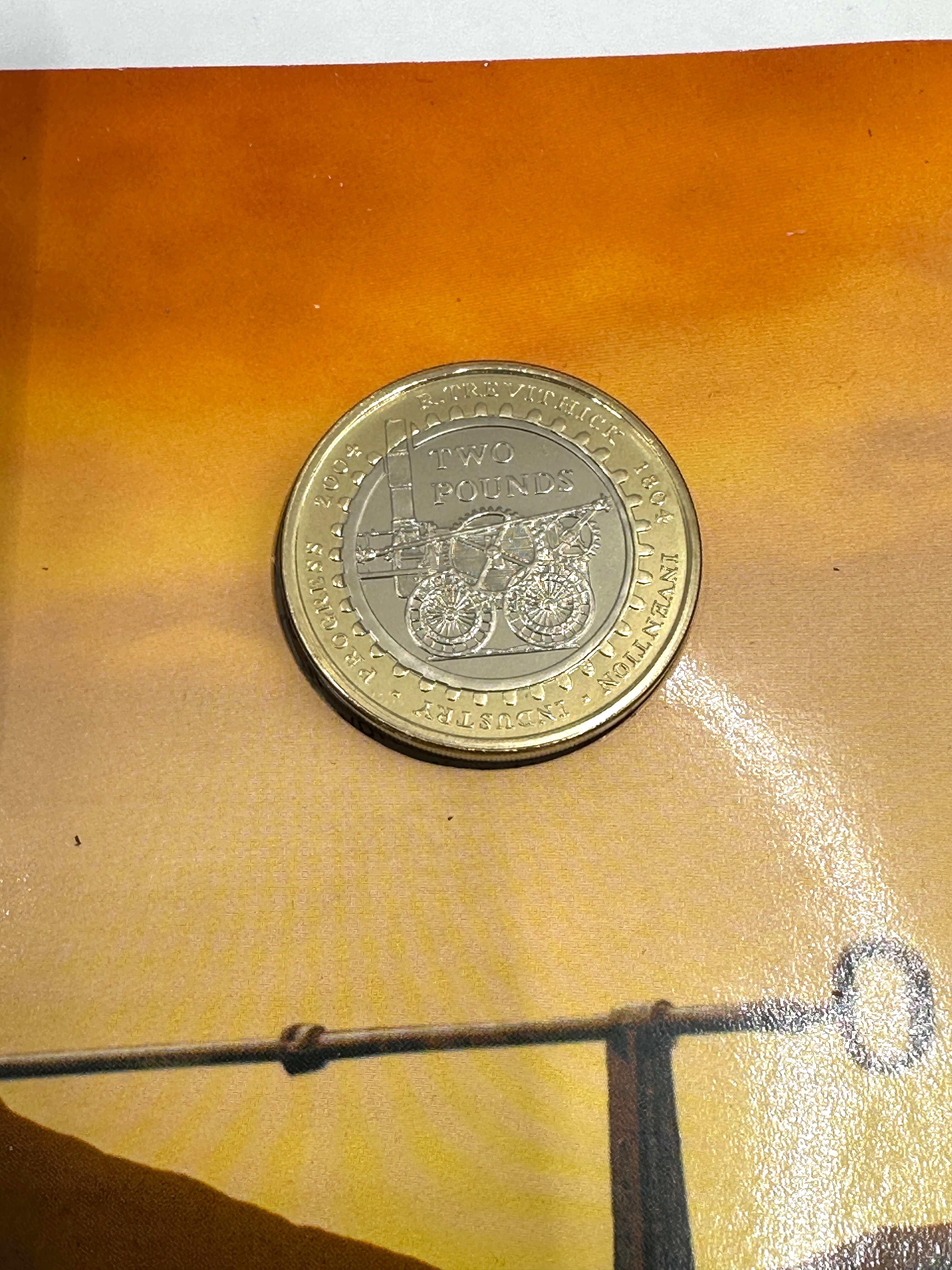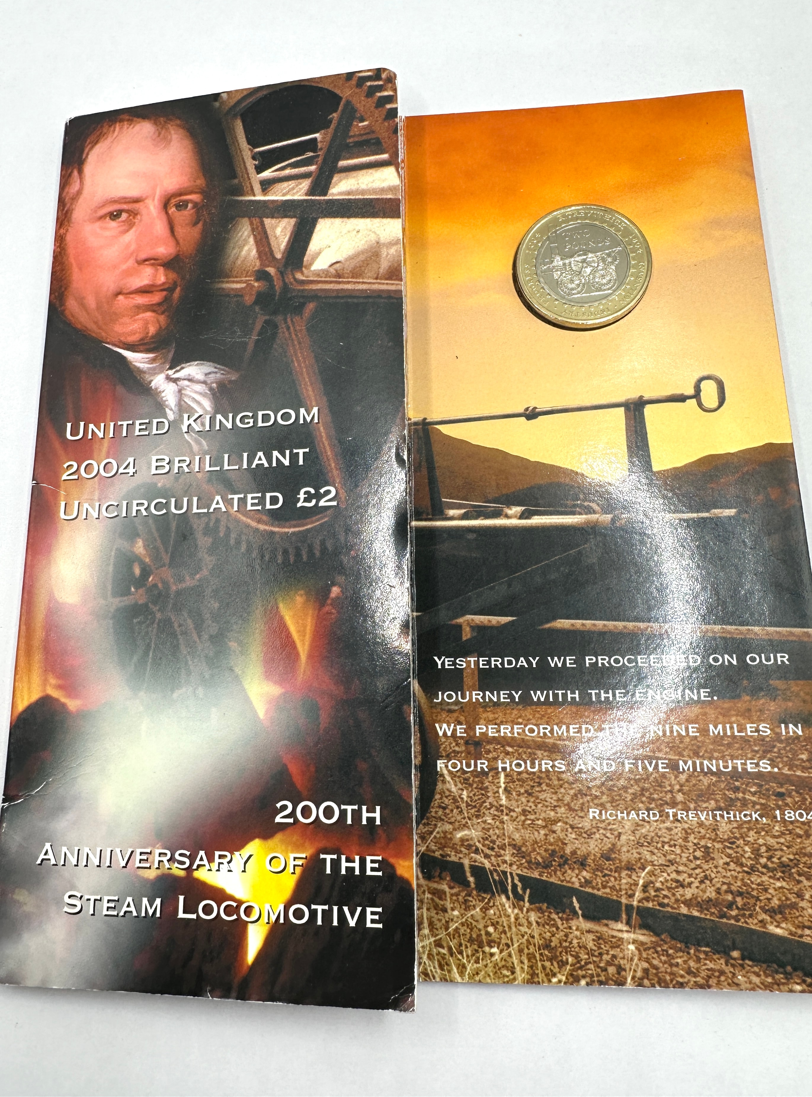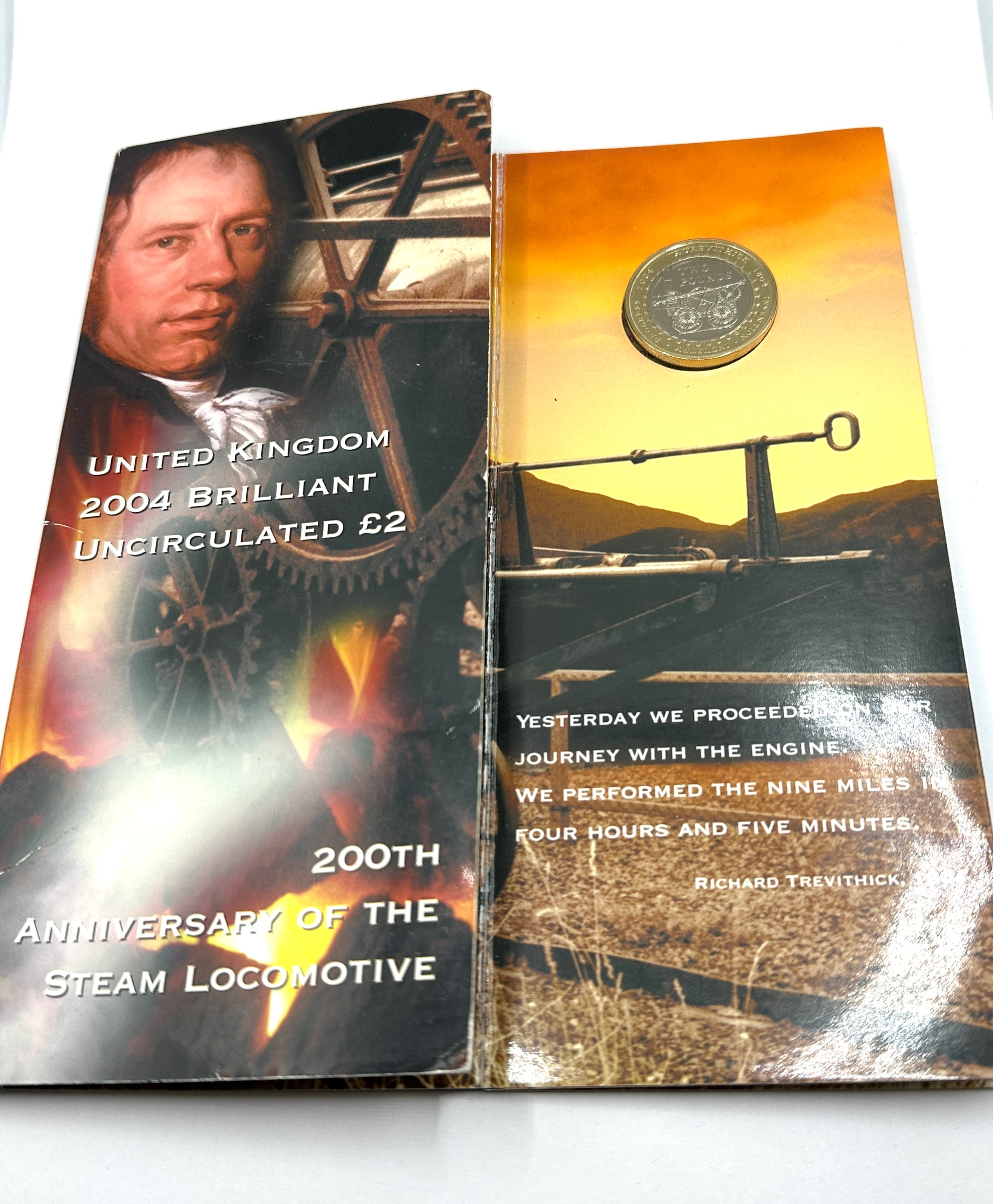 A United Kingdom 2004 Brilliant Uncirculated £2 ‘Steam Locomotive’ commemorative coin, issued to celebrate the 200th Anniversary of the Steam Locomotive. The bimetallic coin features a gold-colored outer ring and a silver-colored inner core. The reverse design depicts an early steam locomotive, with the denomination ‘TWO POUNDS’ and partial text including ‘INDUSTRY’ and ‘INVENTION’. The coin is presented within its original informational card folder. The folder’s left panel features a portrait of Richard Trevithick amidst industrial gears, with text identifying it as ‘UNITED KINGDOM 2004 BRILLIANT UNCIRCULATED £2’ and celebrating the ‘200TH ANNIVERSARY OF THE STEAM LOCOMOTIVE’. The right panel displays a quote from ‘RICHARD TREVITHICK, 1804’: ‘YESTERDAY WE PROCEEDED ON OUR JOURNEY WITH THE ENGINE. WE PERFORMED THE NINE MILES IN FOUR HOURS AND FIVE MINUTES,’ set against a sepia-toned landscape with a railway structure.