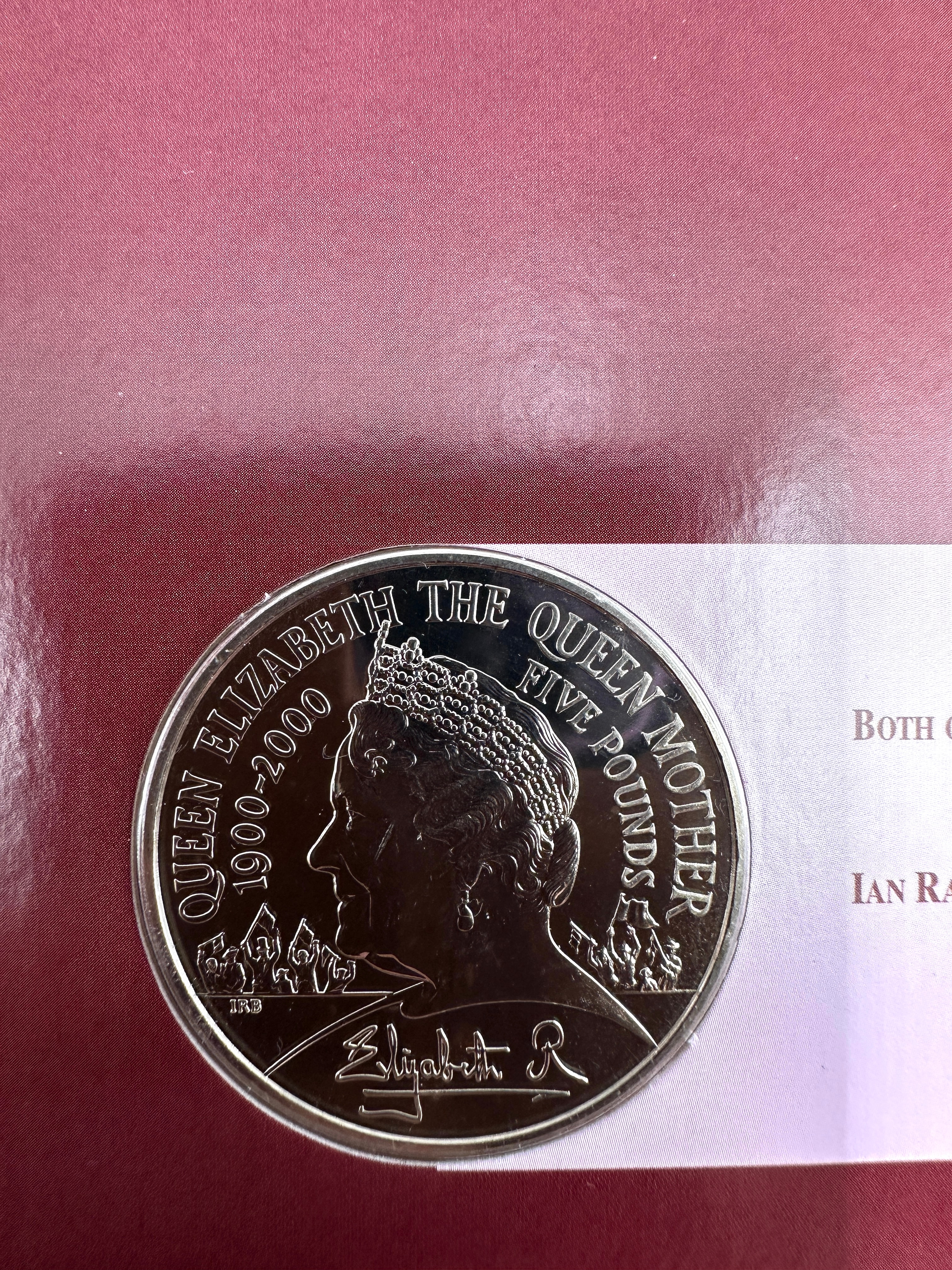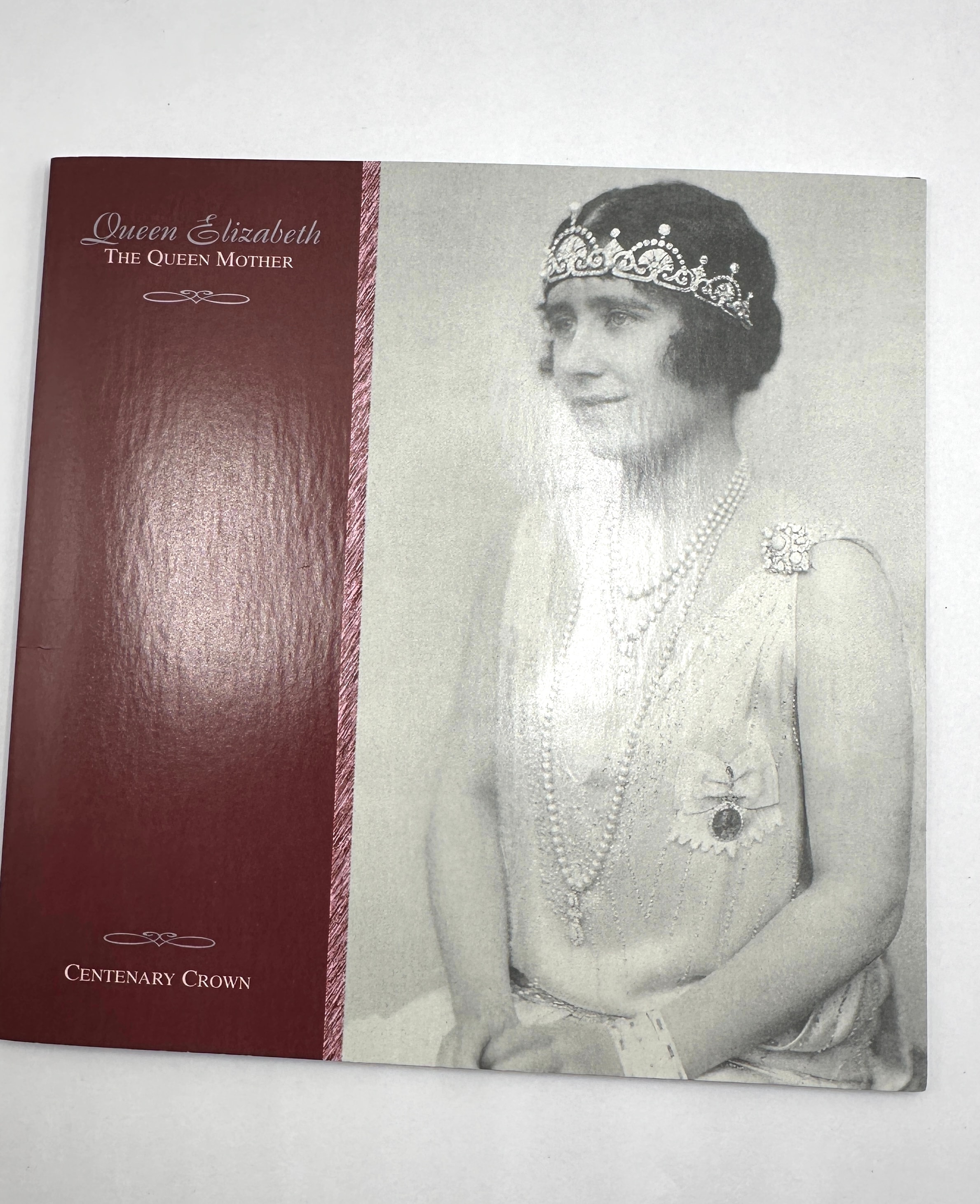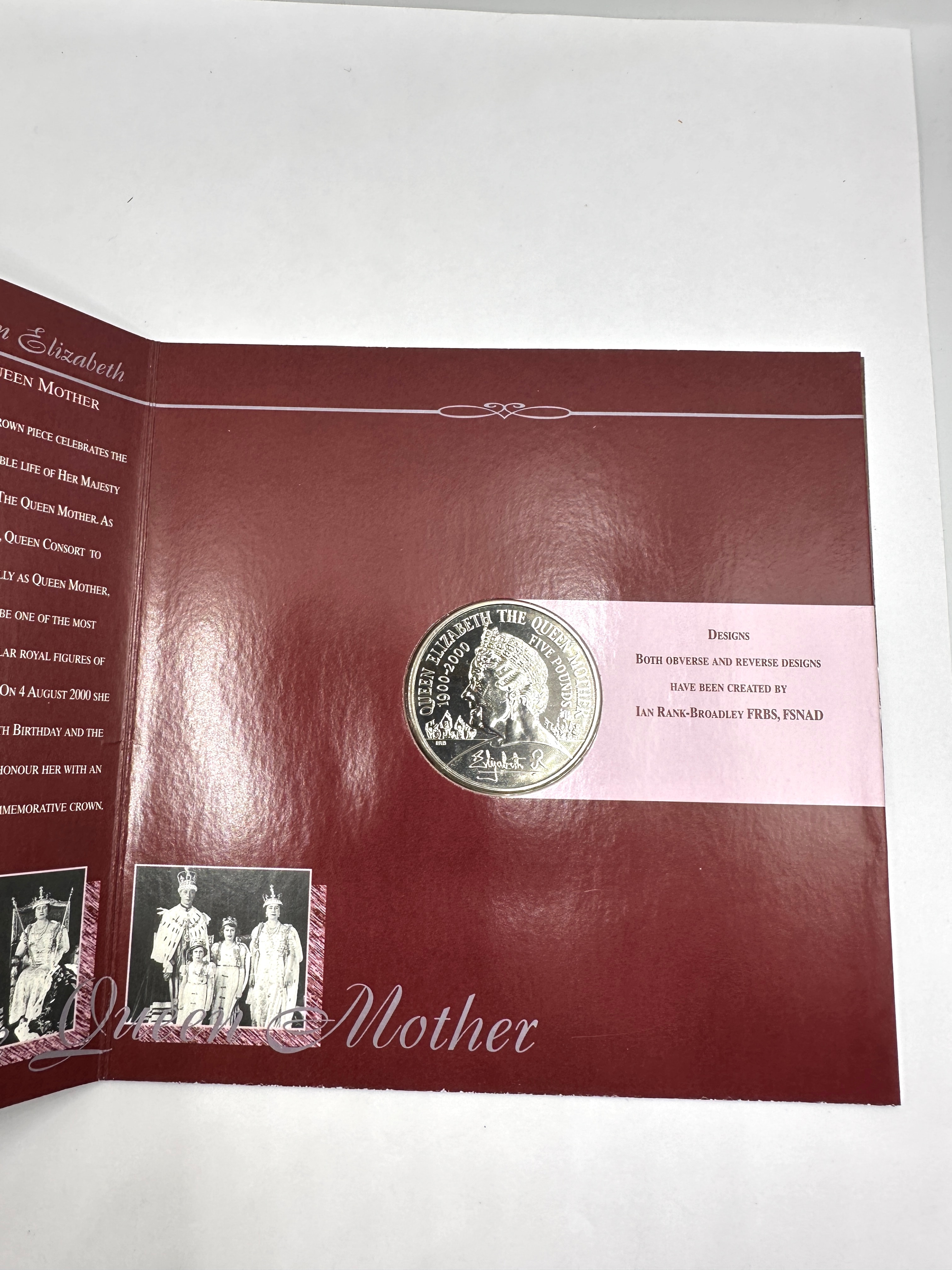 A 2000 The Queen Mother Centenary Crown Five Pound Commemorative Coin, presented within its original commemorative cardstock booklet or folder. The predominantly maroon cover features a black and white photographic portrait of Queen Elizabeth The Queen Mother, with visible text reading “Queen Elizabeth THE QUEEN MOTHER” and “CENTENARY CROWN”. Inside, the circular, silver-toned metallic coin is securely housed. The coin’s obverse displays a profile bust of the Queen Mother adorned with a tiara and necklace, encircled by the inscription “QUEEN ELIZABETH THE QUEEN MOTHER 1900-2000” and her monogram “Elizabeth R”. Further text within the booklet indicates the coin commemorates her 100th birthday in 2000 and credits Ian Rank-Broadley FRBS, FSNAD for the designs.