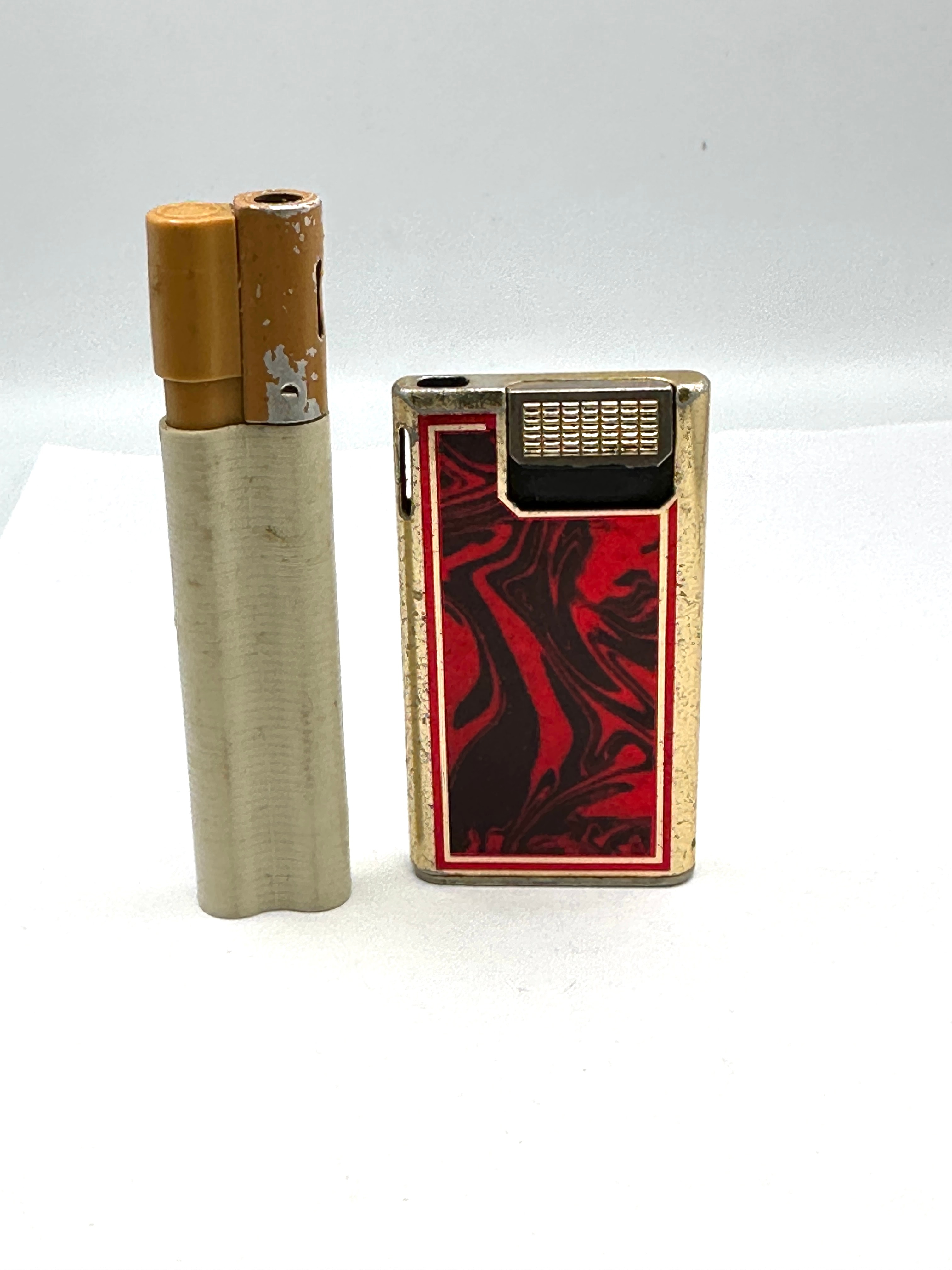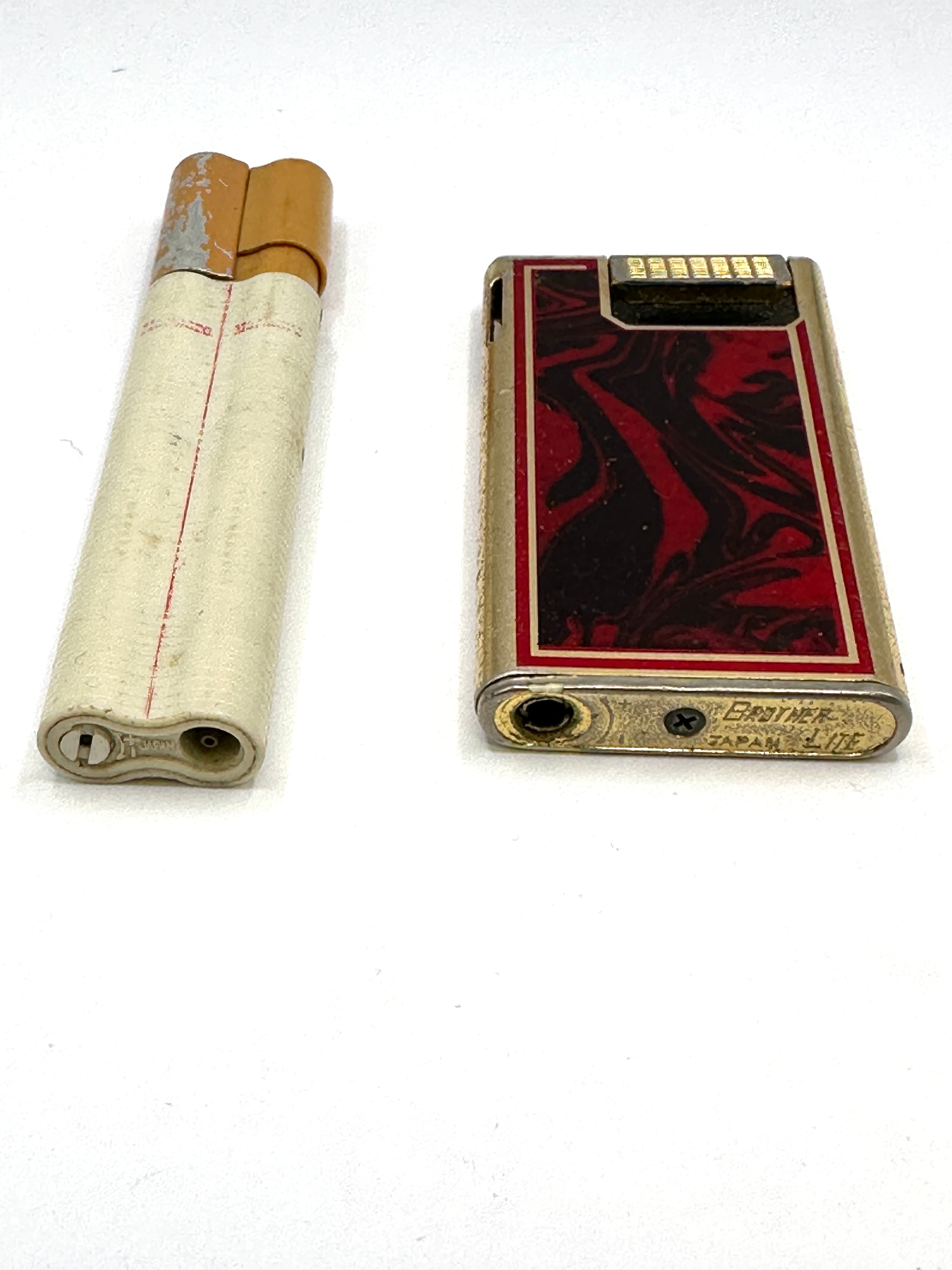 A pair of vintage Japanese lighters. The first is a novelty lighter designed to resemble an oversized cigarette, featuring an off-white textured body with a tan-colored tip. It is partially marked “TOBACCO” on its side and “JAPAN” on its base. The second is a rectangular, gold-tone metal lighter with a distinctive red and black marbled or swirled insert on its front panel, and a textured grid ignition mechanism at the top. Its base is clearly marked “BROTHER,” “JAPAN,” and “ELITE.” Both lighters are likely butane-fueled.