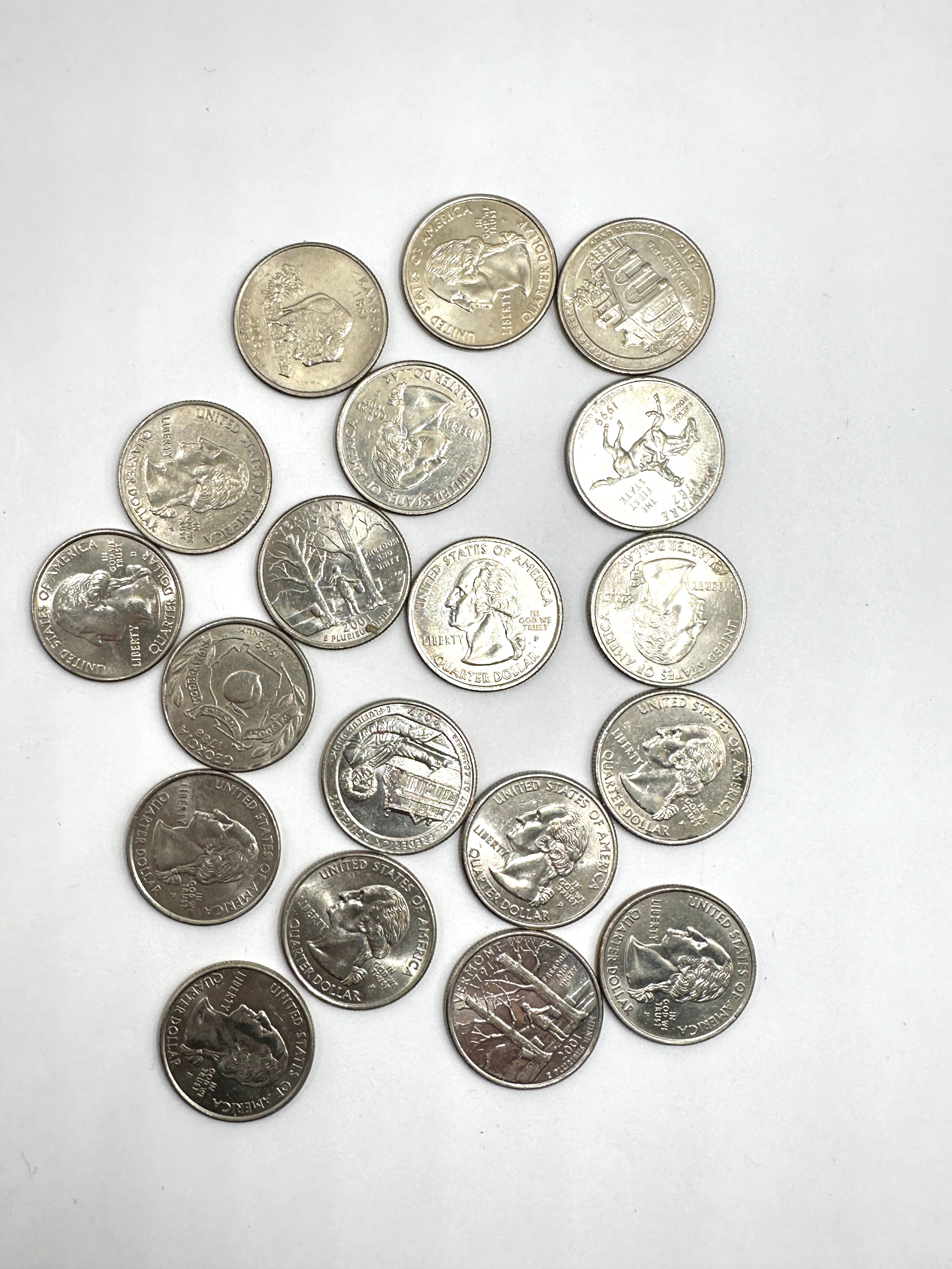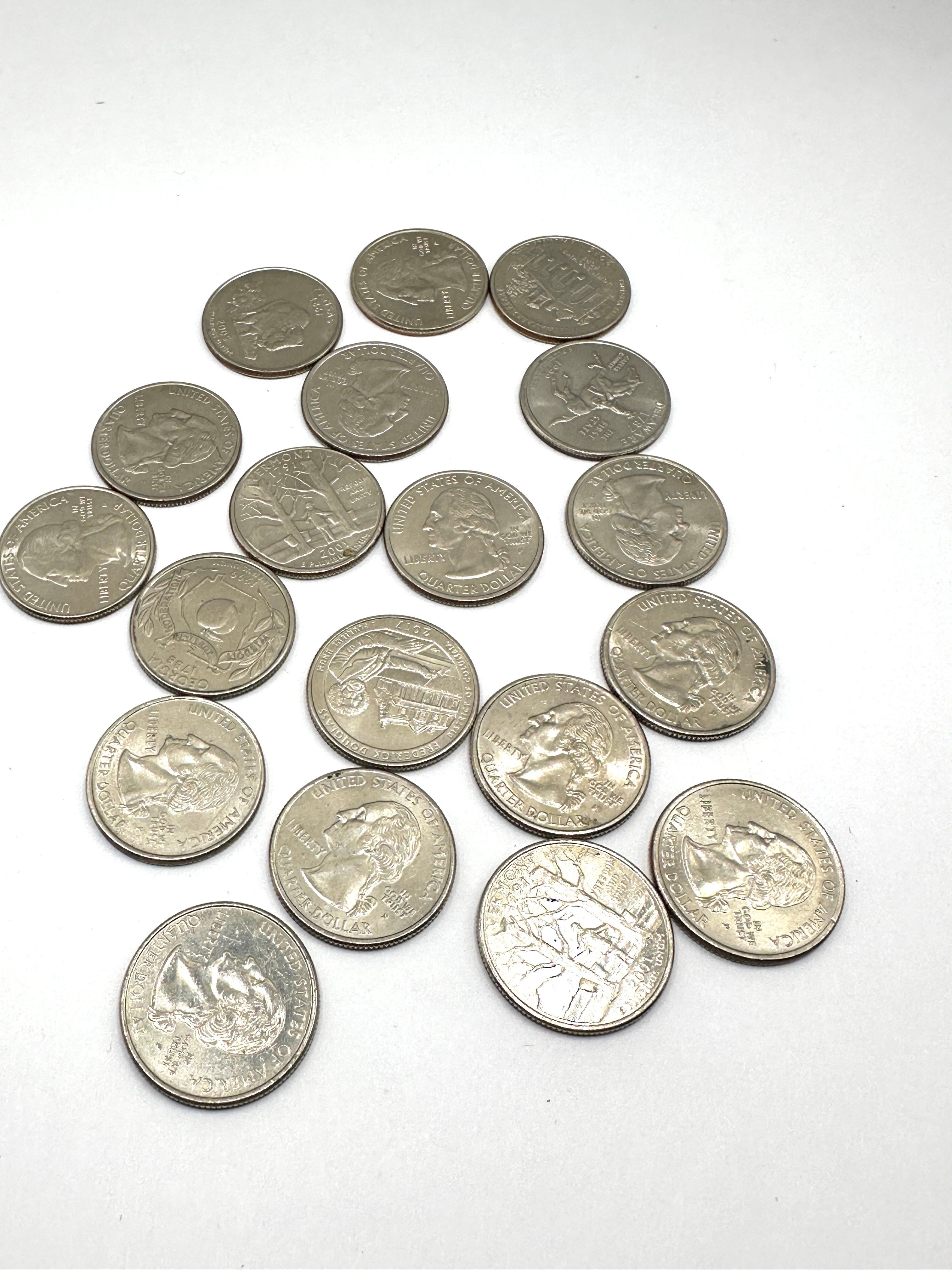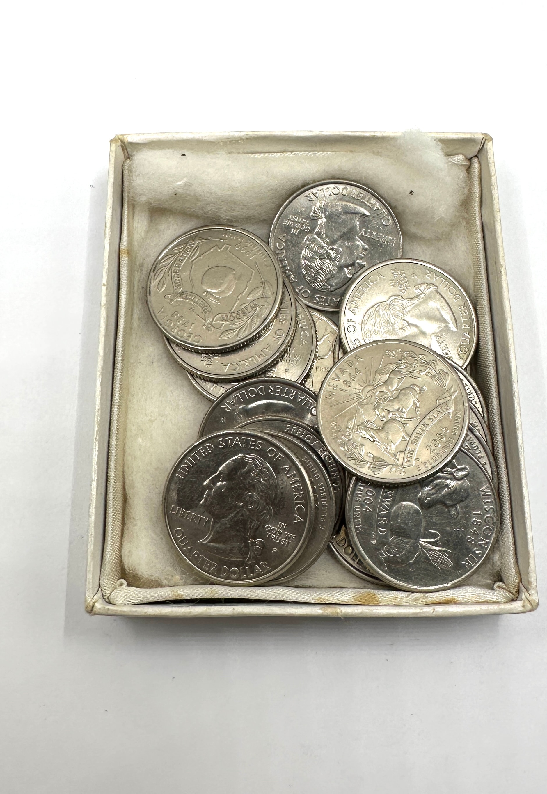 A collection of twenty-one United States Quarter Dollar coins. The lot primarily consists of coins from the 50 State Quarters Program (1999-2008 series), alongside one Bicentennial Quarter dated “1776-1976.” All coins are modern clad issues. The obverse of the State Quarters features George Washington, with text including “LIBERTY,” “IN GOD WE TRUST,” “UNITED STATES OF AMERICA,” and “QUARTER DOLLAR.” Reverse designs vary, depicting state-specific imagery and names such as “IOWA,” “HAWAII,” “WISCONSIN,” “COLORADO,” “MISSOURI,” “CALIFORNIA,” “KANSAS,” “OHIO,” “NEW YORK,” “MARYLAND,” “SOUTH CAROLINA,” “TEXAS,” “MICHIGAN,” and “WYOMING,” with visible dates ranging from 2000 to 2008, all featuring “E PLURIBUS UNUM.” The Bicentennial Quarter reverse depicts a colonial drummer. The coins were initially observed within a small, white cardboard box with a padded fabric interior.