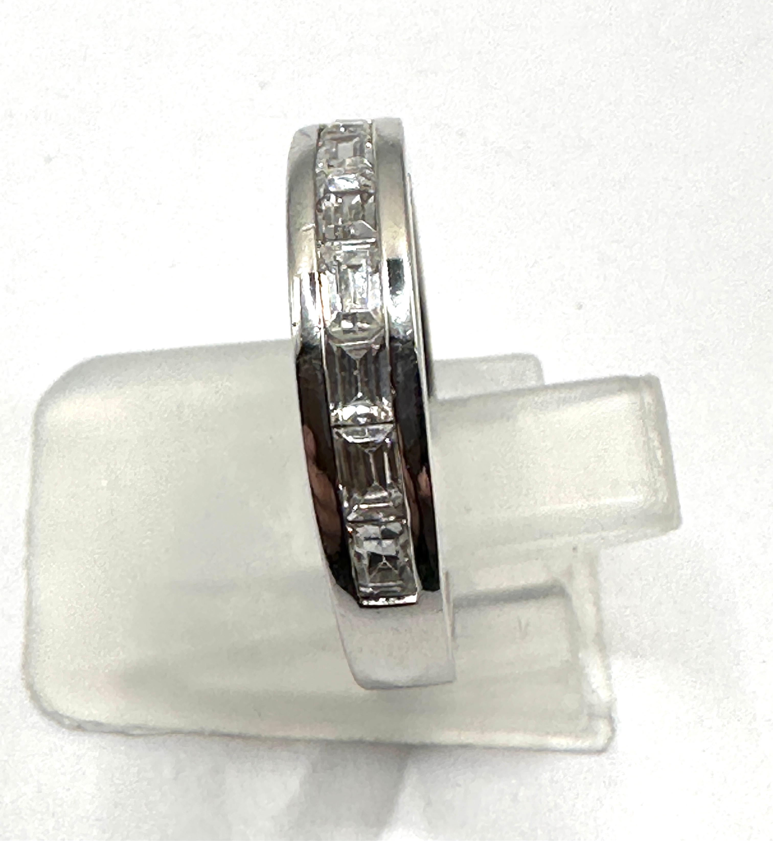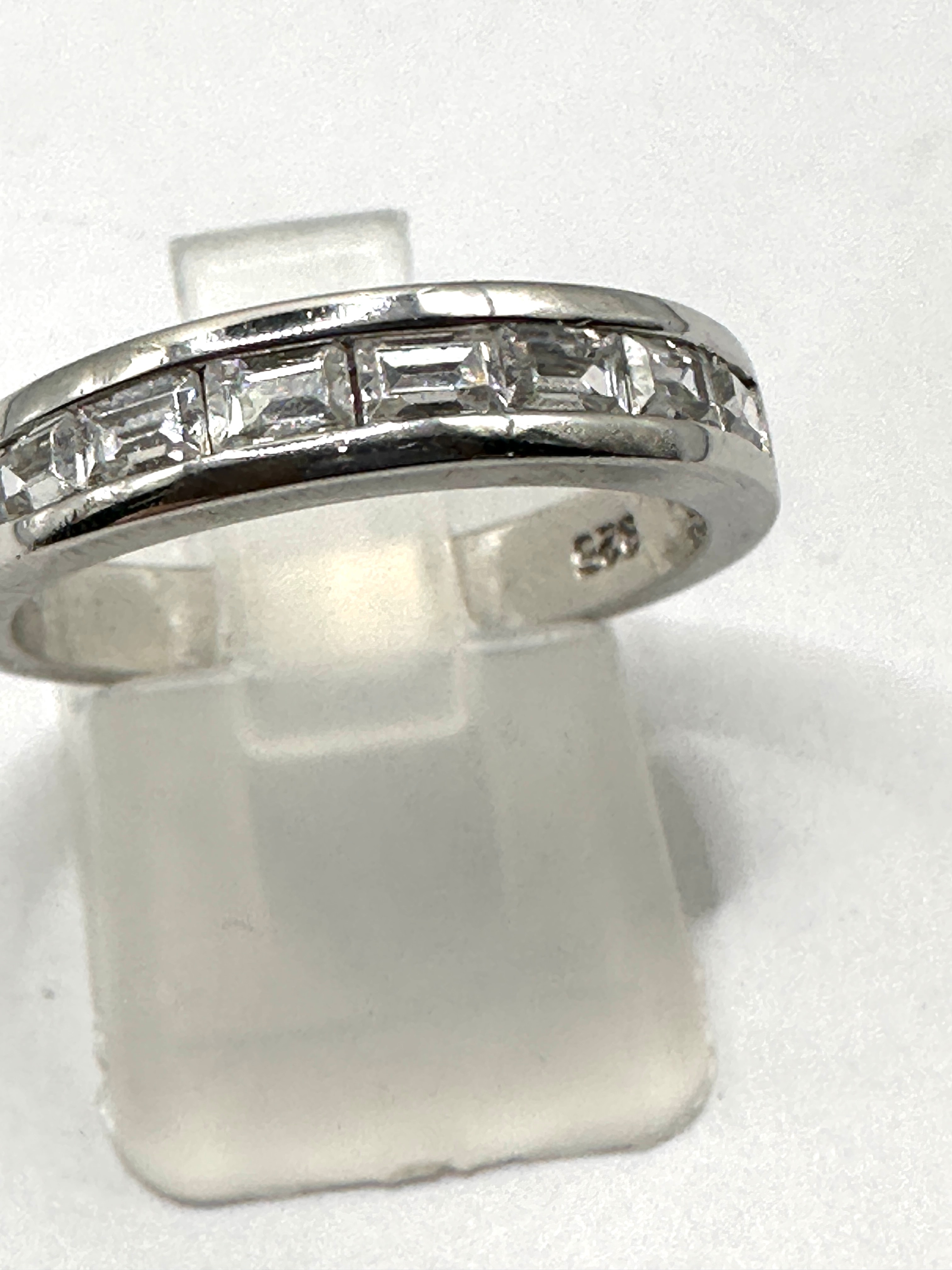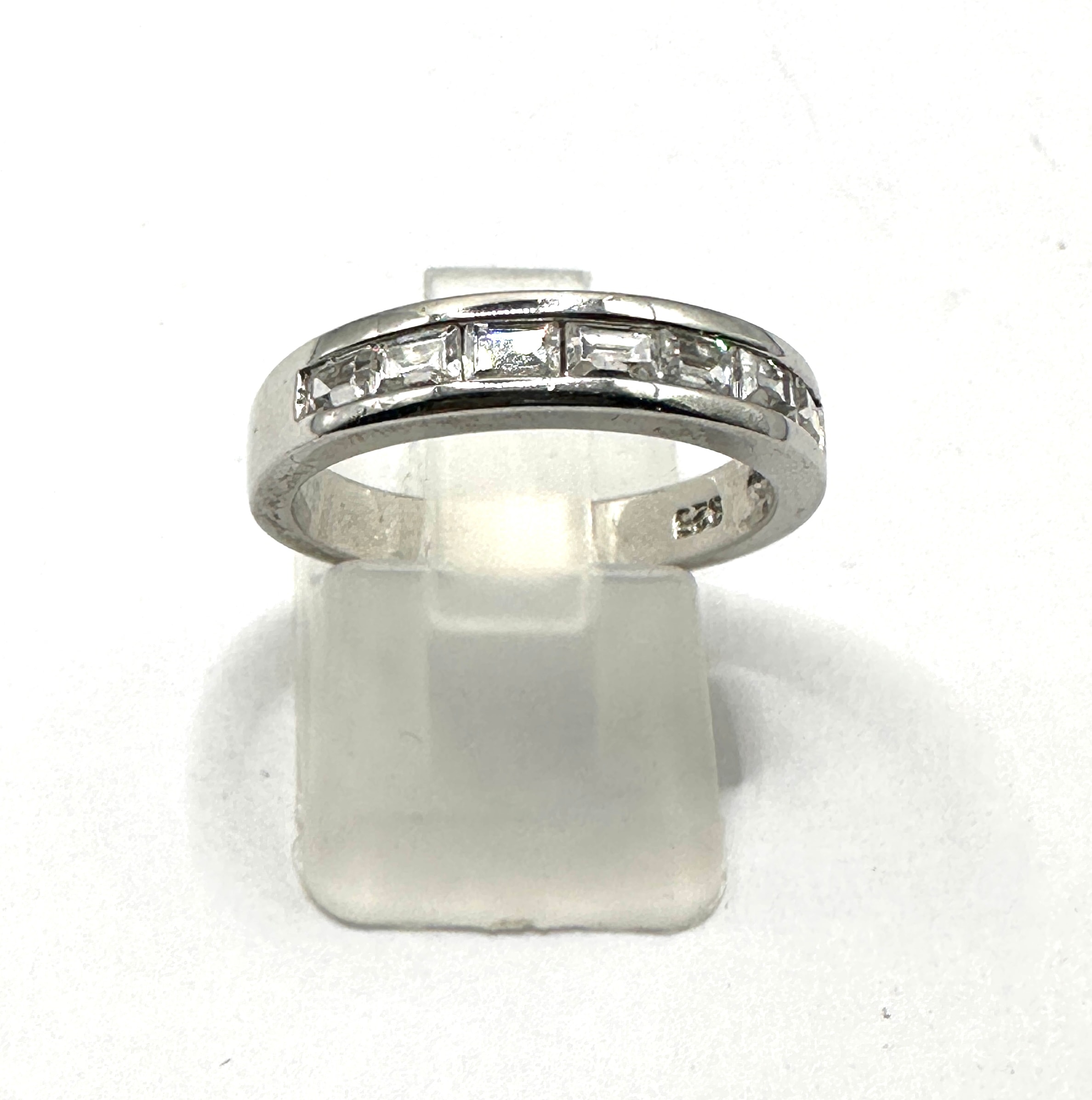 A silver-toned metal band ring, featuring a half-eternity style with approximately nine clear, rectangular baguette-cut stones channel-set across the top half. The polished band bears a visible “925” hallmark on the interior, indicating sterling silver.