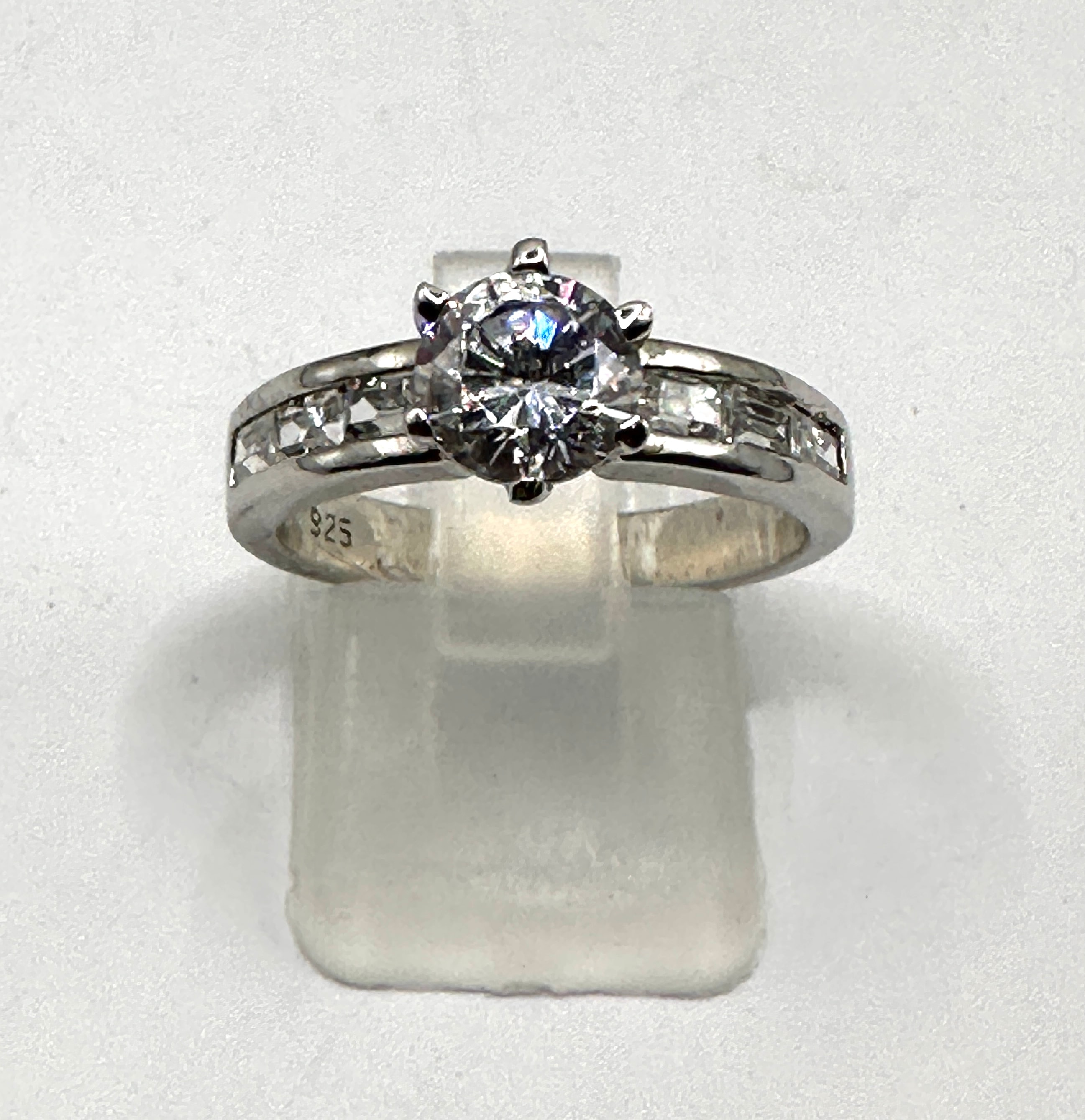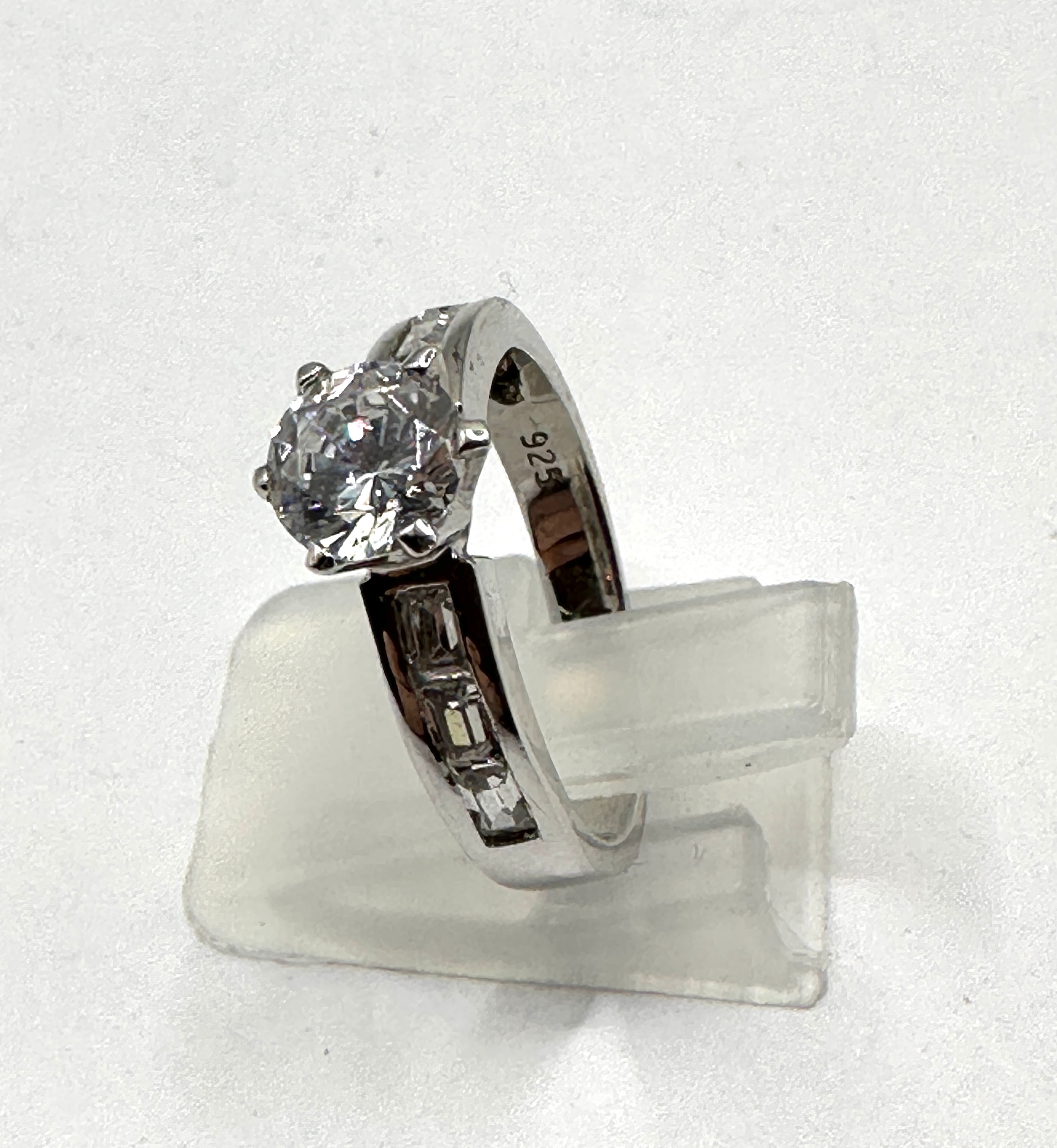 A modern-style finger ring crafted from 925 silver, featuring a prominent round brilliant-cut clear colorless cubic zirconia center stone set in a six-prong mounting. The shoulders are flanked by channel-set clear baguette and smaller round cubic zirconia accent stones.