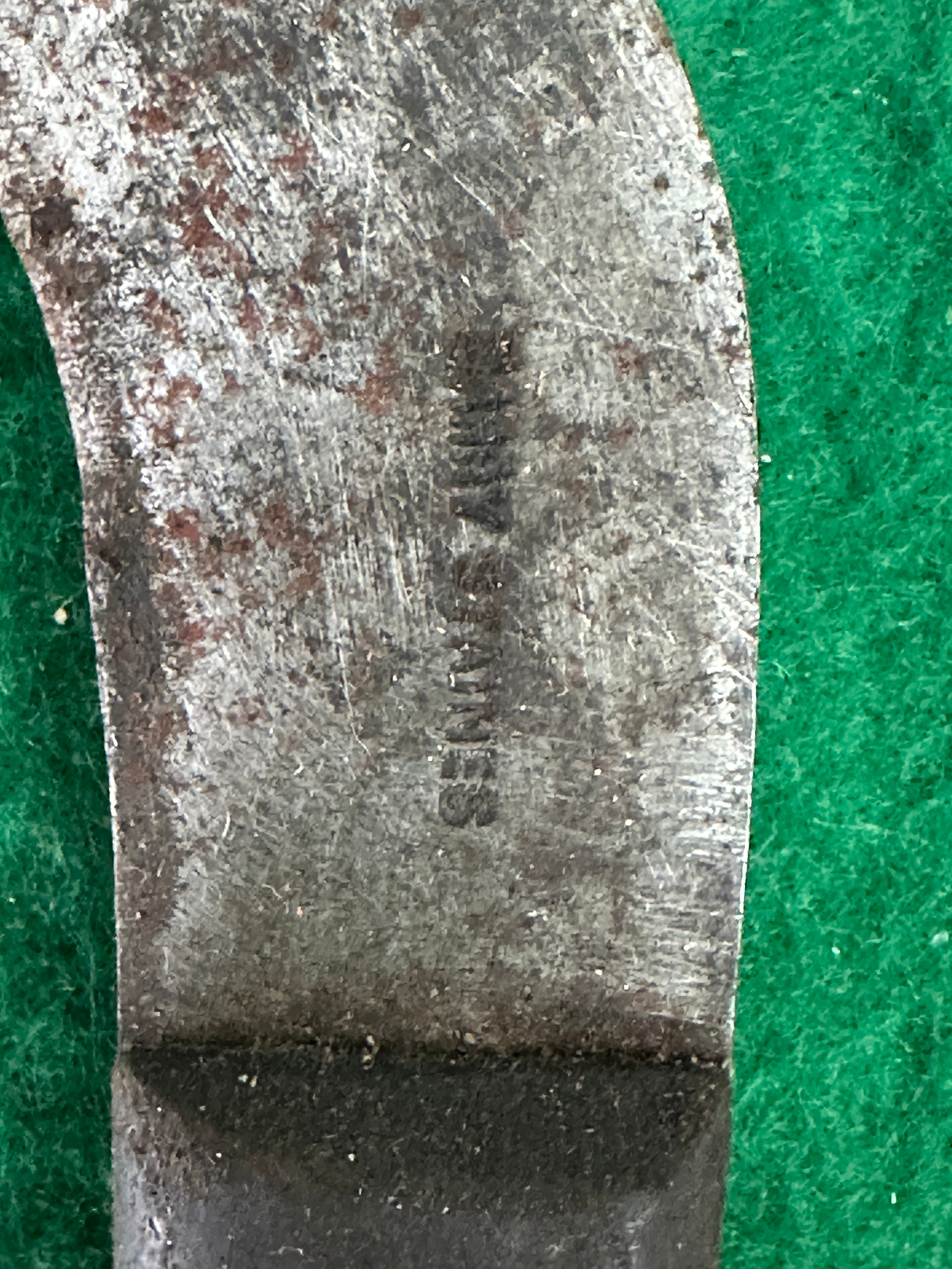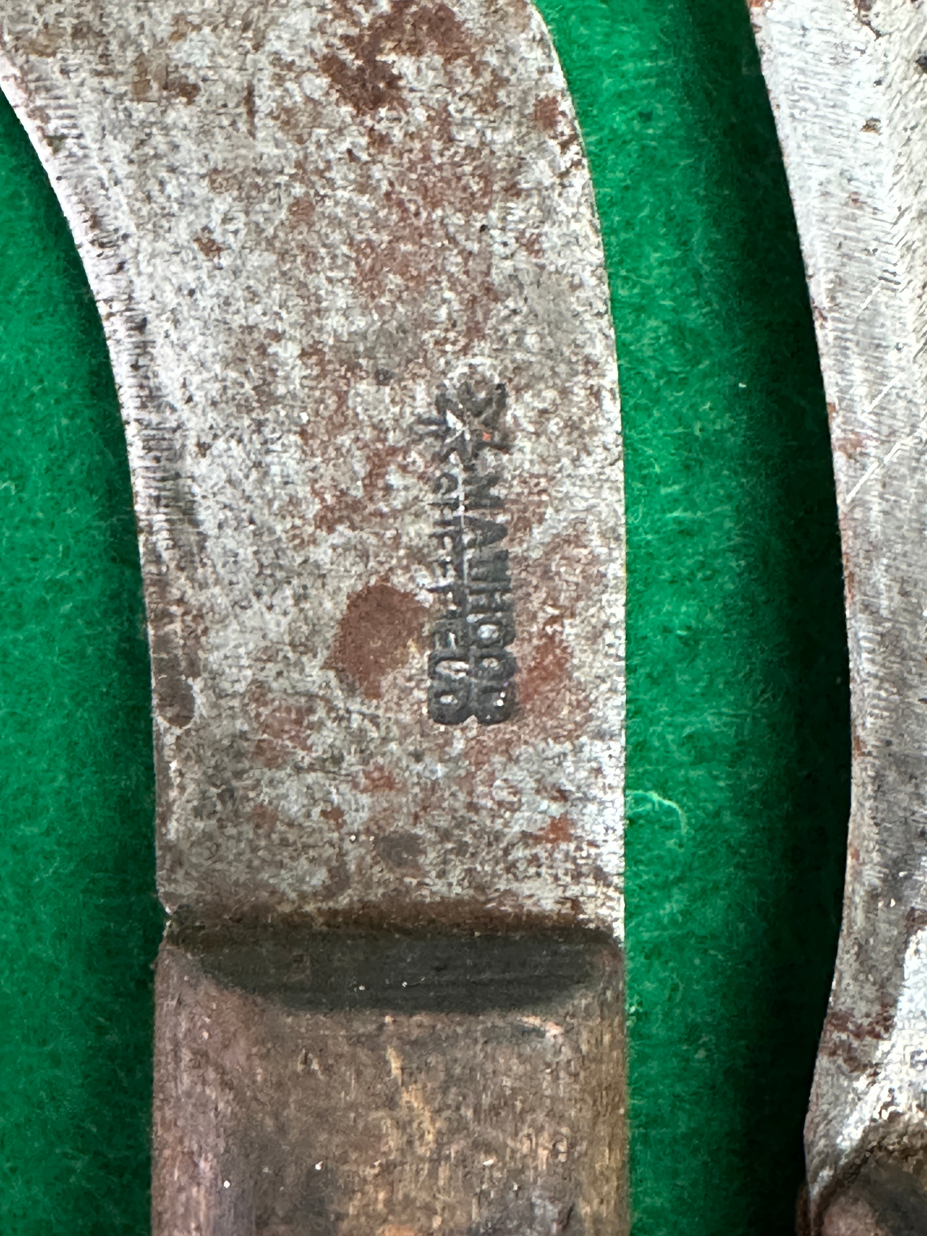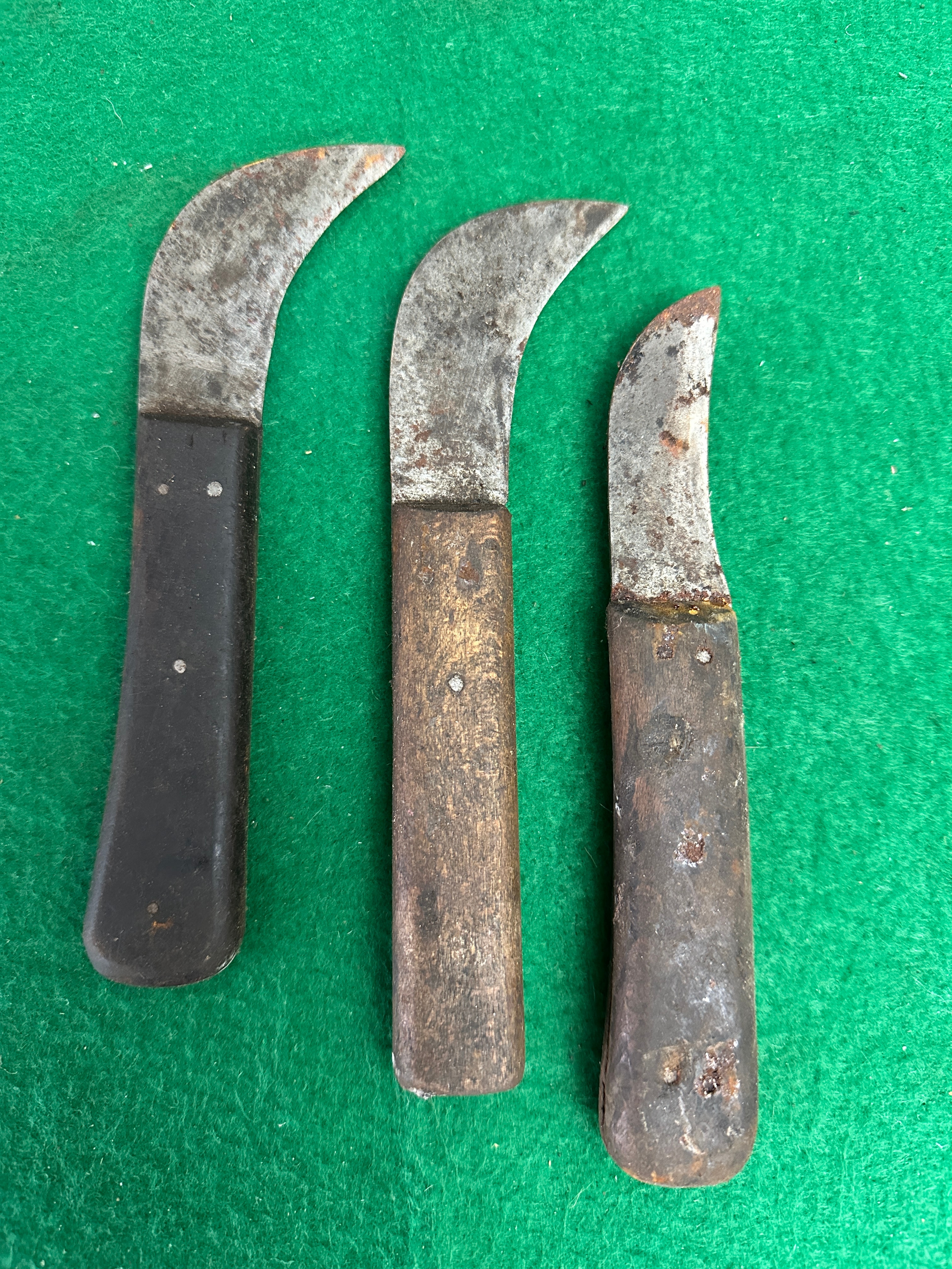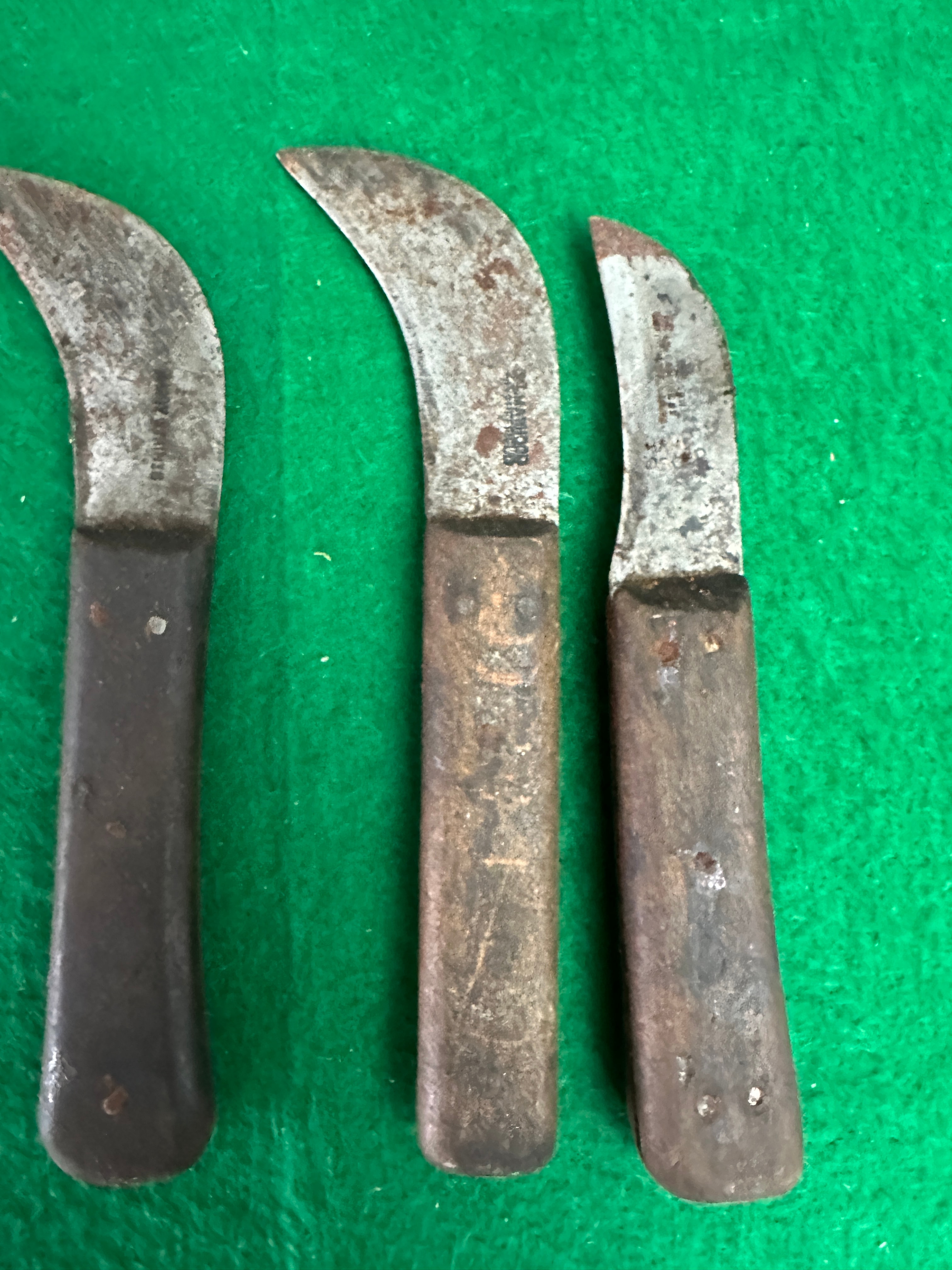 A group of three utilitarian hook or pruning knives. Each knife is constructed with a curved steel blade secured to a full-tang handle with metal rivets. The leftmost knife features a dark handle, possibly hard plastic or very dark wood. The middle and rightmost knives have visibly worn and aged wooden handles. A stamped maker’s mark, ‘CHAMPION,’ is clearly visible on the blade of the middle knife.