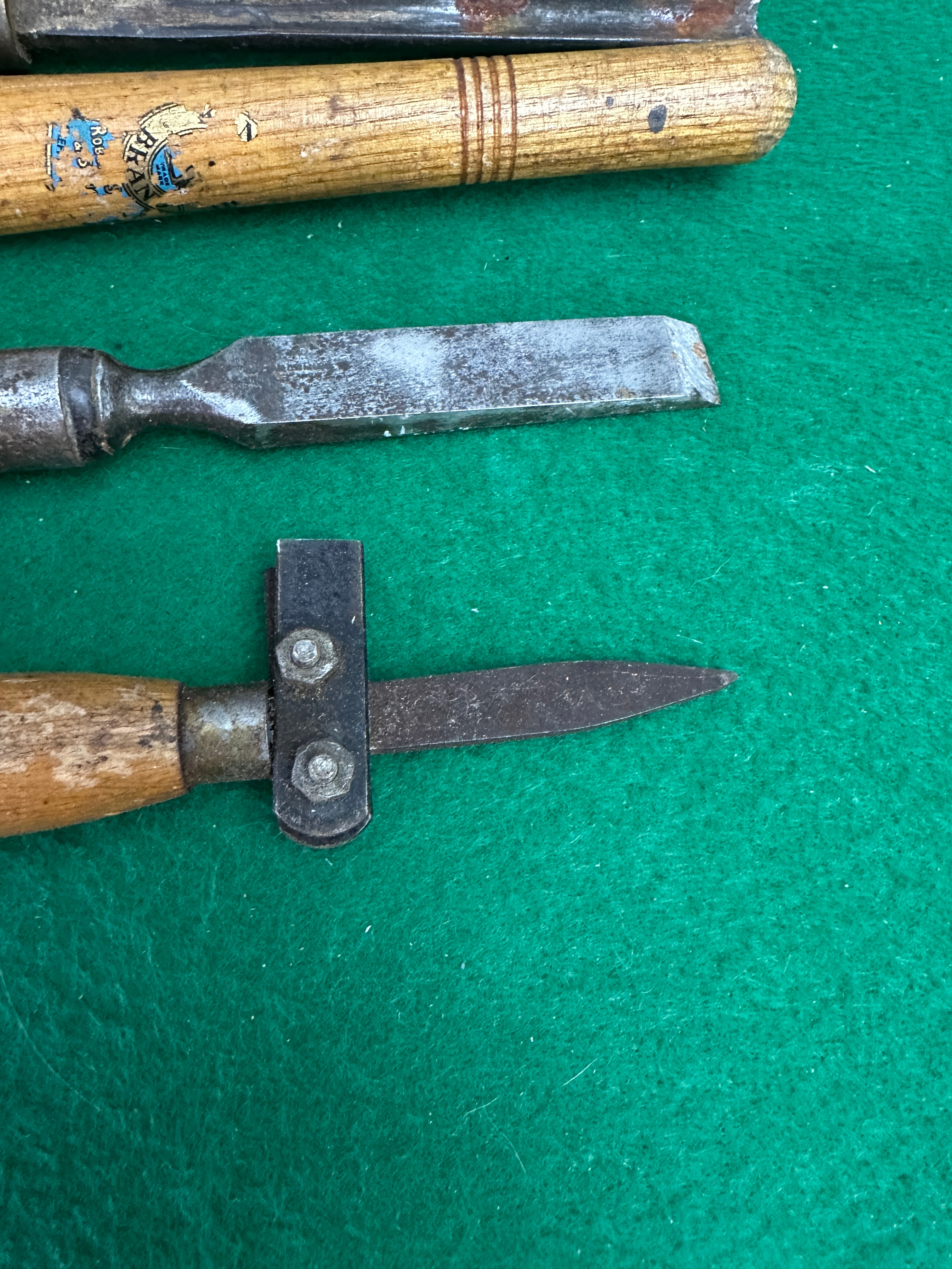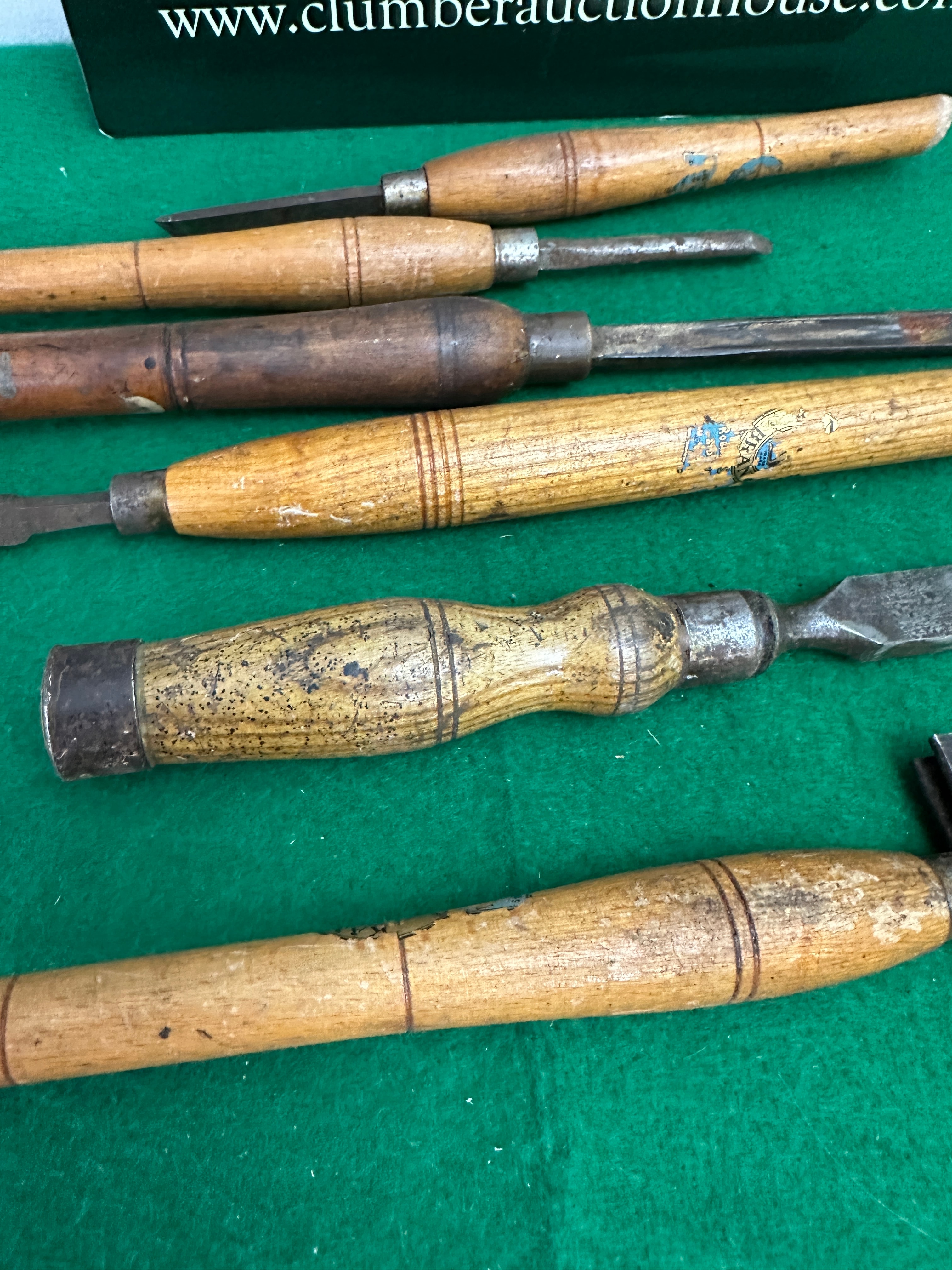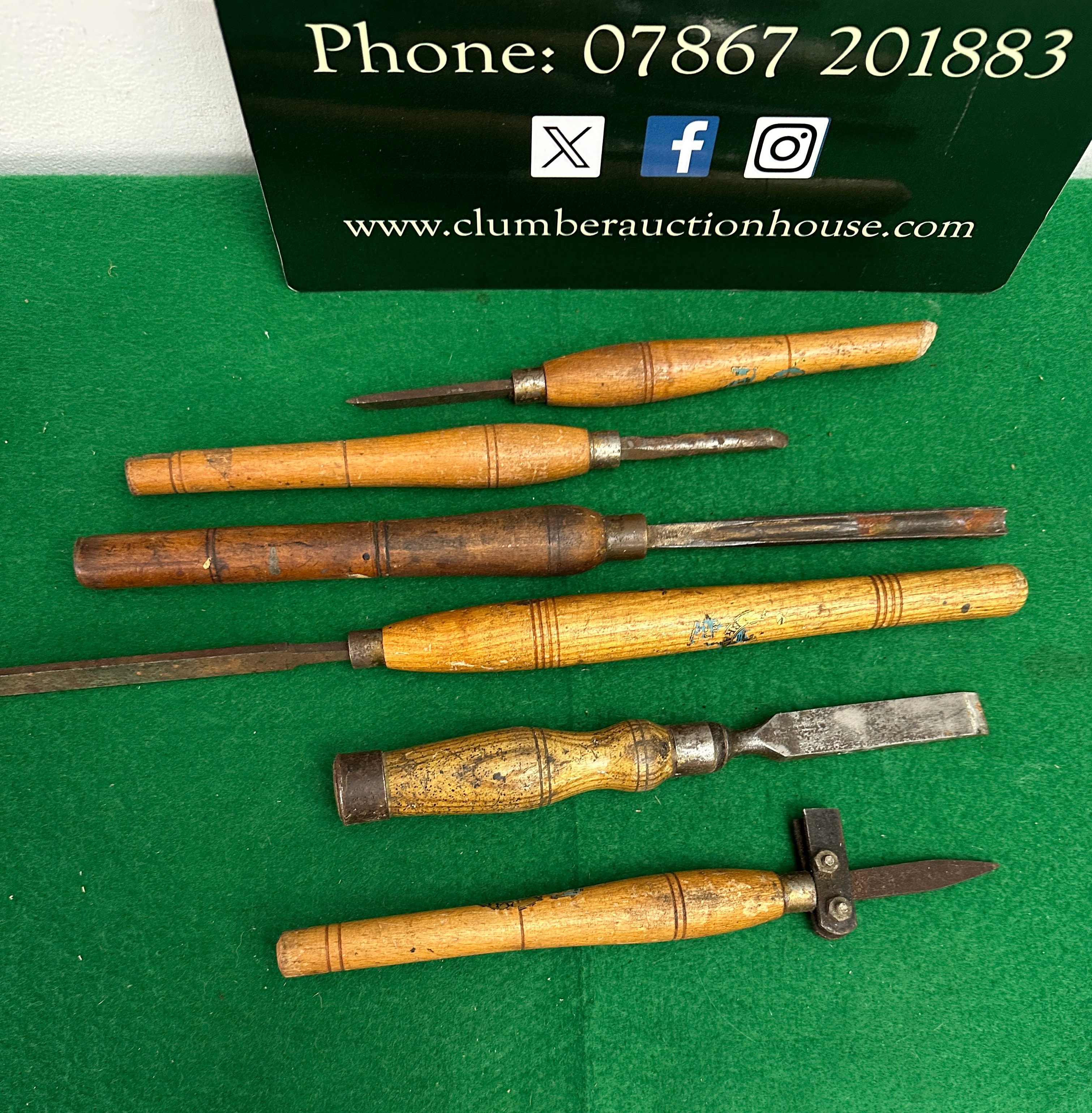 A collection of six assorted vintage woodworking hand tools, primarily comprising various chisels and a marking gauge. Each tool features a turned wooden handle and a metal blade or shank. The handles exhibit a range of wood tones, wear, and scratches, with one handle displaying a partial blue graphic with faint ‘BR’ text, consistent with Buck Bros. manufacturing. The metal components show significant signs of use, including surface pitting, rust, and unsharpened edges. Specific tools include a narrow chisel, several wider chisels of varying profiles, a small pointed awl-like tool, and a marking gauge with a fixed pointed scribe. The overall condition is well-used, typical of antique or vintage workshop implements.
