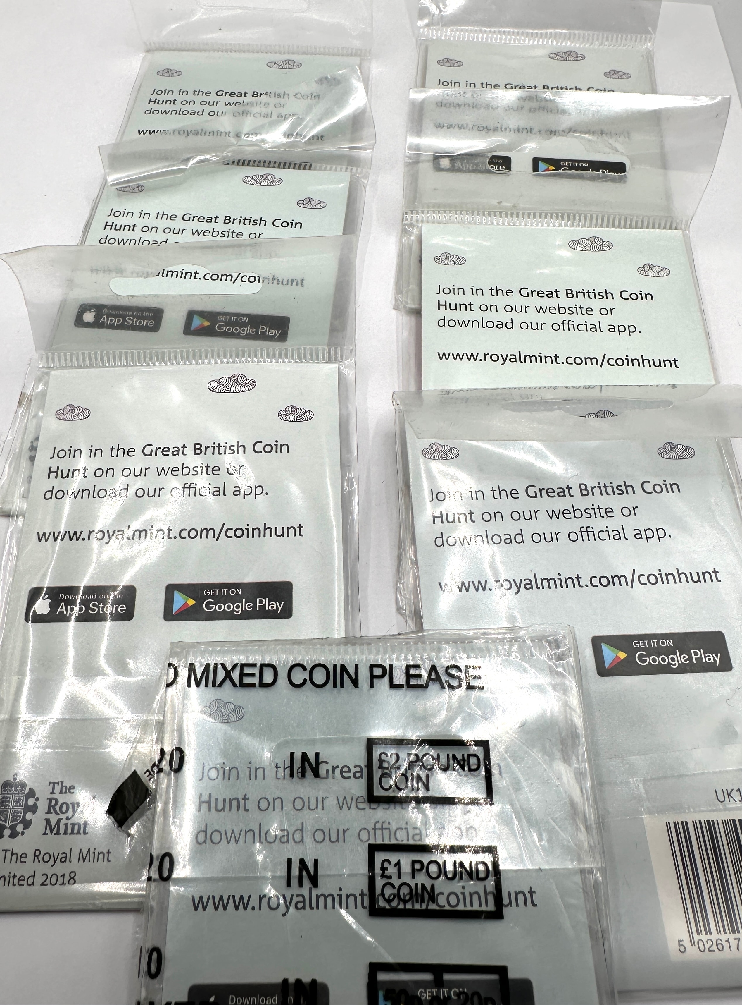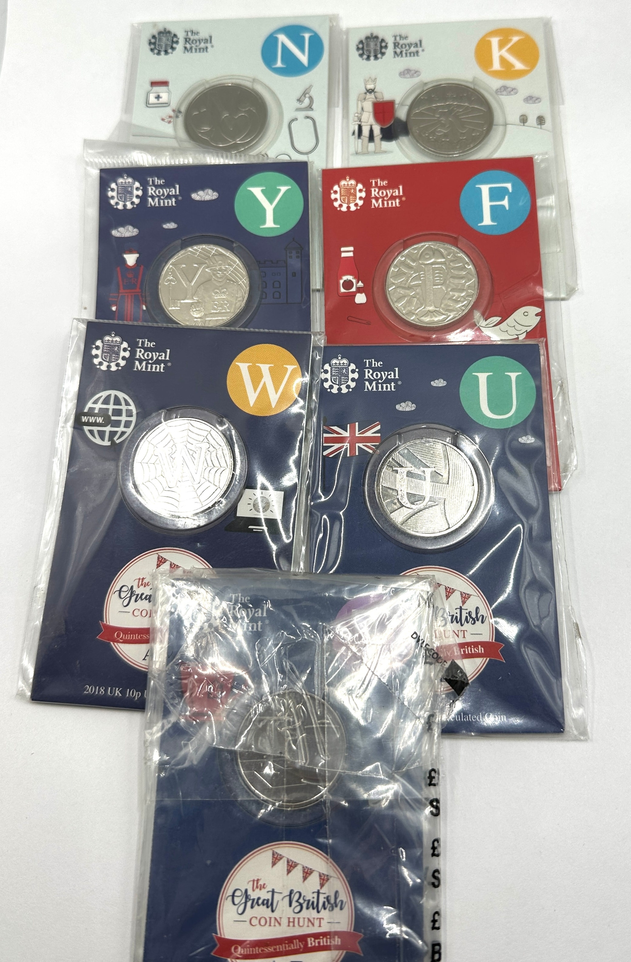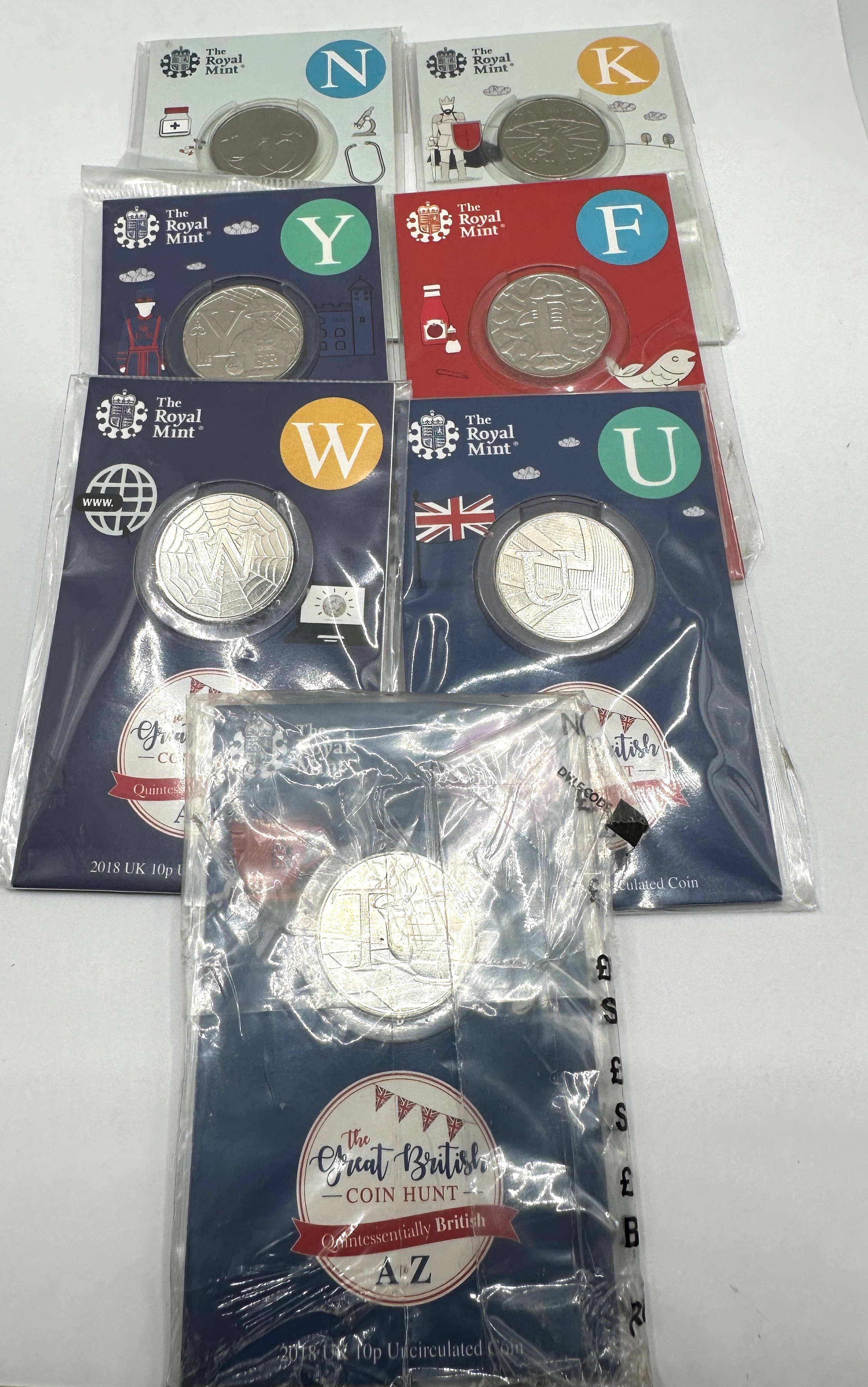 A collection of modern British 10 pence coins, identified as part of ‘The Great British Coin Hunt’ series by The Royal Mint. Each coin is individually sealed in transparent plastic within its original branded card packaging, clearly labeled as “2018 UK 10p Uncirculated Coins.” The series is described as “Quintessentially British” and features distinct designs for various letters of the alphabet, with visible examples including N, K, Y, F, W, and U. The packaging also includes promotional text for joining the coin hunt via “www.royalmint.com/coinhunt” or an official app, featuring App Store and Google Play icons.