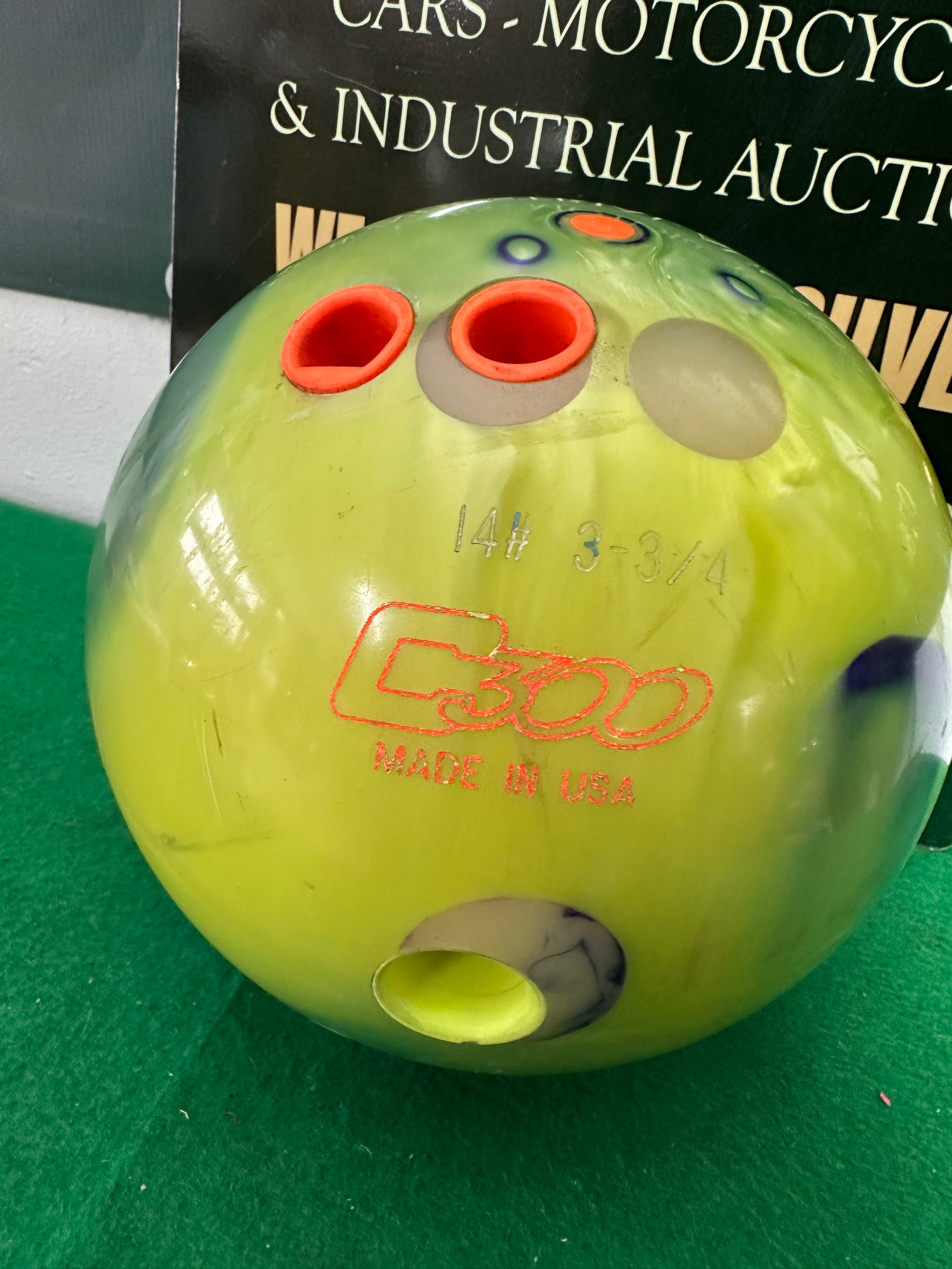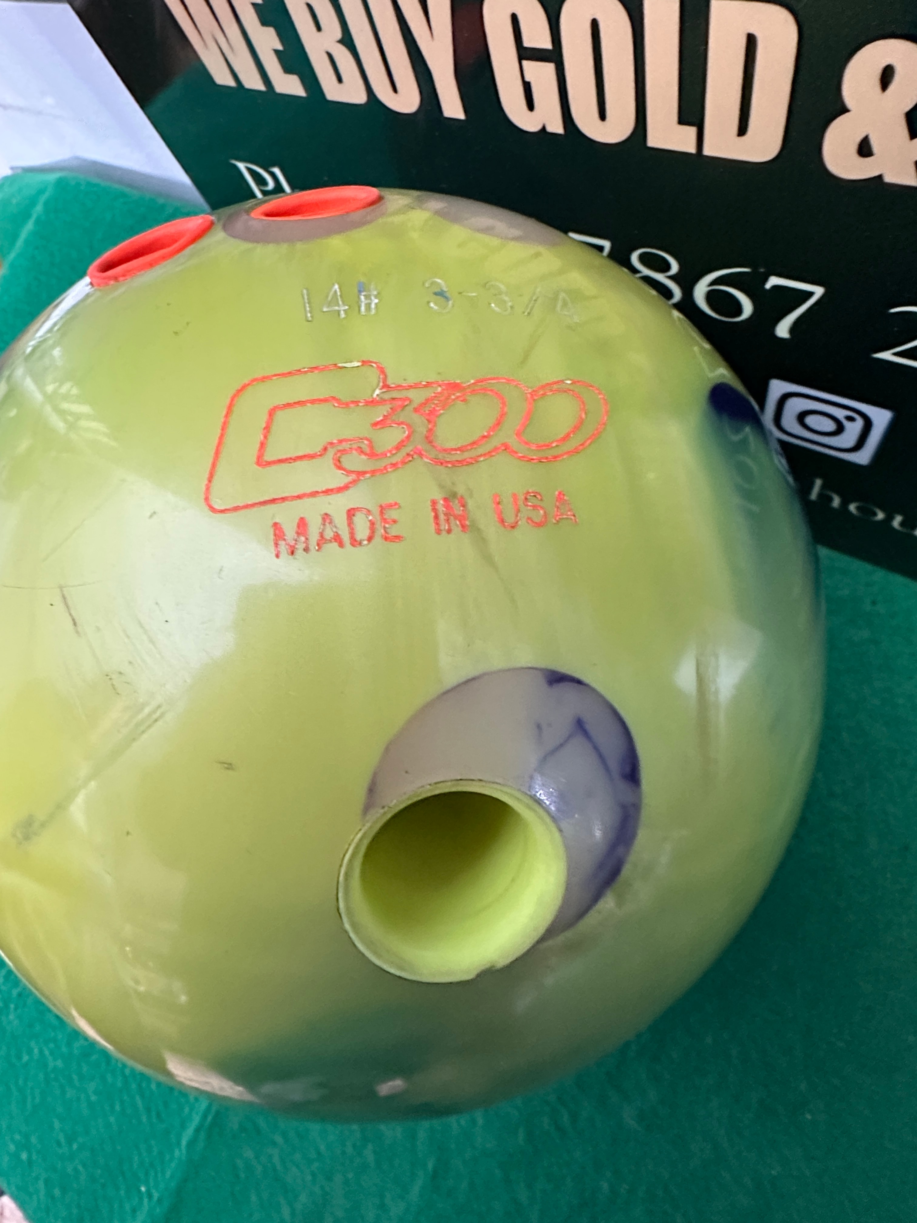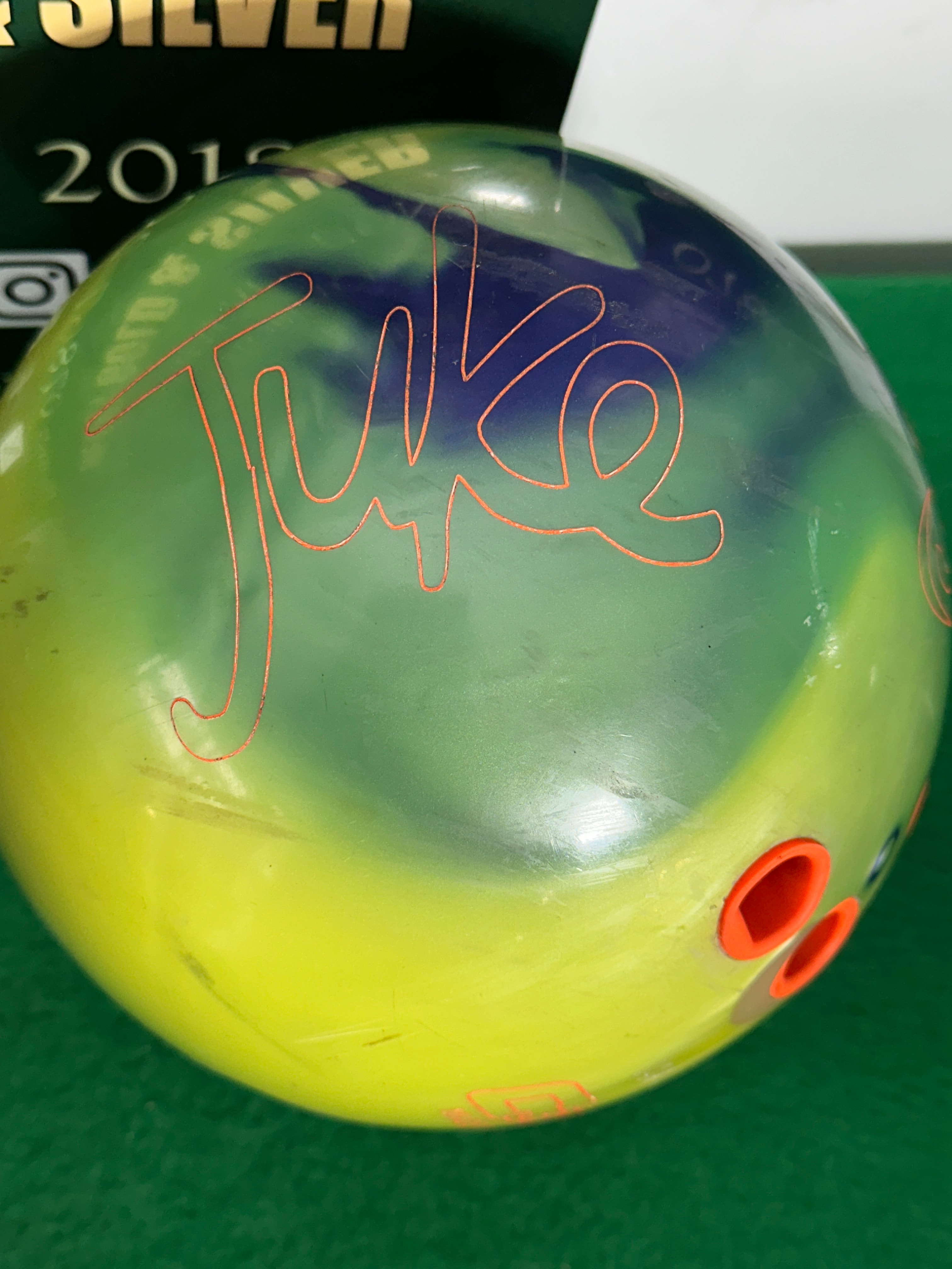 A Columbia 300 “Juke” bowling ball, crafted from a glossy composite resin. The ball displays a swirling pattern of yellow-green transitioning into darker blue and purple tones. It features two finger holes with orange inserts, a larger thumb hole with a light yellow-green insert, and two additional smaller un-inserted holes. Visible markings include “COLUMBIA 300”, “Juke”, and “MADE IN USA”.