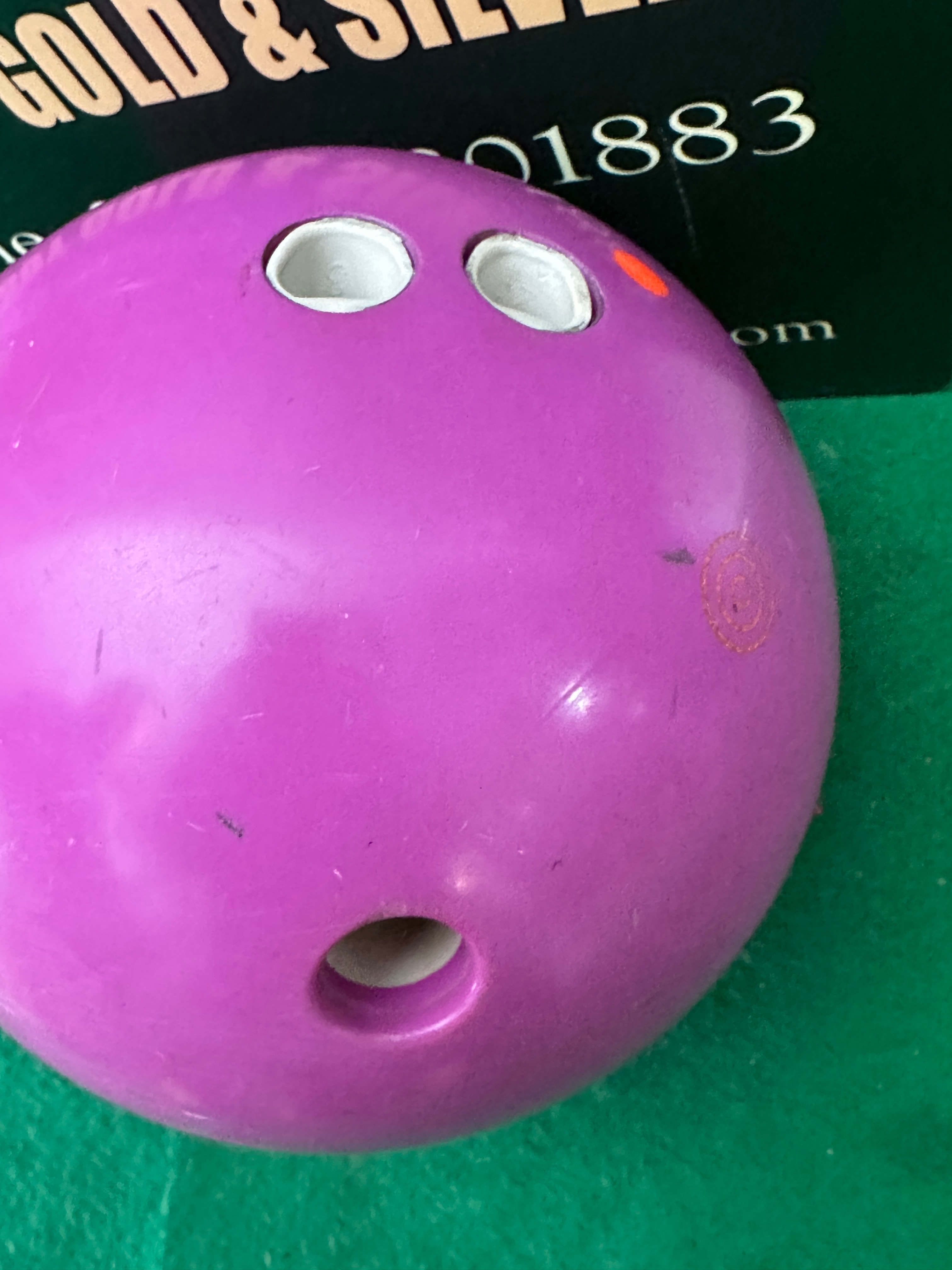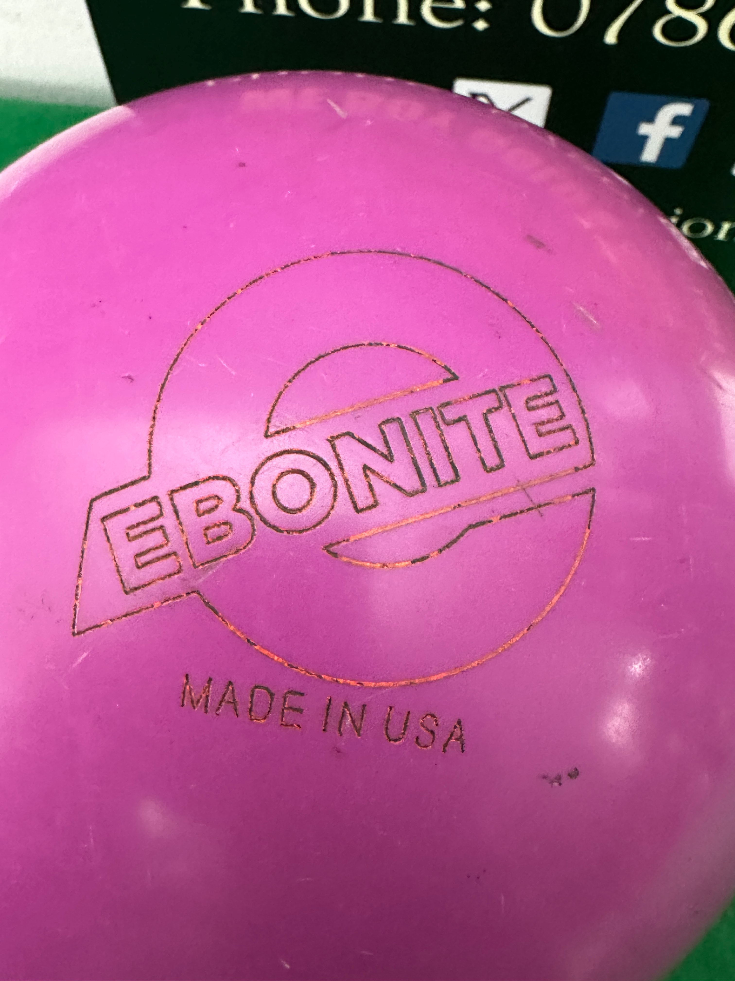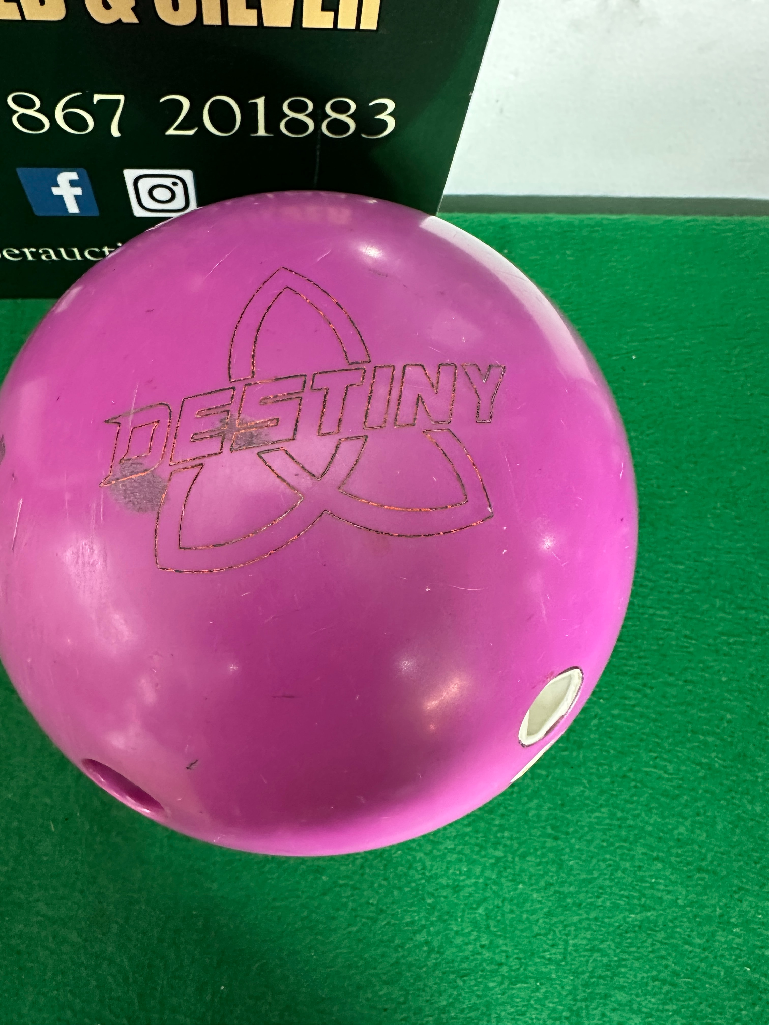 An Ebonite Destiny Solid Magenta bowling ball. This modern, magenta-purple bowling ball is constructed from a resin or urethane composite material. It features three standard finger/thumb holes, two of which contain white inserts. Visible text includes the brand name “EBONITE” enclosed within a circular outline, with “MADE IN USA” positioned below it. The ball is also marked with the model name “DESTINY,” accompanied by a decorative, triple-lobed symbol.