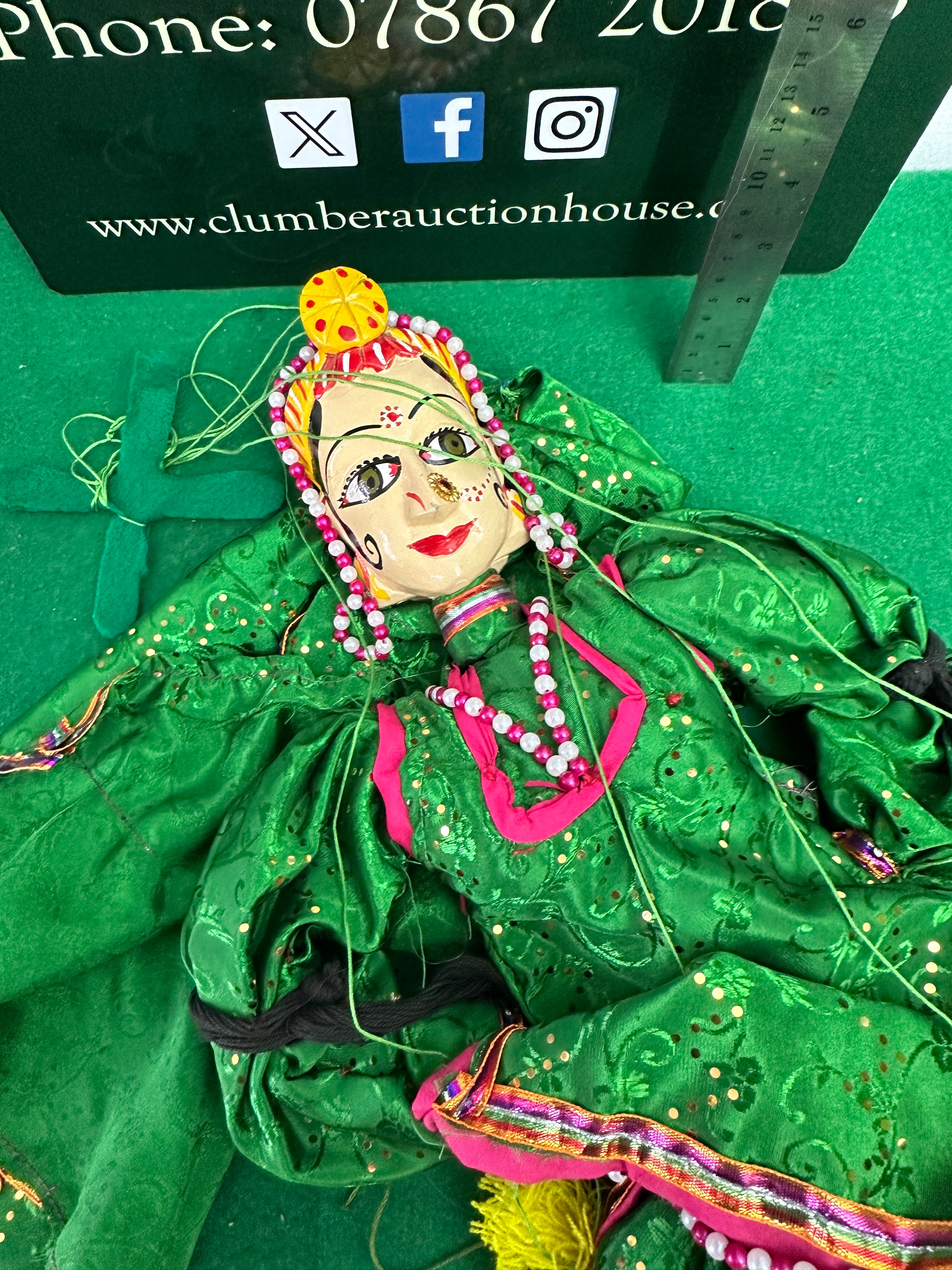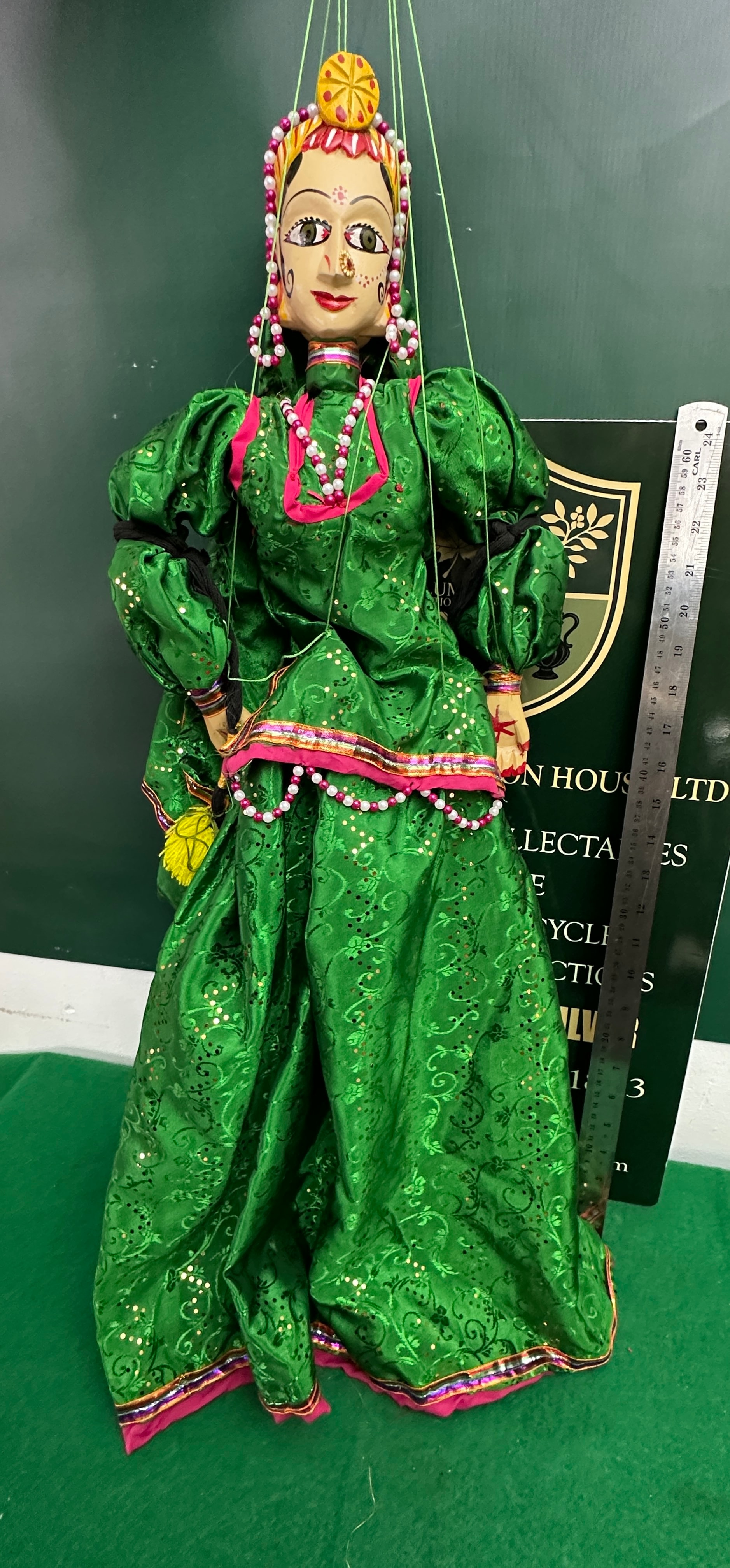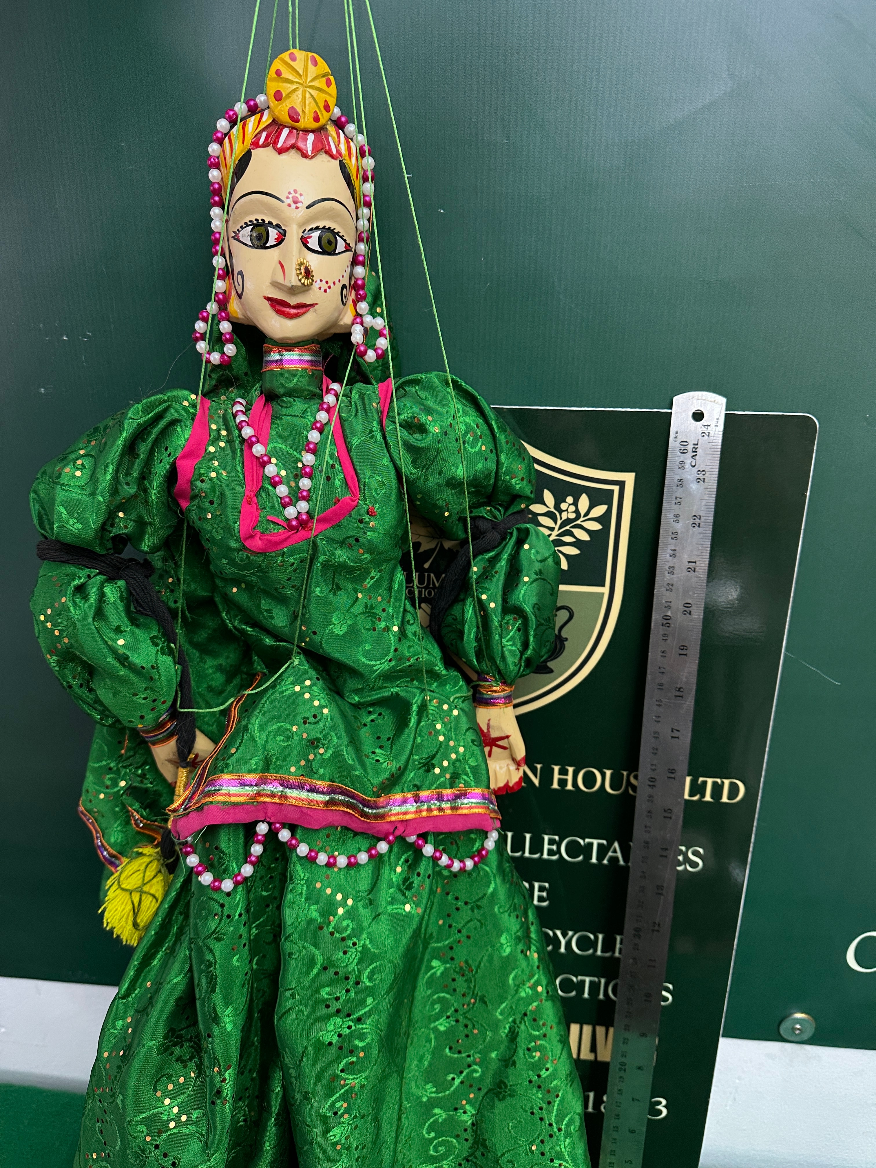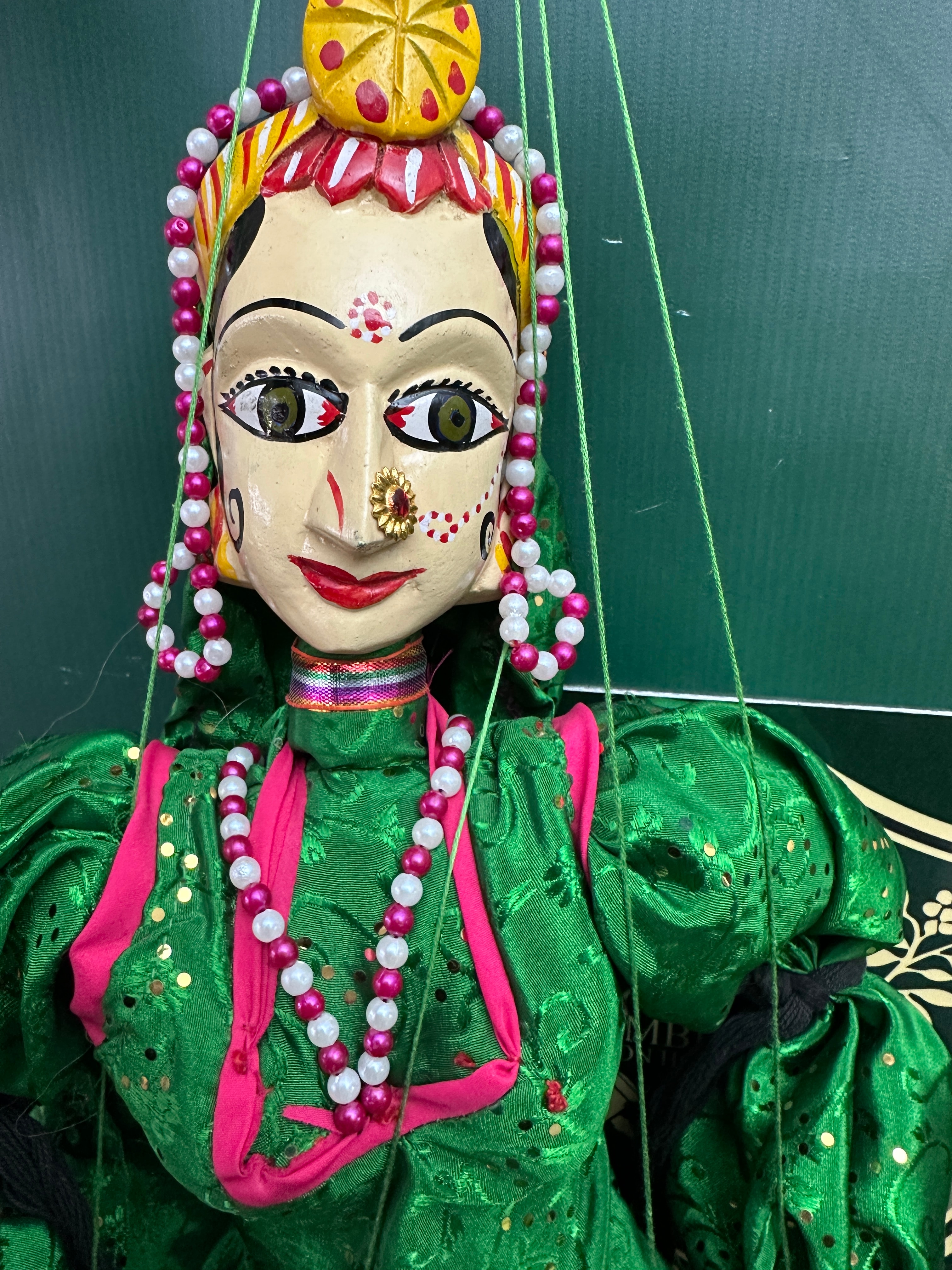 A vintage handmade Indian string puppet depicting a female figure, characterized by a hand-painted wooden or composite head with large eyes, a prominent nose ring, bindi, and a colorful headdress adorned with beads. The puppet is dressed in a vibrant, sequin-embellished green fabric costume with pink and multicolored beaded and fabric trim, suggesting a traditional South Asian or Indian style. Multiple green manipulation strings are visible.