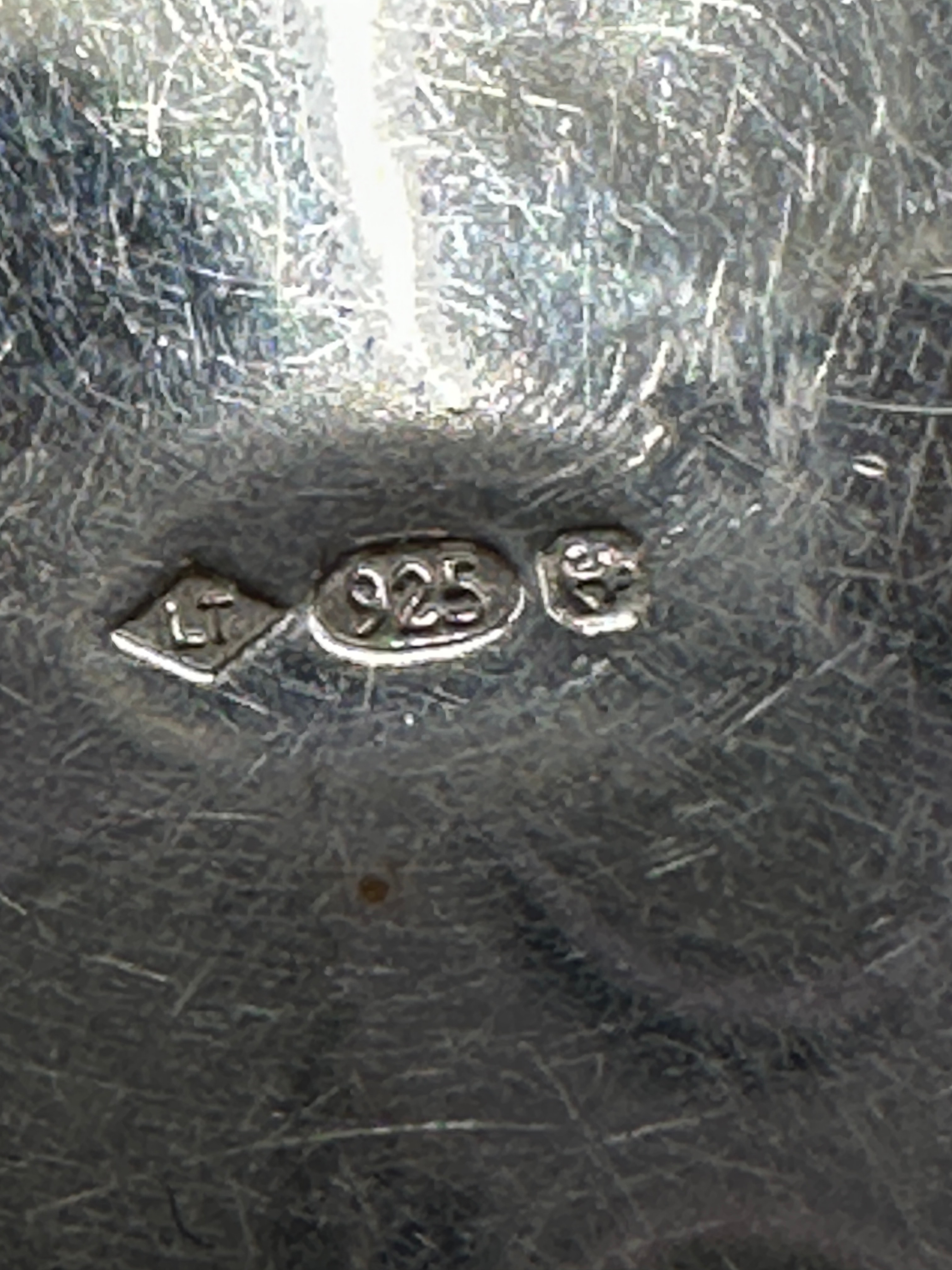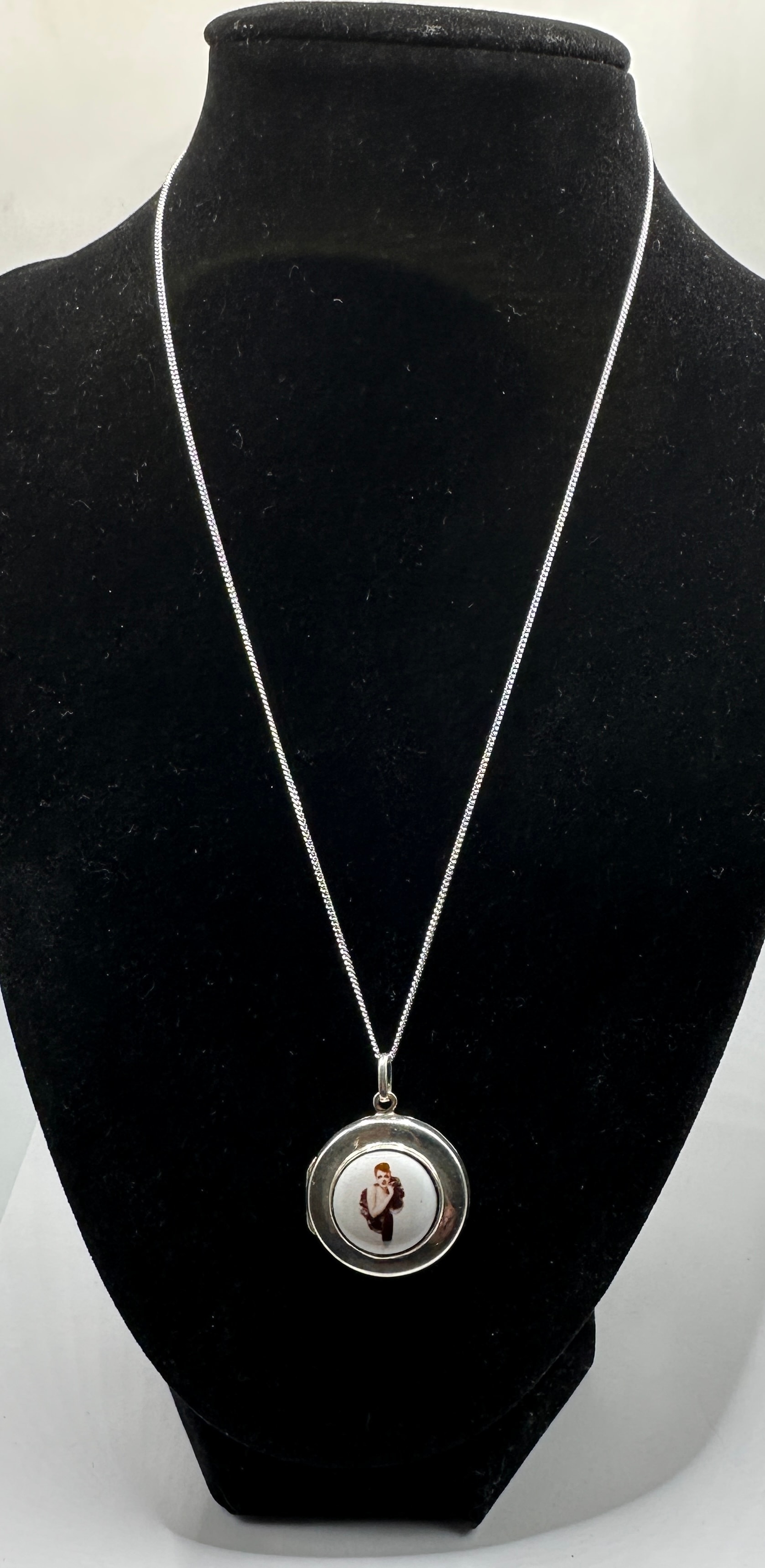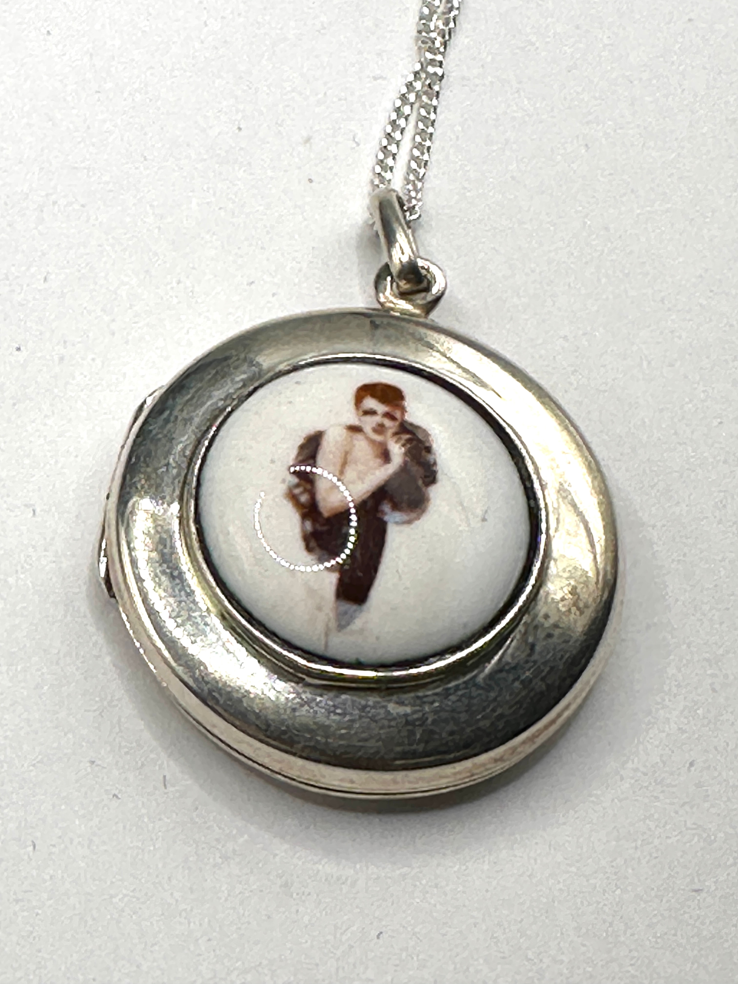 A round sterling silver locket pendant, suspended from a silver-toned curb chain. The locket features a central vitreous enamel or ceramic insert depicting a classical-style, partially draped male figure in sepia tones against a white ground. The reverse is marked ‘925’ confirming sterling silver content, along with ‘LT’ within a diamond cartouche and another obscured stamp within a square.