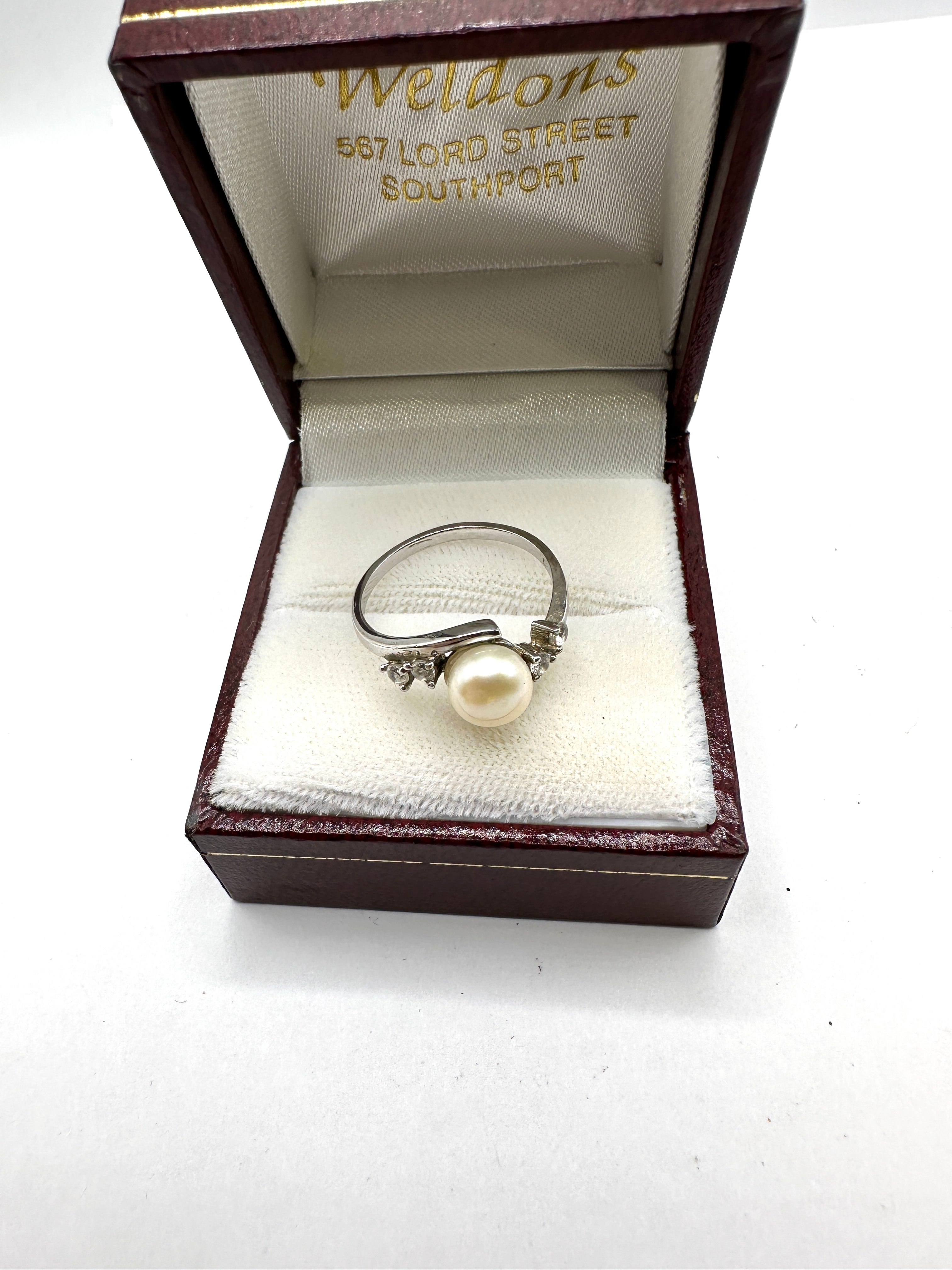 A classic bypass-design ring, crafted from 925 silver, featuring a central round pearl flanked by three small, clear accent stones on each side. The ring is presented within a dark red retailer’s box, marked “Weldons, 567 LORD STREET, SOUTHPORT” on the interior lid.