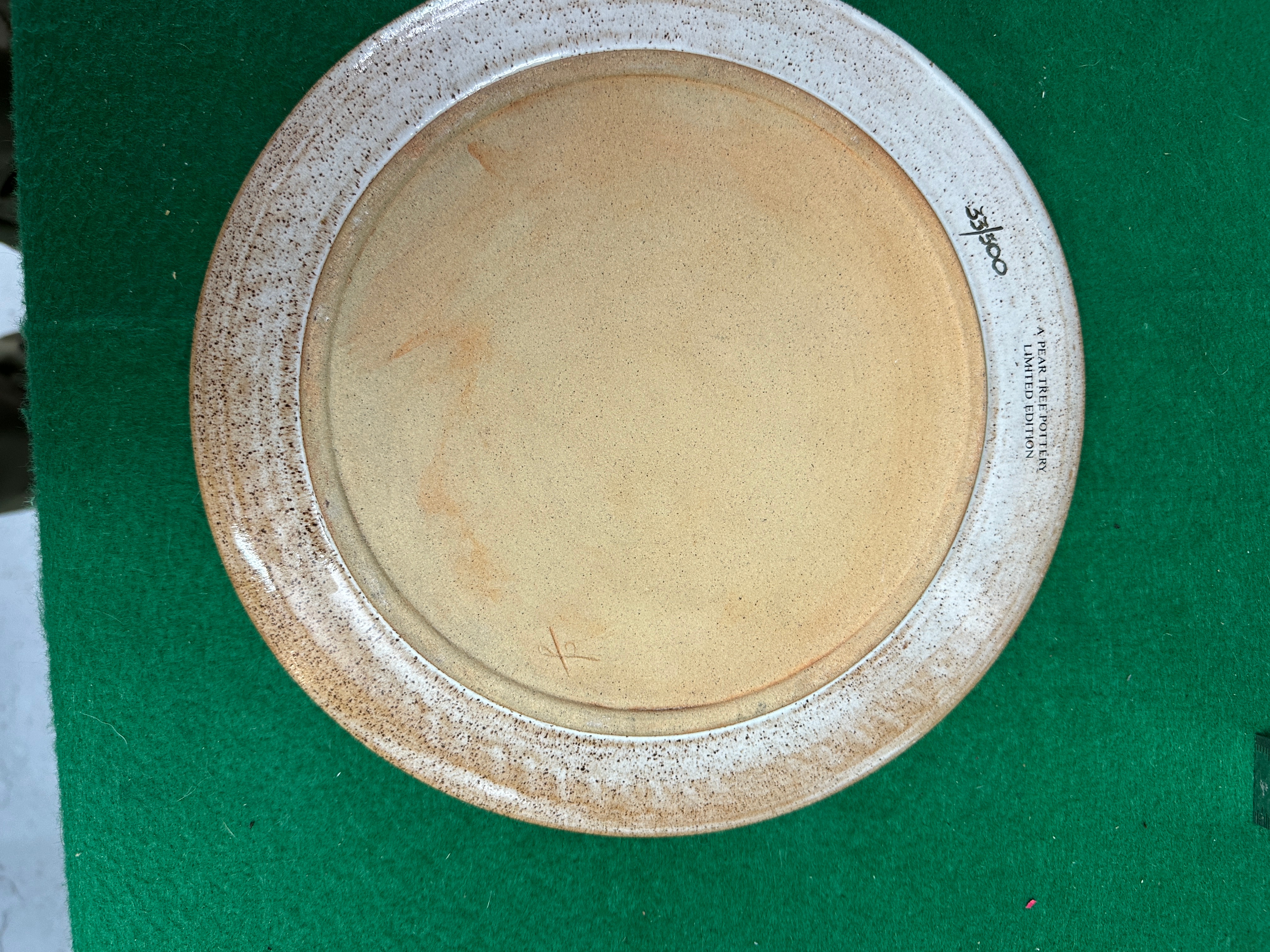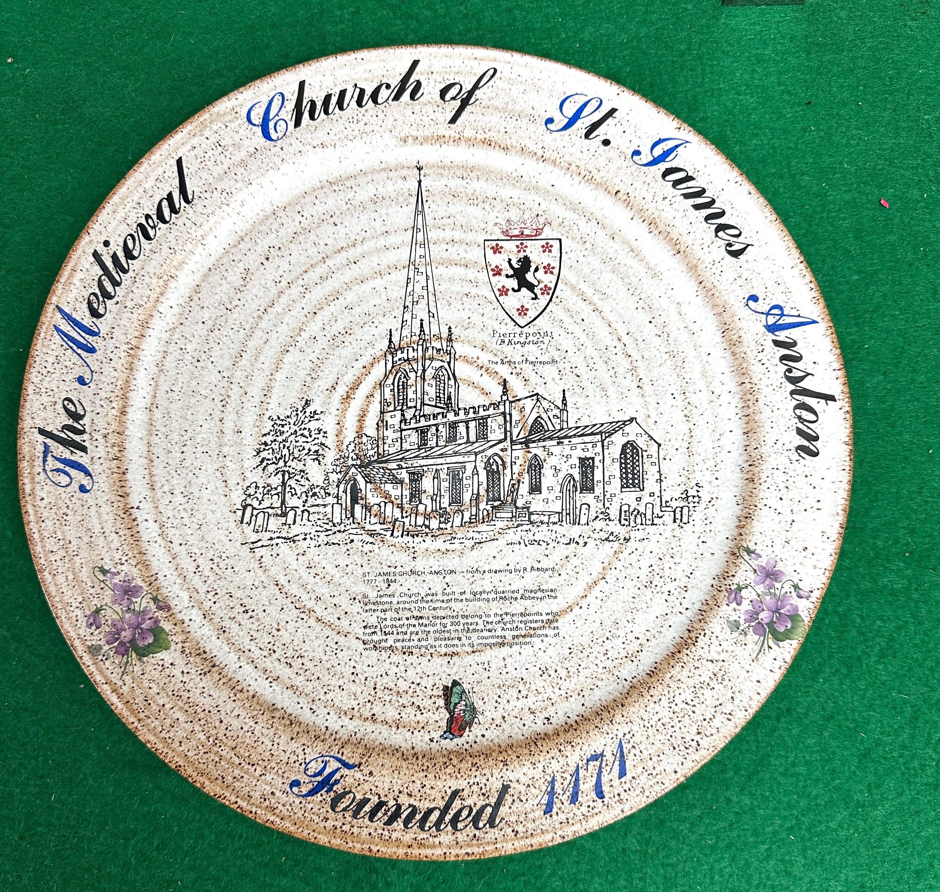 A Peak Tree Pottery Limited Edition commemorative ceramic plate, likely earthenware or stoneware, depicting The Medieval Church of St. James Anston. The plate features a speckled, unglazed rim and a smooth, buff-colored center. The front displays a monochrome line drawing of the church, encircled by blue script reading “The Medieval Church of St. James Anston” and “Founded 1171”. A crest marked “PERRYS” and “St. James of Anston” is visible near the top, while a block of historical text about Anston and the church, along with small floral motifs and a butterfly, adorn the lower section. The reverse is marked “A PEAK TREE POTTERY LIMITED EDITION” and numbered “36/500”, with a faint handwritten “t2” or similar mark.