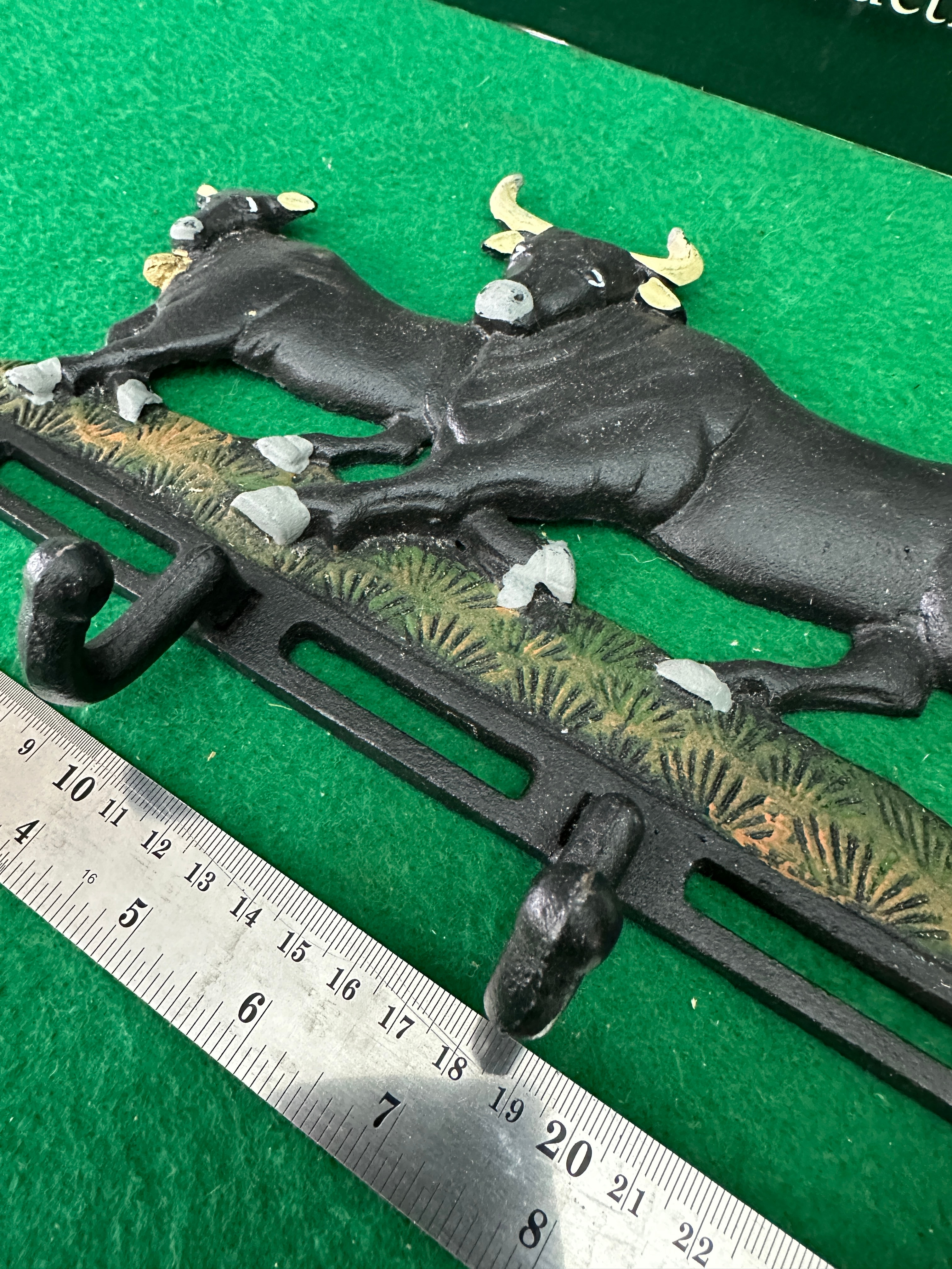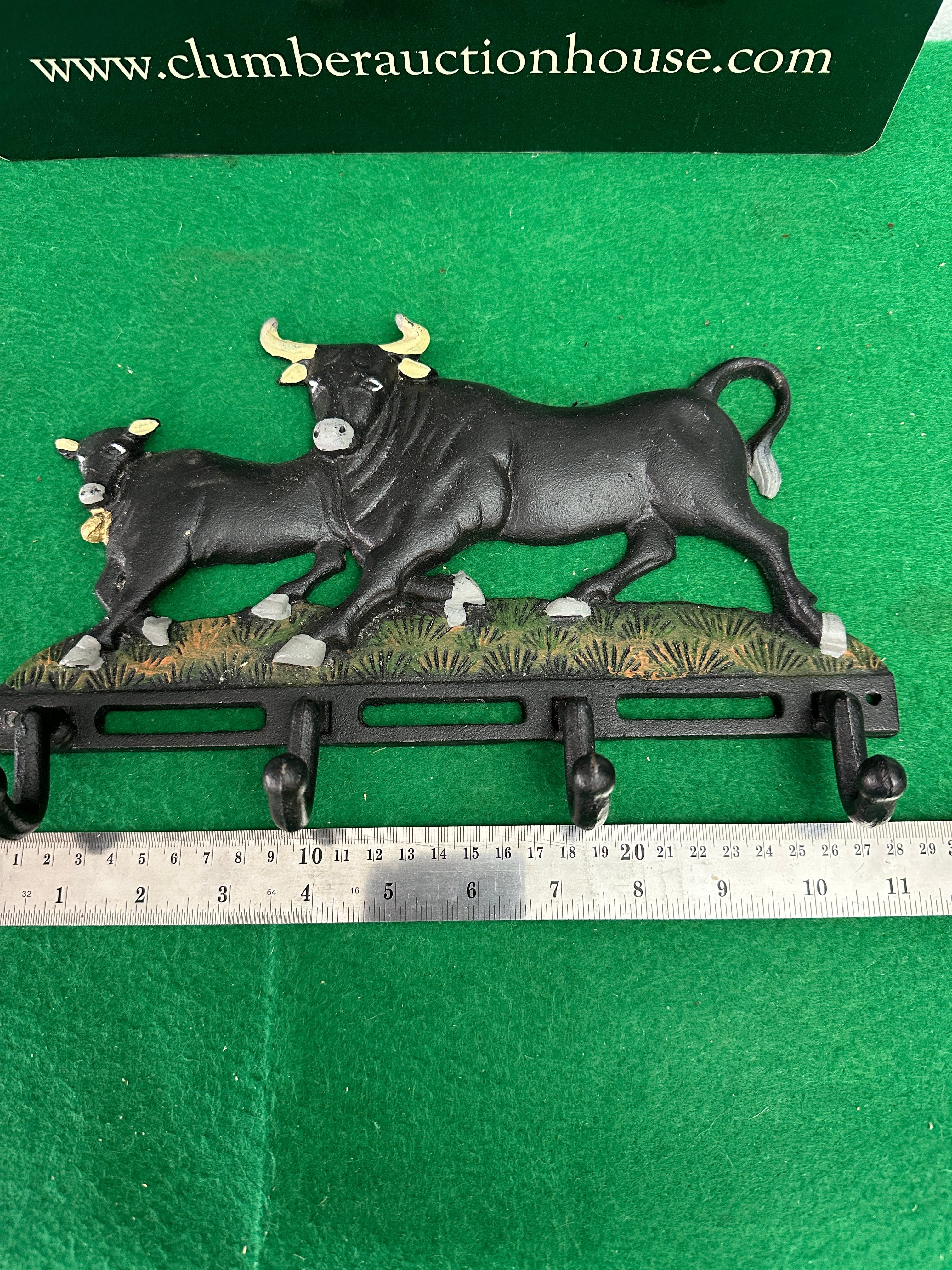 This decorative wall-mounted hook rack is crafted from cast iron and features a stylized design depicting two black bulls, one larger and one smaller, with painted yellow horns and light grey hooves, standing on a textured green and brown grassy base. Three curved hooks are integrated into the lower frame of the rack. The item is finished with black paint and accenting colors. No visible manufacturer’s marks or textual inscriptions are present on the item itself.