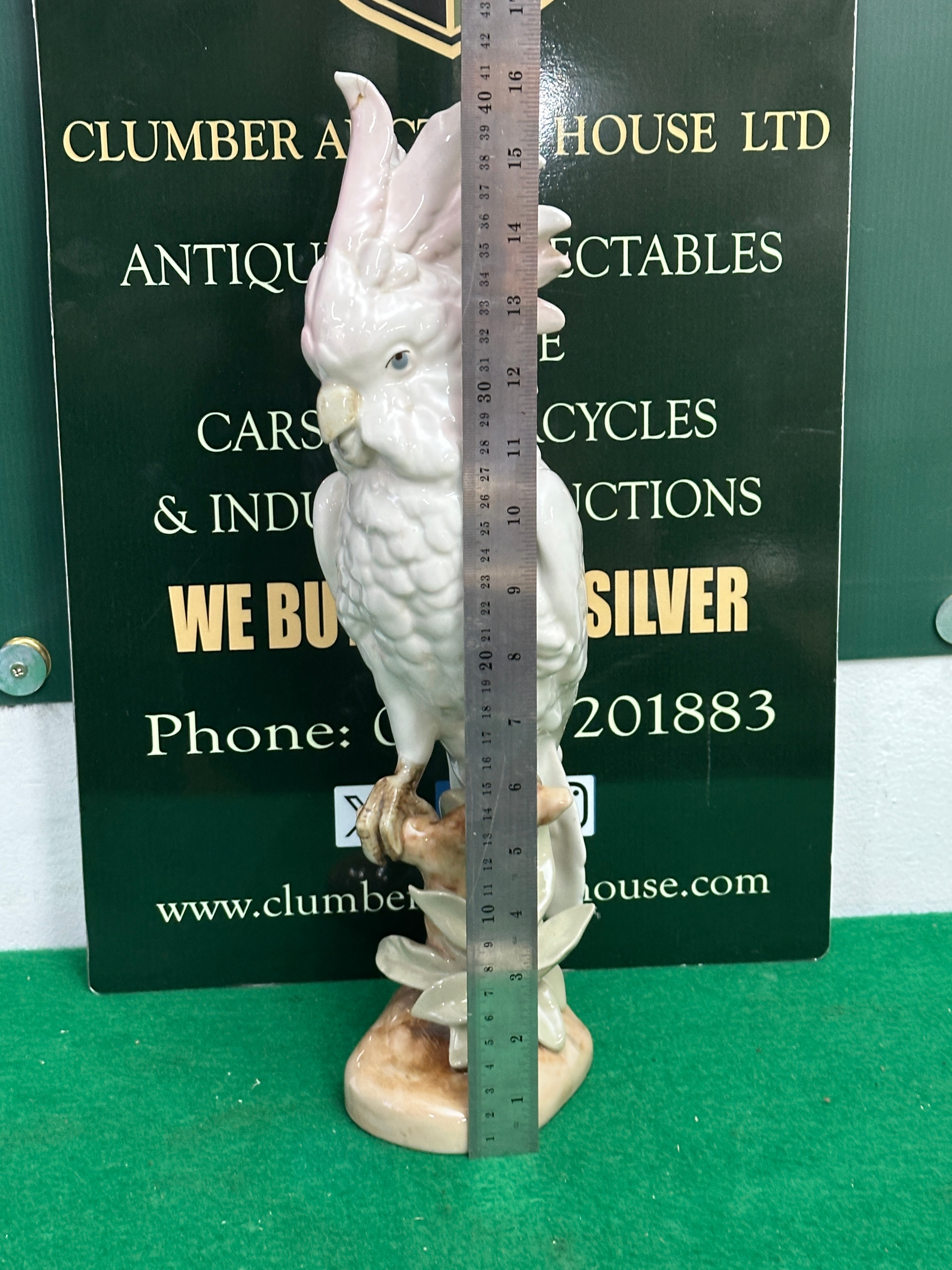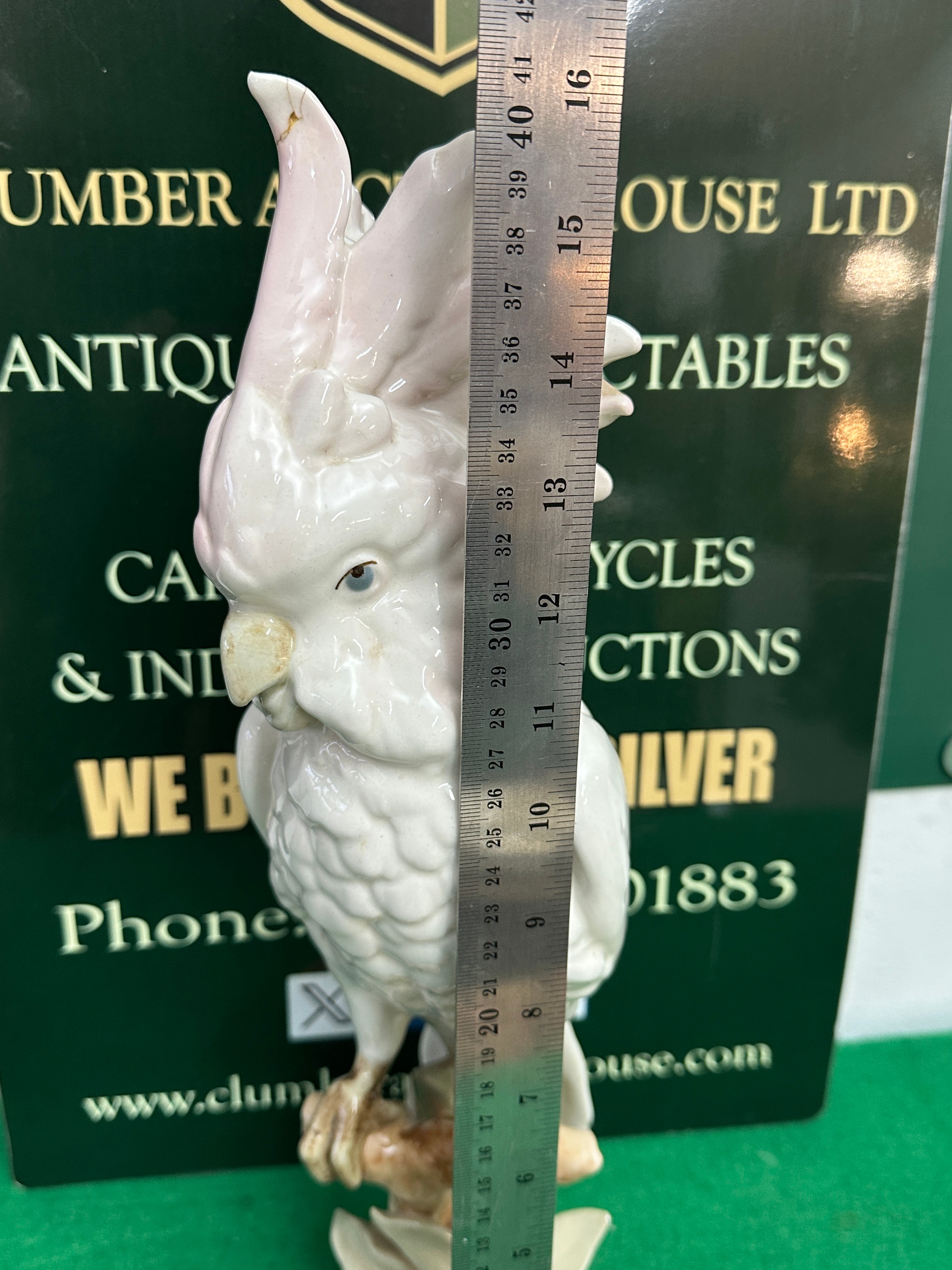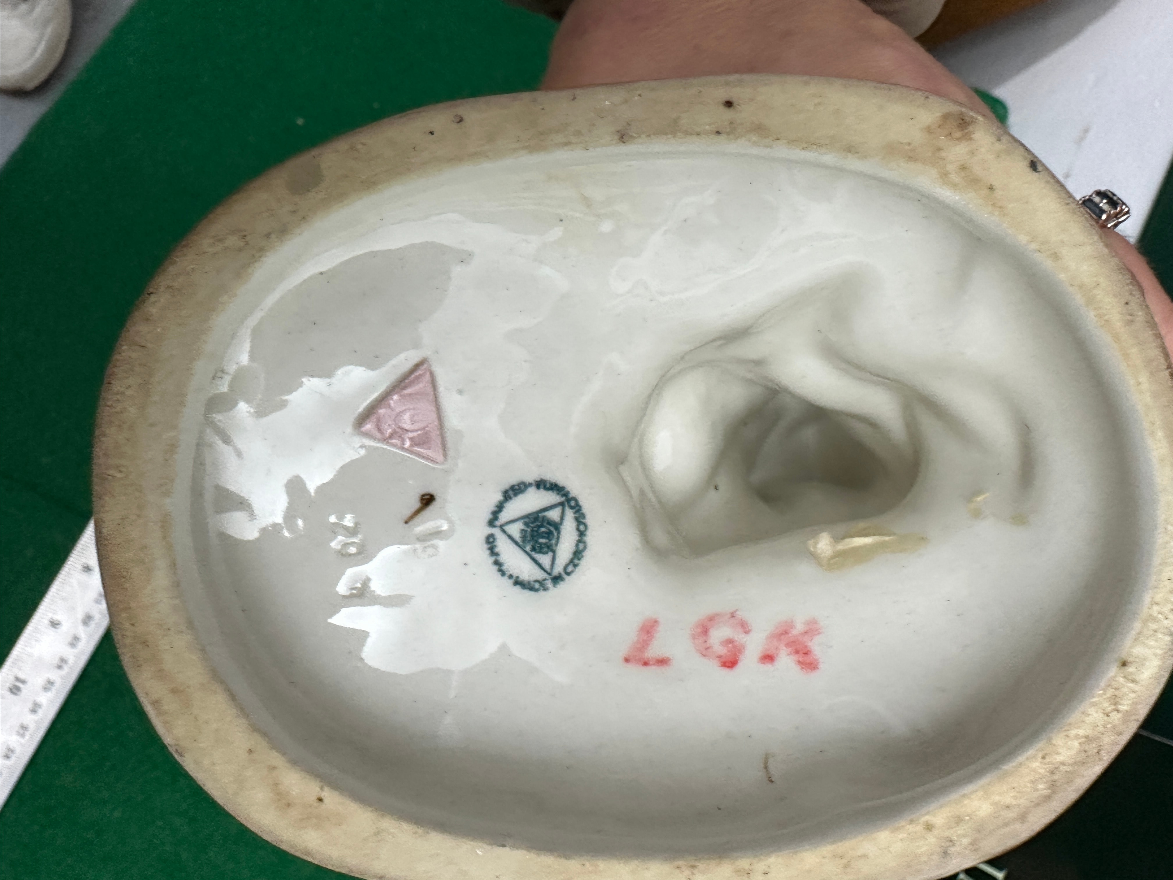 porcelain cockatoo figurine, depicting a white cockatoo perched on a naturalistic base. The birdsfeature a pale pink-tinged crest, blue eyes, and textured white plumage, resting on a base with subtle brown and green accents. The underside of each bears multiple stamps including a distinct red triangular mark, a faded pink triangular mark, a circular blue stamp with a crown motif and text that reads ‘DRESDEN’ and ‘GERMANY’, and a prominent red stamped inscription ‘LGK’.