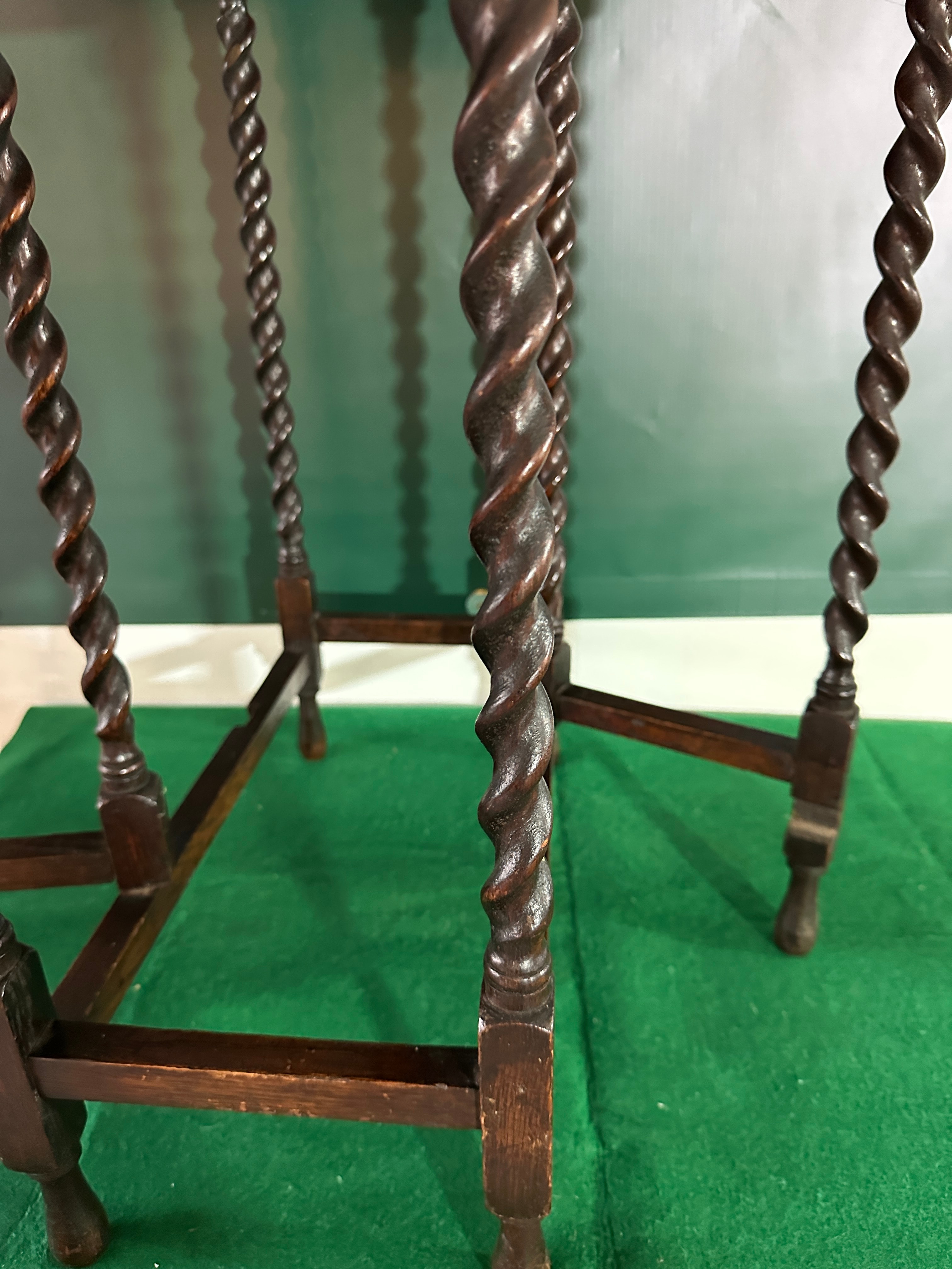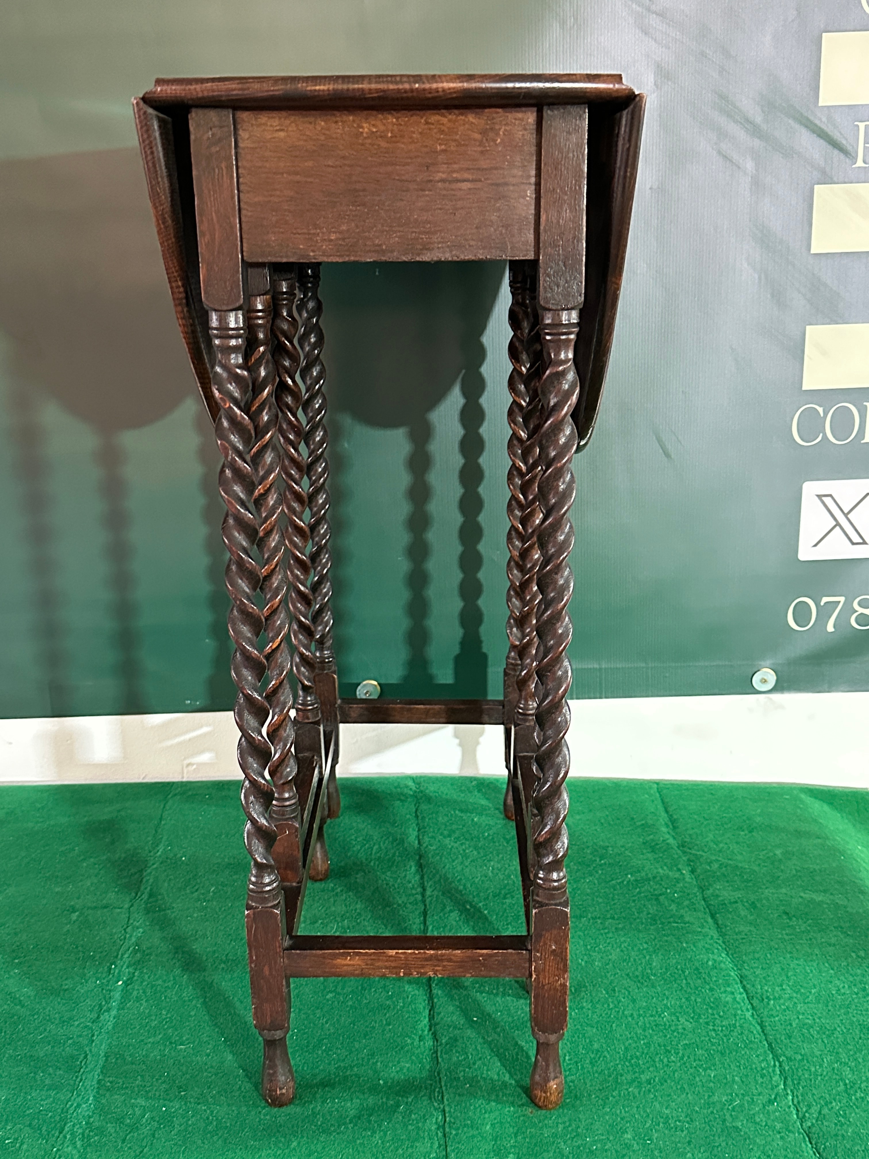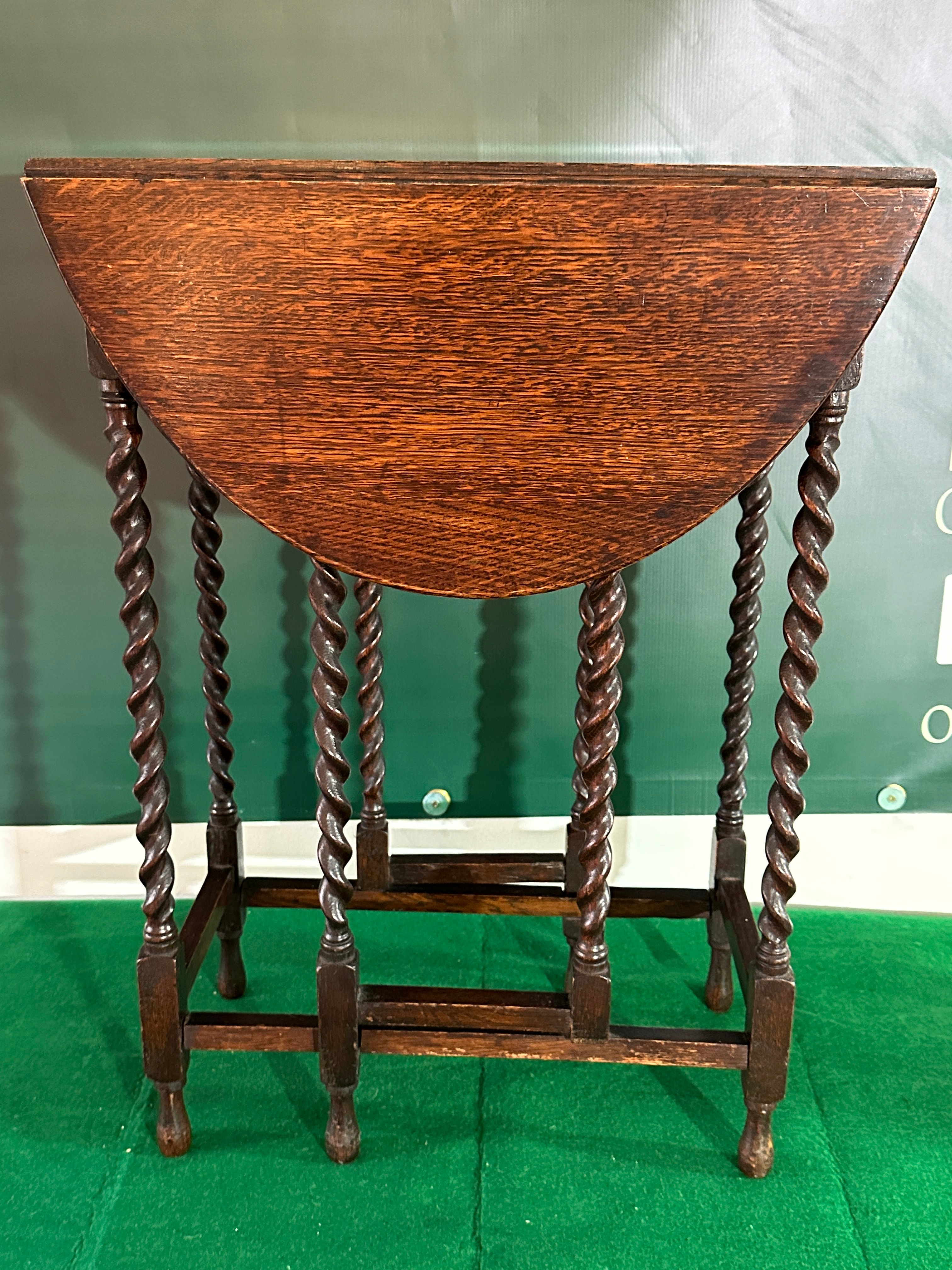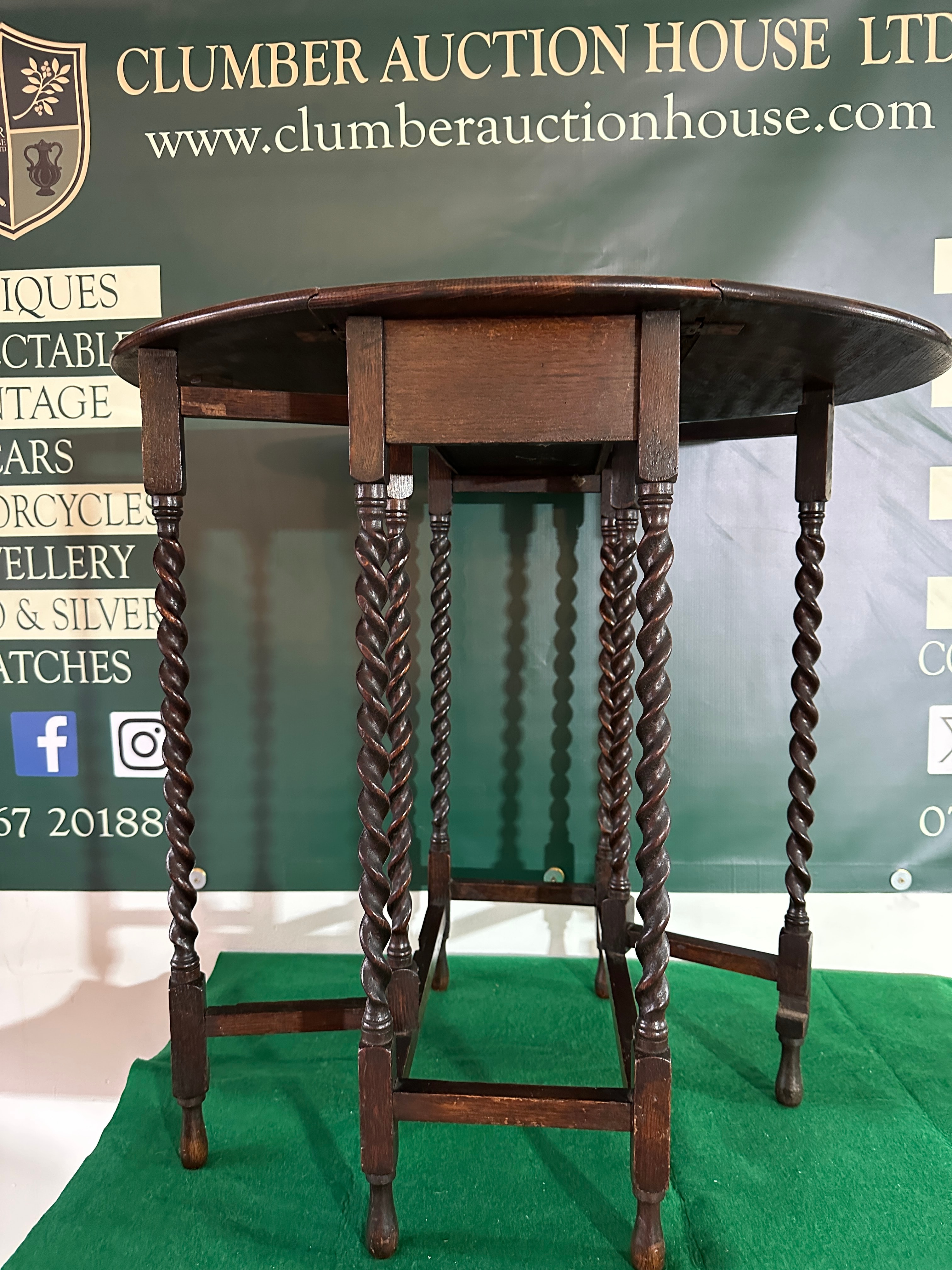 An Edwardian English oak gate leg table, circa 1900. This dark wood table features a drop-leaf top constructed from planks, presenting a visibly aged, dark finish. It is supported by multiple turned legs characterized by a distinctive barley twist design, with stretcher bases connecting the legs. When fully extended, the top forms an oval shape. No specific manufacturer’s marks or labels are visible.