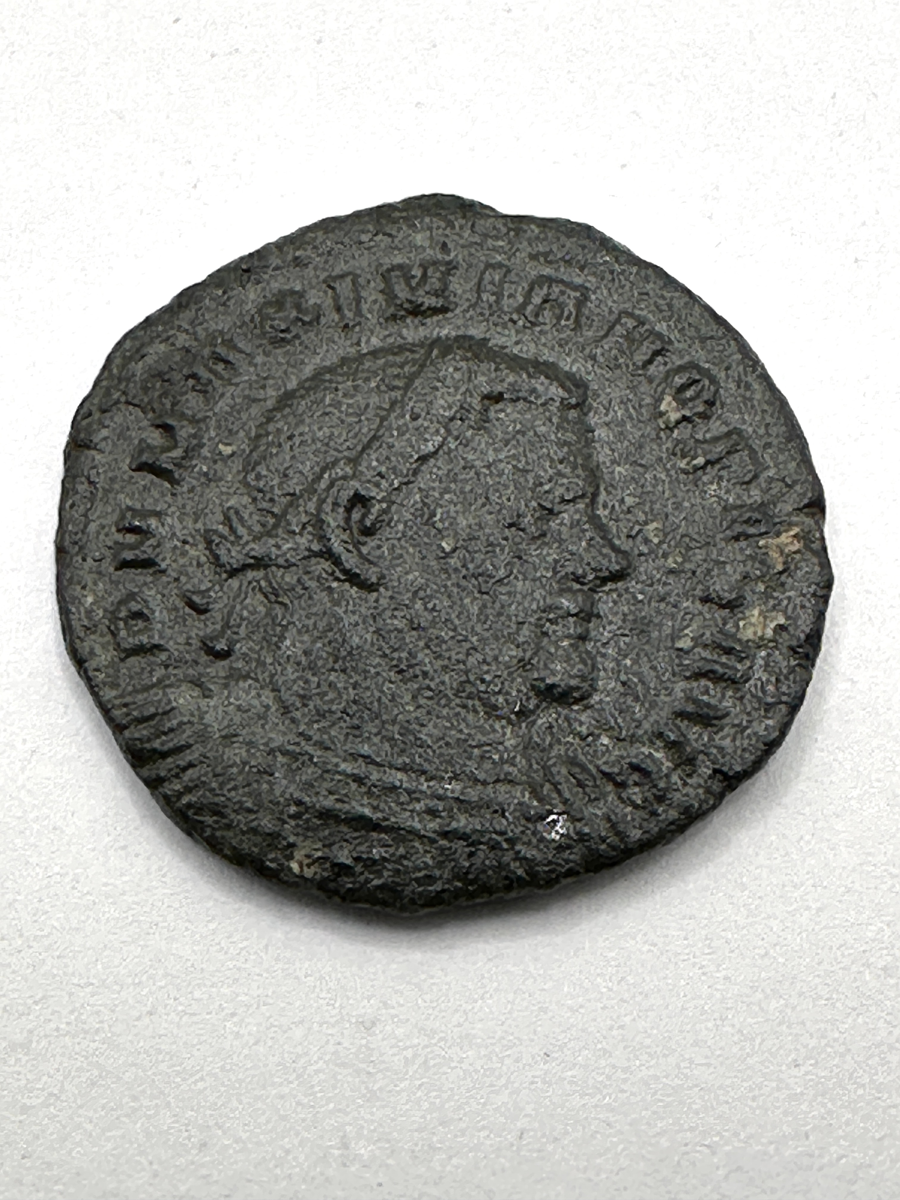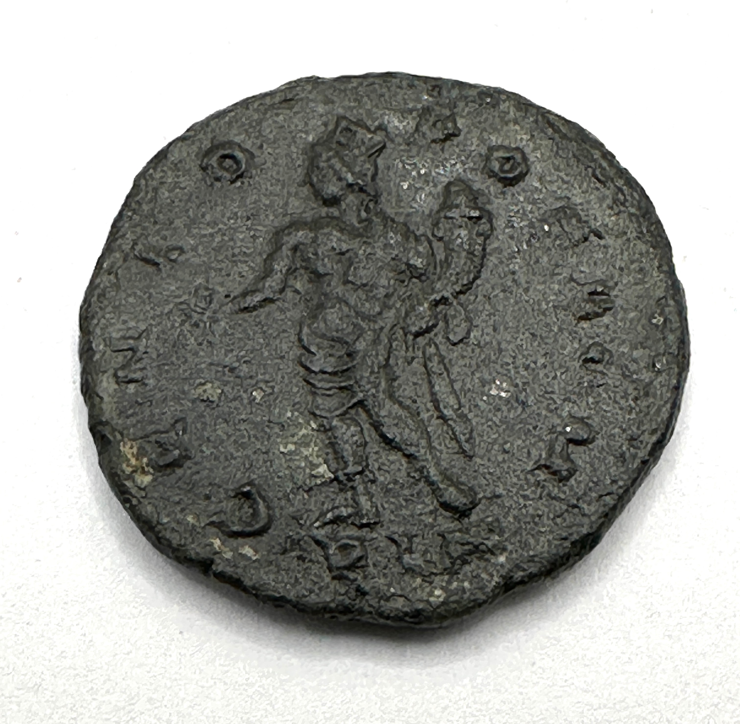 A Roman Imperial bronze coin, identified as an issue of Emperor Gallienus (reigned 253-268 AD). The obverse features a right-facing laureate bust of the emperor, with a partially legible Latin inscription including ‘IMP CAES…’ and ‘…GALLIENVS AVG’. The reverse depicts a standing, armored male figure, possibly a deity or soldier, holding an object, with faint surrounding text and symbols visible. The coin is circular and made of a dark-patinated base metal, consistent with bronze or copper alloy.