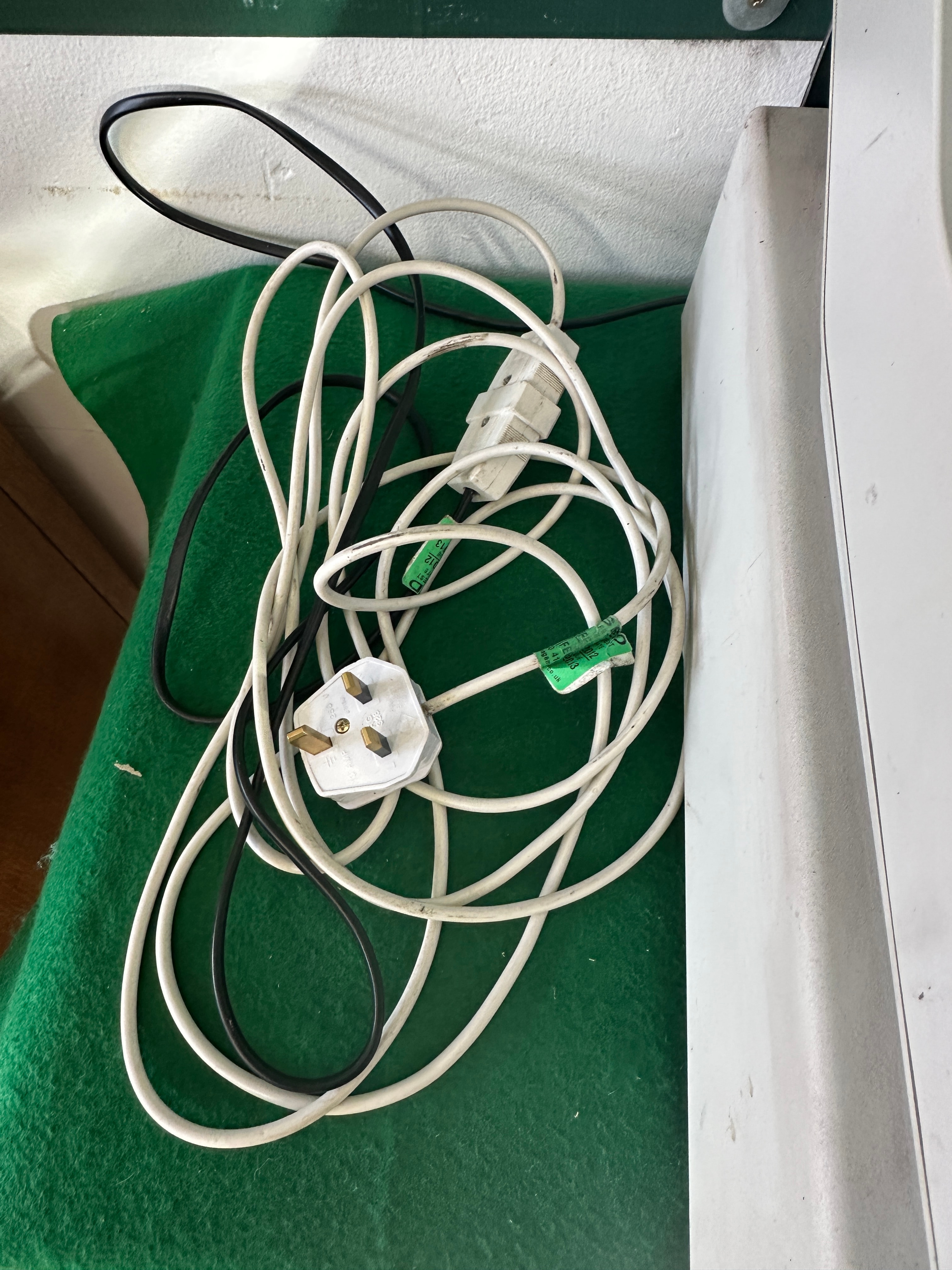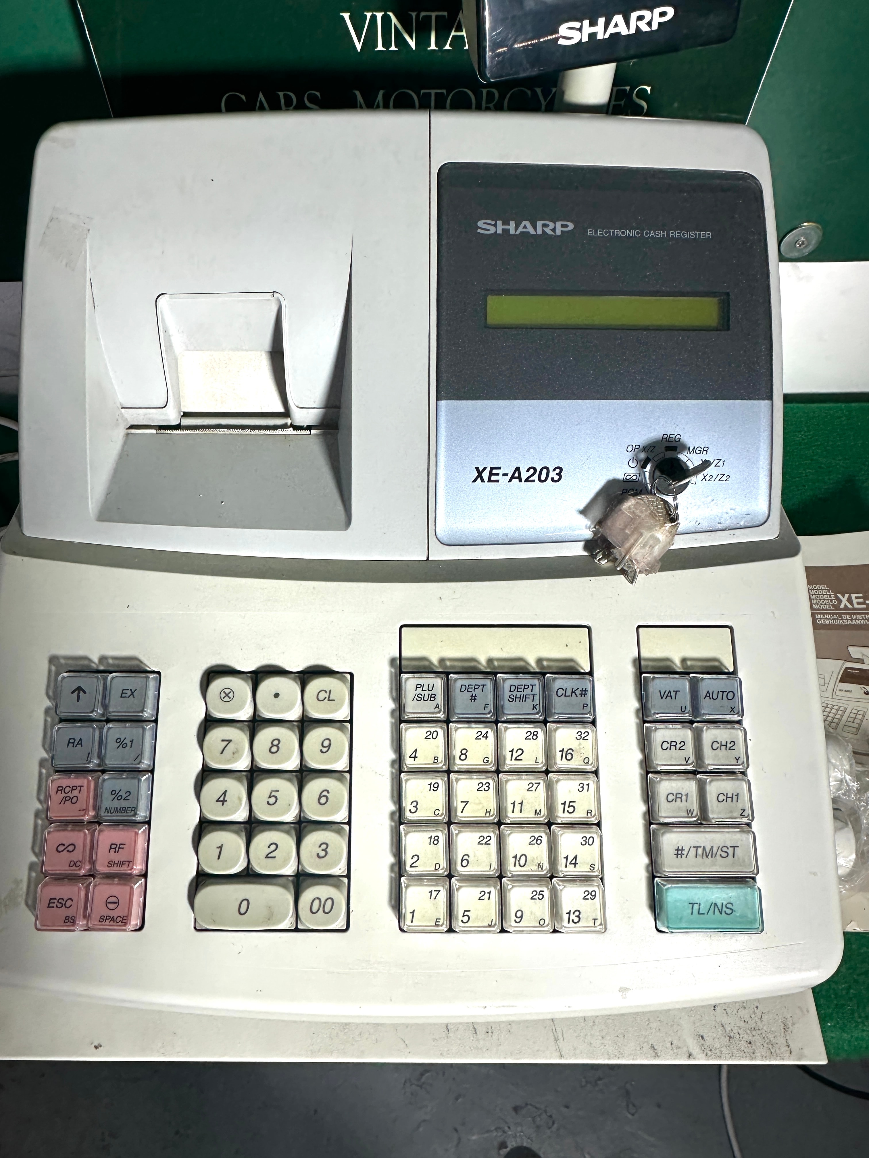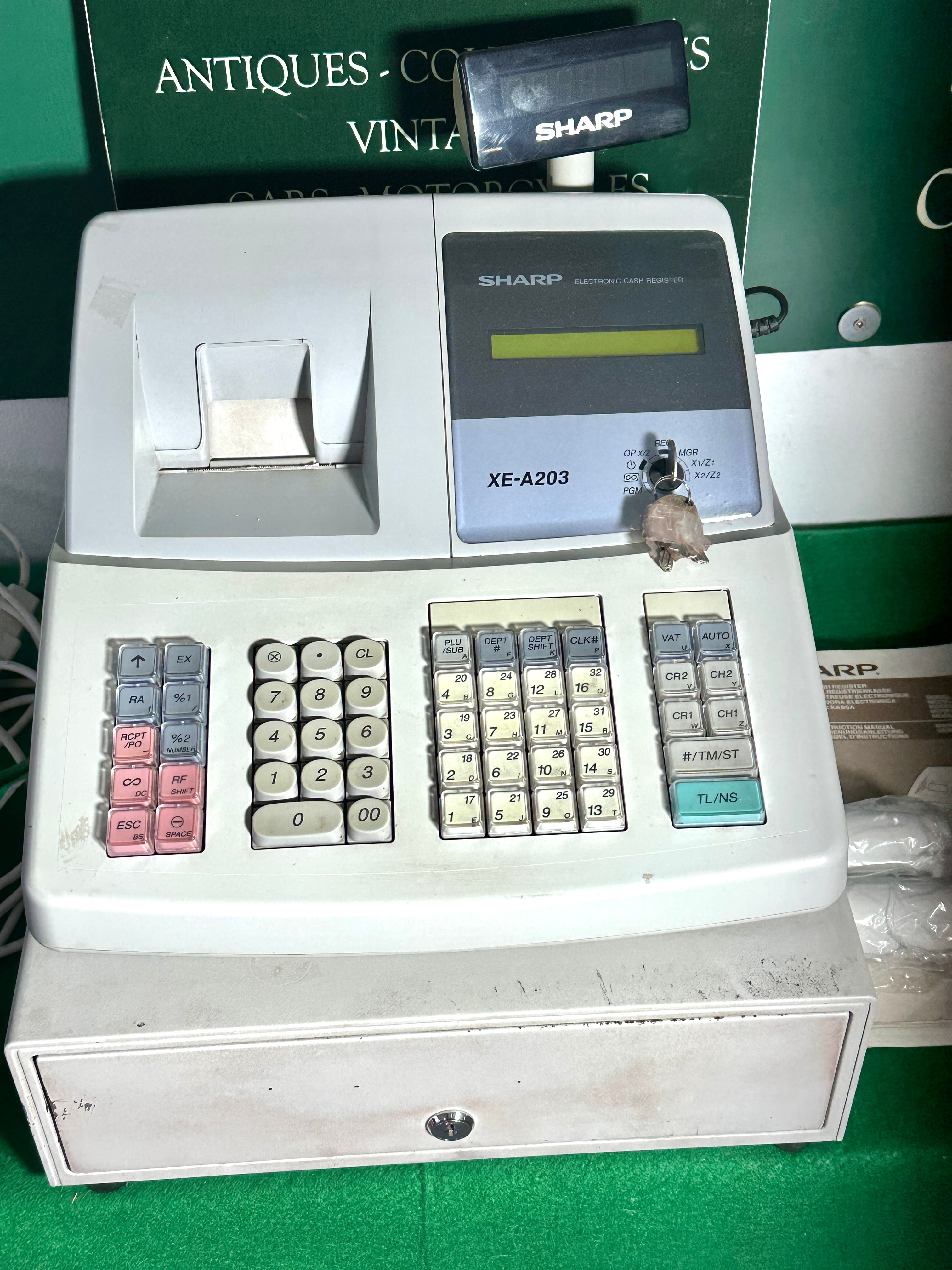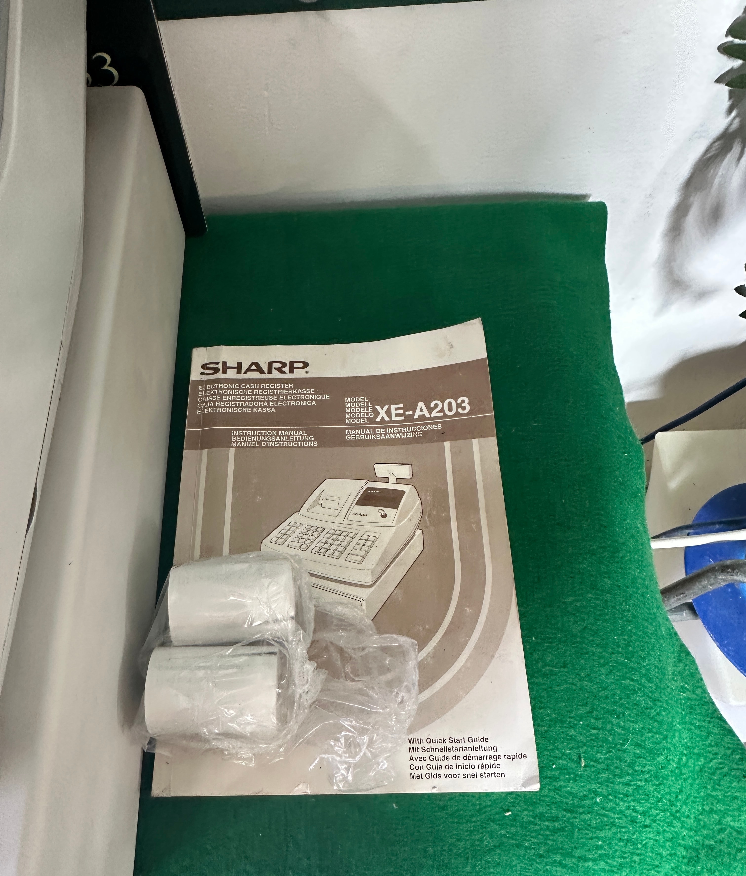 A Sharp XE-A203 Electronic Cash Register. This unit features a utilitarian design characteristic of late 20th to early 21st-century electronics, constructed primarily of light grey plastic with a dark grey display panel and a metal cash drawer. It includes a numerical keypad, various function buttons such as VAT, AUTO, and DEPT, and a digital display. A key is inserted into a lock with positions marked “REG,” “MGR,” and “OFF.” The item is accompanied by its original multi-language instruction manual (English, German, French, Italian, Spanish, Dutch) and a Quick Start Guide. Also present are several new rolls of thermal paper and tangled power cords, including one with a UK-style plug.