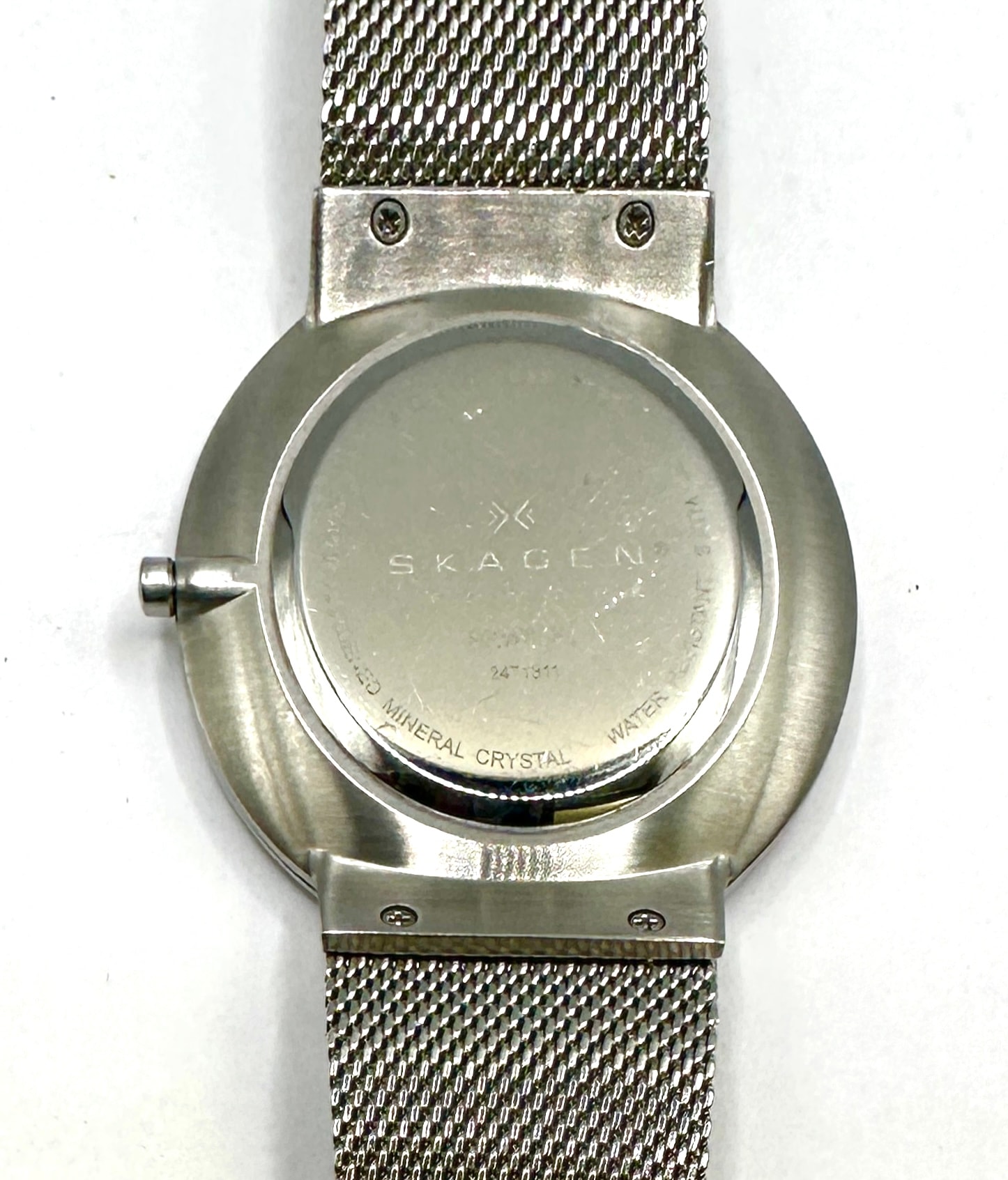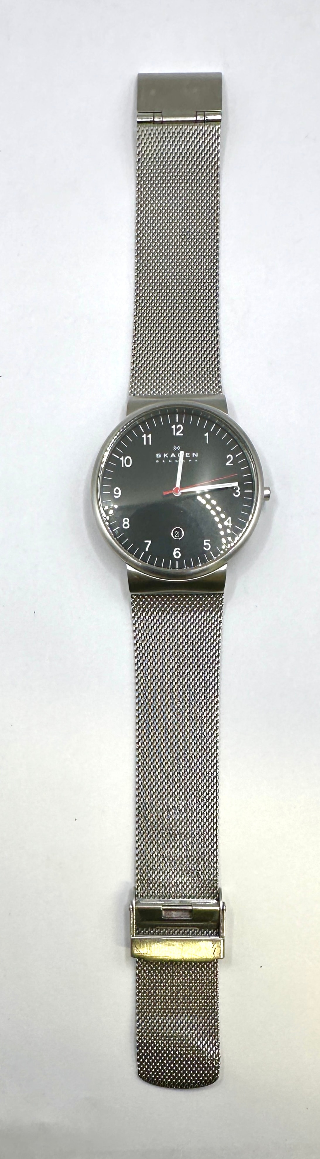 A Skagen Ancher SKW6051 men’s wristwatch. This contemporary timepiece features a round, polished stainless steel case and a fine-mesh stainless steel Milanese bracelet with a deployant clasp. The minimalist black dial displays white hour markers and numerals from 1 to 12, with a white hour hand, a white minute hand, and a red second hand. A small circular date window showing ’21’ is located above the 6 o’clock position. The dial is marked with ‘SKAGEN’ in white text, above a small star-like logo, and ‘DENMARK’ beneath the brand name.