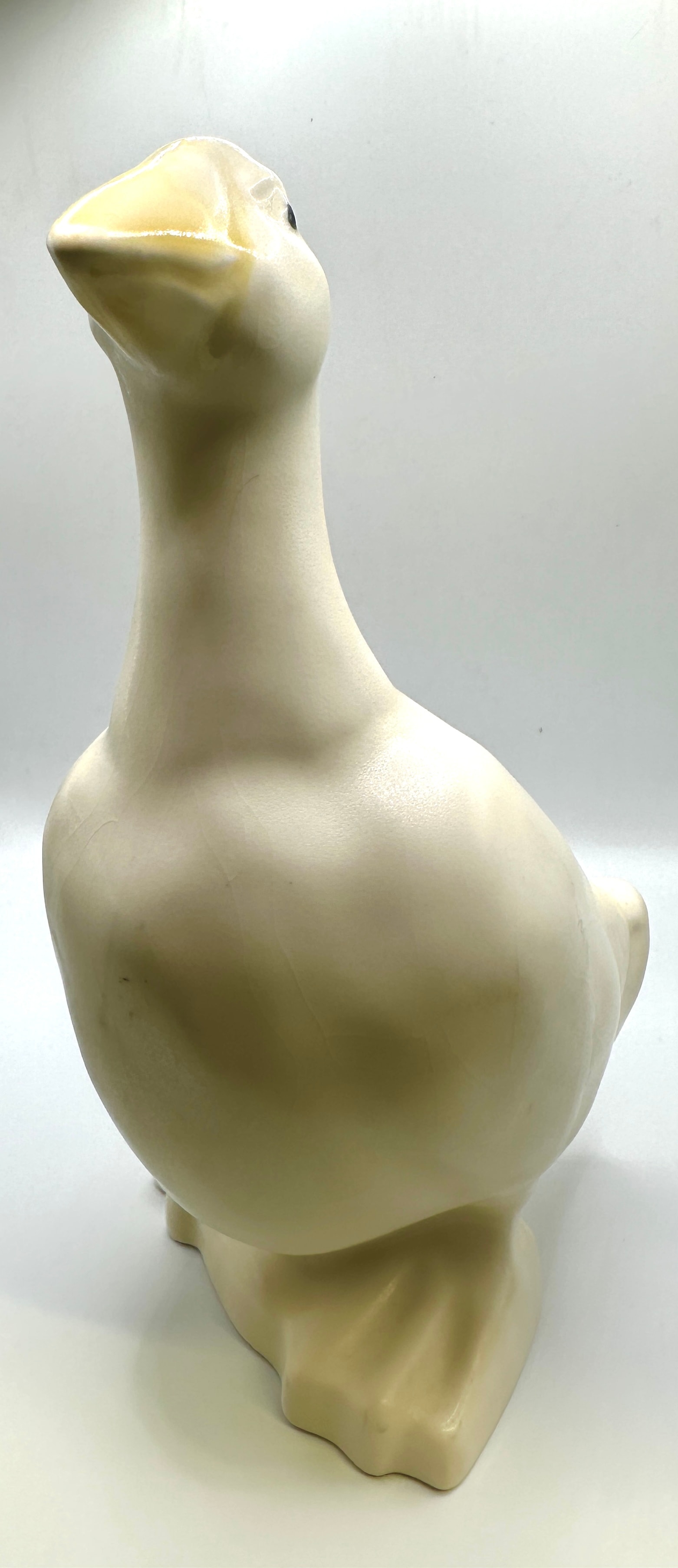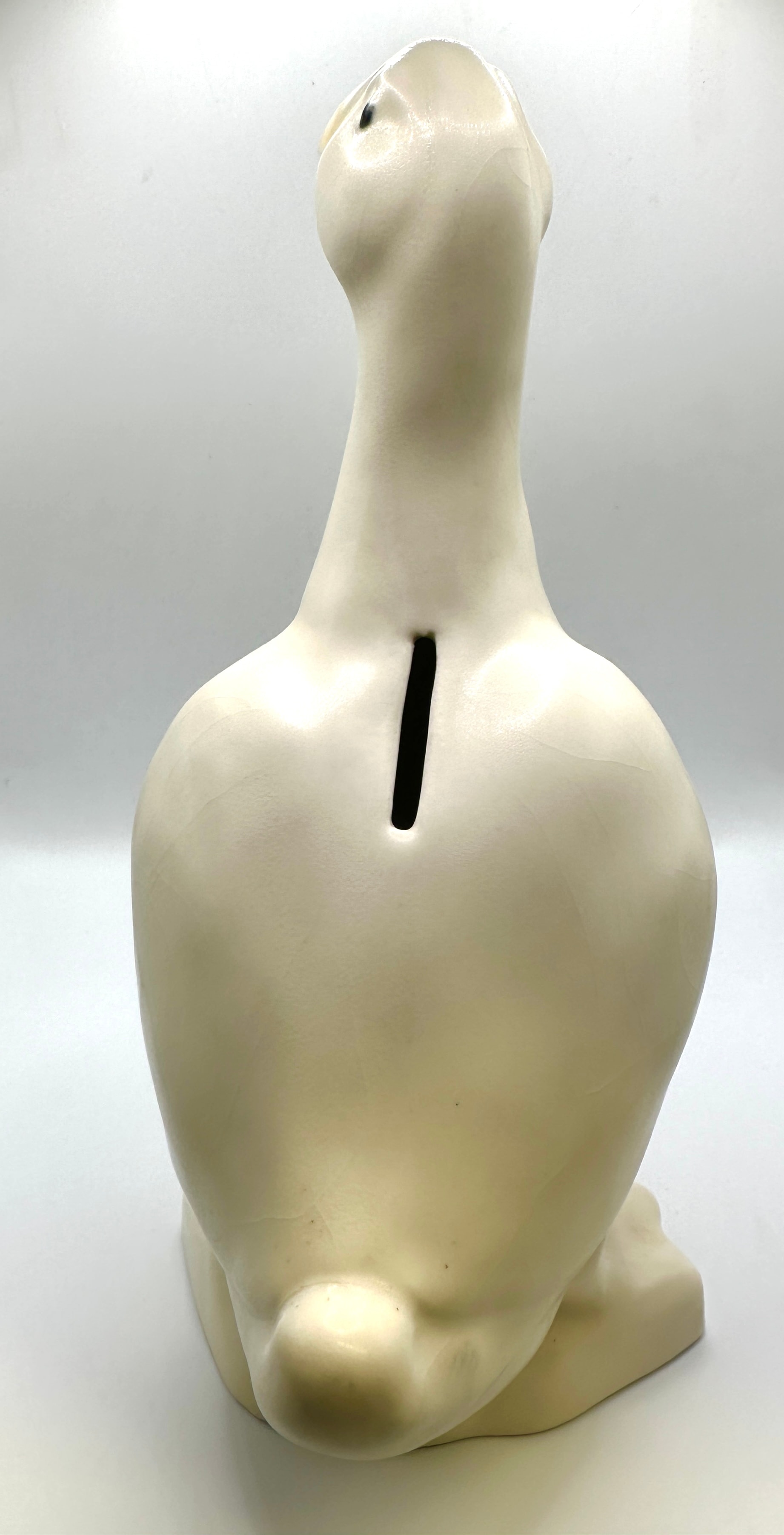 A Höganäs Keramik ceramic money box, produced for Sparbanken, modeled in the form of a stylized off-white/cream goose with a minimalist design. It features a coin slot on its back and a slotted metal stopper on its base for access. The underside displays black printed marks: a circular “HOGANAS KERAMIK” stamp, along with “BLYFRITT” (Lead-free), “UGNSFAST” (Ovenproof), and “SVERIGE” (Sweden). Separately, the text “SPARBANKEN” (The Savings Bank) is visible, accompanied by a stylized ‘S’ logo, indicating its promotional origin.