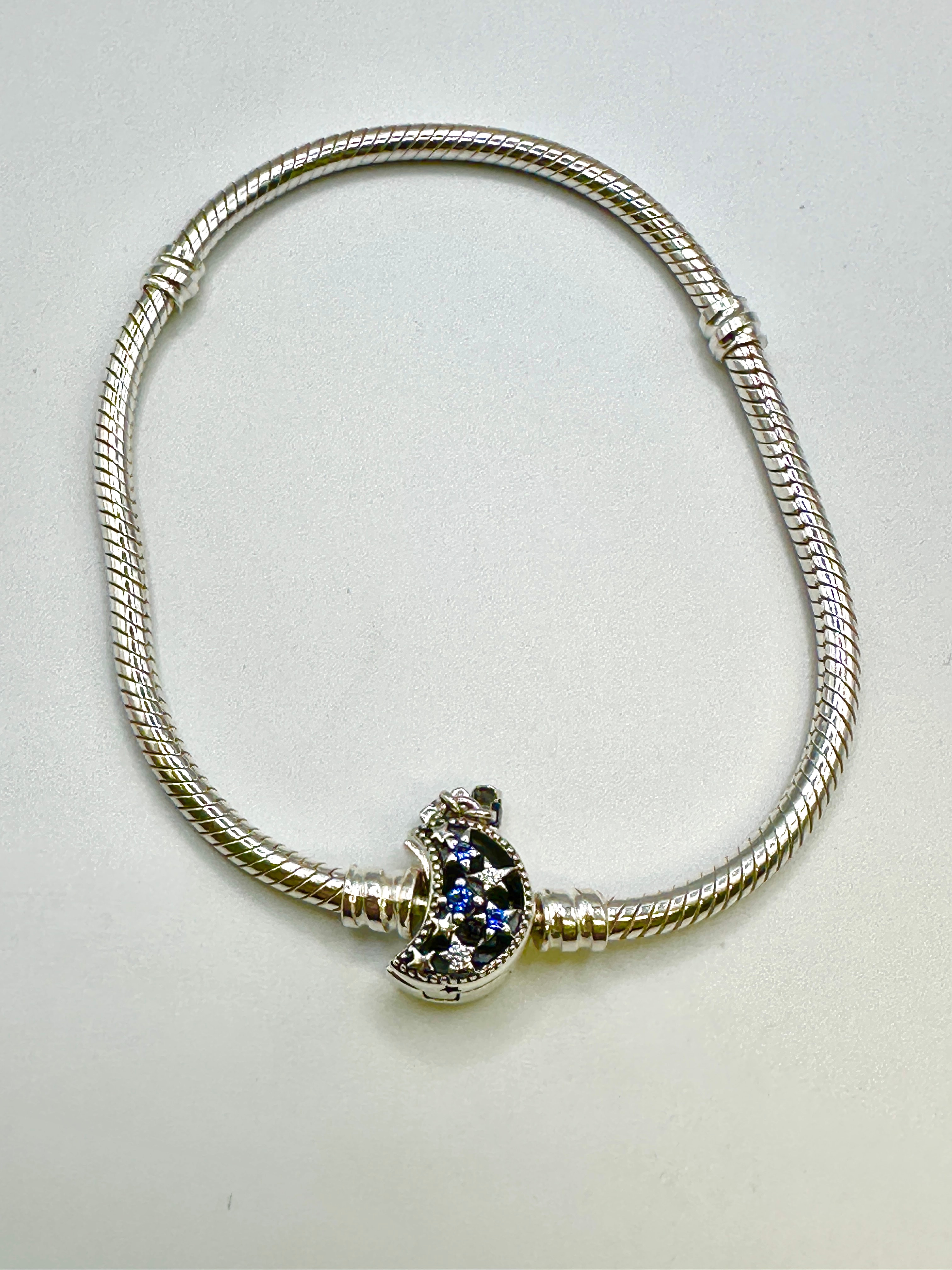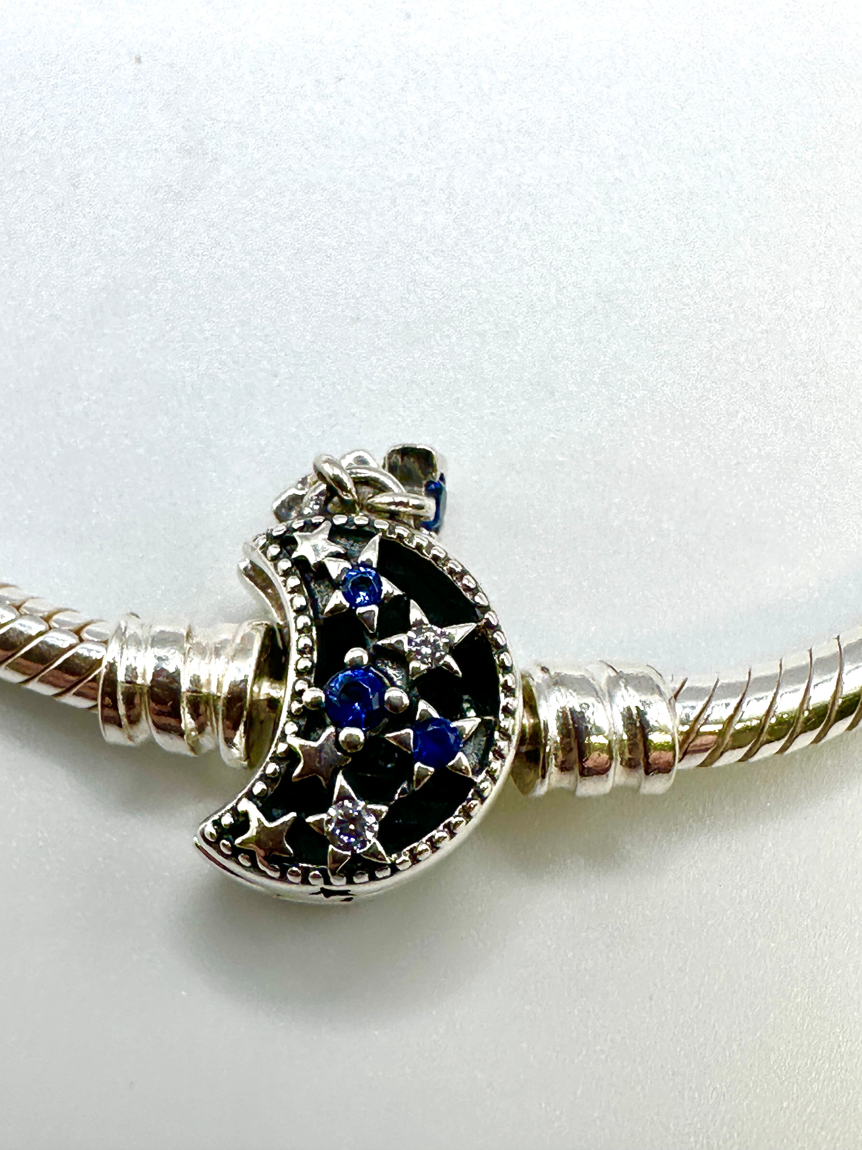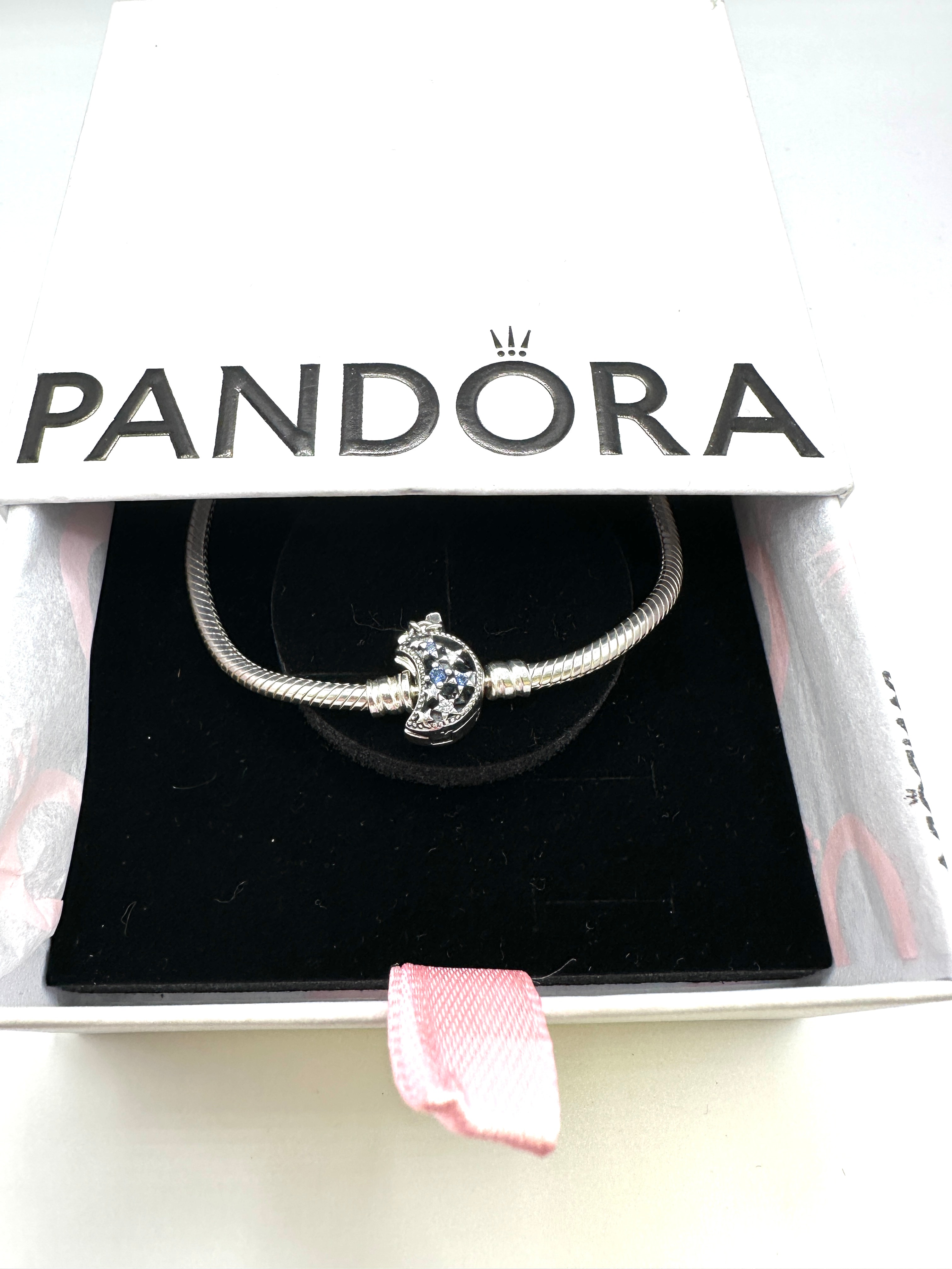 A modern PANDORA Moments Blue Sparkling Moon Clasp Snake Chain Bracelet, featuring a silver-tone snake chain design. The bracelet is adorned with a prominent crescent moon-shaped clasp, detailed with dark enamel, scattered small star motifs, and set with faceted blue and clear stones. It is presented within its original white box emblazoned with the “PANDORA” logo and crown motif.