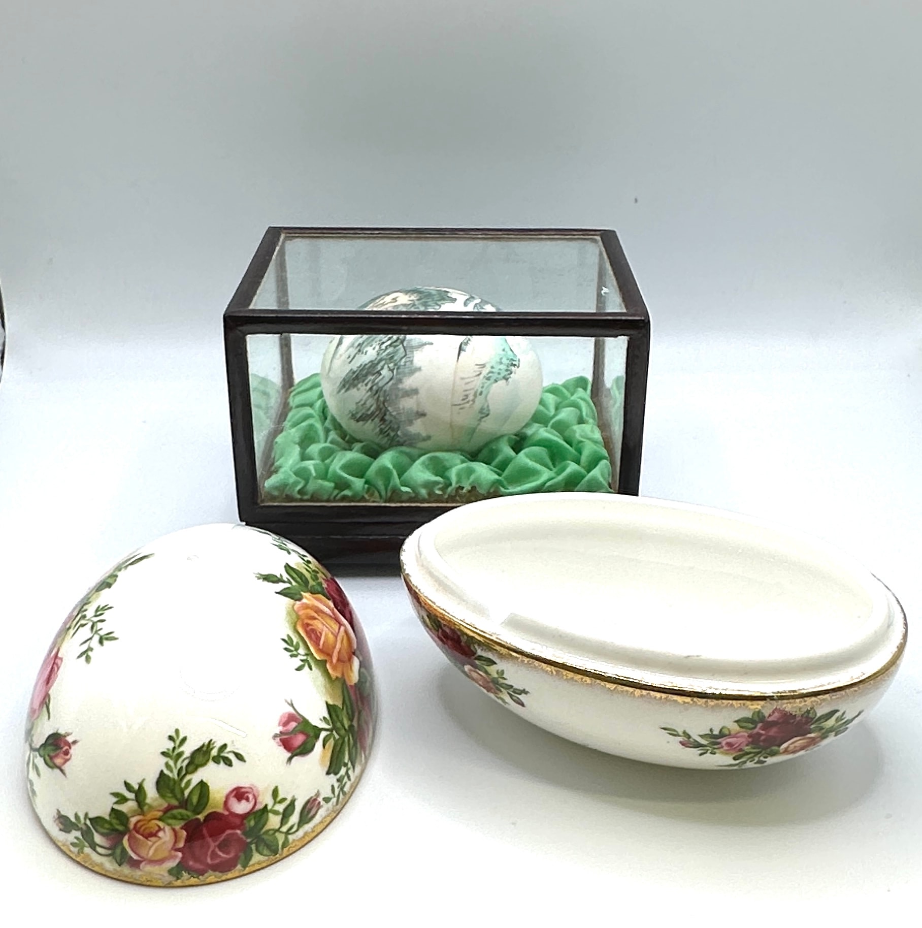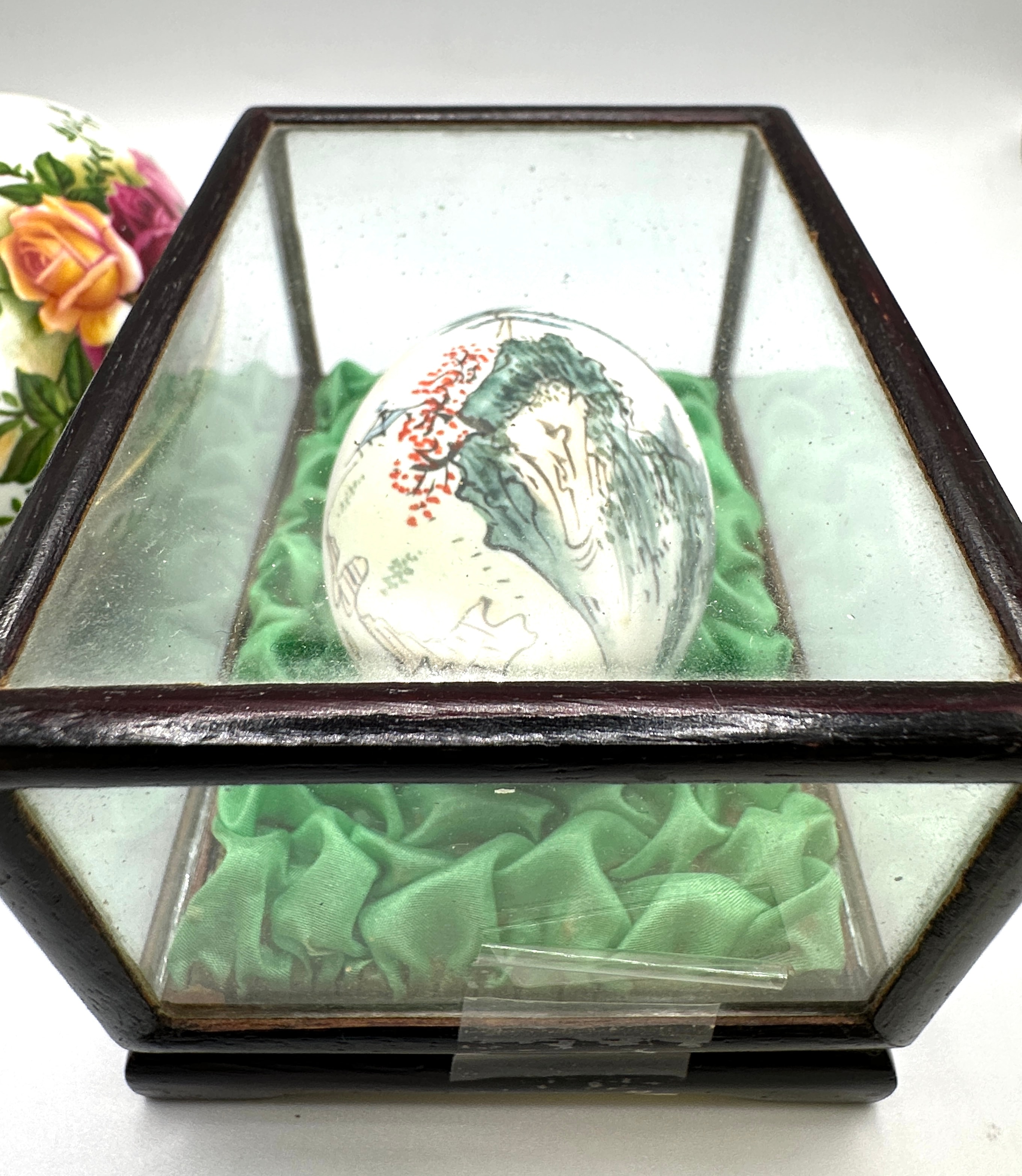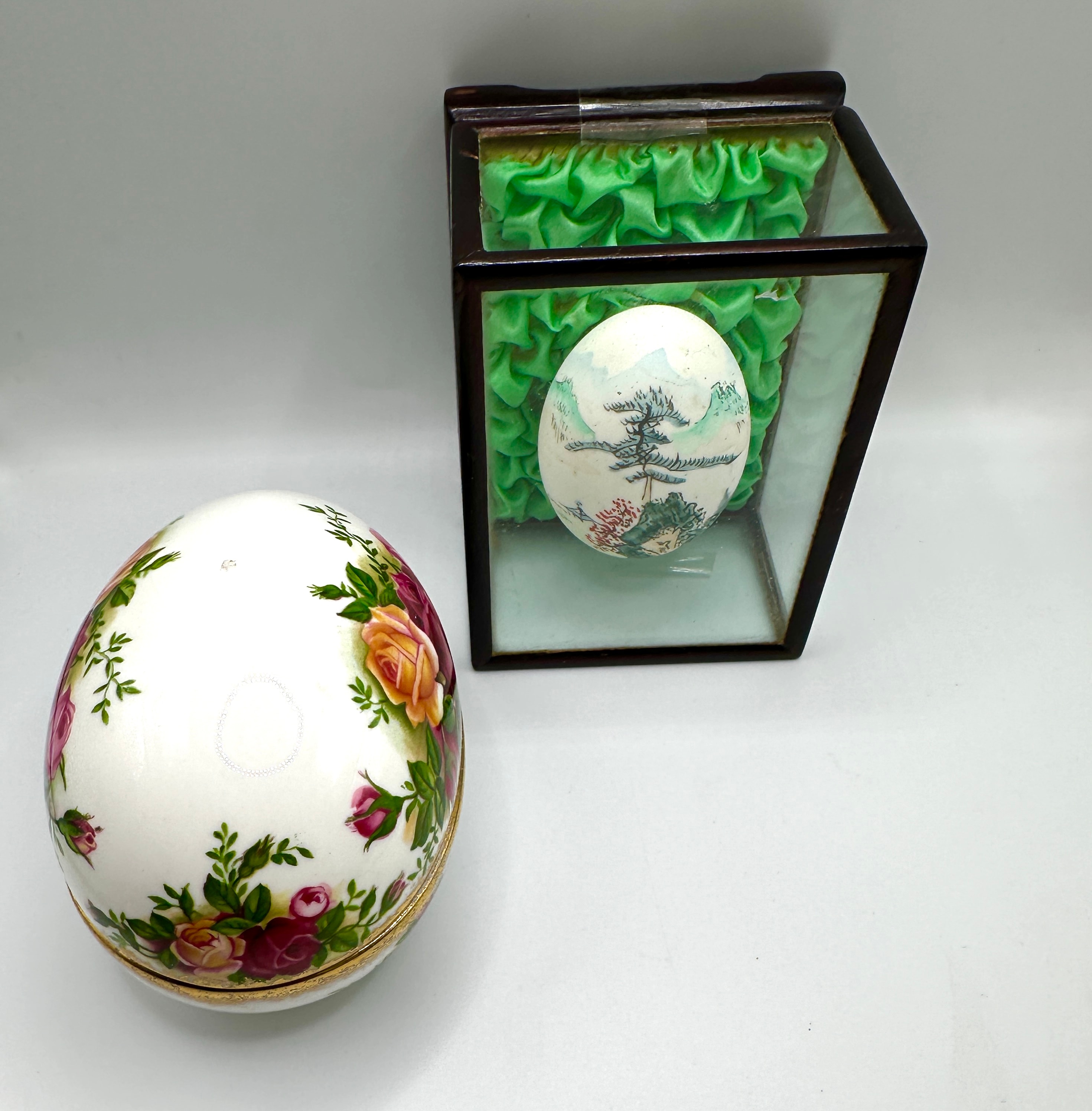The lot presents two vintage decorative egg-shaped objects. The first is an ovoid lidded box, likely porcelain or ceramic, featuring a white ground extensively decorated with polychrome roses in shades of pink, orange, and red, complete with green foliage and a gold-toned trim along the rim. The second item is a vintage Asian hand-painted egg, likely ceramic, displayed within a dark wood and glass presentation case lined with ruffled green fabric. This egg is adorned with a finely hand-painted East Asian-style landscape scene in a muted palette, depicting mountains, trees, and subtle architectural elements. Faint artistic brushstrokes on the landscape egg suggest an inscription, though it is not discernible.