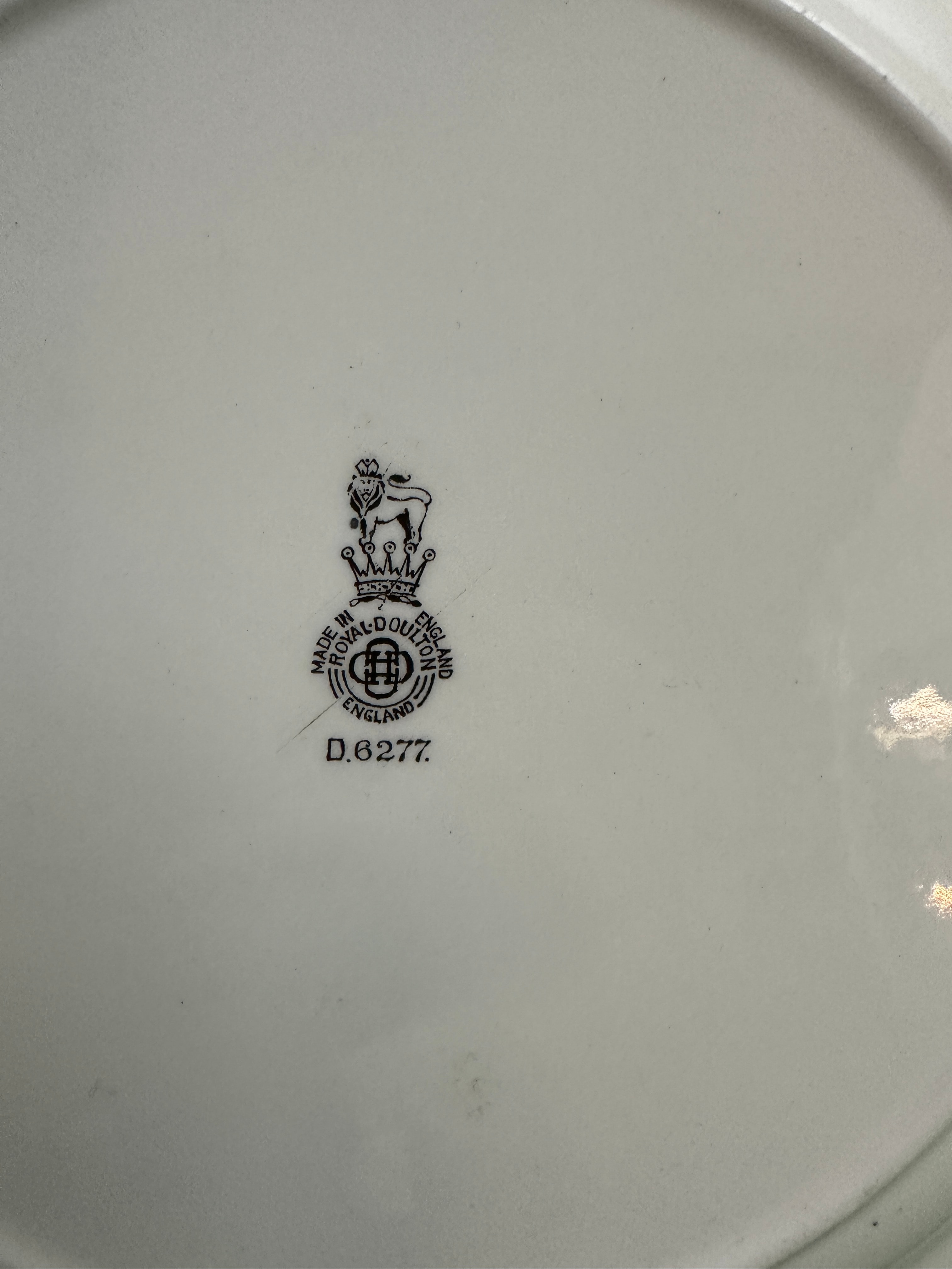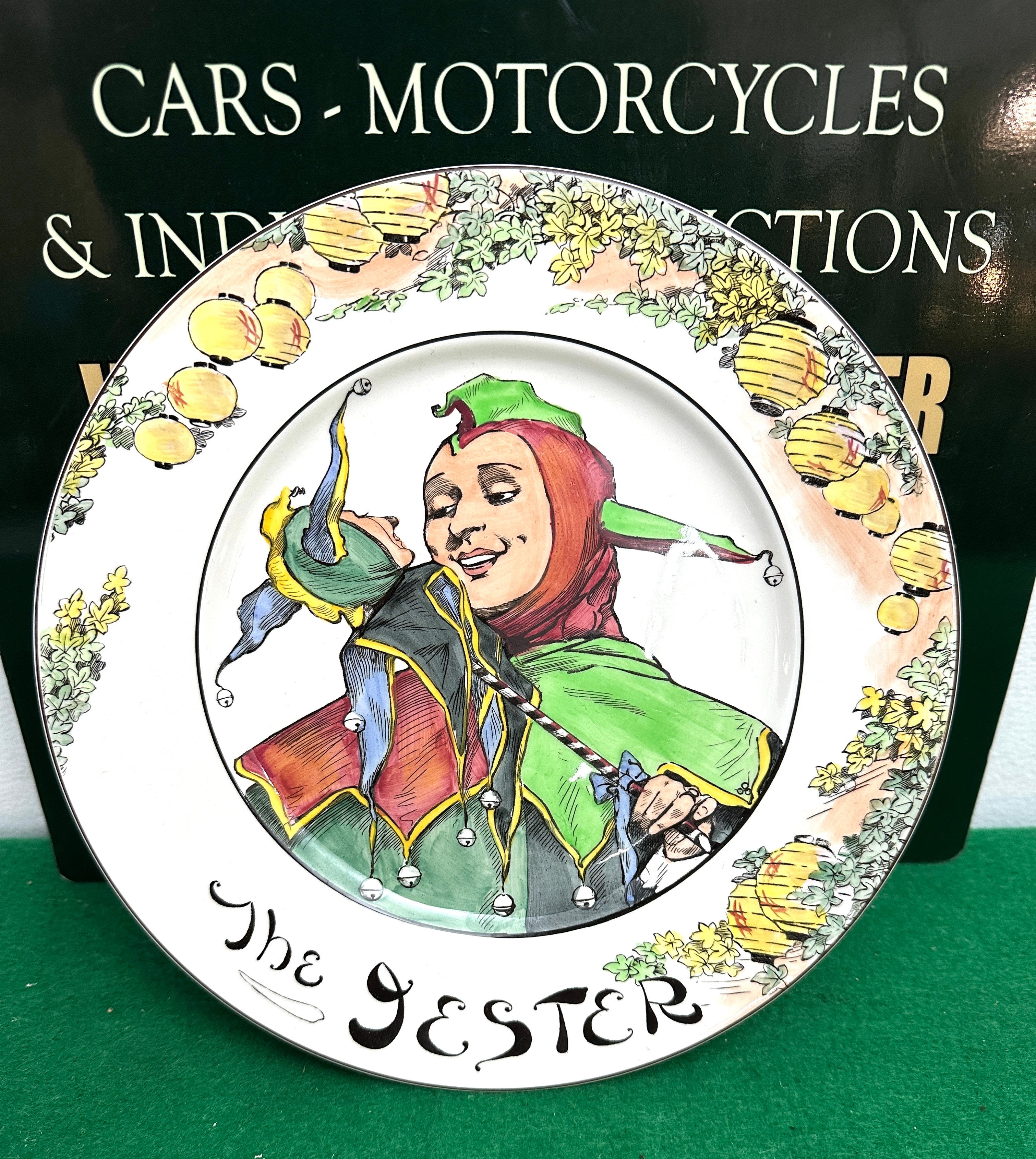 A Royal Doulton ‘The Jester’ D6277 plate. This decorative ceramic plate features a central, colorful illustration of a smiling jester in red, green, blue, and yellow attire with a two-pointed hat and bells, holding a jester’s staff. The plate’s rim is decorated with a garland of green leaves, yellow flowers, and yellow lanterns. “The JESTER” is inscribed in a decorative script on the front. The reverse displays a Royal Doulton backstamp, comprising a lion atop a crown, encircling “MADE IN ROYAL-DOULTON ENGLAND” and a central ‘D’ device, with the pattern number “D.6277” below.