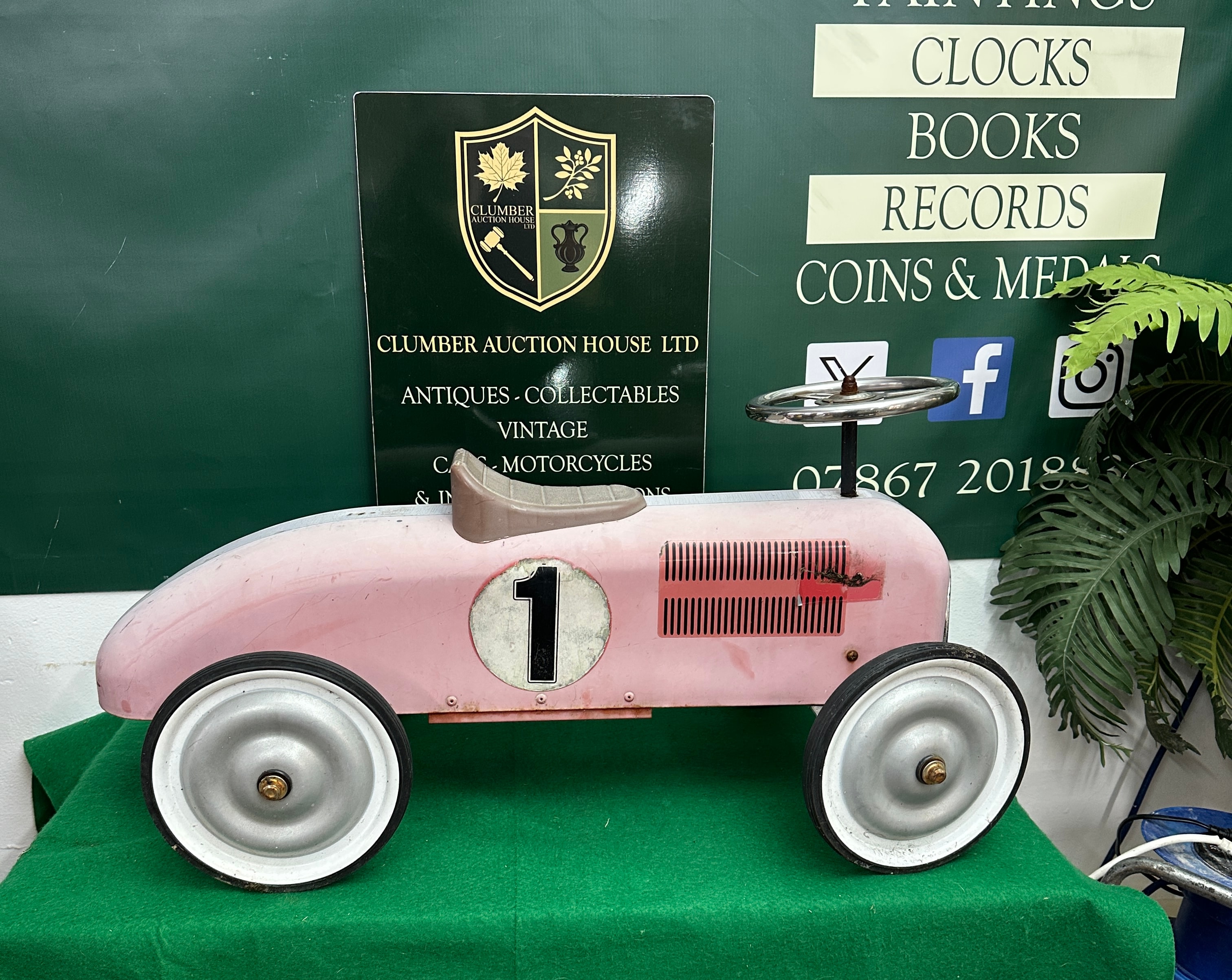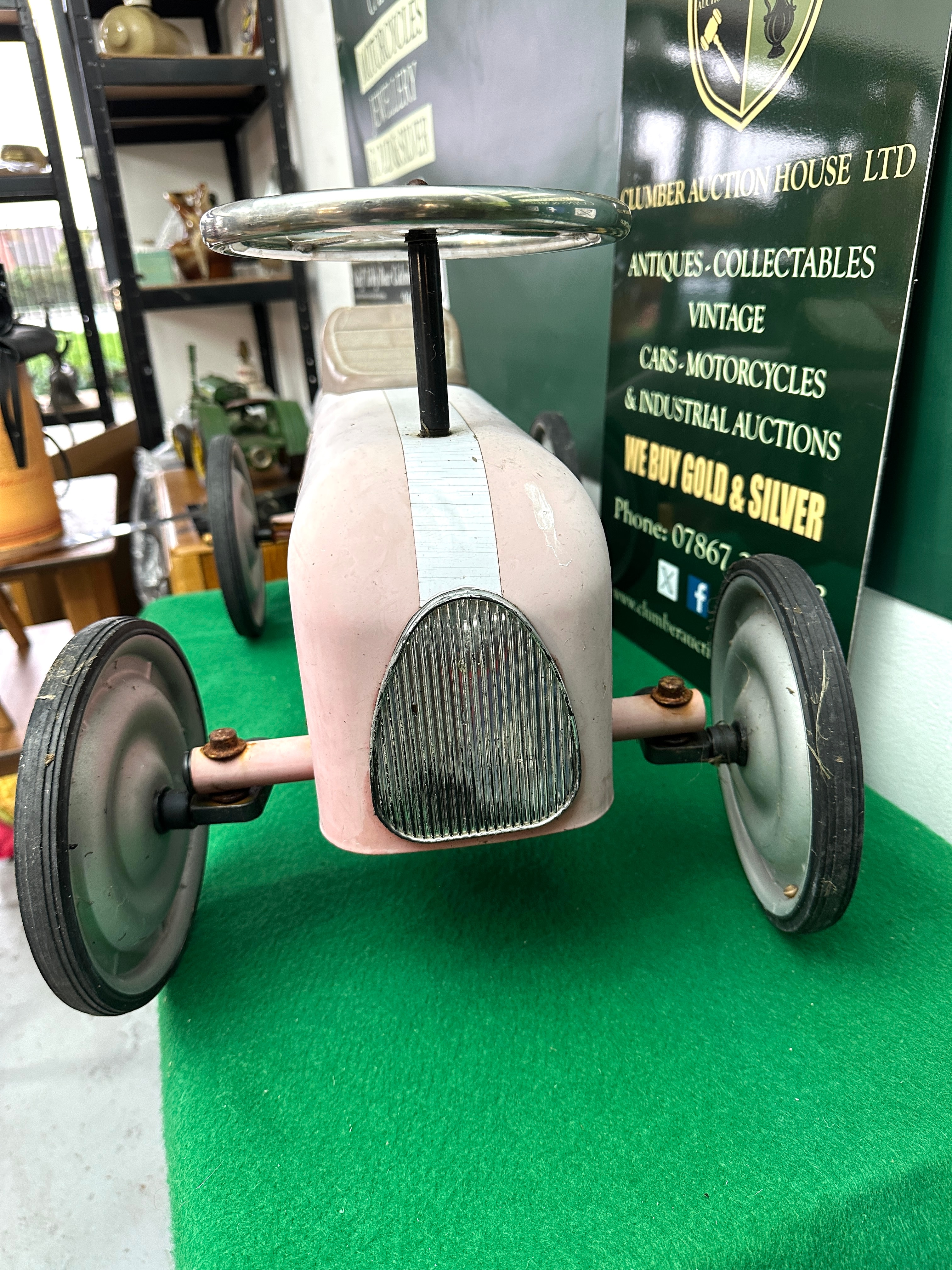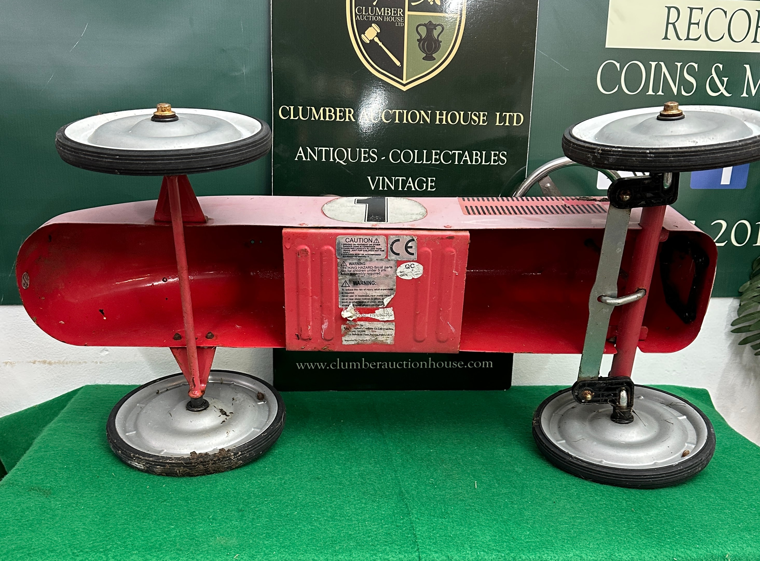 A vintage-style child’s pedal car, designed as an open-wheel racing car. The metal body is painted a faded pink with a white stripe down the hood and a prominent white circle bearing the black numeral ‘1’ on each side. Features include a chrome-plated steering wheel, a tan-colored seat, metal wheels with rubber tires, and a front grille. Visible markings on the underside include ‘CAUTION!’, ‘WARNING!’, a ‘CE’ mark, and a ‘QC PASSED’ sticker.