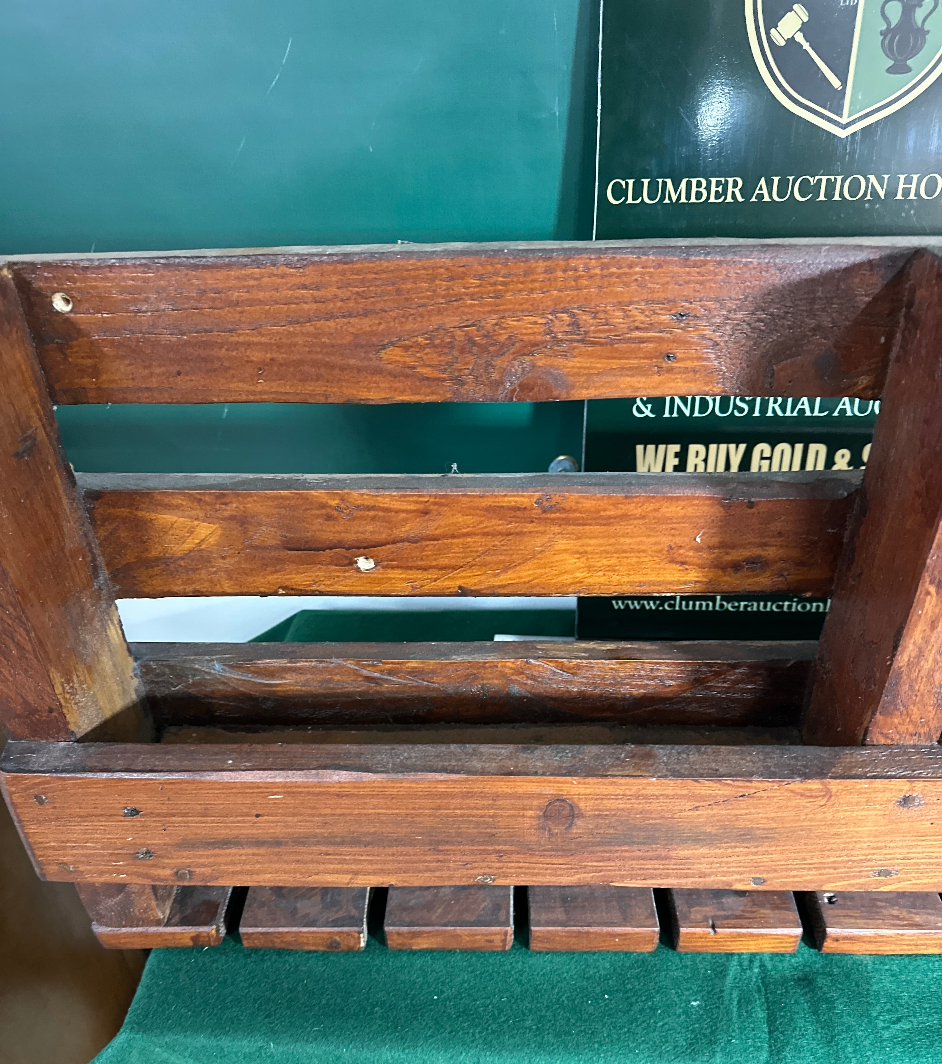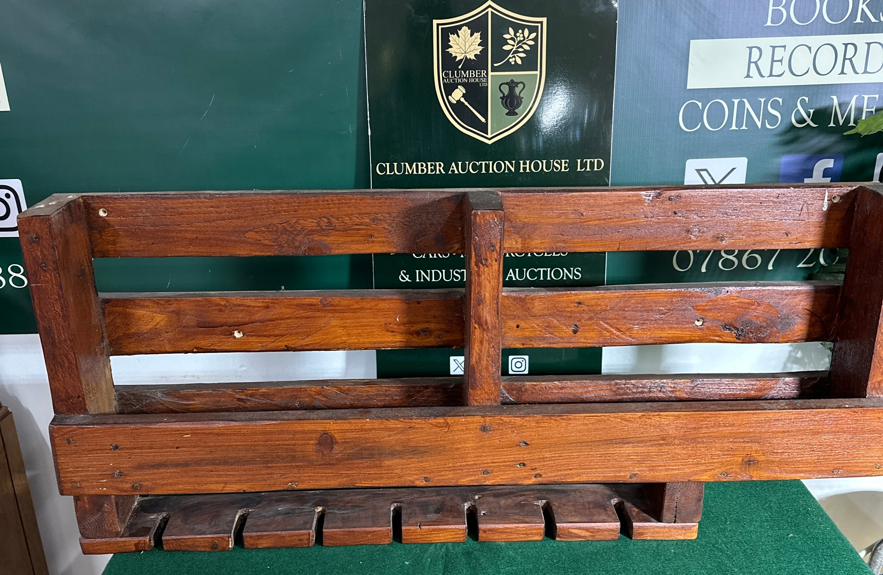 A rustic wall-mounted rack, likely crafted from stained softwood, featuring a reddish-brown finish. The design incorporates an upper slatted shelf suitable for bottle storage, surmounting a lower section with seven cut-out slots specifically designed to hold wine or stemmed glasses inverted by their bases. Construction appears functional with visible fastenings. There are no visible manufacturer’s marks or decorative text on the item itself.