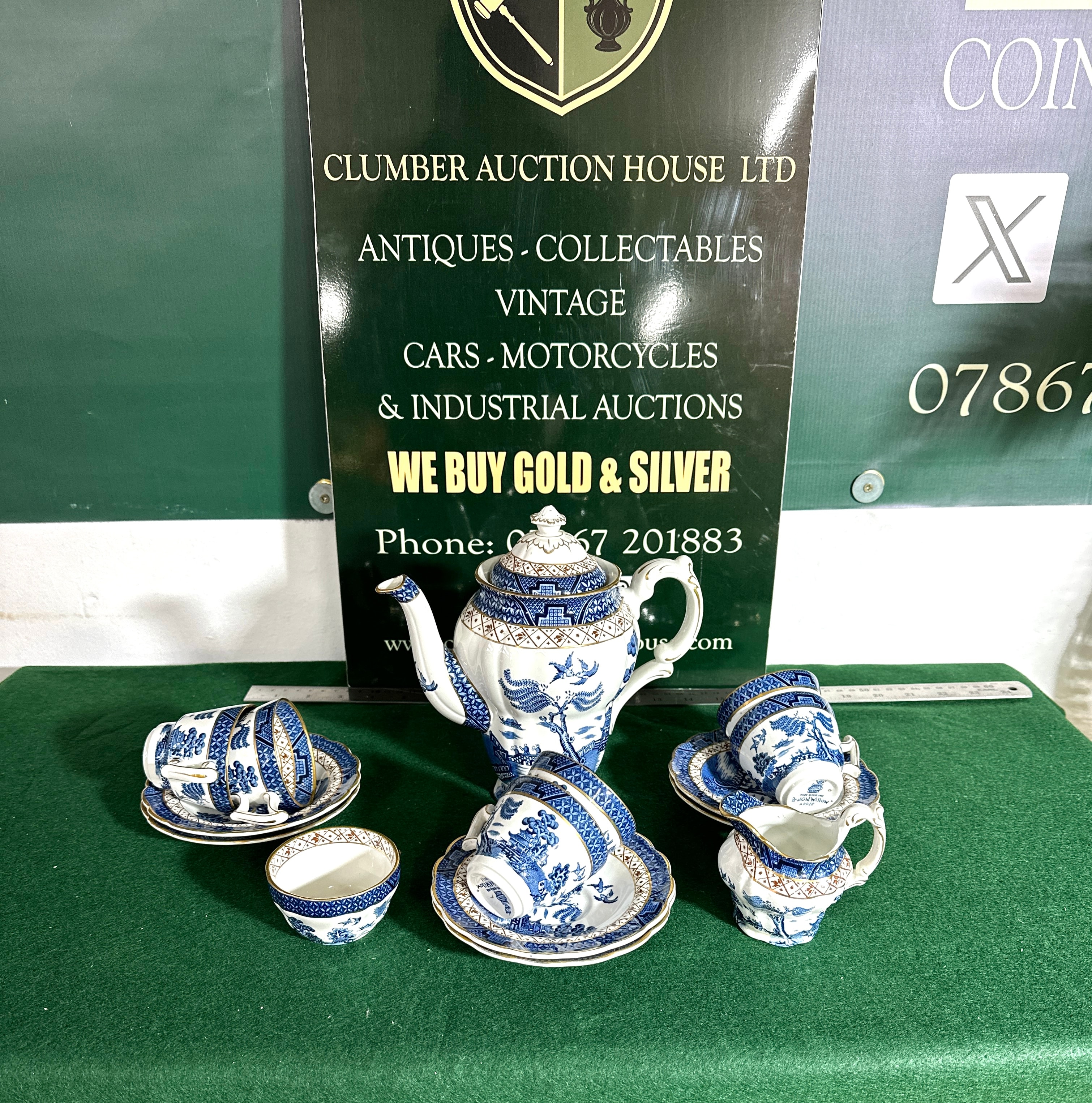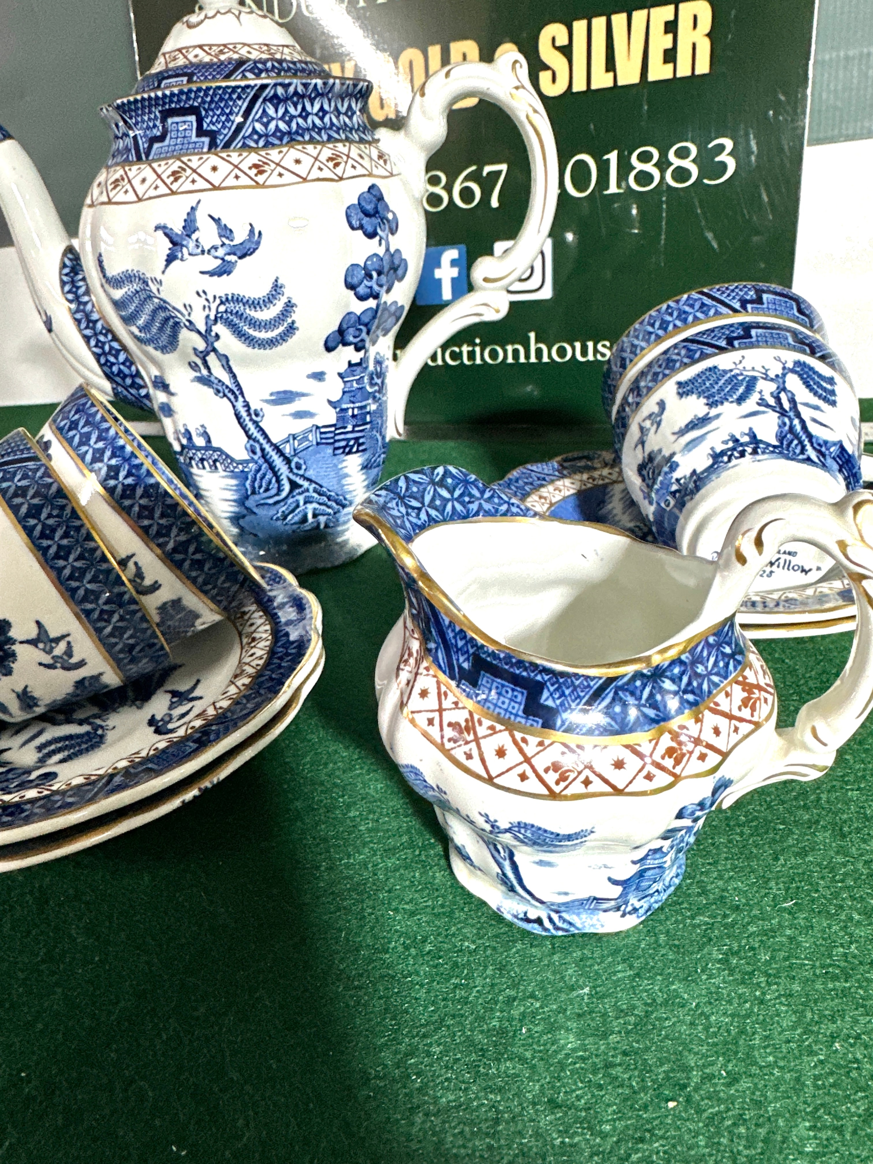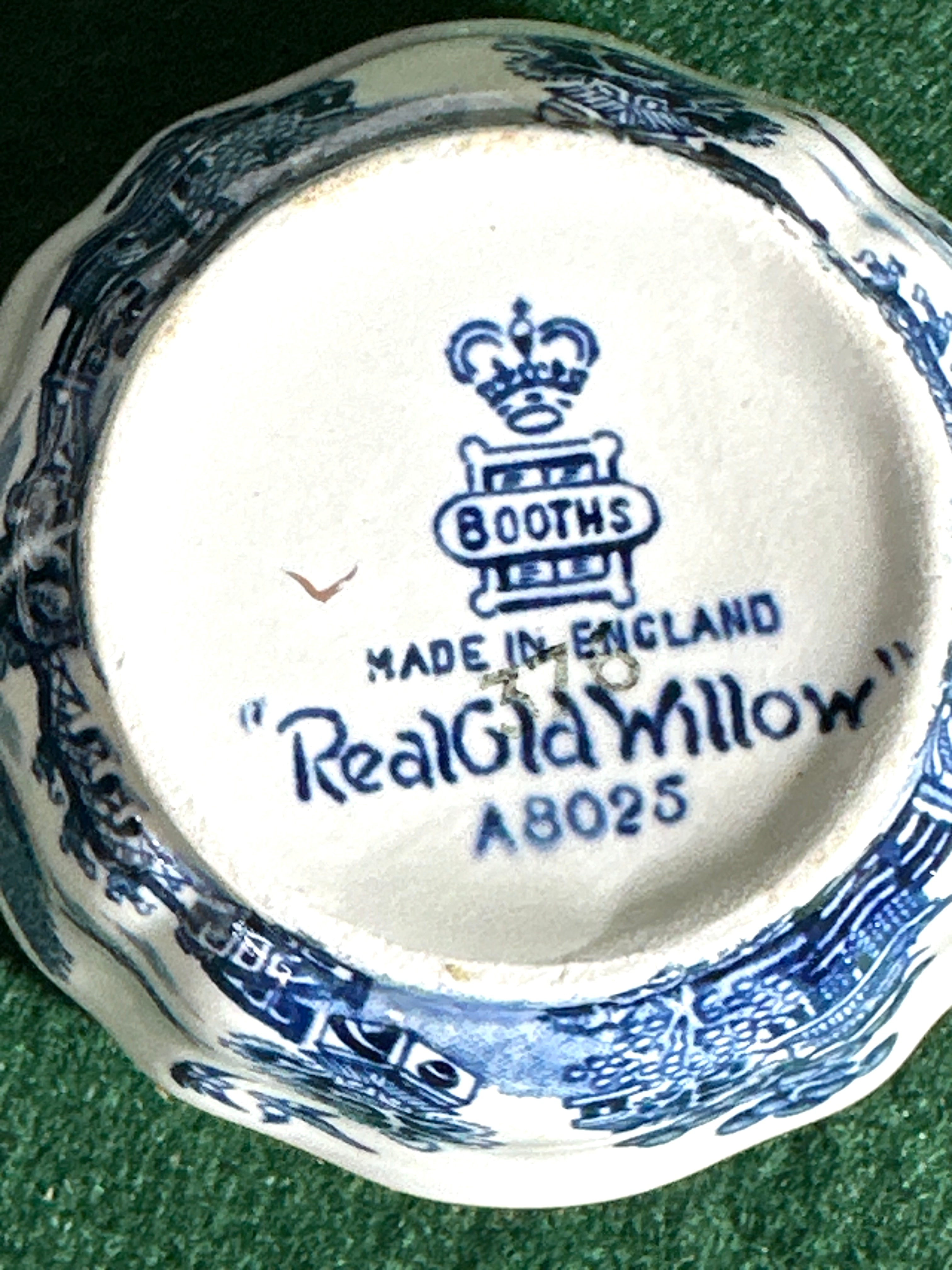 An 15 ceramic tea service by Booths in the ‘Real Old Willow’ pattern. Each piece is decorated with a distinctive blue and white transferware pattern featuring an Asian-inspired landscape with pagodas, trees, and birds. Subtle brown/gold geometric details accent the rims and borders. The service comprises one teapot, one creamer/milk jug, three teacups, and three saucers. The underside of one saucer bears the manufacturer’s backstamp ‘BOOTH’S’ surmounted by a crown, ‘MADE IN ENGLAND,’ and the pattern name ”Real Old Willow” with the alphanumeric code ‘A8025.’