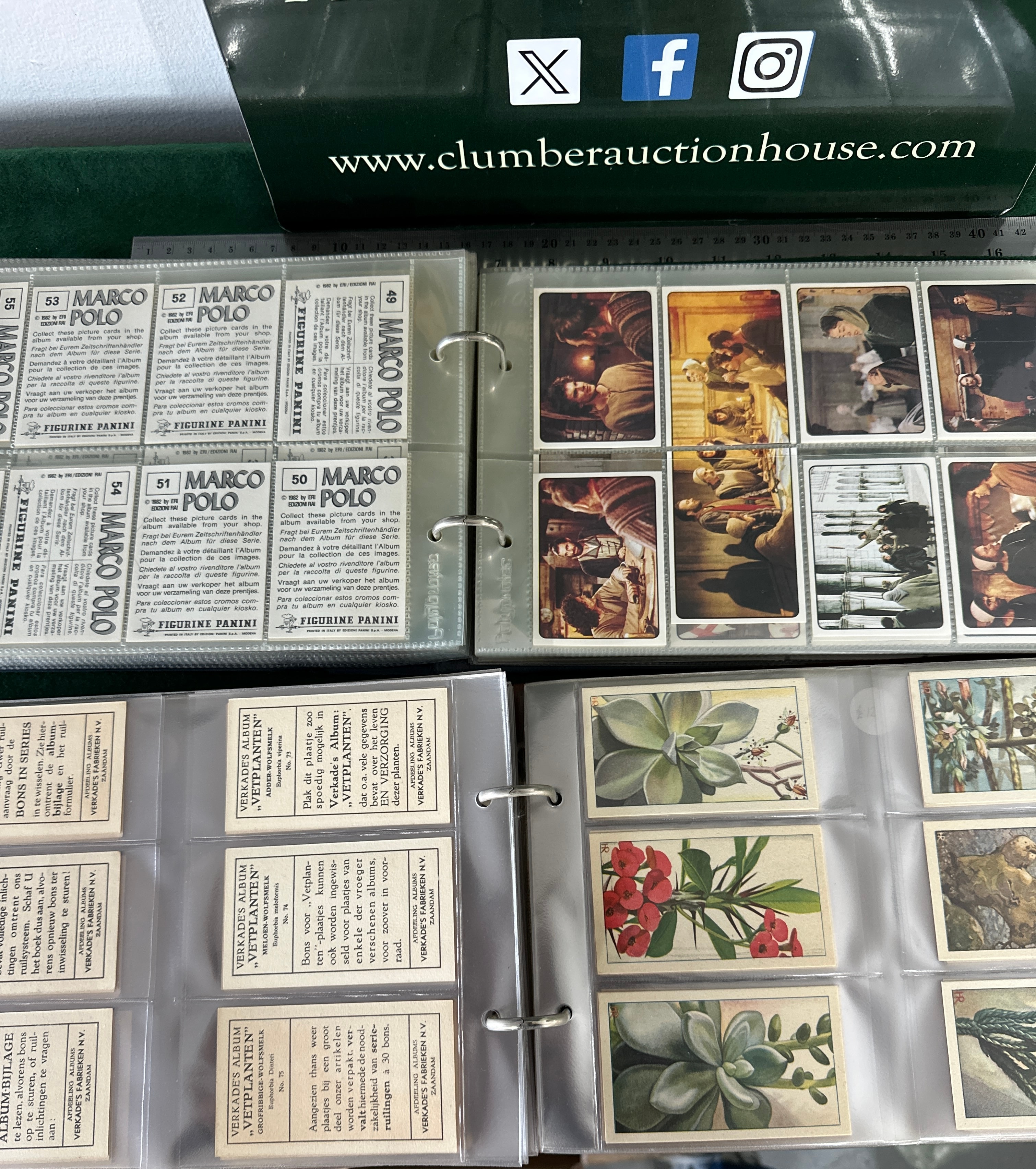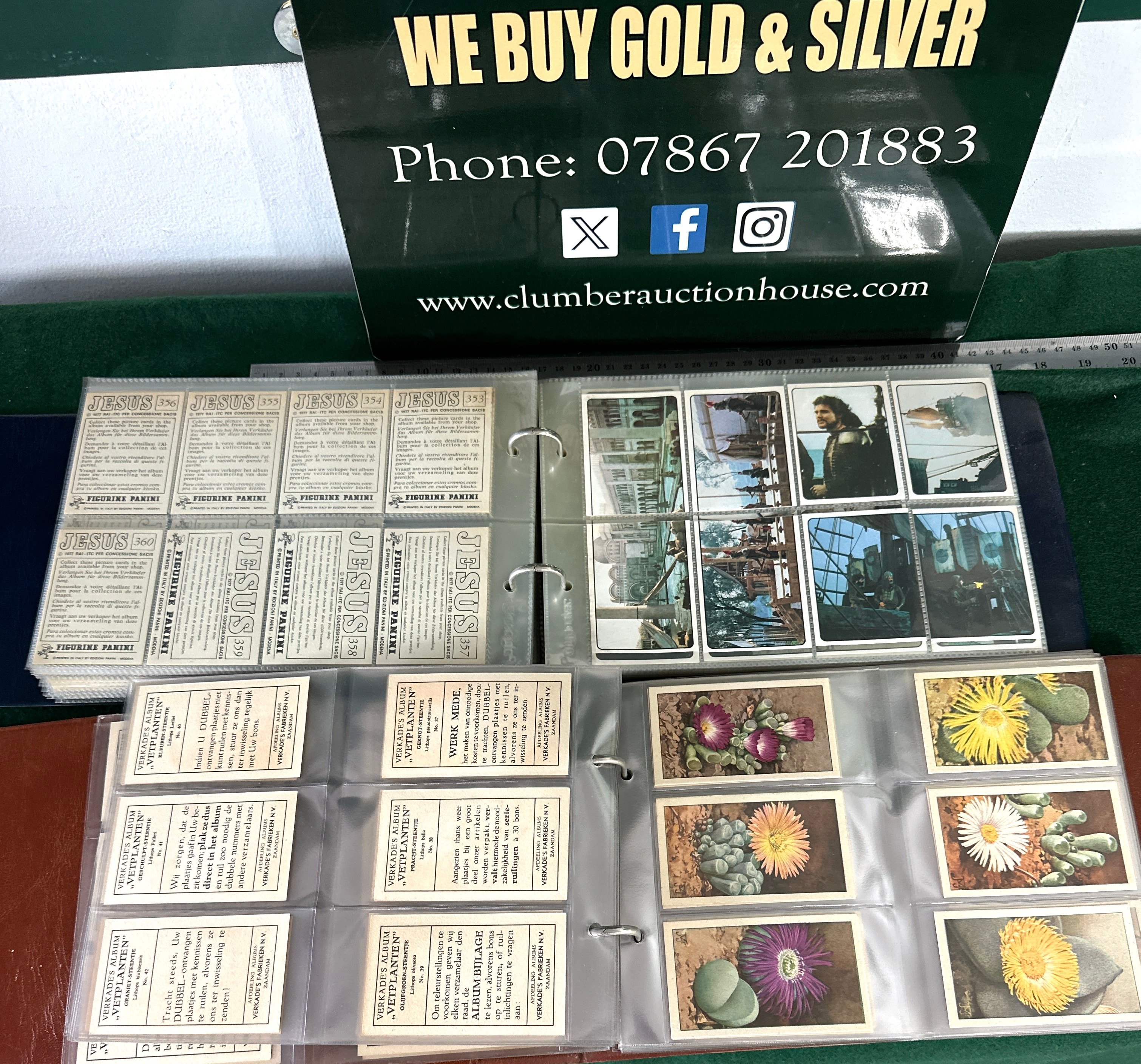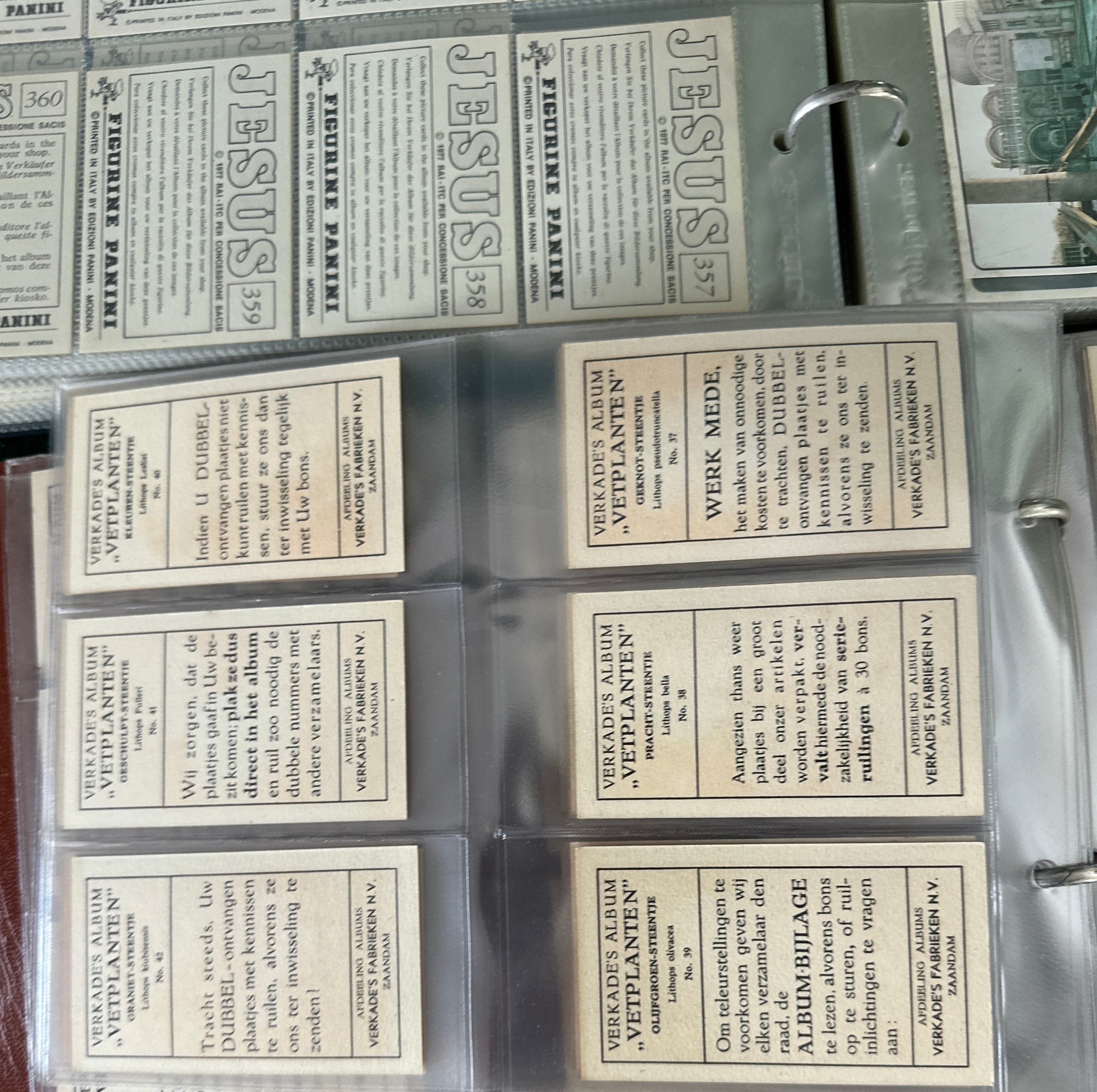 This lot comprises a collection of vintage trading cards, primarily housed in clear plastic pocket pages within two-ring binders. Visible series include Panini ‘JESUS’ (dated 1977 ITC), depicting biblical scenes and figures, and Panini ‘MARCO POLO’, showing historical scenes related to his travels. These Panini cards feature text in multiple languages, including English, French, German, Italian, and Dutch, often detailing collection instructions. Also present are cards from ‘Verkades Album “VETPLANTEN”‘ (Succulent Plants) by Verkade’s Fabrieken N.V. Zaandam. These cards feature detailed illustrations of various succulents like Lithops and cacti, with Dutch text, some detailing instructions for exchanging duplicate cards or identifying specific plant types such as ‘Geknoo-steentje’ (Knotted Stone) or ‘Praacht-steentje’ (Beautiful Stone). Additional unidentified series depicting what appear to be classical painting reproductions and figures in desert/Middle Eastern attire are also included. The cards are made of paper or cardboard.