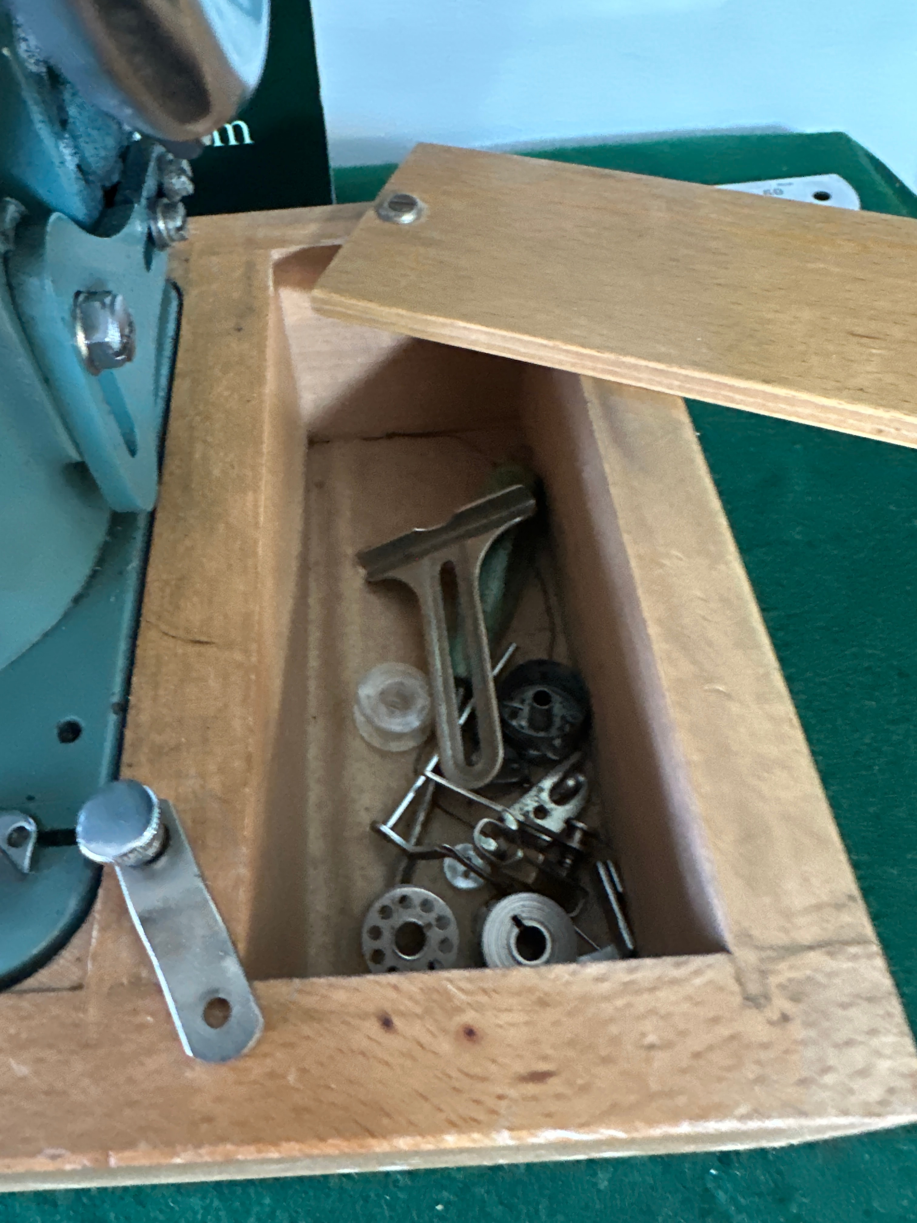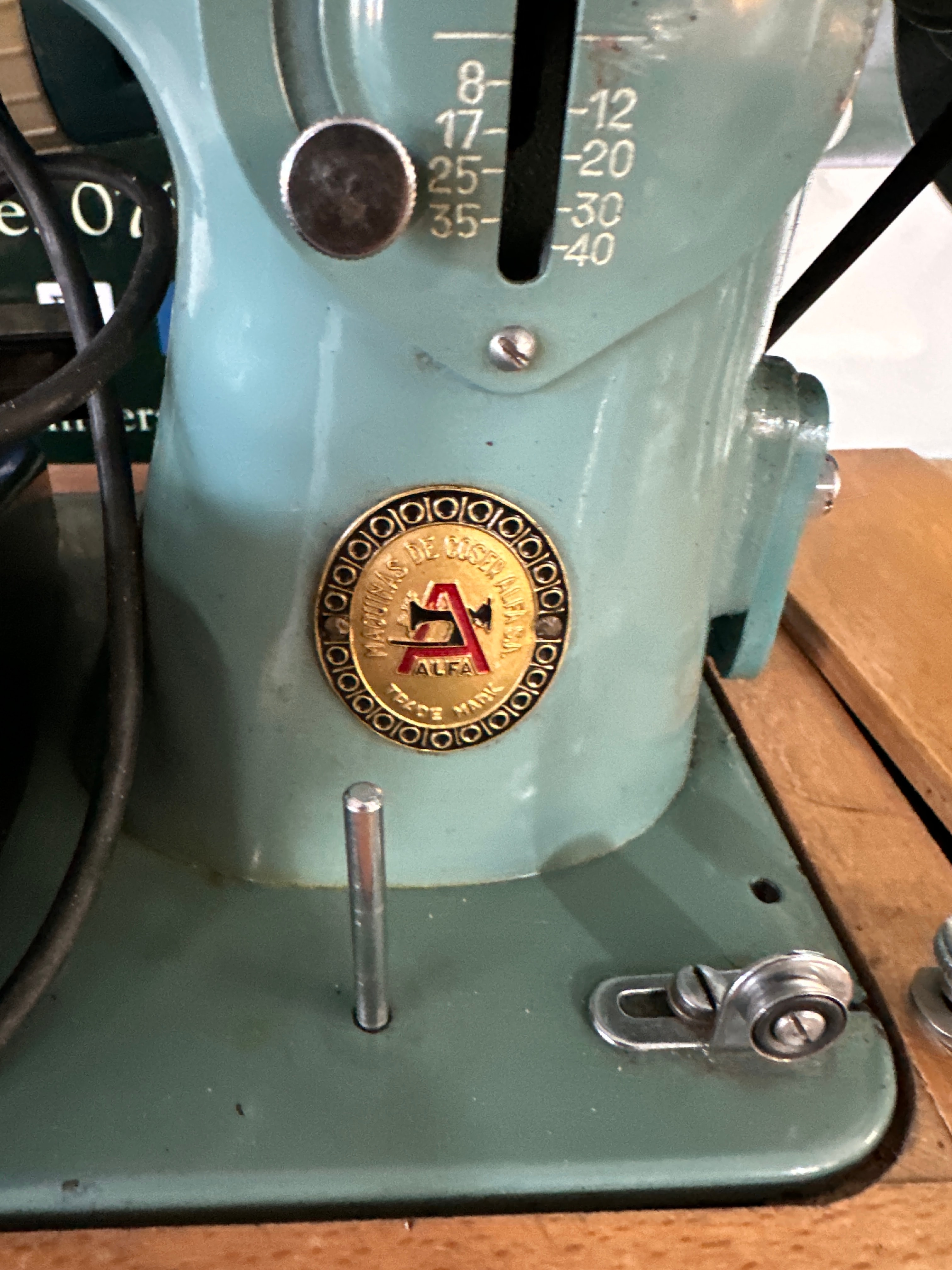 A vintage ALFA domestic sewing machine, presented in a brown leather or faux leather carrying case with a curved top. The machine is constructed from light teal-green painted cast metal, mounted on a wooden base. The wooden base incorporates a lidded compartment holding various small metal and plastic accessories, including bobbins and attachments. Prominent markings include “ALFA” on the machine body, and a gold oval badge with a red “A” and the text “MAQUINAS DE COSER ALFA” (translating to “ALFA SEWING MACHINES”) along with “TRADE MARK” and “ALFA.” A numerical scale (e.g., 8, 17, 25, 35 / 12, 20, 30, 40) is visible on the head. The machine includes a visible motor and power cord.