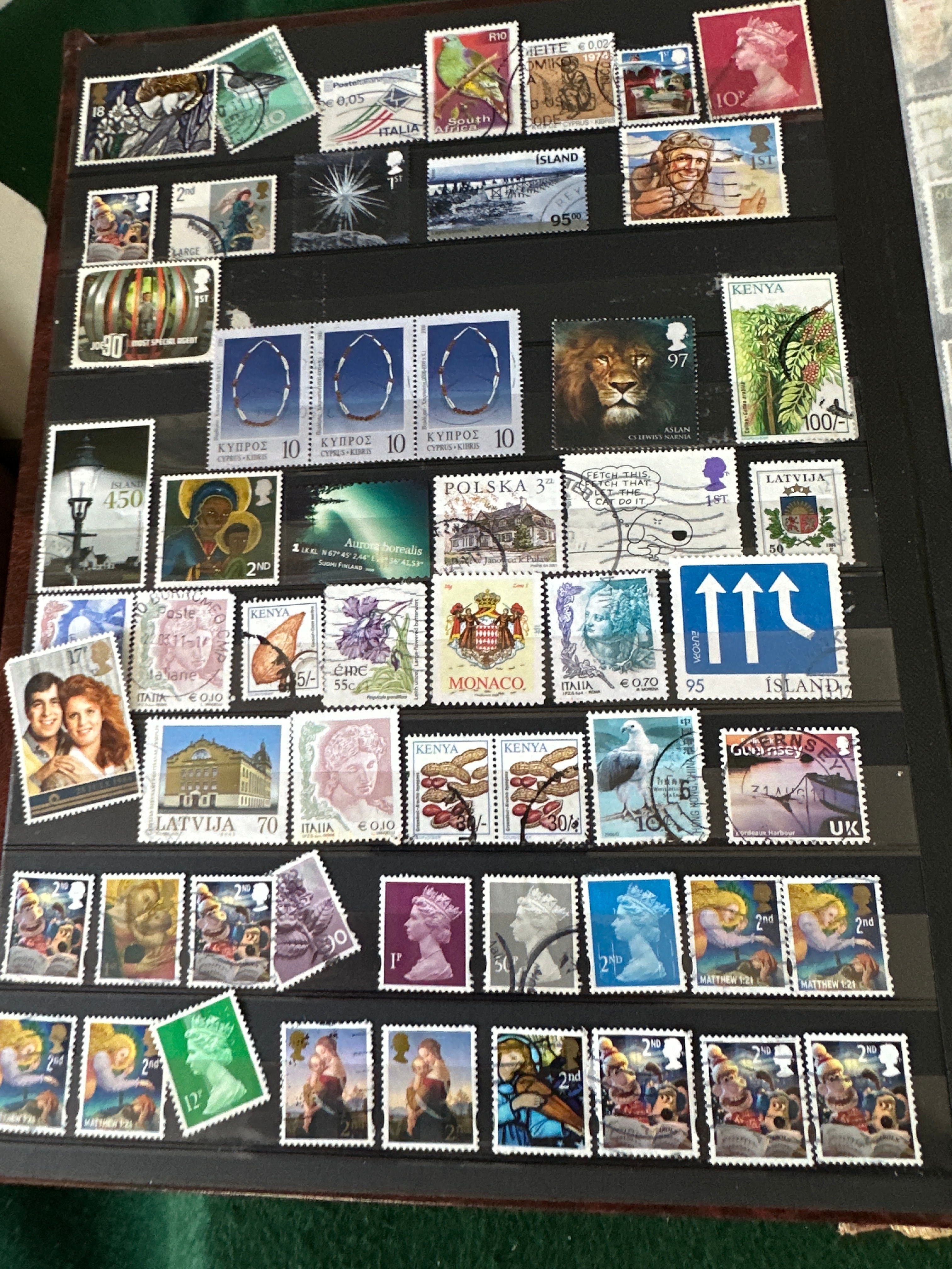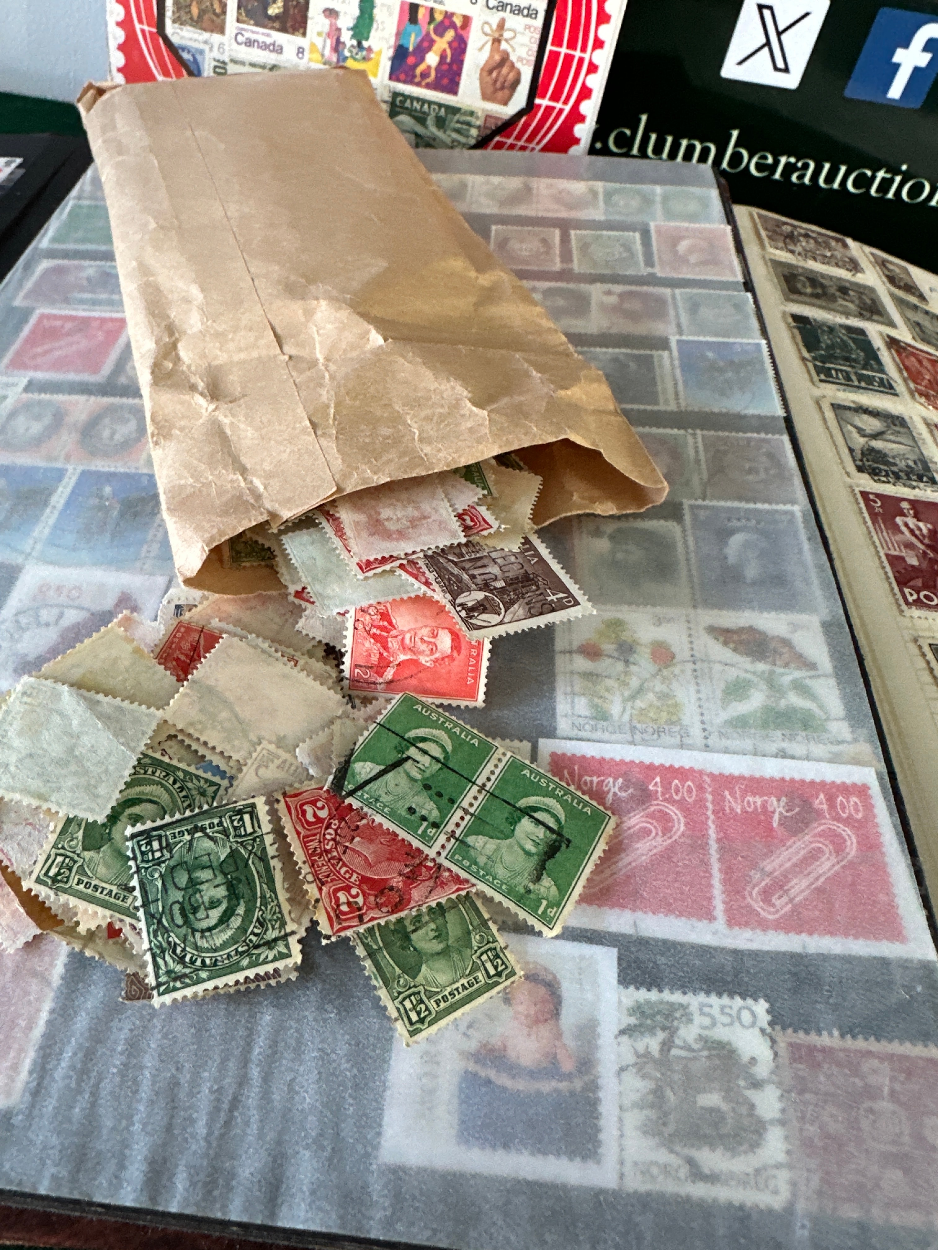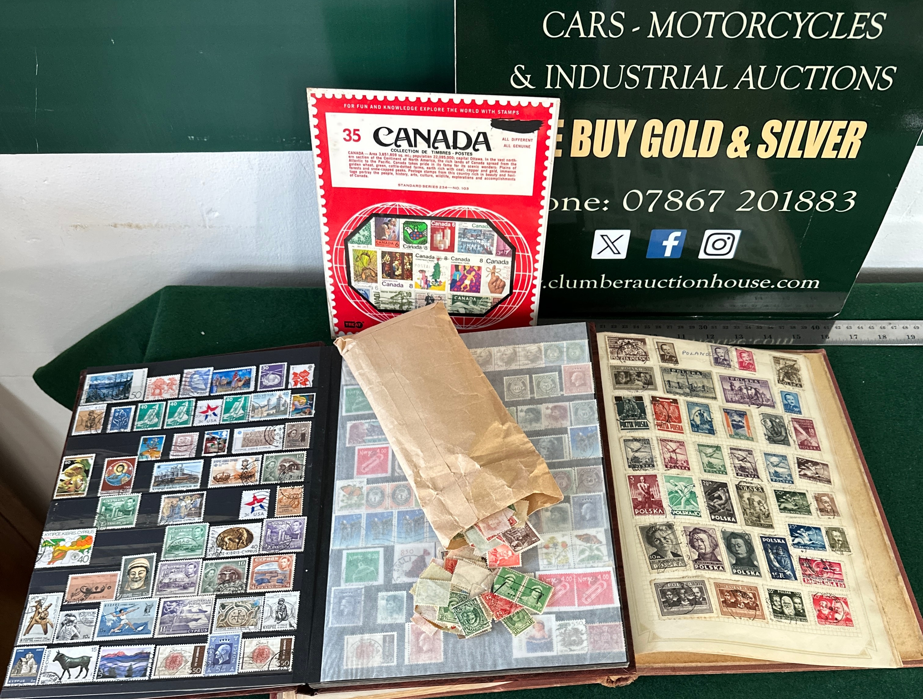 A large and diverse philatelic collection comprising numerous international postage stamps. The collection is presented across two multi-page stamp albums (one black, one red-bound), a smaller promotional booklet titled “35 CANADA ALL DIFFERENT ALL GENUINE STAMPS” encouraging stamp collecting, and a substantial quantity of loose stamps spilling from a creased brown paper bag. The stamps represent various countries, including Canada, Australia, Norge (Norway), Danmark, USA, Italia, Cyprus, Kenya, Latvia, Iceland, Monaco, and Polska (Poland). Designs feature a broad range from royal portraits (including multiple depictions of Queen Elizabeth II), animals, landscapes, and modern cartoon characters, suggesting a period spanning from the mid-20th century to contemporary examples. Many stamps bear visible postmarks, indicating a mix of used and unused specimens.
