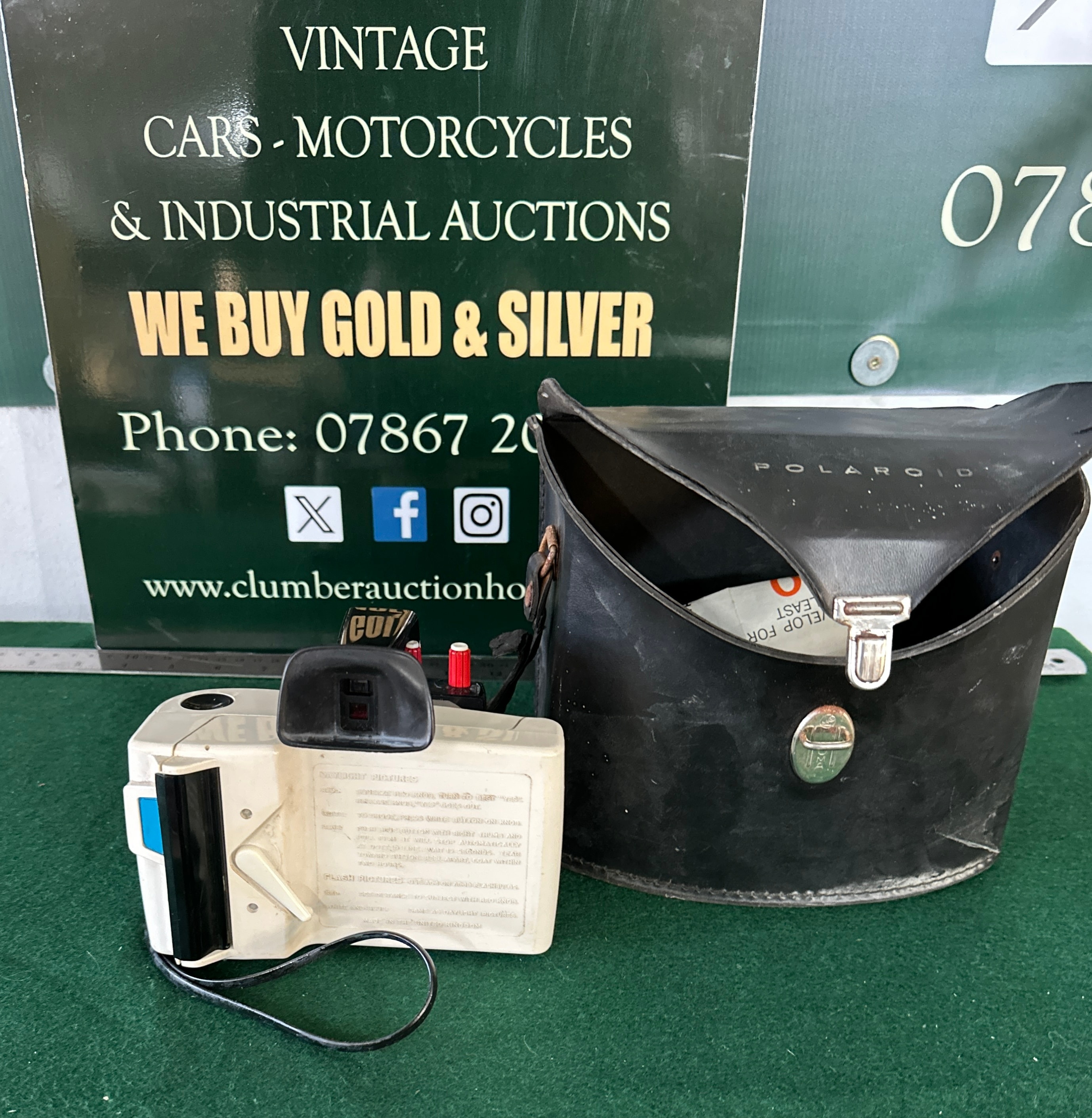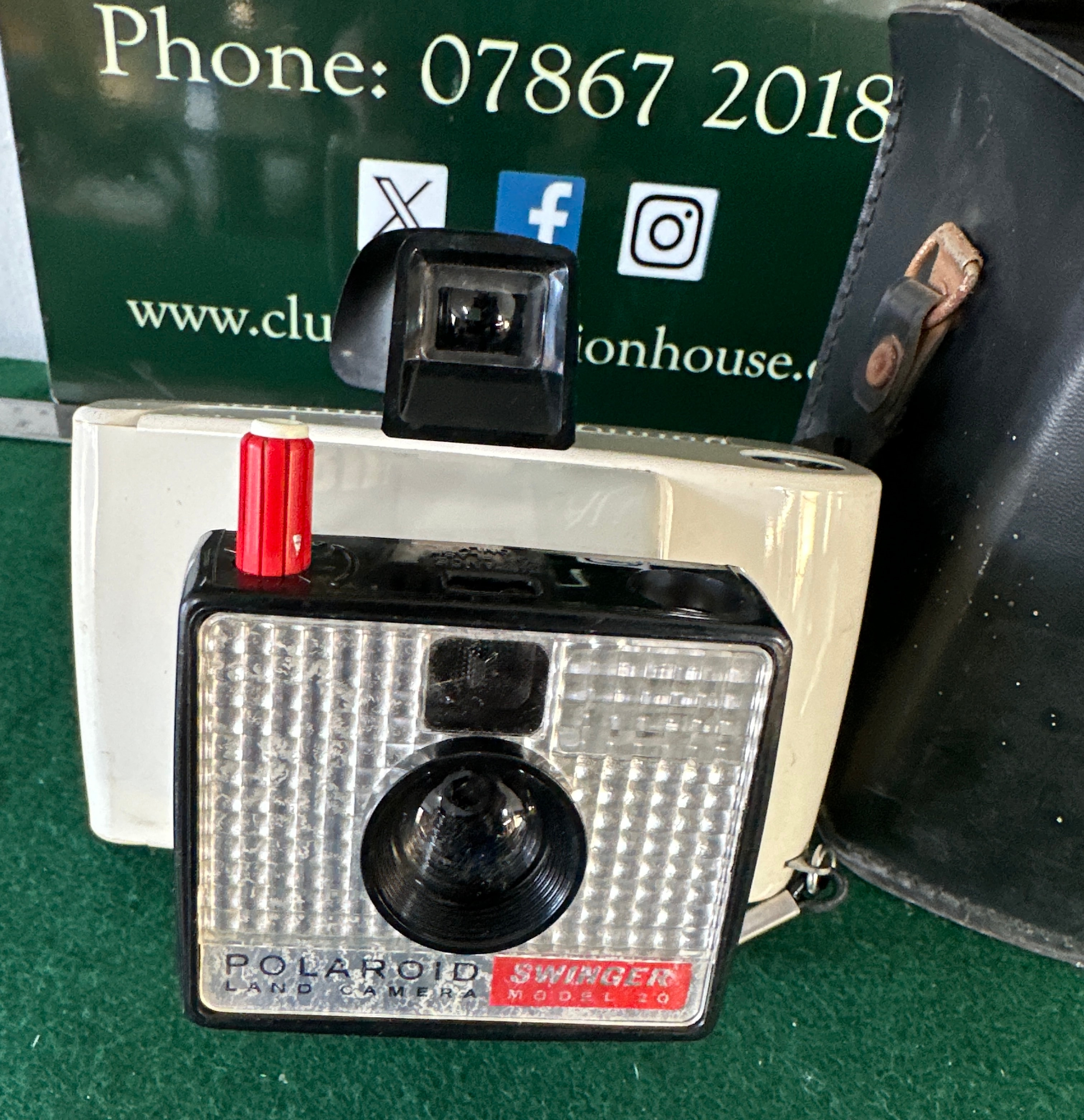 A Vintage Polaroid Swinger Land Camera Model 20, accompanied by its original black carry case. The camera features a two-tone plastic body in cream/white and black, accented with a textured silver-tone front panel, a black top-mounted viewfinder, and a red operating lever. The front of the camera is clearly marked “POLAROID SWINGER LAND CAMERA MODEL 20”. The back displays small, detailed instructional text that is not fully legible. The accompanying black case, appearing to be crafted from leather or a faux leather material, has “POLAROID” embossed on its flap. Inside the case, partially obscured and upside down, is printed text that reads “VELOP FOR EAST”.