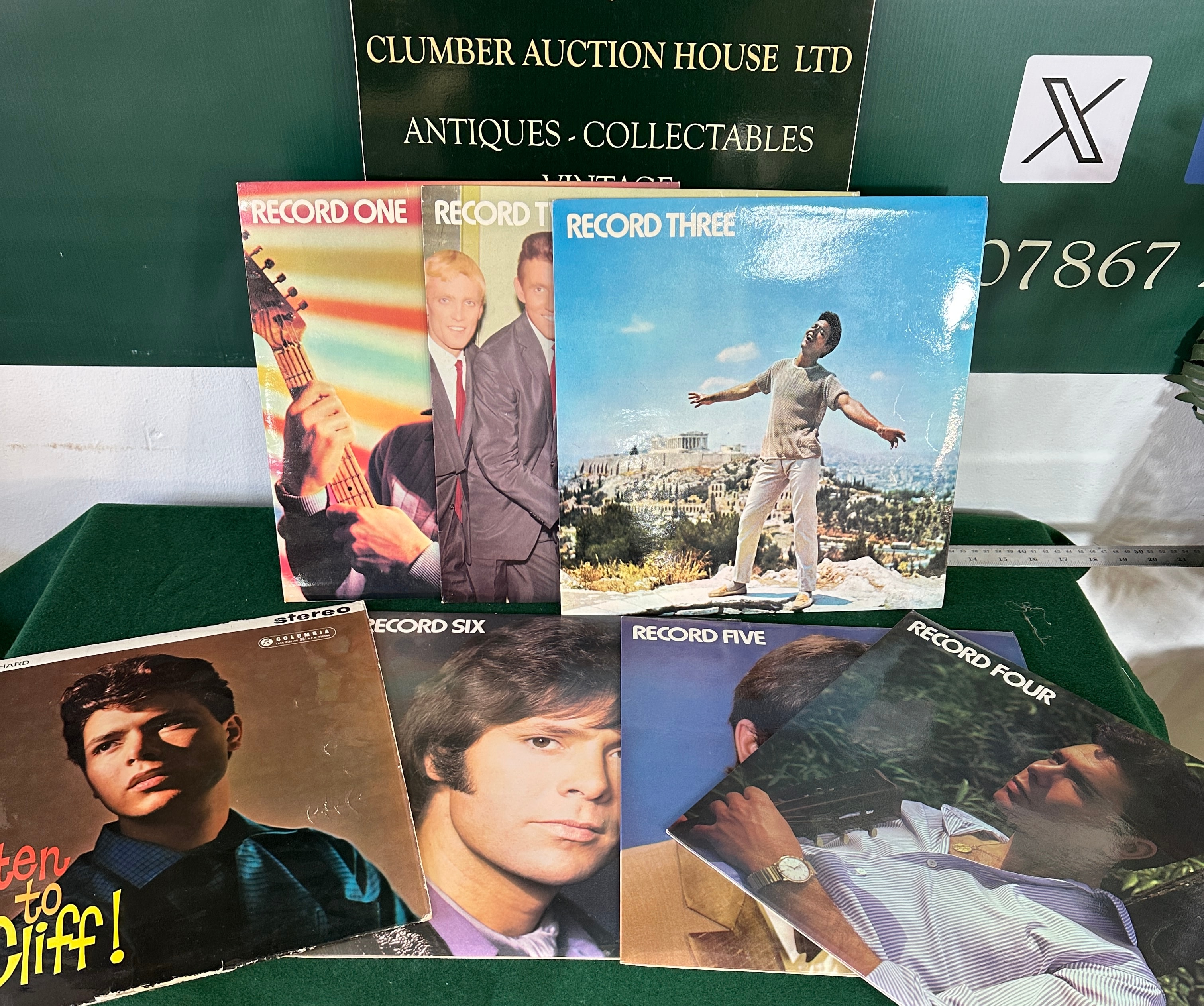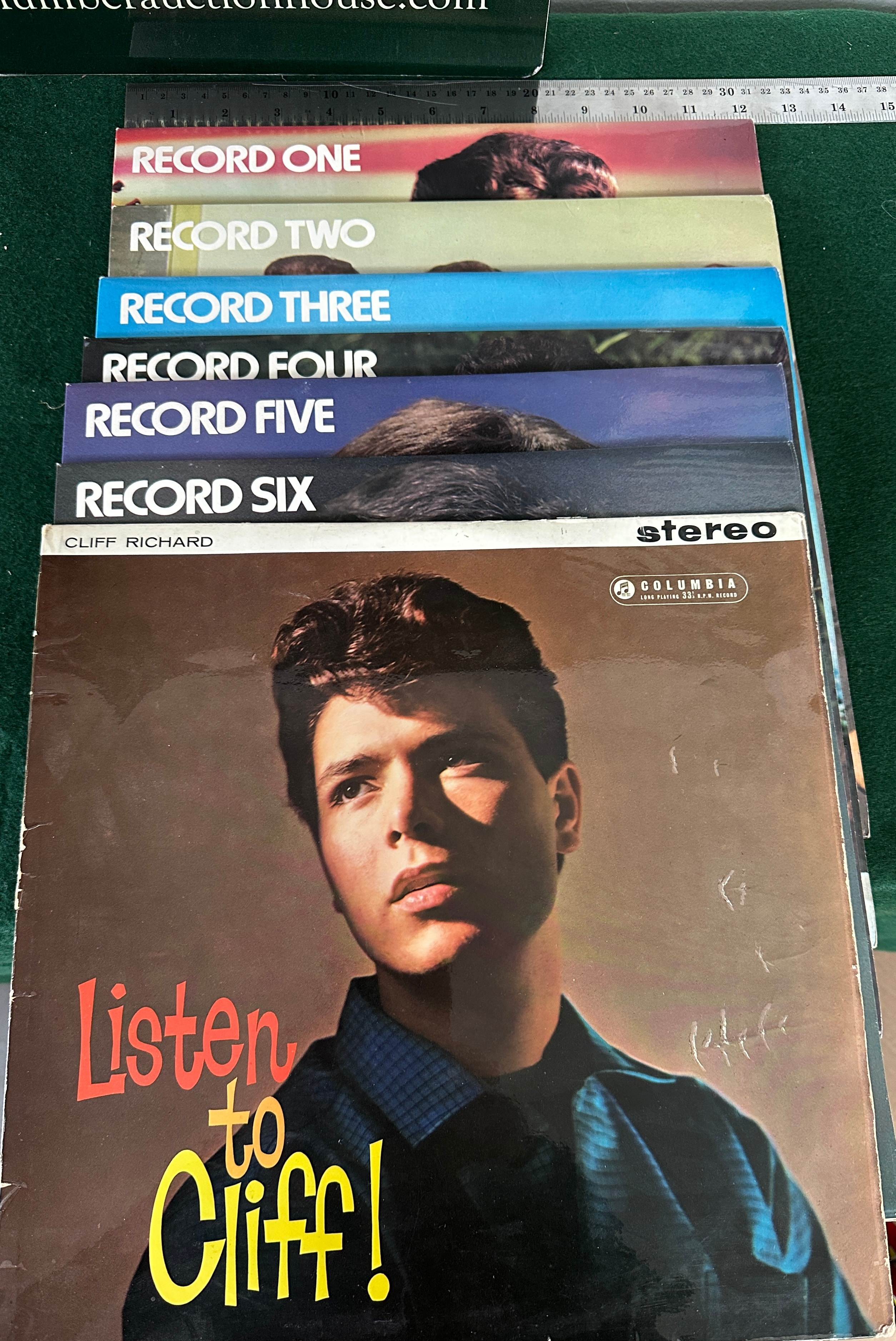 A collection of six vintage long-playing (LP) vinyl record albums, identified by web intelligence as ‘The Cliff Richard Story Featuring The Shadows’, likely a 1972 UK box set. The albums are presented in their original cardboard sleeves, with individual covers clearly labeled ‘RECORD ONE’ through ‘RECORD SIX’ in sequence. One album, titled ‘Listen to Cliff!’, prominently displays ‘CLIFF RICHARD’ and a ‘STEREO’ marking alongside the ‘COLUMBIA’ record label logo and ‘LONG PLAYING MICROGROOVE’ text. Several album covers, notably ‘Listen to Cliff!’ and ‘Record Six’, bear what appear to be signatures, likely autographs from the artist. The collection is stylistically consistent with mid-20th century pop music.