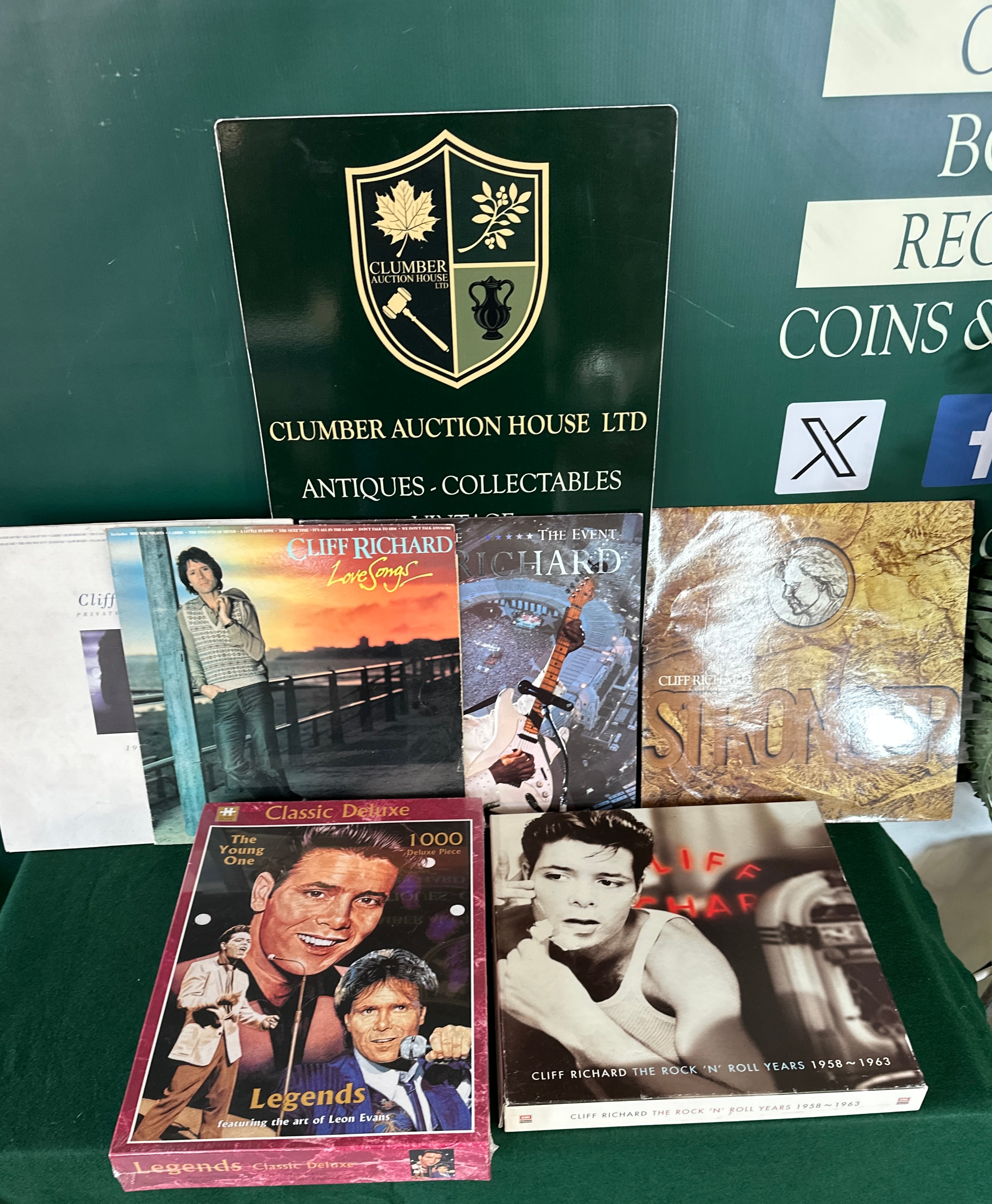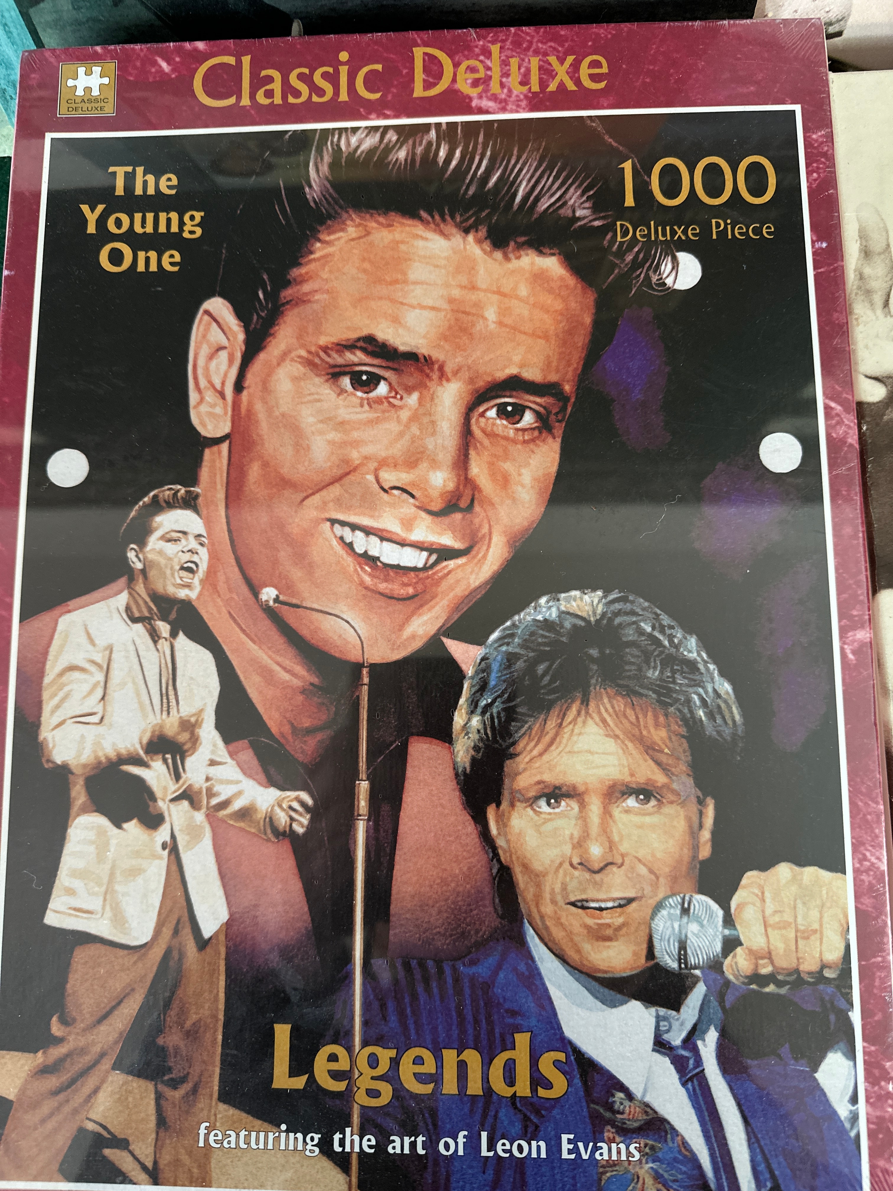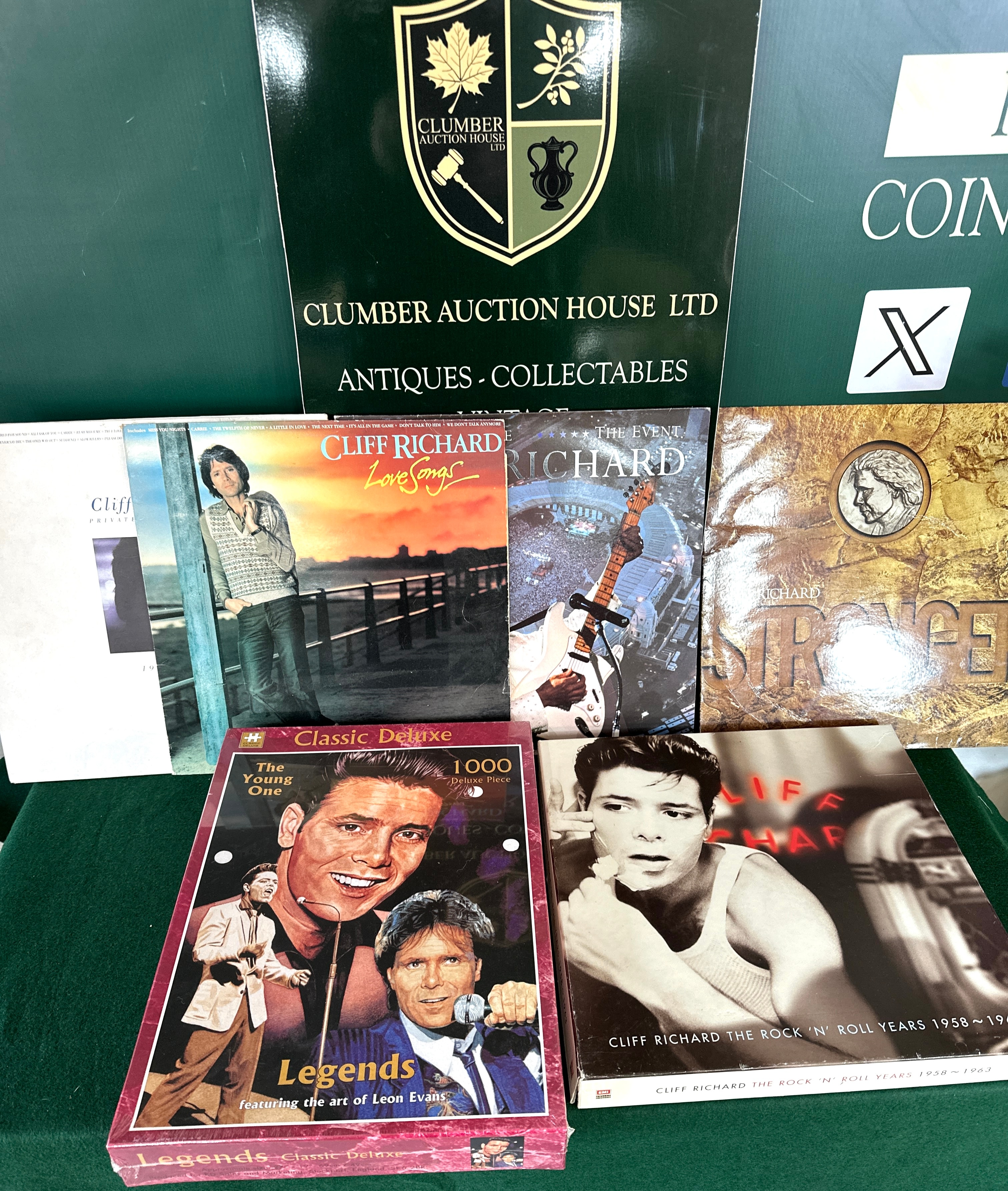 A collection of Cliff Richard memorabilia, prominently featuring a Classic Deluxe ‘The Young One’ 1000-piece jigsaw puzzle, illustrated by Leon Evans. The lot also includes several album box sets or media cases, with identifiable titles such as “Love Songs, ” “The Event, ” and “Strong.” A significant item is the box set titled “CLIFF RICHARD THE ROCK ‘N’ ROLL YEARS 1958 ~ 1963,” focusing on his early career. The items are primarily constructed from cardboard and paper, adorned with various photographic and artistic depictions of Cliff Richard.