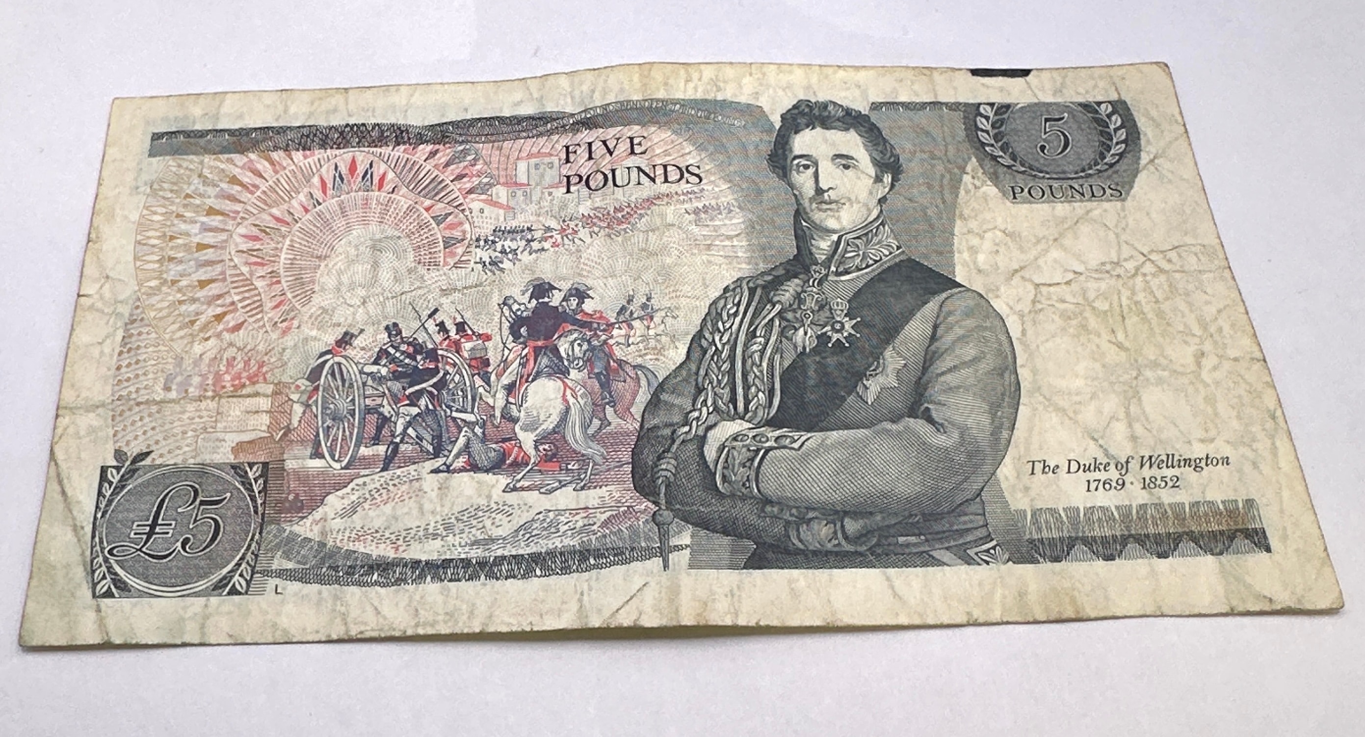 A Bank of England Five Pounds banknote, Great Britain, Pick number P-378, issued between 1980 and 1987. The obverse features a portrait of Queen Elizabeth II in regal attire, accompanied by the denomination “FIVE POUNDS” and “£5,” the serial number “KS07 505621” (visible twice), and a vignette of two horses. Text includes “I PROMISE TO PAY THE BEARER ON DEMAND THE SUM OF FIVE POUNDS” and “LONDON FOR THE GOV. AND COMP. OF THE BANK OF ENGLAND,” signed by D.H.F. Samuel, Chief Cashier. The reverse displays a portrait of “The Duke of Wellington 1769-1852” in military uniform, set against a detailed battle scene.