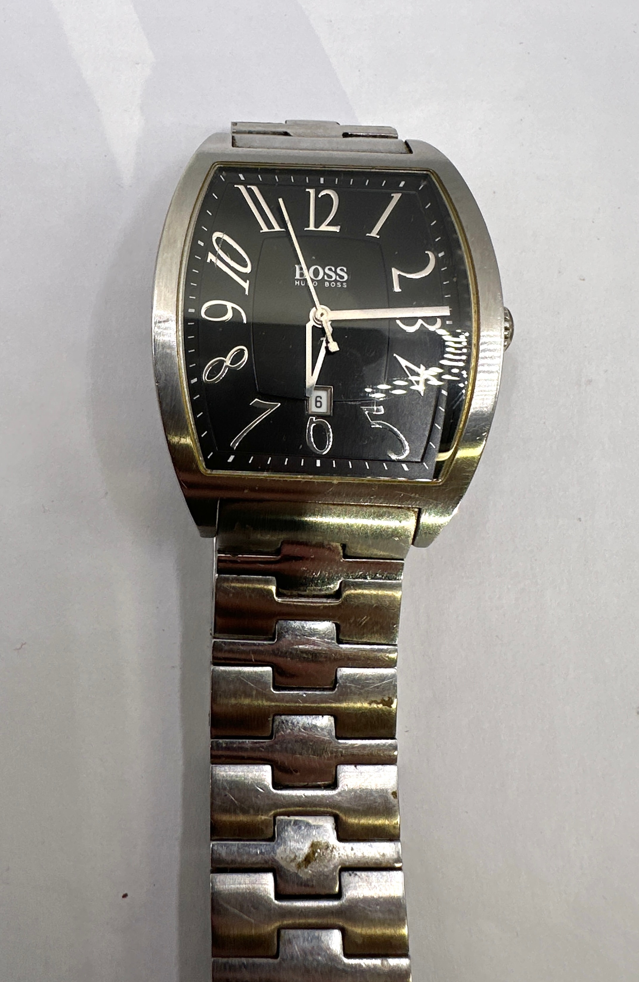 A Boss Hugo Boss HB 21.1.14.2006 Large Black Dial Men’s Quartz Stainless Steel Watch. This stainless steel wristwatch features a tonneau-shaped case and a two-tone link bracelet. The black dial displays large Arabic numerals and a date window at the 6 o’clock position. The dial is marked with “BOSS HUGO BOSS” below 12 o’clock. The case back is engraved with “BOSS HUGO BOSS,” “HB.21.1.14.2006,” “1.660.346,” and a circular inscription stating “WATER RESISTANT 3ATM” and “ALL STAINLESS STEEL.”